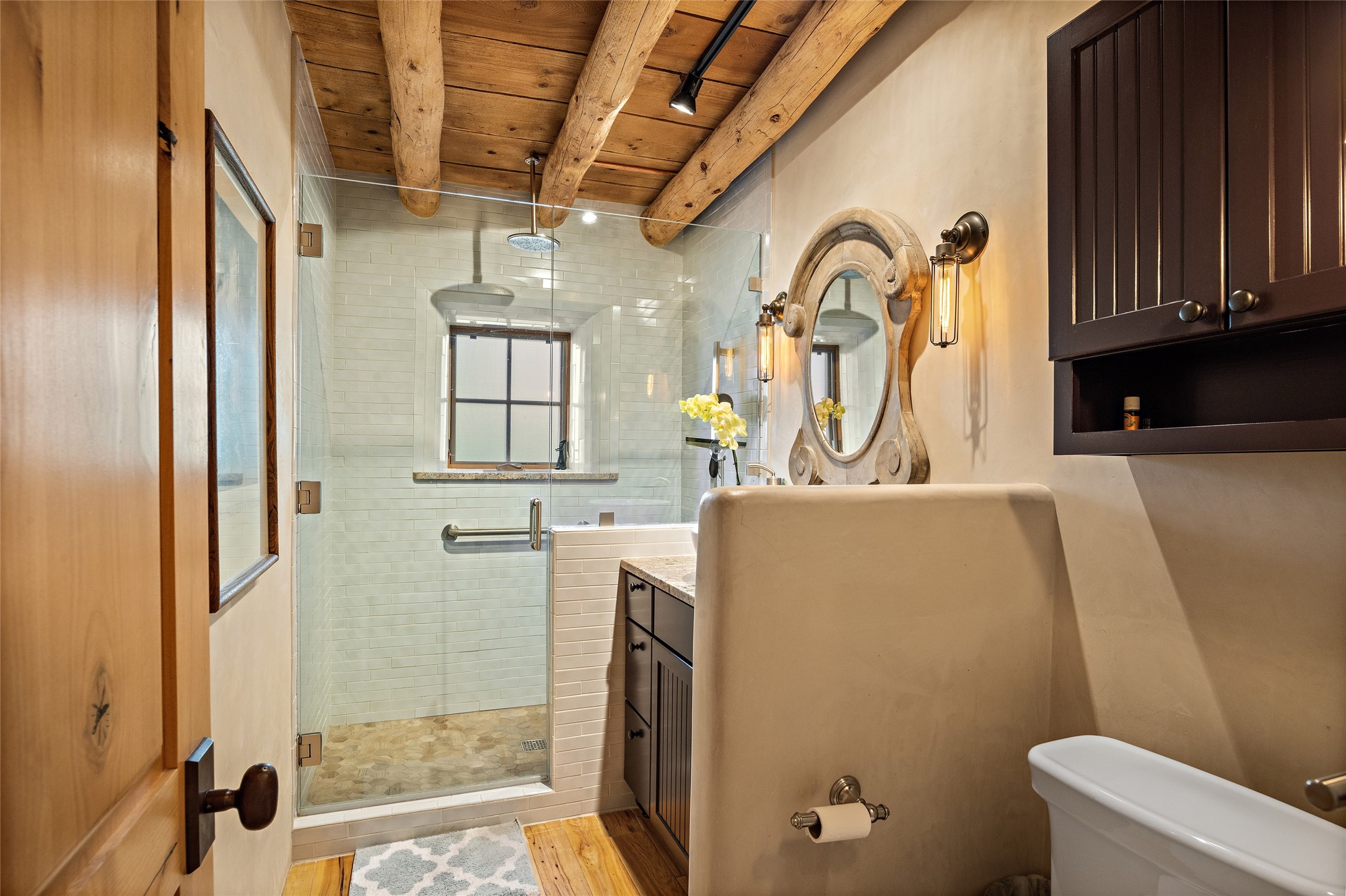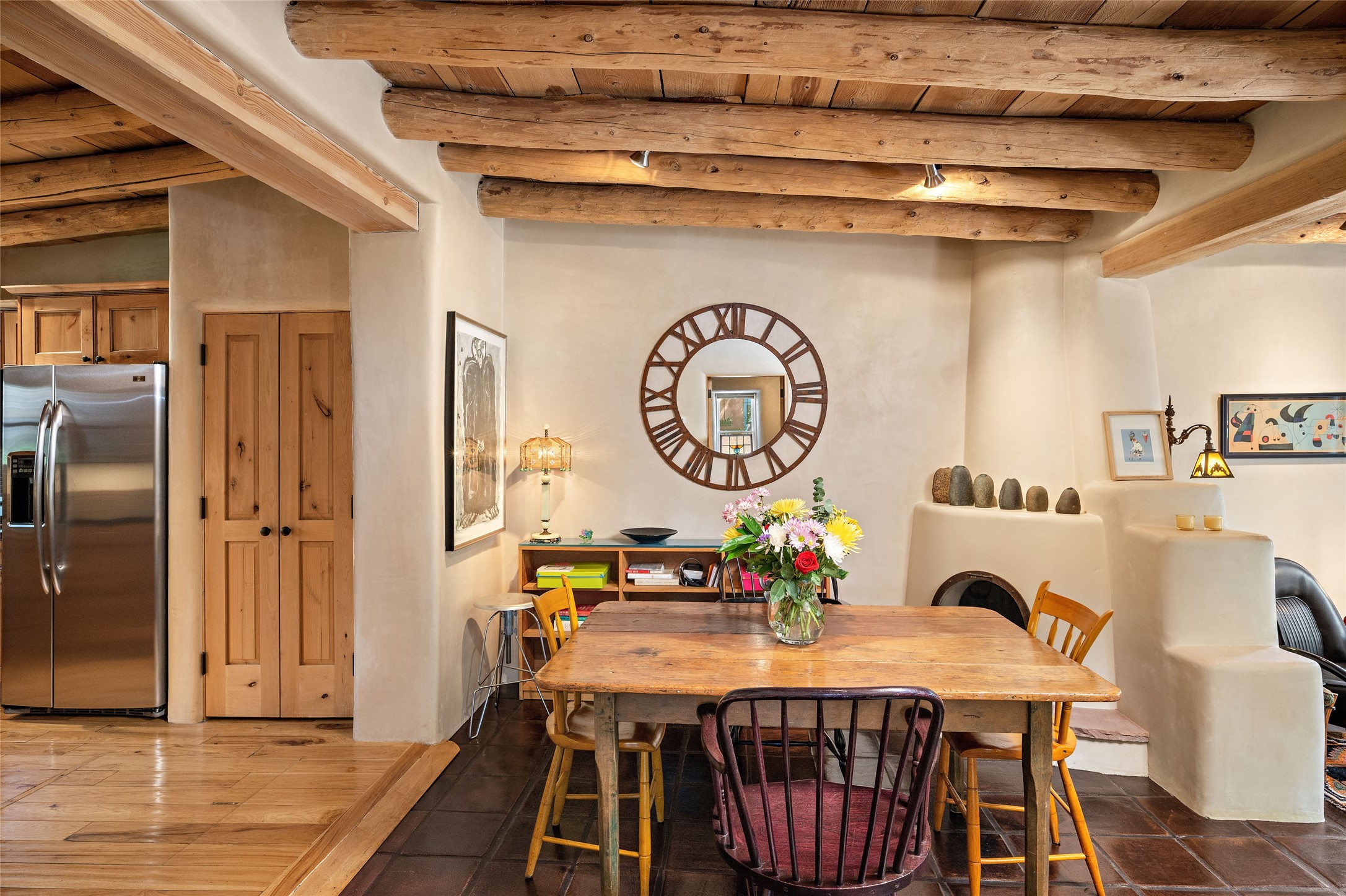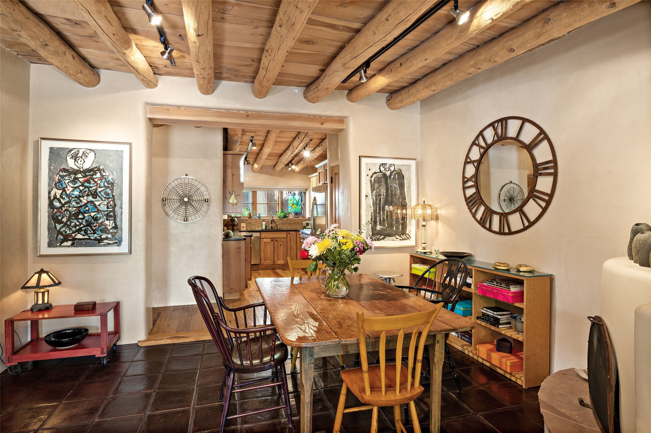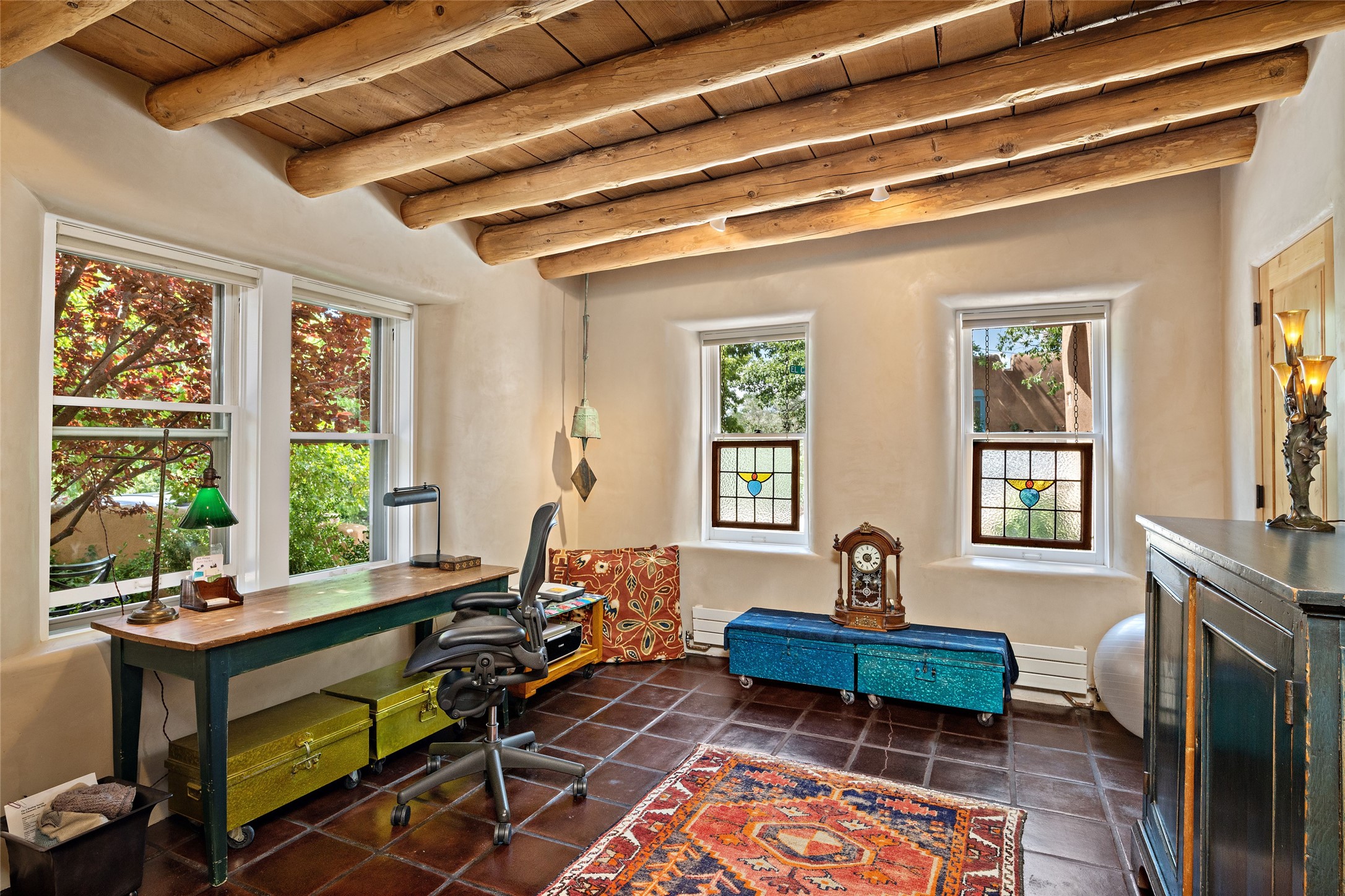 Step back into history with this exquisitely updated and maintained Eastside Santa Fe property situated in a private and quiet location close to Canyon Road. Comprised of a 1,020 +/- sq.ft., single-story adobe and frame constructed condo and detached 156 +/-sq.ft. frame and stucco casita, the property is completely surrounded by year-long sea-sonal, lush and mature landscaping, a backyard water feature and lovely walled and gated spaces attracting a wide array of native birds under a canopy of greenery; garden views from every window. Inside the main home, there are 2 large bedrooms and a re-cently renovated bathroom. A lovely kiva wood burning fireplace graces one bedroom, the other bedroom having backyard garden access. The open-concept galley kitchen, dining and living area is appointed with another wood burning kiva fireplace. The ca-sita consists of a large bedroom and ensuite bathroom with a skylight allowing for natu-ral sunlight during the day and star gazing at night, welcoming guests with a private and uplifting stay. Smooth plaster walls, vigas, wood and tile floors grace the spaces with classic Santa Fe charm. There are two dedicated off-street parking spots in this small four-unit complex. A large basement with interior access is ideal for storage and access to the mechanicals. A new roof which was installed in 2022 with a transferrable warranty in place, as well as zoned landscape irrigation and lighting systems are just some of the special details of this sweet hidden Santa Fe property nestled in the trees.
