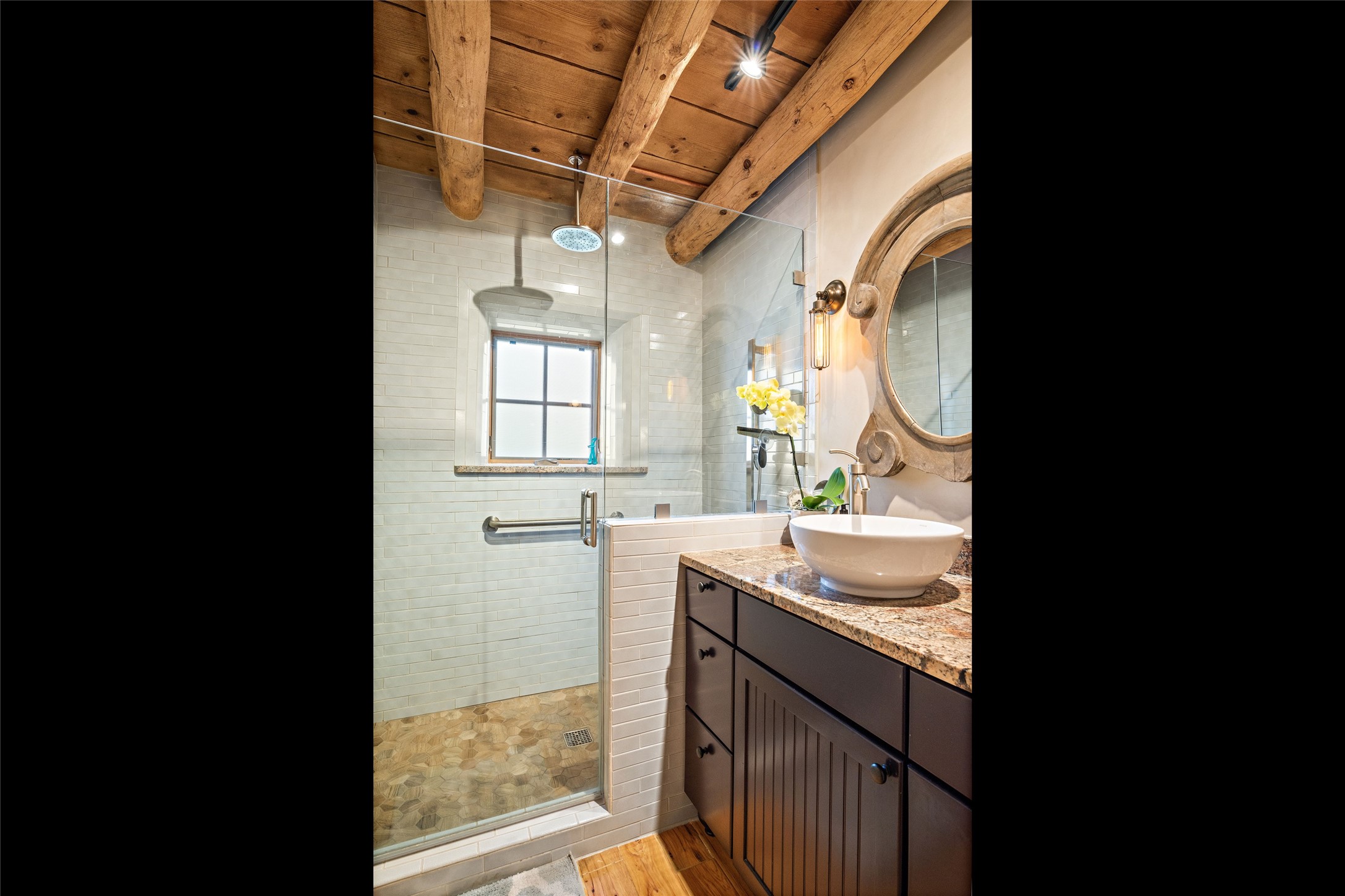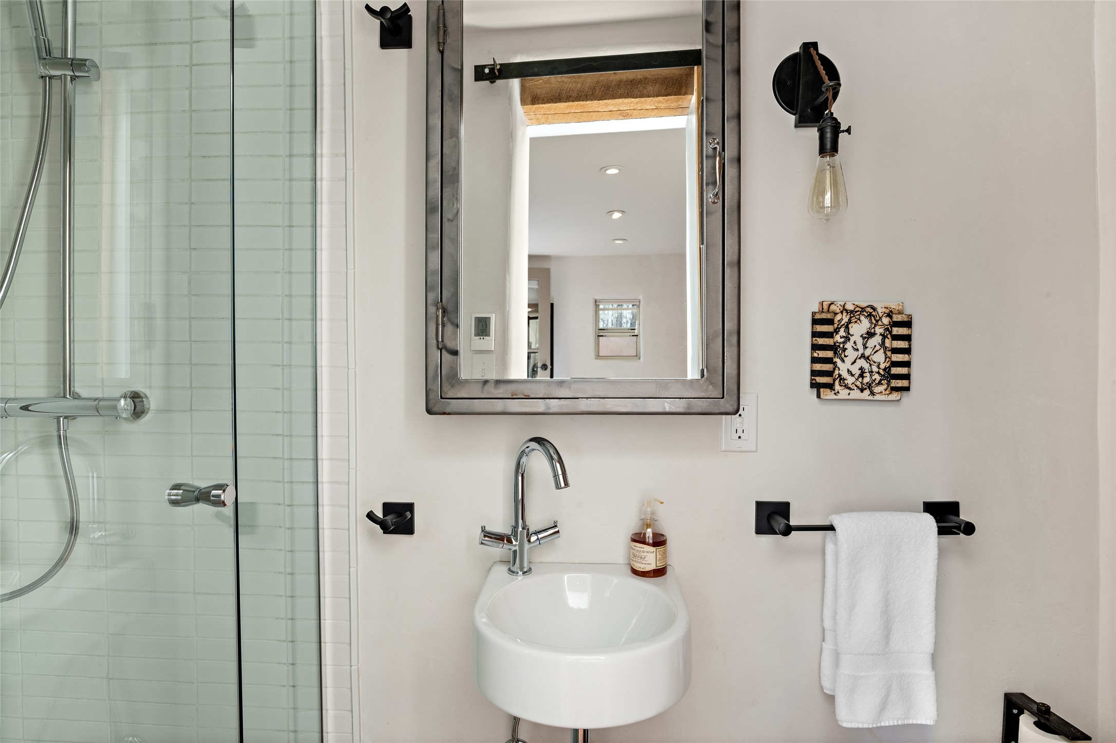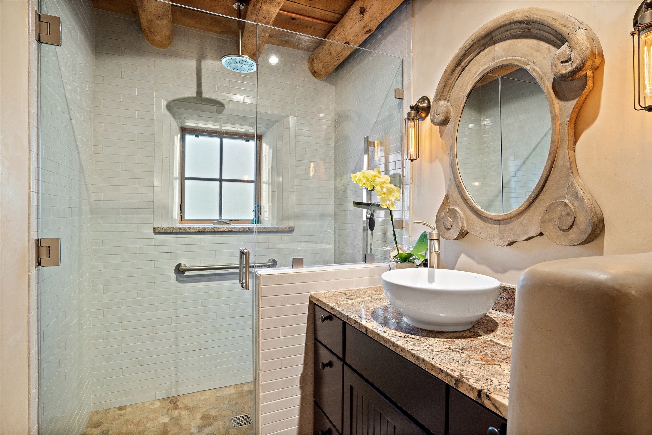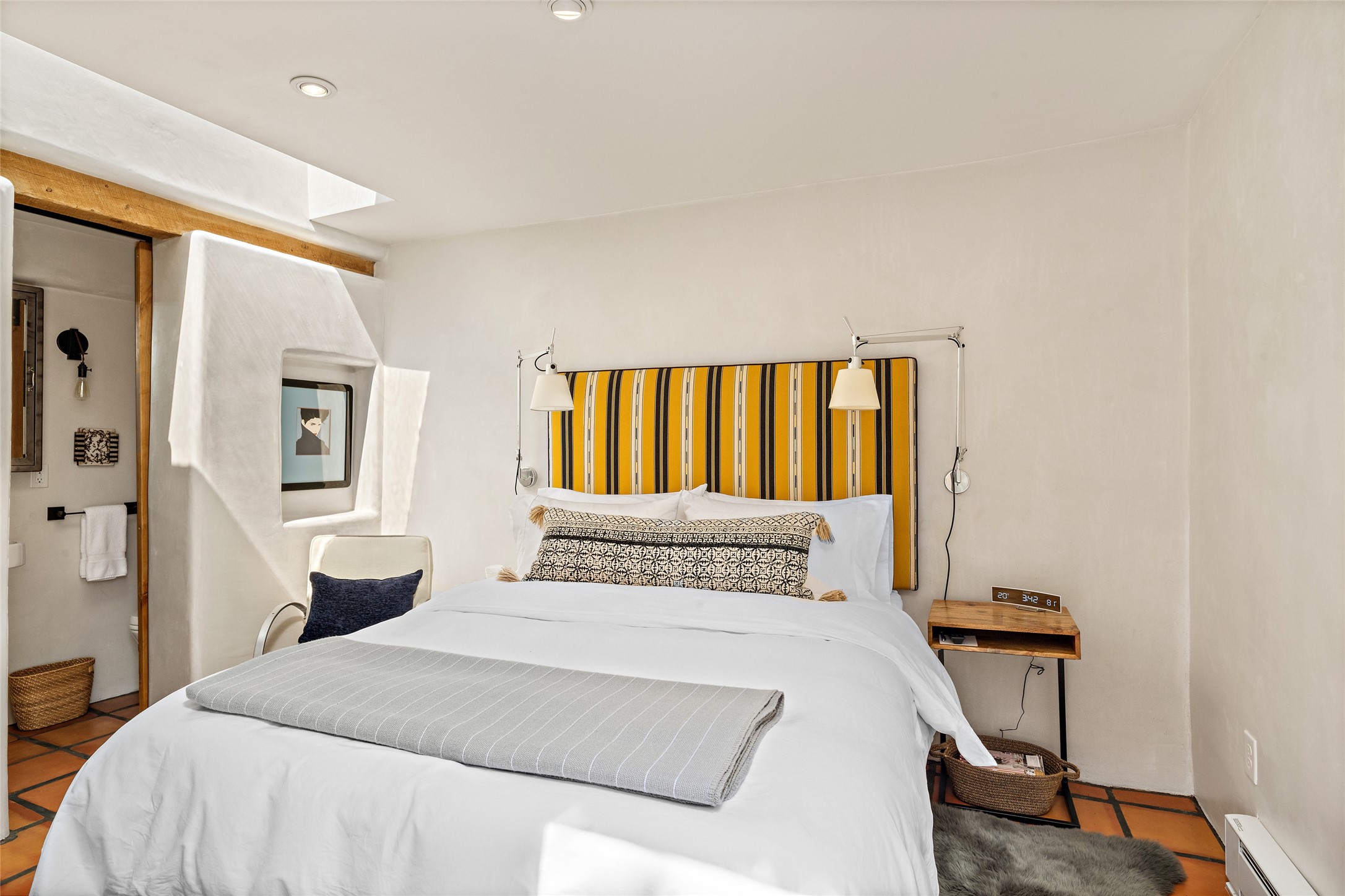Step back into history with this exquisitely updated and maintained Eastside Santa Fe property situated in a private and quiet location close to Canyon Road. Comprised of a 1,020 +/- sq.ft., single-story adobe and frame constructed condo and detached 156 +/-sq.ft. frame and stucco casita, the property is completely surrounded by year-long sea-sonal, lush and mature landscaping, a backyard water feature and lovely walled and gated spaces attracting a wide array of native birds under a canopy of greenery; garden views from every window. Inside the main home, there are 2 large bedrooms and a re-cently renovated bathroom. A lovely kiva wood burning fireplace graces one bedroom, the other bedroom having backyard garden access. The open-concept galley kitchen, dining and living area is appointed with another wood burning kiva fireplace. The ca-sita consists of a large bedroom and ensuite bathroom with a skylight allowing for natu-ral sunlight during the day and star gazing at night, welcoming guests with a private and uplifting stay. Smooth plaster walls, vigas, wood and tile floors grace the spaces with classic Santa Fe charm. There are two dedicated off-street parking spots in this small four-unit complex. A large basement with interior access is ideal for storage and access to the mechanicals. A new roof which was installed in 2022 with a transferrable warranty in place, as well as zoned landscape irrigation and lighting systems are just some of the special details of this sweet hidden Santa Fe property nestled in the trees.