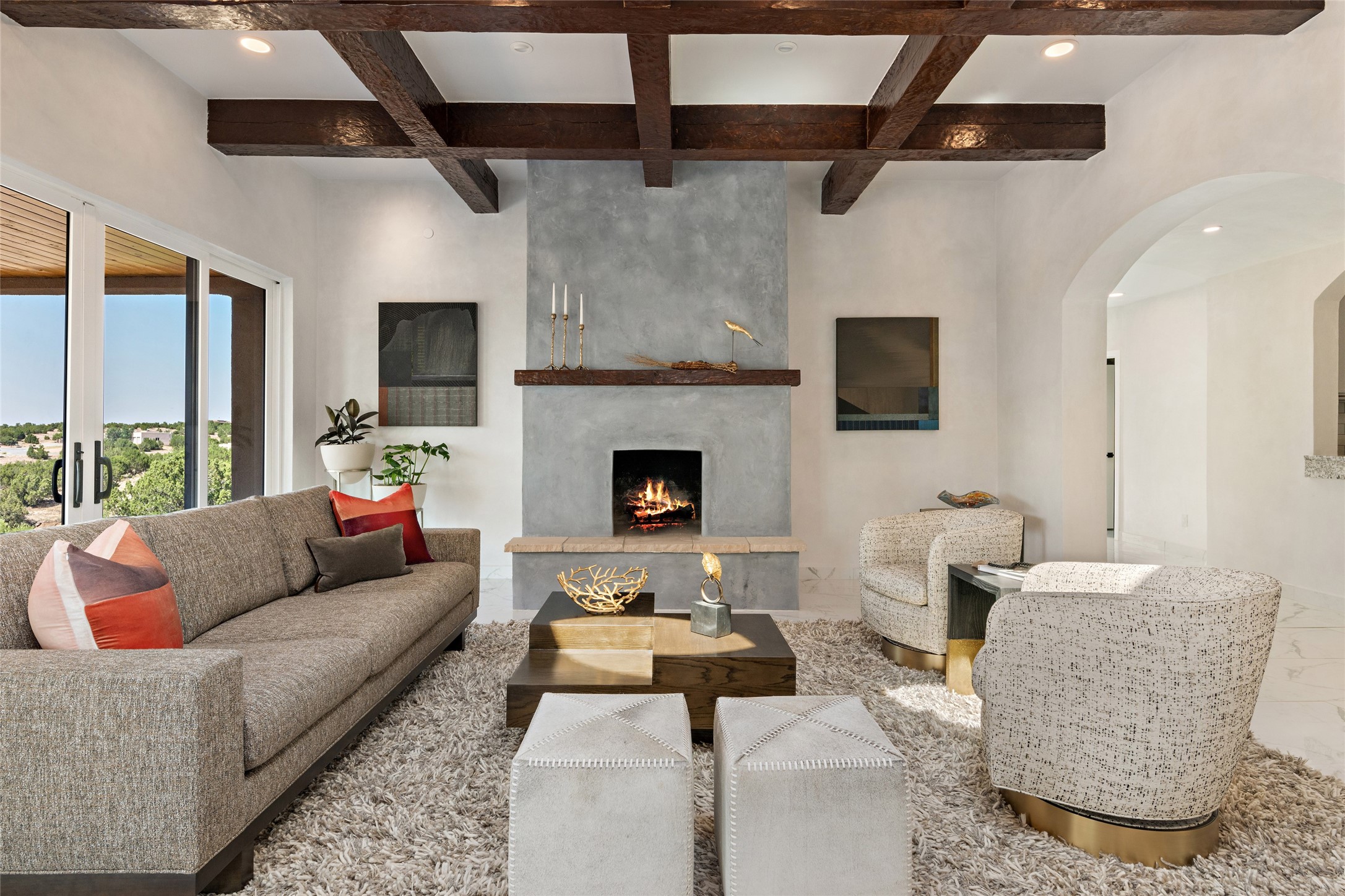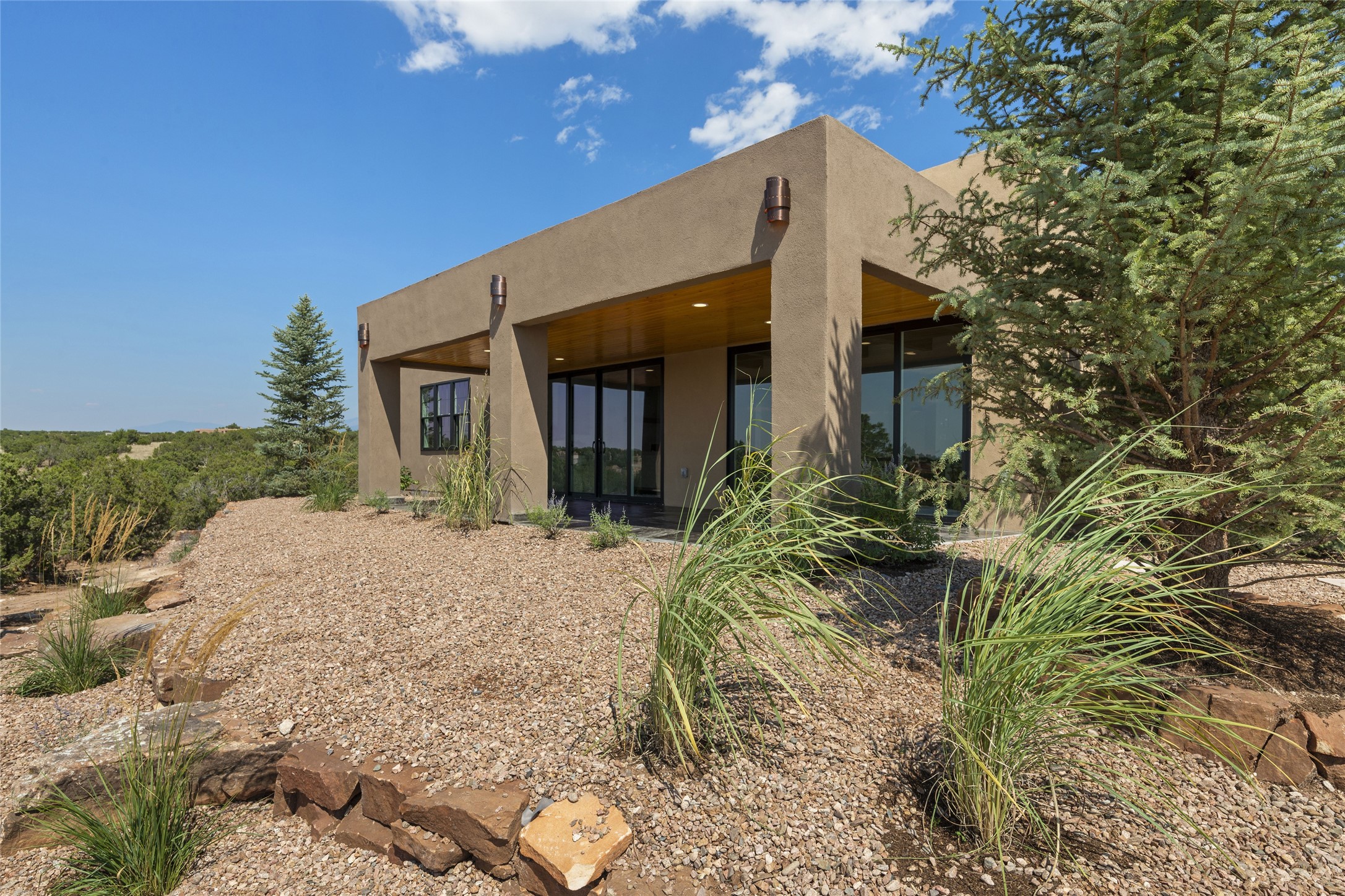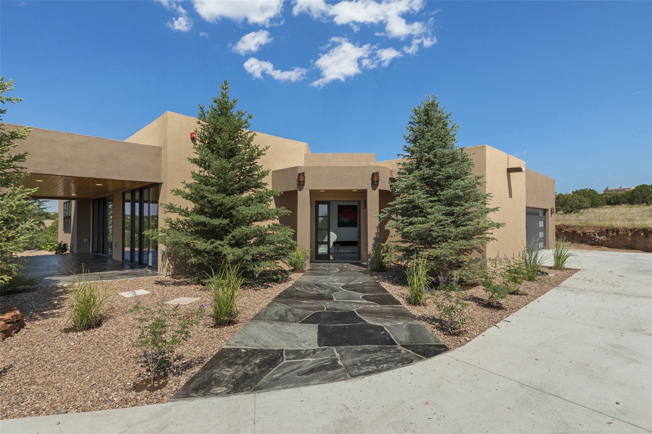This newly constructed home on two rolling acres offers inspiring Jemez and Sangre de Cristo Mountains views, contemporary conveniences and beautiful finishes throughout. The smart, single-level floor plan was designed to satisfy the needs of various lifestyles with seamless transitions between the open interior and exterior living areas, three private bedroom suites, plus a dedicated office. Multiple chefs can enjoy cooking together in the showcase kitchen which includes a center island with seating and storage, three built-in buffets, a large butler's pantry, and a wine storage pantry. Meanwhile friends and family can relax in the adjacent living-dining room or family room each with its own view portal and fireplace. In the gracious primary bedroom suite, relax in front of the kiva fireplace or on the view portal, or luxuriate in the incredible spa bathroom with a steam shower, soaking tub and dual walk-in closets. Design elements include arched doorways, hand-troweled diamond plaster walls, lighted nichos, built-in shelving, and hand-carved beams. An oversized 2-car garage, new mechanical systems and a 6,000 gallon water harvesting cistern serving two irrigation zones complete the low-maintenance, quality-of-life package.
