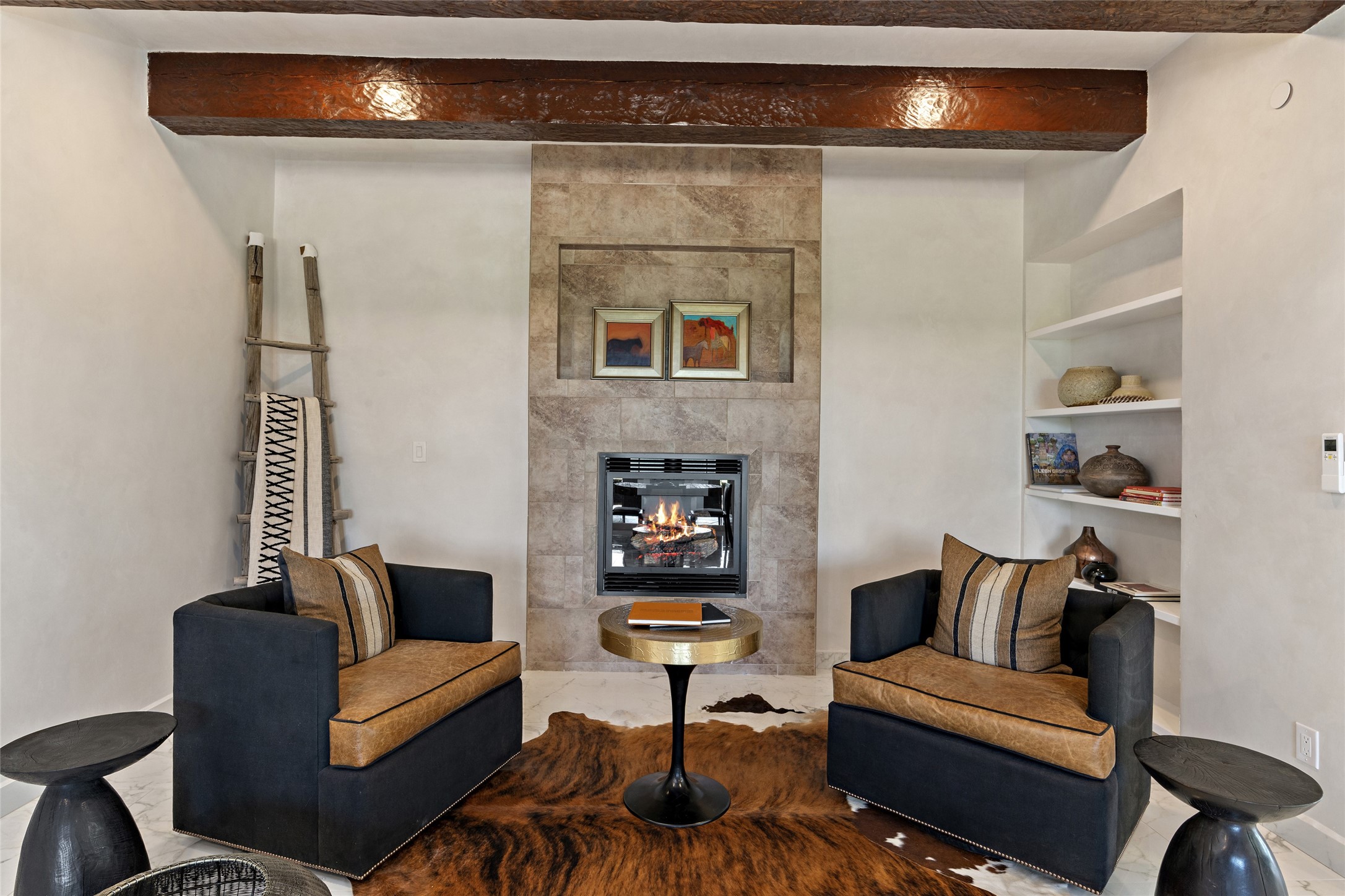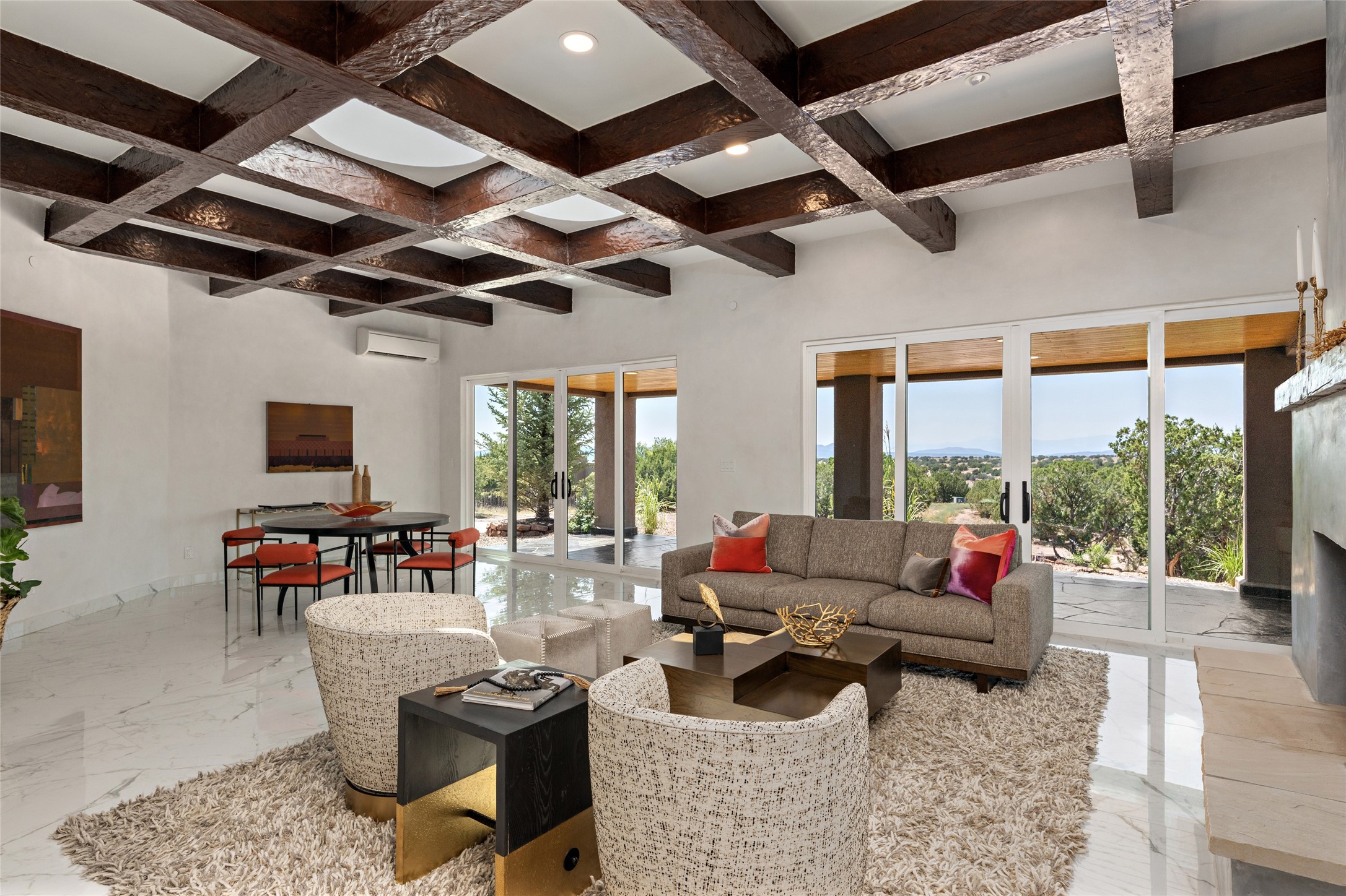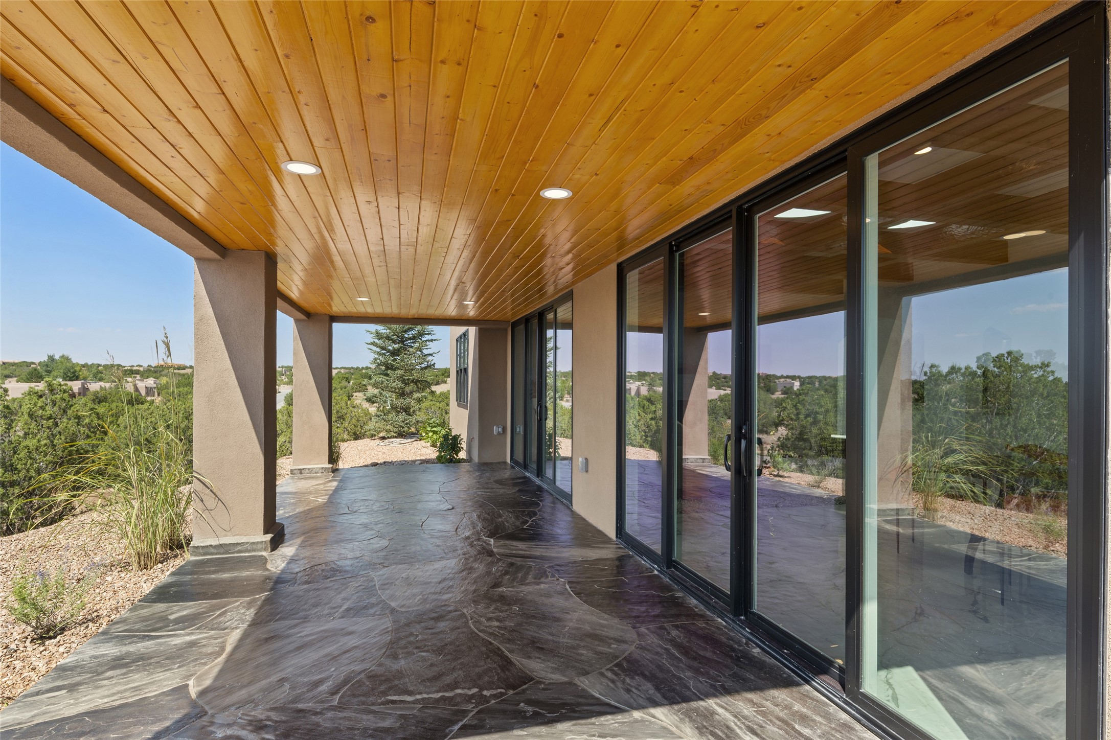This newly constructed home on two rolling acres offers inspiring Jemez and Sangre de Cristo Mountains views, contemporary conveniences and beautiful finishes throughout. The smart, single-level floor plan was designed to satisfy the needs of various lifestyles with seamless transitions between the open interior and exterior living areas, three private bedroom suites, plus a dedicated office. Multiple chefs can enjoy cooking together in the showcase kitchen which includes a center island with seating and storage, three built-in buffets, a large butler's pantry, and a wine storage pantry. Meanwhile friends and family can relax in the adjacent living-dining room or family room each with its own view portal and fireplace. In the gracious primary bedroom suite, relax in front of the kiva fireplace or on the view portal, or luxuriate in the incredible spa bathroom with a steam shower, soaking tub and dual walk-in closets. Design elements include arched doorways, hand-troweled diamond plaster walls, lighted nichos, built-in shelving, and hand-carved beams. An oversized 2-car garage, new mechanical systems and a 6,000 gallon water harvesting cistern serving two irrigation zones complete the low-maintenance, quality-of-life package.
