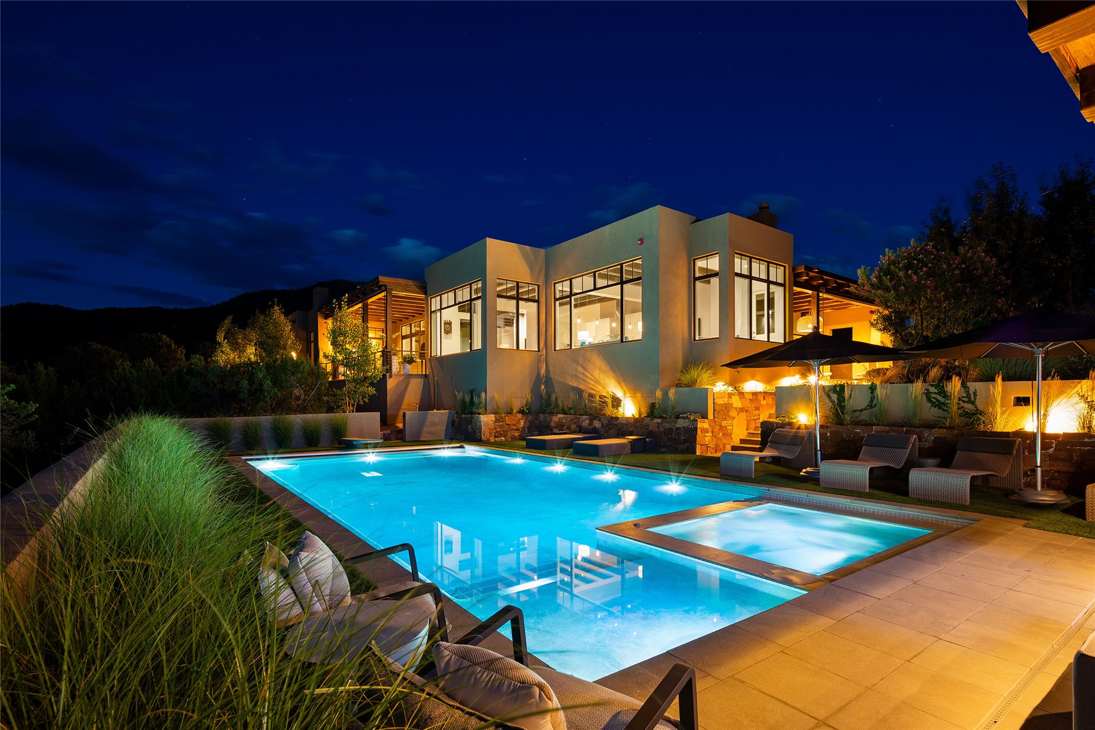 One of the most extraordinary estates in all of Santa Fe, this exceptional 2018-built residence by the awarding winning, Woods Design Builders excites and captivates with powerful architecture, stunning, expansive views mountain, city and sunset views, and a rare resort-style diving pool, spa, and cabana. Located within Wilderness Gate, and sited on a superior, elevated 5 acre view lot, this exquisite gated residence, exemplifies the unique blend of sophisticated contemporary design with inherent Santa Fe warmth. Designed with a grand open concept living experience, with seamless surround view windows, this fabulous home stuns upon entering through the glass and metal pivot front entrance door into the living room and dining room, complete with a custom metal accent wall, fireplace, wet bar, wine cooler, and sliding glass doors which open to the epic mountain and city views and the the outdoor covered portal with a BBQ and fireplace. The ultimate entertainer's kitchen delights with an expansive island with waterfall Taj Mahal counters, pantry, dual sinks, and luxury appliances, which opens to a casual dining and living room with a fireplace. The luxurious owner's suite delights with majestic views, private portal, an attached office area, sitting room or an ideal media room, and a state-of-the art bath complete with a jetted tub, steam shower, and generous walk-in closet. Separate from the owner's suite are two well-appointed guest bedroom ensuites, plus an additional living room with an office niche. The newly installed heated pool and spa with a fully equipped cabana defines excellence, with resistance swim jets, an outdoor kitchen, fireplace and media center. Additional luxury features include white oak flooring, lush vibrant surround gardens with multiple outdoor entertainment areas, plaster walls, and rich beams with steel accents throughout, and all within minutes from the Plaza, steps away from Atalaya Mnt, St. Johns College, and the Dale Ball trail system.