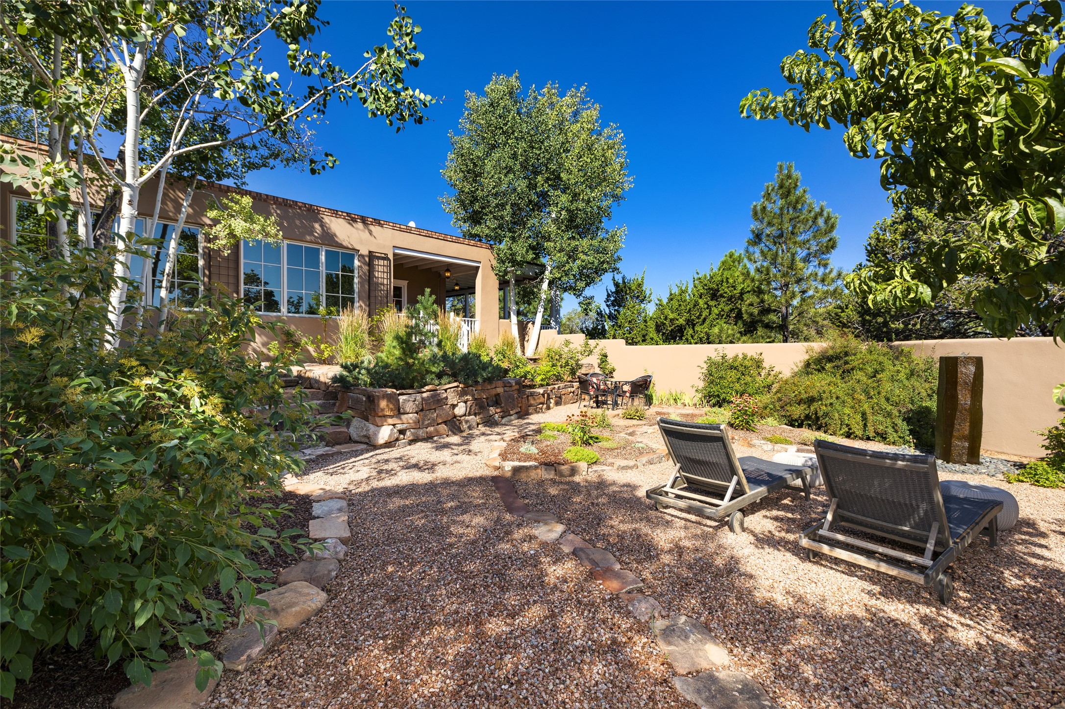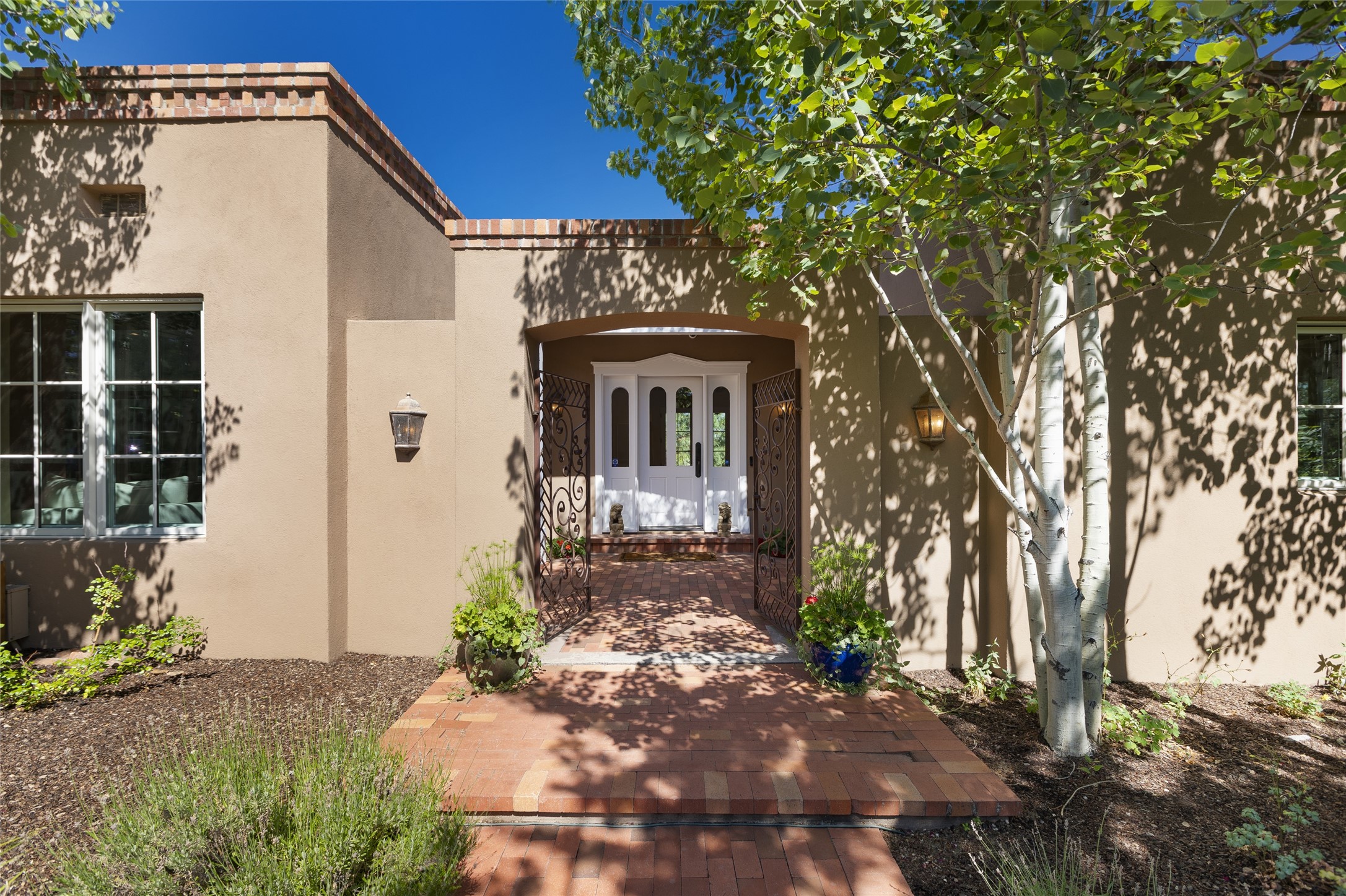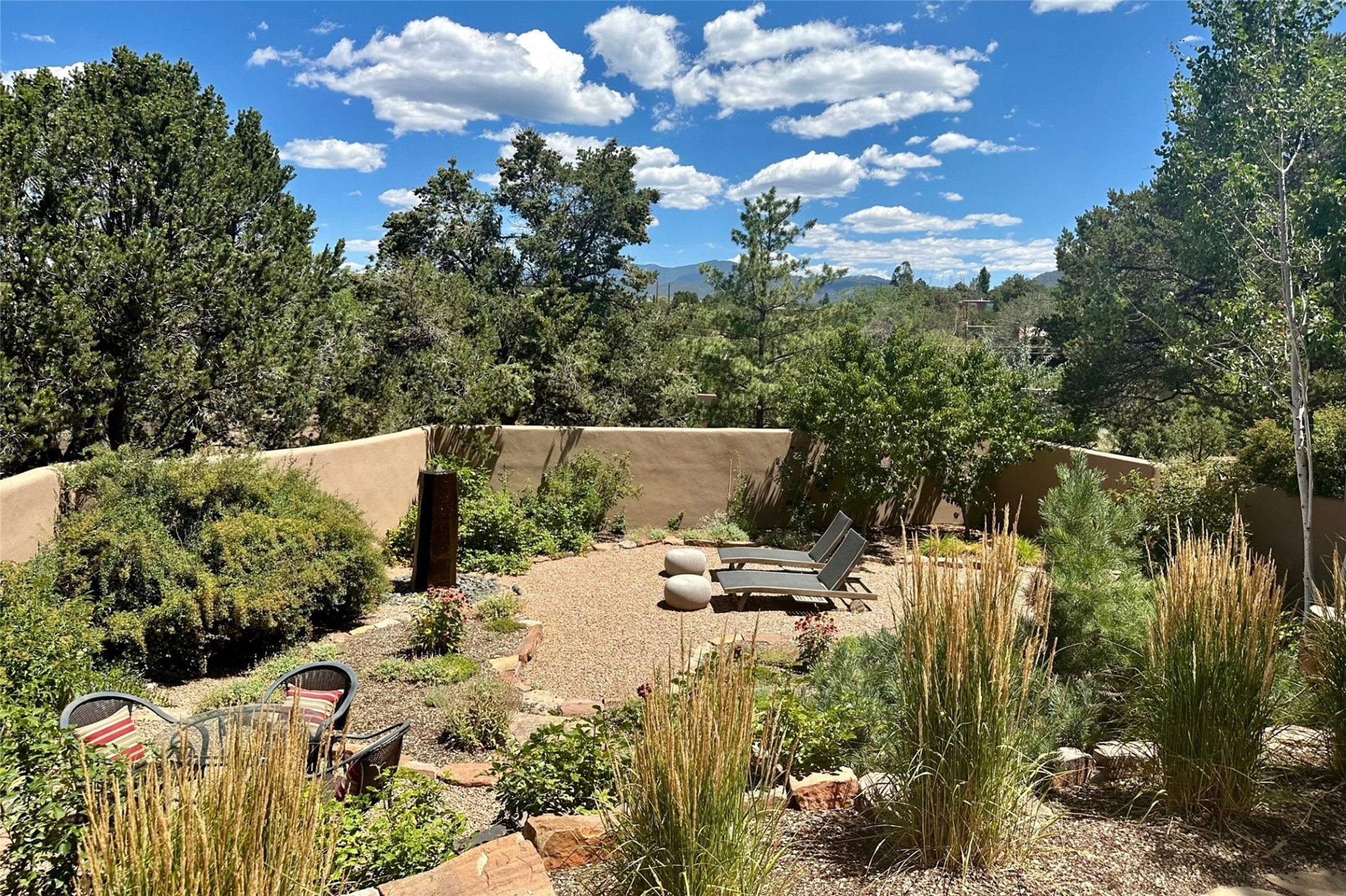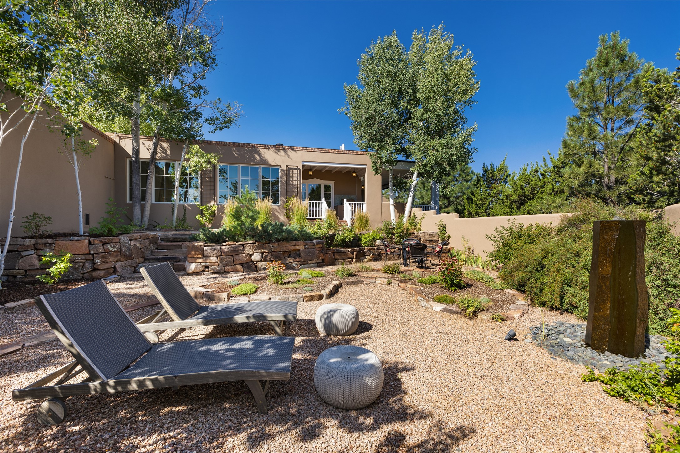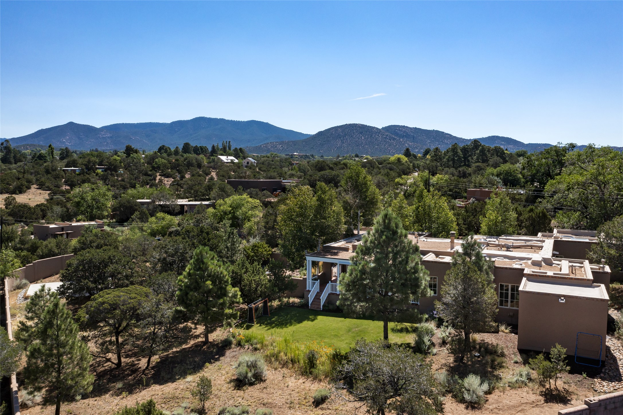 One of the most extraordinary estates in all of Santa Fe, this exquisite, beautifully renovated gated residence by Woods Design Builders, sited on a one-acre view lot, within the ultimate park-like setting, excites and captivates with powerful architecture and exceptional Sangre de Cristo and Jemez Mountain views. Located on one of most secluded and highly sought after streets in Santa Fe, within close proximity to the Plaza and Canyon Road, this quality 4-bedroom home with 3.5 baths, two living rooms and an office area, exemplifies the unique blend of modern design with inherent warmth and sophistication. Ideal for entertaining, this Parade of Homes, award-winning home, offers the ultimate state of the art kitchen complete with luxury appliances, Calacatta Amber marble counters, wine cooler, and dual breakfast bars with expansive seating, which opens to the spacious living room, dining area, and casual living room or breakfast dining area, all with portal access and dual fireplaces. The spacious owner's suite stuns with a grand fireplace, office niche, portal access and the newly expanded and renovated, luxurious spa-like bath with a soaking tub, walk-in shower and large dual closets. Separate from the owner's suite is a fully independent guest wing with an ensuite bedroom, two well-appointed guest bedrooms which share a full bath, a secondary living room, office area, and a cozy built-in daybed. The outdoor living areas are some of the finest in Santa Fe, with elevated outdoor seating which overlooks the mountain views and lush landscape, in addition to a private lounging area ideal for entertaining, complete with a tranquil water feature, surrounding gardens, and a basketball court. Additional features include a welcoming courtyard entrance with a water feature and privacy gate, wood flooring and natural stone counters, updated roof and stucco, and superior craftsmanship throughout.