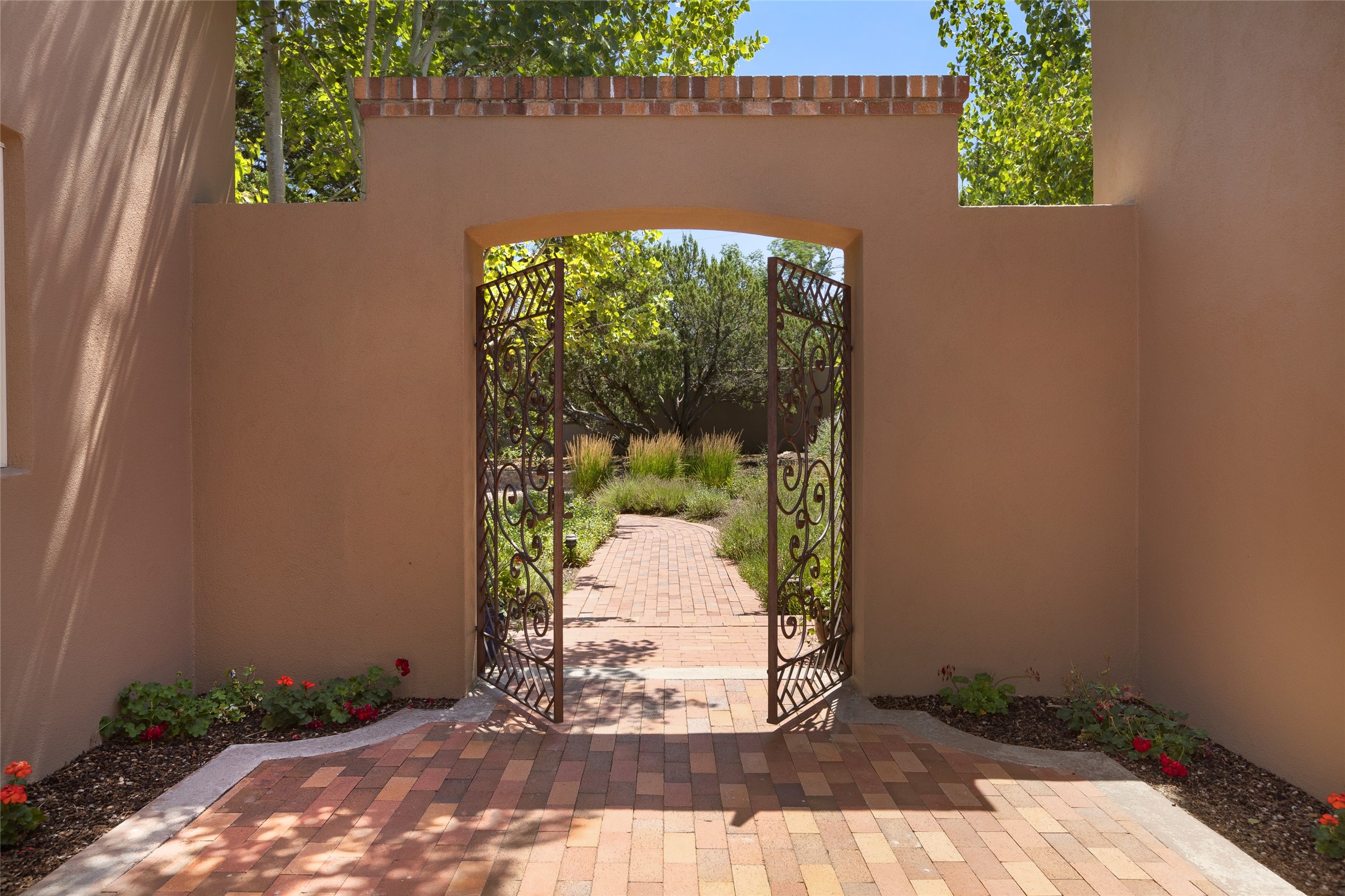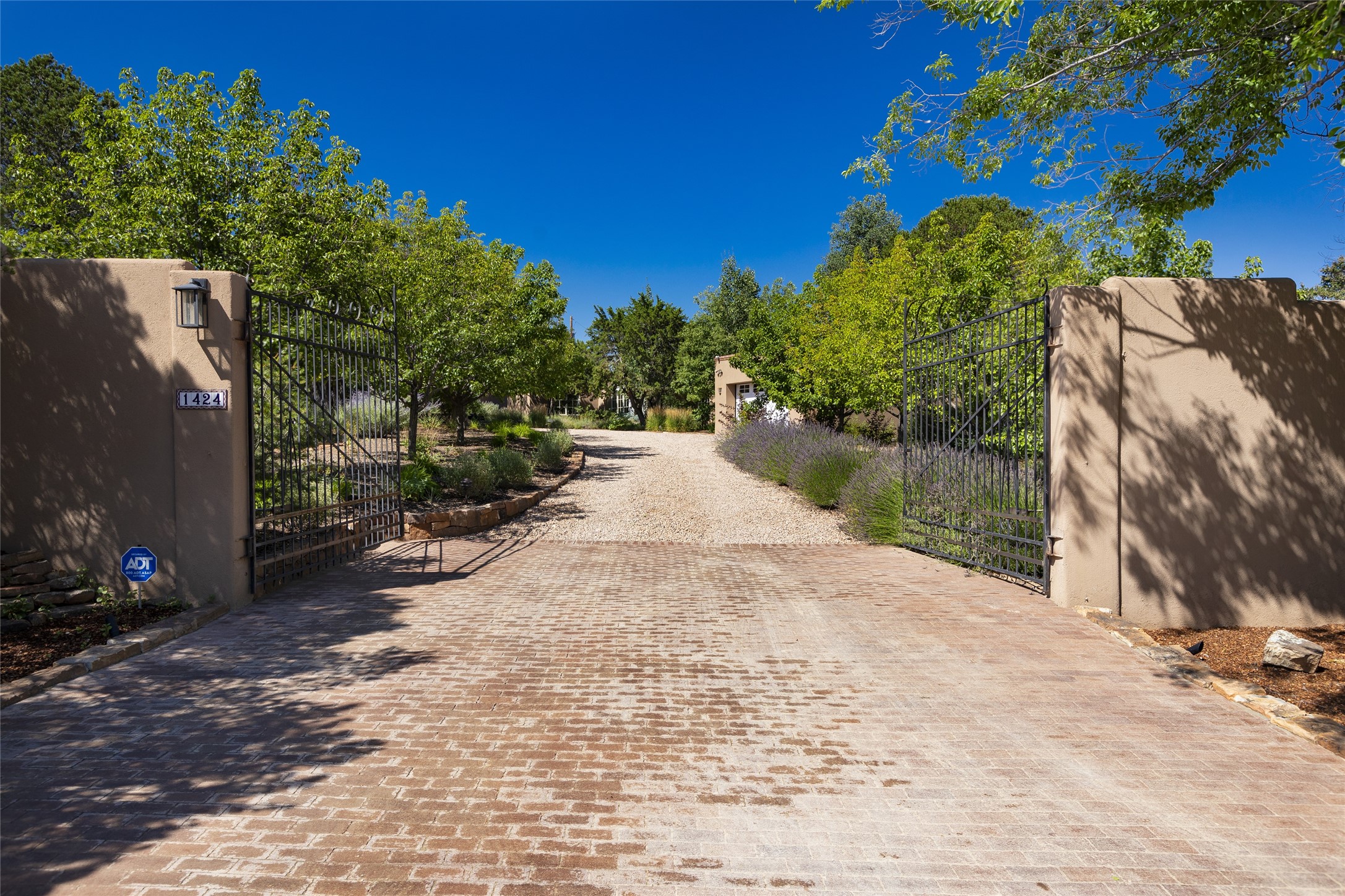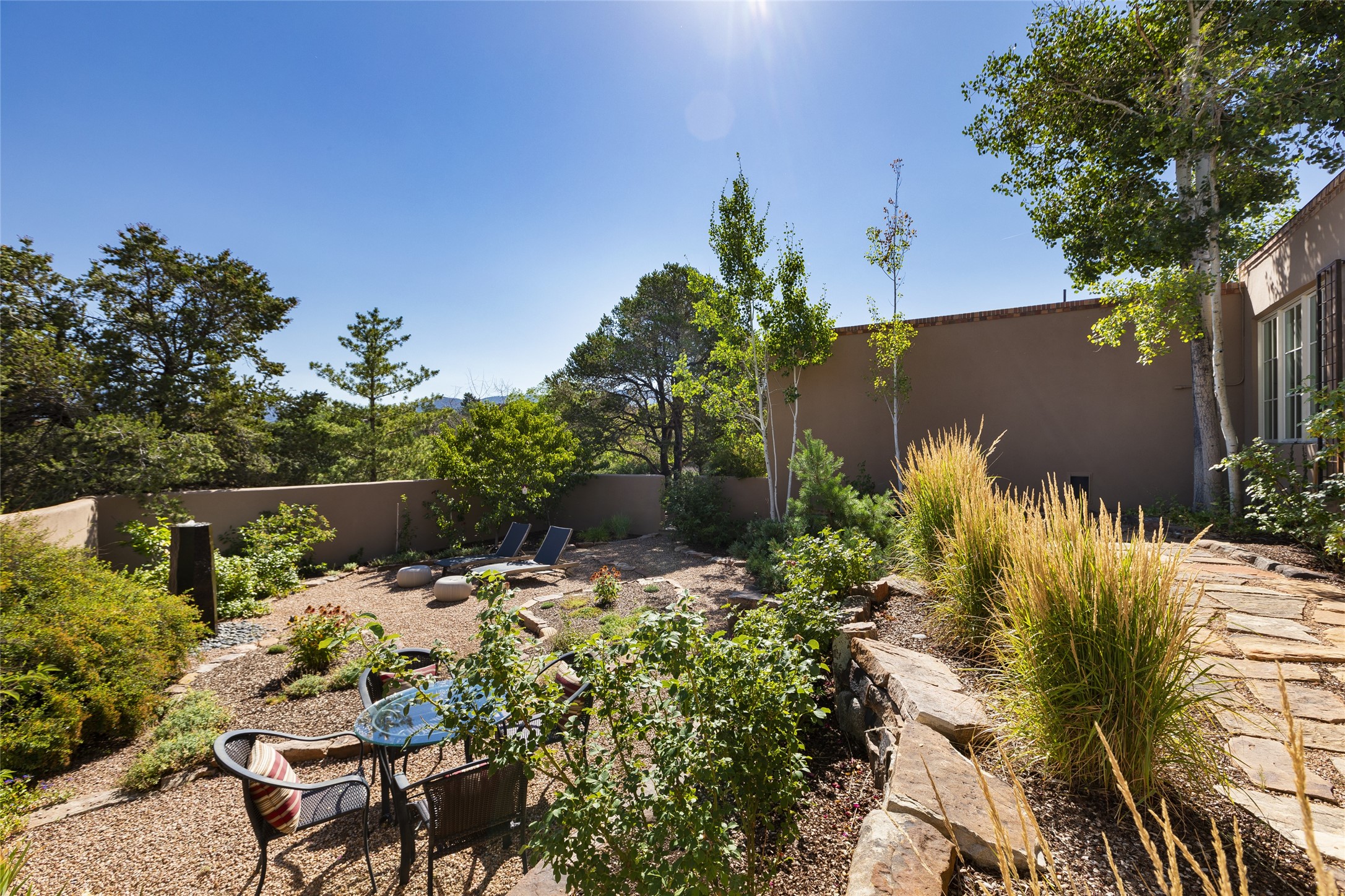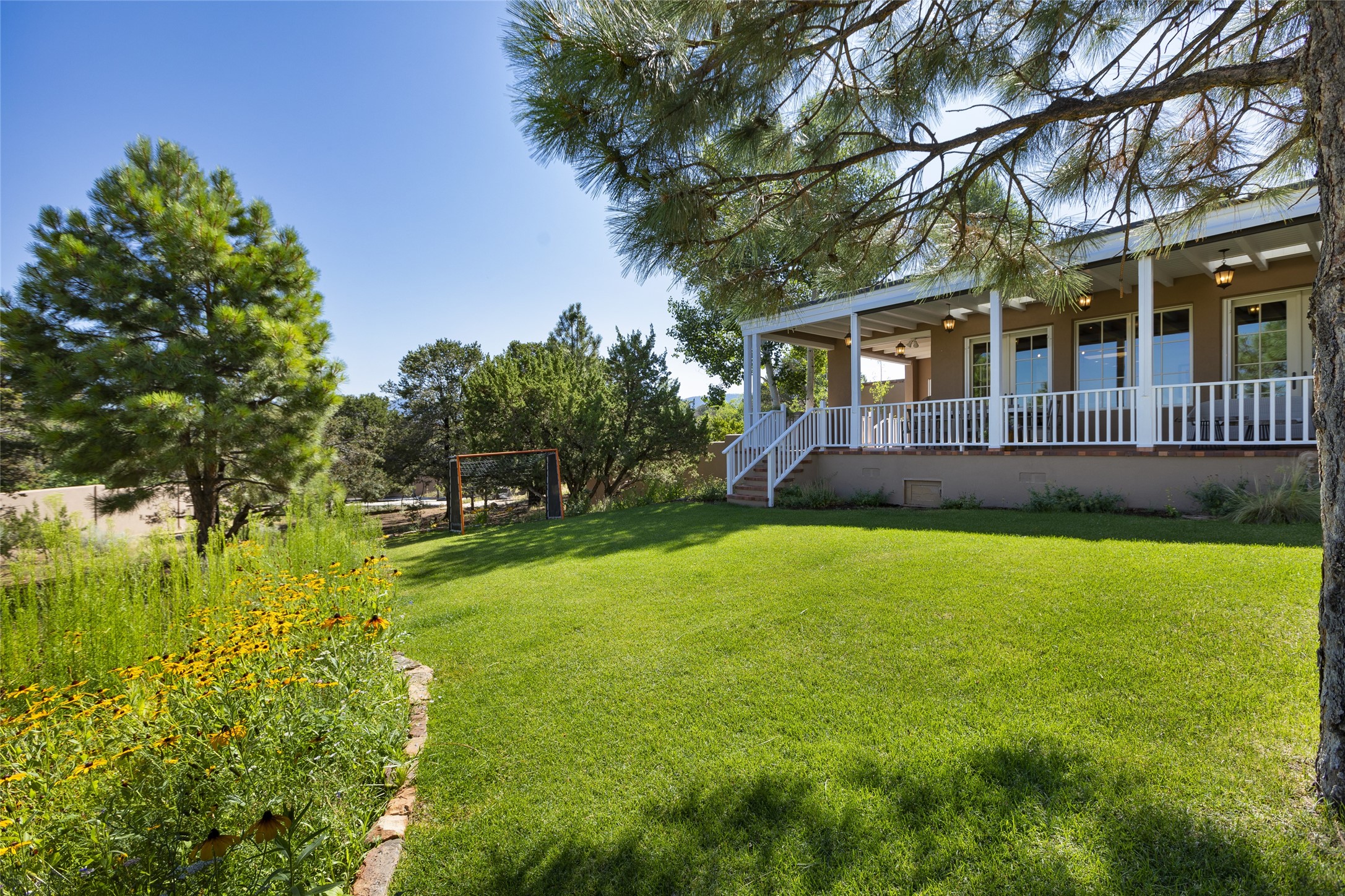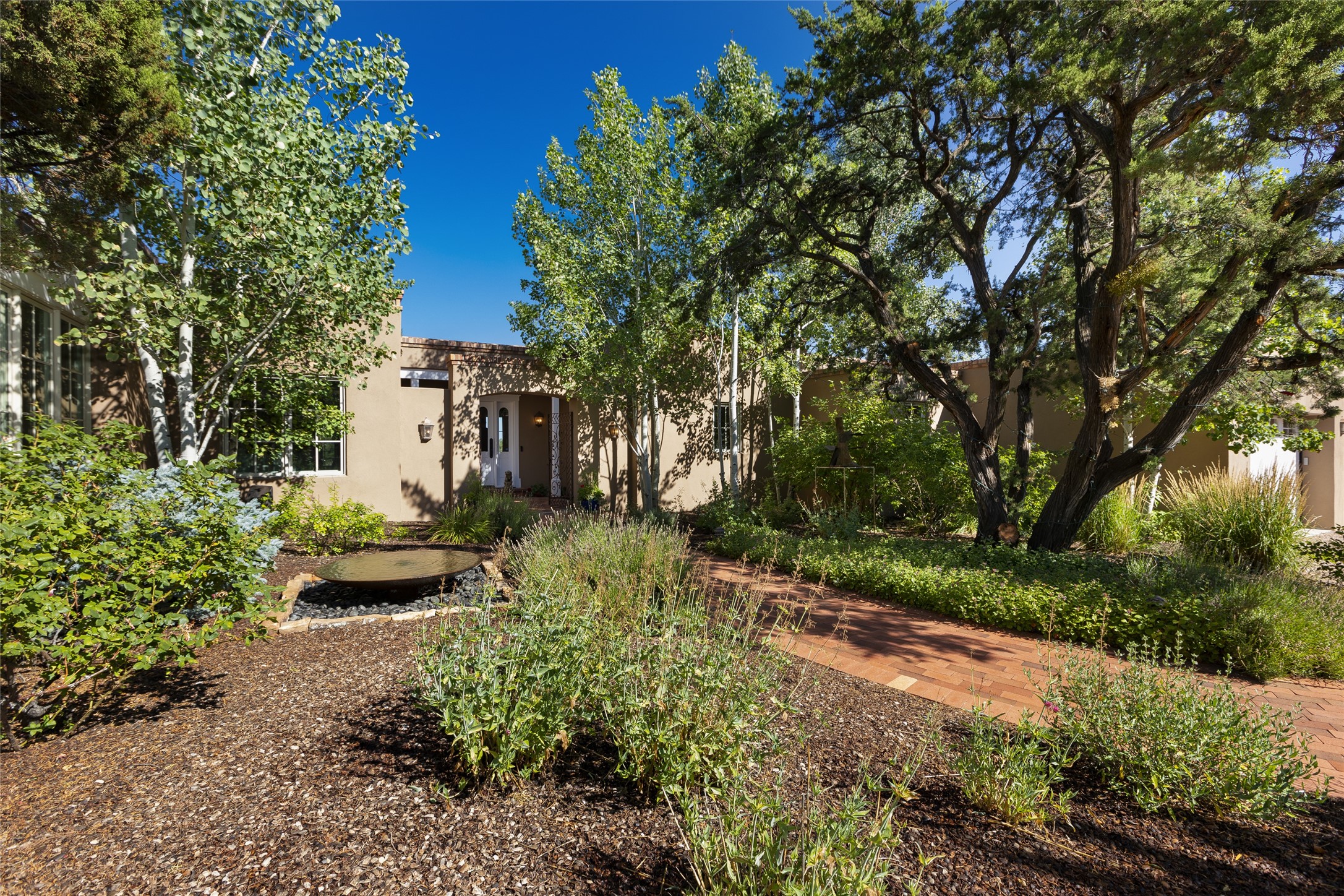 One of the most extraordinary estates in all of Santa Fe, this exquisite, beautifully renovated gated residence by Woods Design Builders, sited on a one-acre view lot, within the ultimate park-like setting, excites and captivates with powerful architecture and exceptional Sangre de Cristo and Jemez Mountain views. Located on one of most secluded and highly sought after streets in Santa Fe, within close proximity to the Plaza and Canyon Road, this quality 4-bedroom home with 3.5 baths, two living rooms and an office area, exemplifies the unique blend of modern design with inherent warmth and sophistication. Ideal for entertaining, this Parade of Homes, award-winning home, offers the ultimate state of the art kitchen complete with luxury appliances, Calacatta Amber marble counters, wine cooler, and dual breakfast bars with expansive seating, which opens to the spacious living room, dining area, and casual living room or breakfast dining area, all with portal access and dual fireplaces. The spacious owner's suite stuns with a grand fireplace, office niche, portal access and the newly expanded and renovated, luxurious spa-like bath with a soaking tub, walk-in shower and large dual closets. Separate from the owner's suite is a fully independent guest wing with an ensuite bedroom, two well-appointed guest bedrooms which share a full bath, a secondary living room, office area, and a cozy built-in daybed. The outdoor living areas are some of the finest in Santa Fe, with elevated outdoor seating which overlooks the mountain views and lush landscape, in addition to a private lounging area ideal for entertaining, complete with a tranquil water feature, surrounding gardens, and a basketball court. Additional features include a welcoming courtyard entrance with a water feature and privacy gate, wood flooring and natural stone counters, updated roof and stucco, and superior craftsmanship throughout.