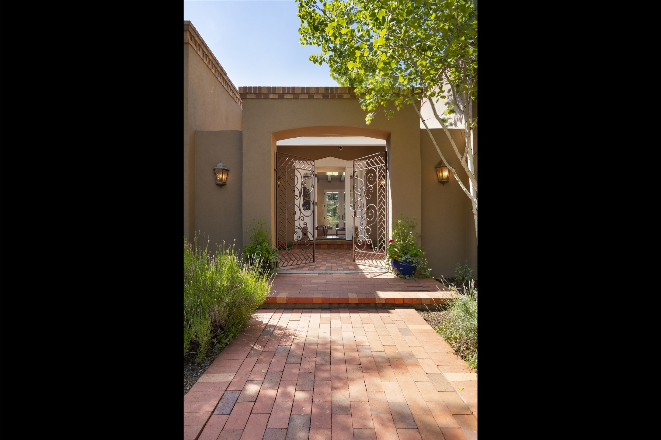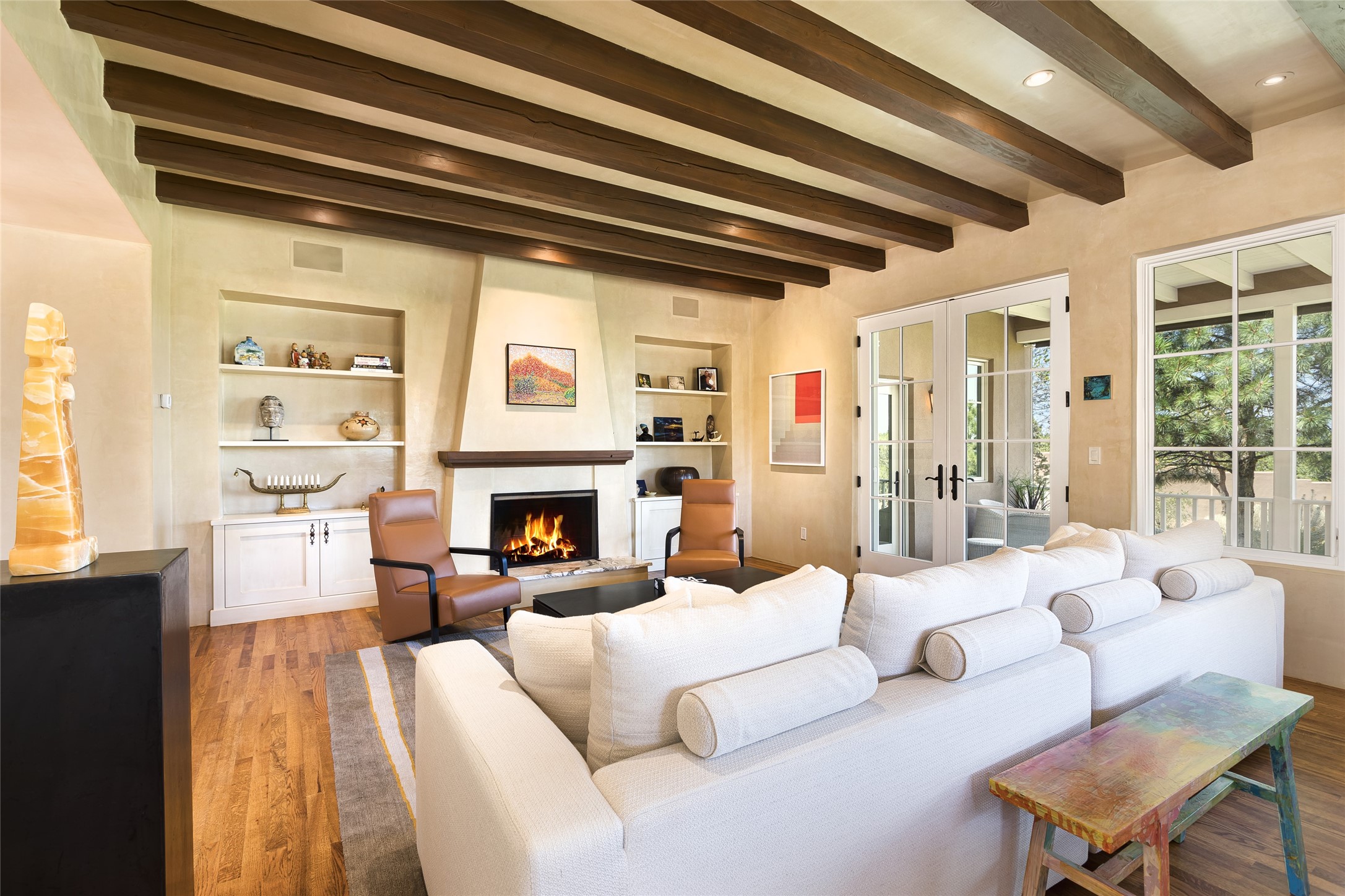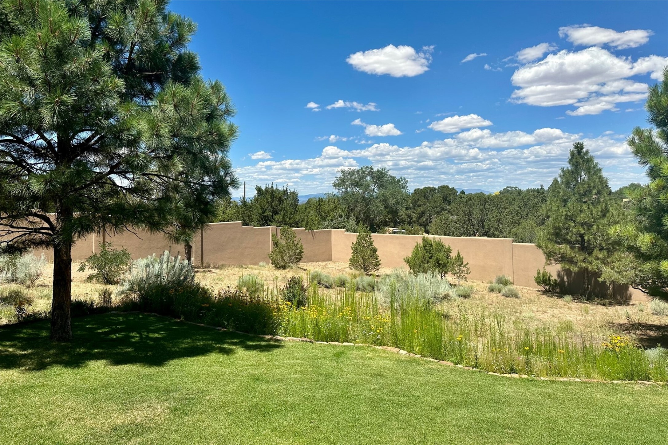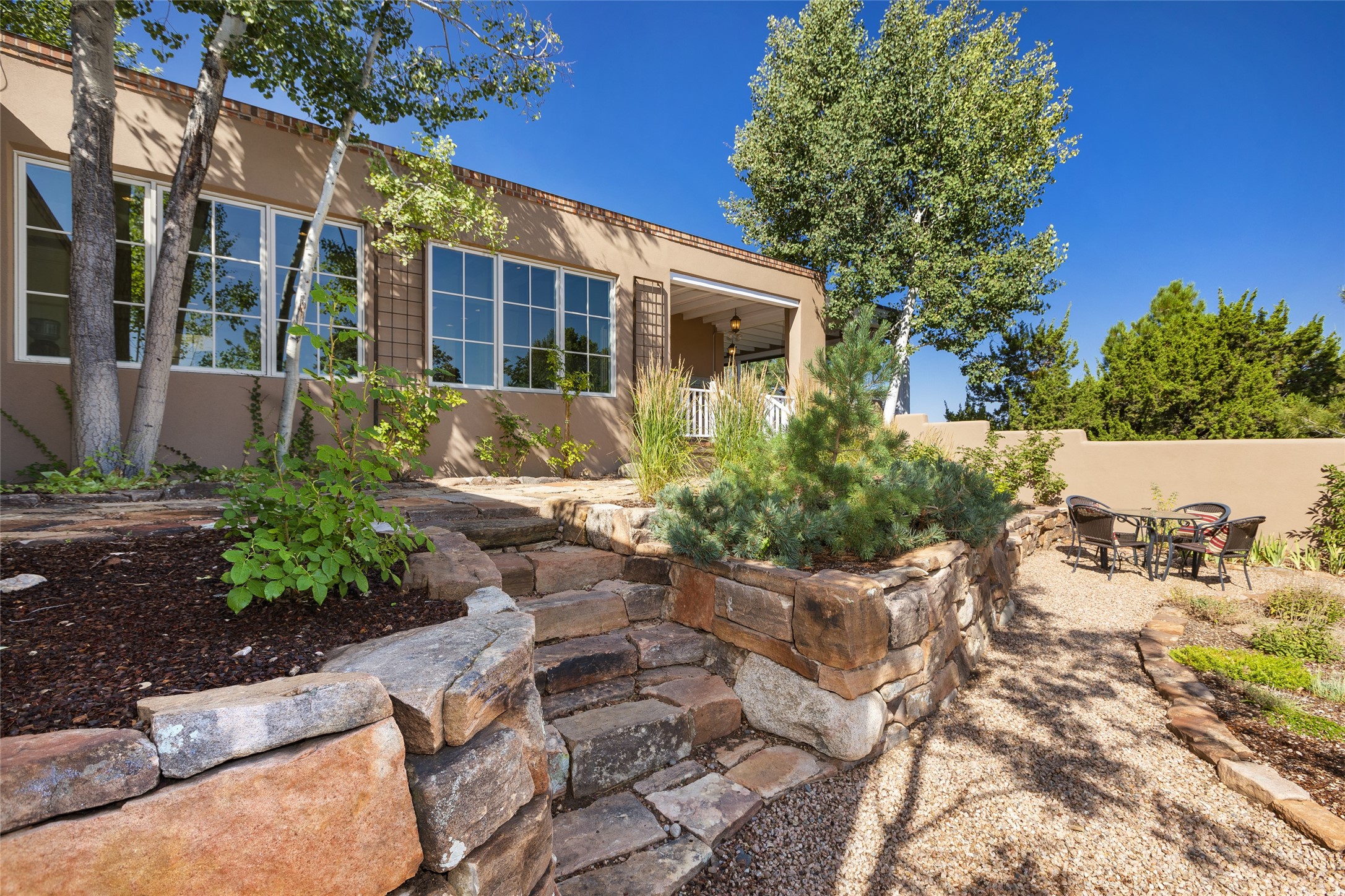 One of the most extraordinary estates in all of Santa Fe, this exquisite, beautifully renovated gated residence by Woods Design Builders, sited on a one-acre view lot, within the ultimate park-like setting, excites and captivates with powerful architecture and exceptional Sangre de Cristo and Jemez Mountain views. Located on one of most secluded and highly sought after streets in Santa Fe, within close proximity to the Plaza and Canyon Road, this quality 4-bedroom home with 3.5 baths, two living rooms and an office area, exemplifies the unique blend of modern design with inherent warmth and sophistication. Ideal for entertaining, this Parade of Homes, award-winning home, offers the ultimate state of the art kitchen complete with luxury appliances, Calacatta Amber marble counters, wine cooler, and dual breakfast bars with expansive seating, which opens to the spacious living room, dining area, and casual living room or breakfast dining area, all with portal access and dual fireplaces. The spacious owner's suite stuns with a grand fireplace, office niche, portal access and the newly expanded and renovated, luxurious spa-like bath with a soaking tub, walk-in shower and large dual closets. Separate from the owner's suite is a fully independent guest wing with an ensuite bedroom, two well-appointed guest bedrooms which share a full bath, a secondary living room, office area, and a cozy built-in daybed. The outdoor living areas are some of the finest in Santa Fe, with elevated outdoor seating which overlooks the mountain views and lush landscape, in addition to a private lounging area ideal for entertaining, complete with a tranquil water feature, surrounding gardens, and a basketball court. Additional features include a welcoming courtyard entrance with a water feature and privacy gate, wood flooring and natural stone counters, updated roof and stucco, and superior craftsmanship throughout.
