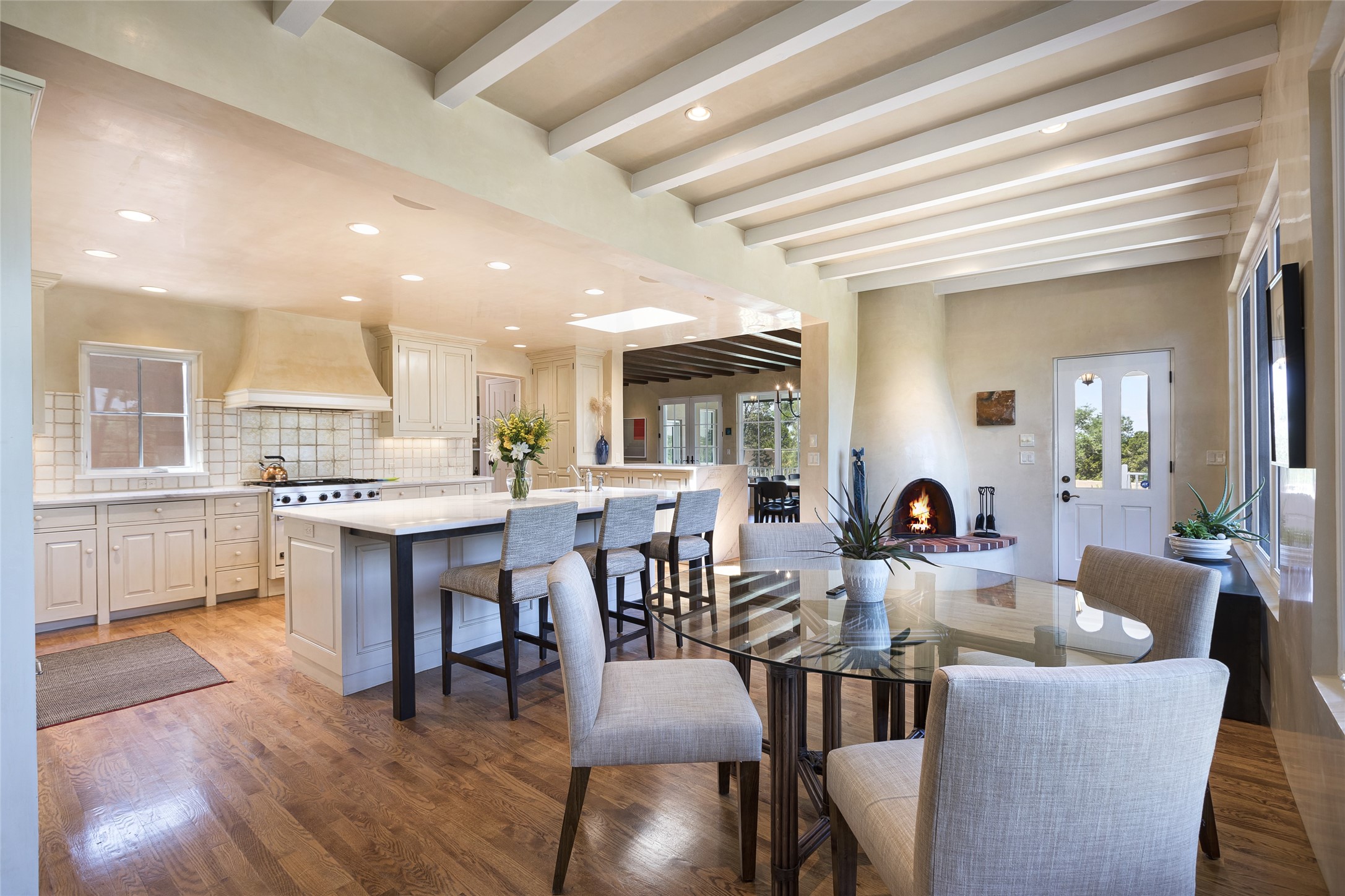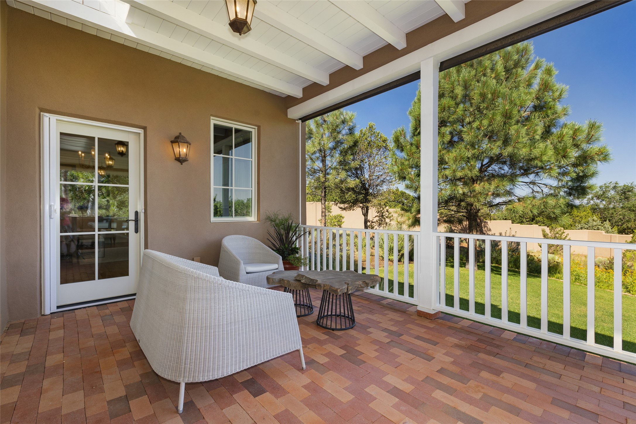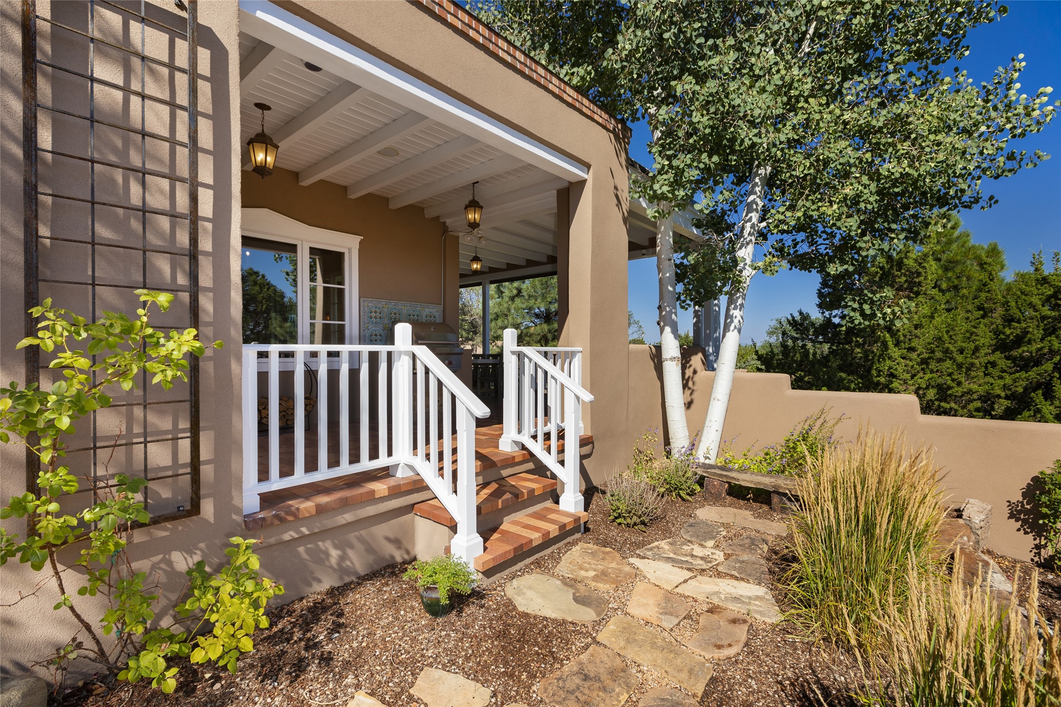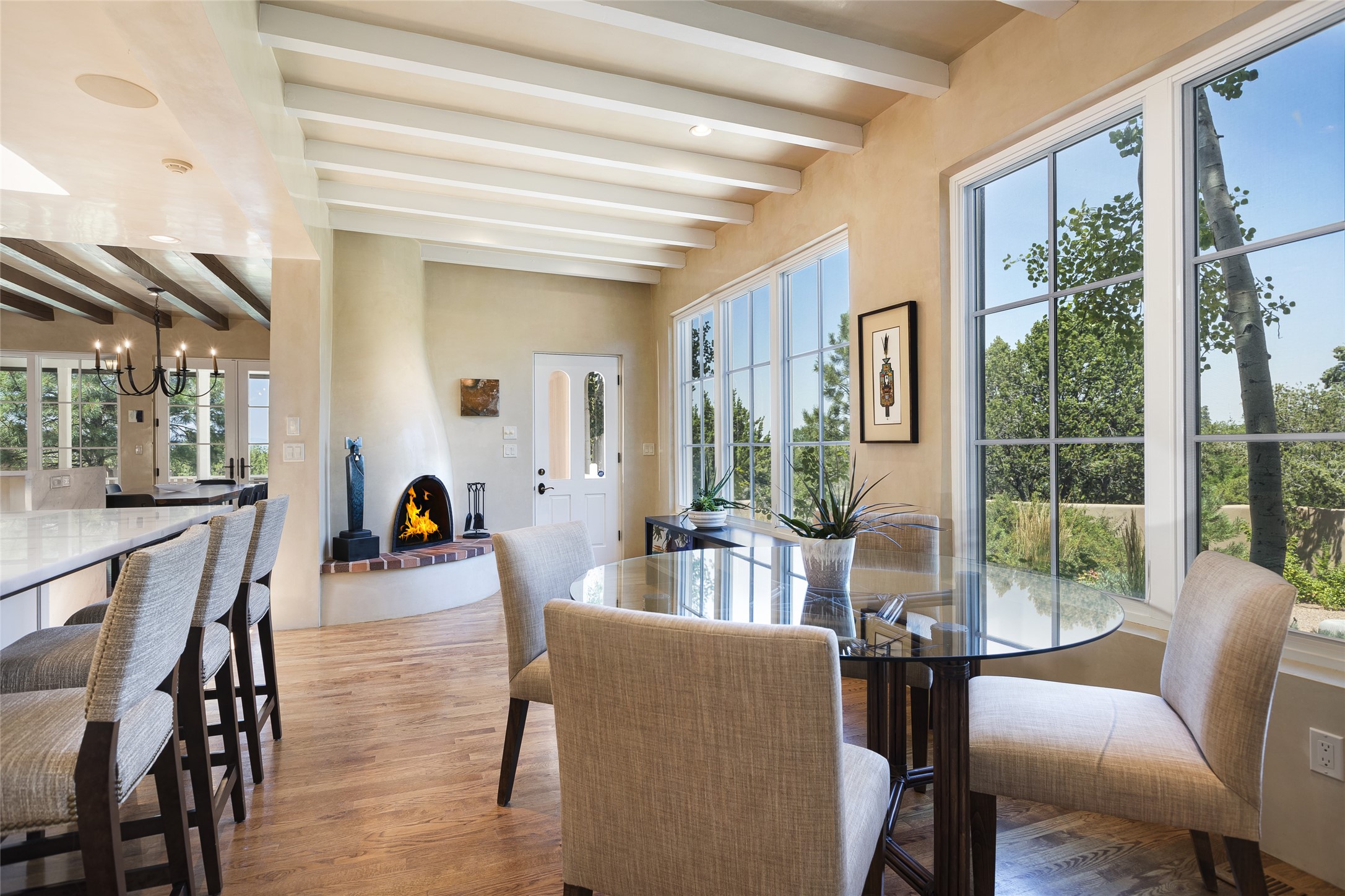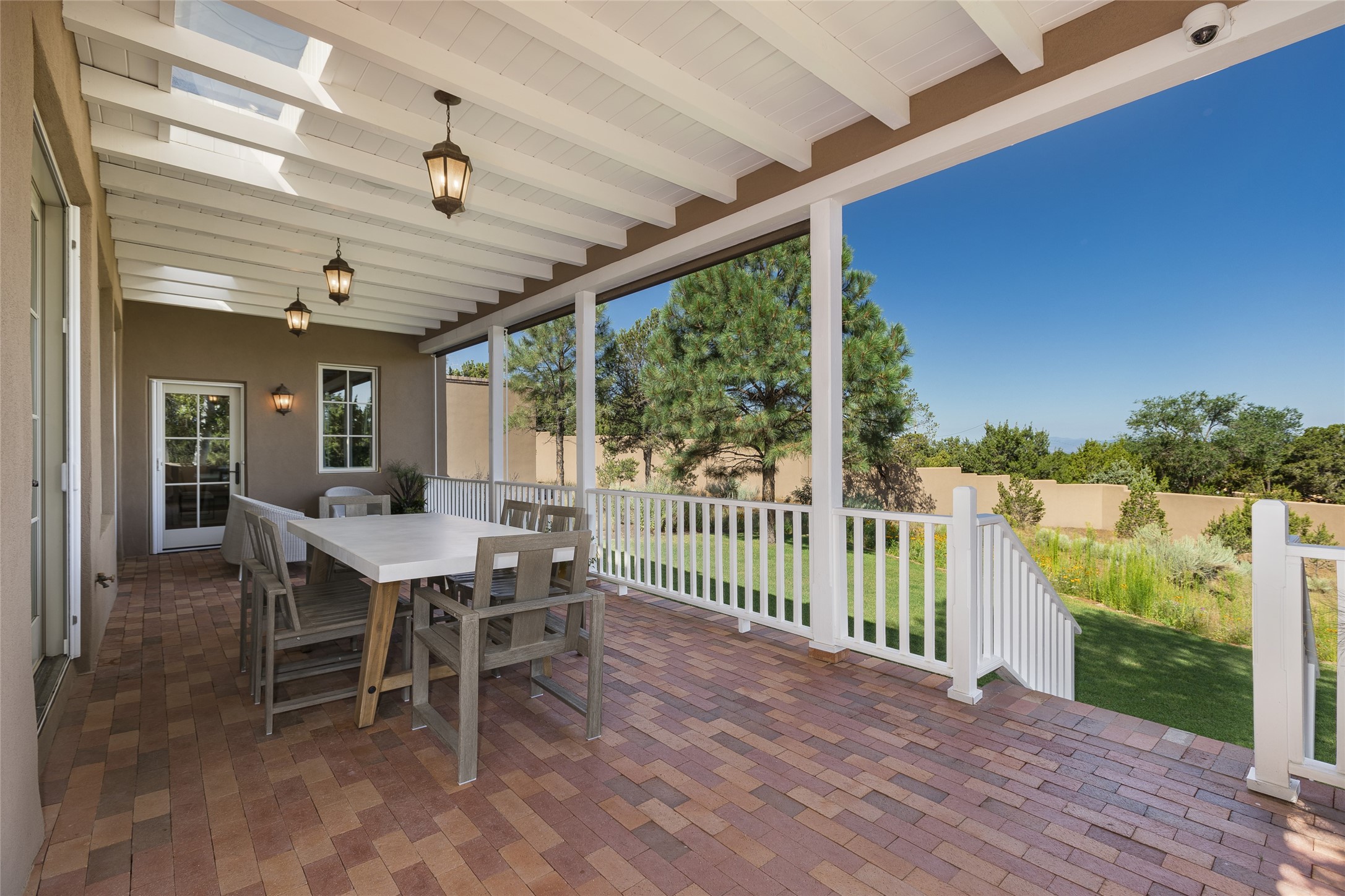 One of the most extraordinary estates in all of Santa Fe, this exquisite, beautifully renovated gated residence by Woods Design Builders, sited on a one-acre view lot, within the ultimate park-like setting, excites and captivates with powerful architecture and exceptional Sangre de Cristo and Jemez Mountain views. Located on one of most secluded and highly sought after streets in Santa Fe, within close proximity to the Plaza and Canyon Road, this quality 4-bedroom home with 3.5 baths, two living rooms and an office area, exemplifies the unique blend of modern design with inherent warmth and sophistication. Ideal for entertaining, this Parade of Homes, award-winning home, offers the ultimate state of the art kitchen complete with luxury appliances, Calacatta Amber marble counters, wine cooler, and dual breakfast bars with expansive seating, which opens to the spacious living room, dining area, and casual living room or breakfast dining area, all with portal access and dual fireplaces. The spacious owner's suite stuns with a grand fireplace, office niche, portal access and the newly expanded and renovated, luxurious spa-like bath with a soaking tub, walk-in shower and large dual closets. Separate from the owner's suite is a fully independent guest wing with an ensuite bedroom, two well-appointed guest bedrooms which share a full bath, a secondary living room, office area, and a cozy built-in daybed. The outdoor living areas are some of the finest in Santa Fe, with elevated outdoor seating which overlooks the mountain views and lush landscape, in addition to a private lounging area ideal for entertaining, complete with a tranquil water feature, surrounding gardens, and a basketball court. Additional features include a welcoming courtyard entrance with a water feature and privacy gate, wood flooring and natural stone counters, updated roof and stucco, and superior craftsmanship throughout.