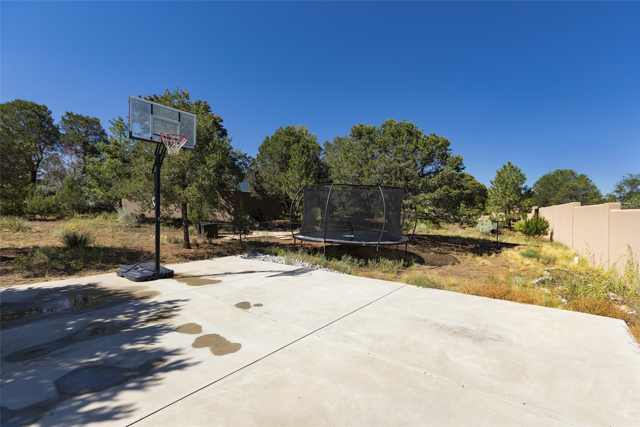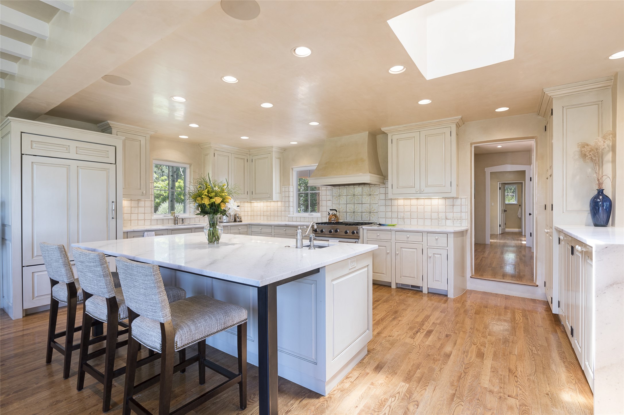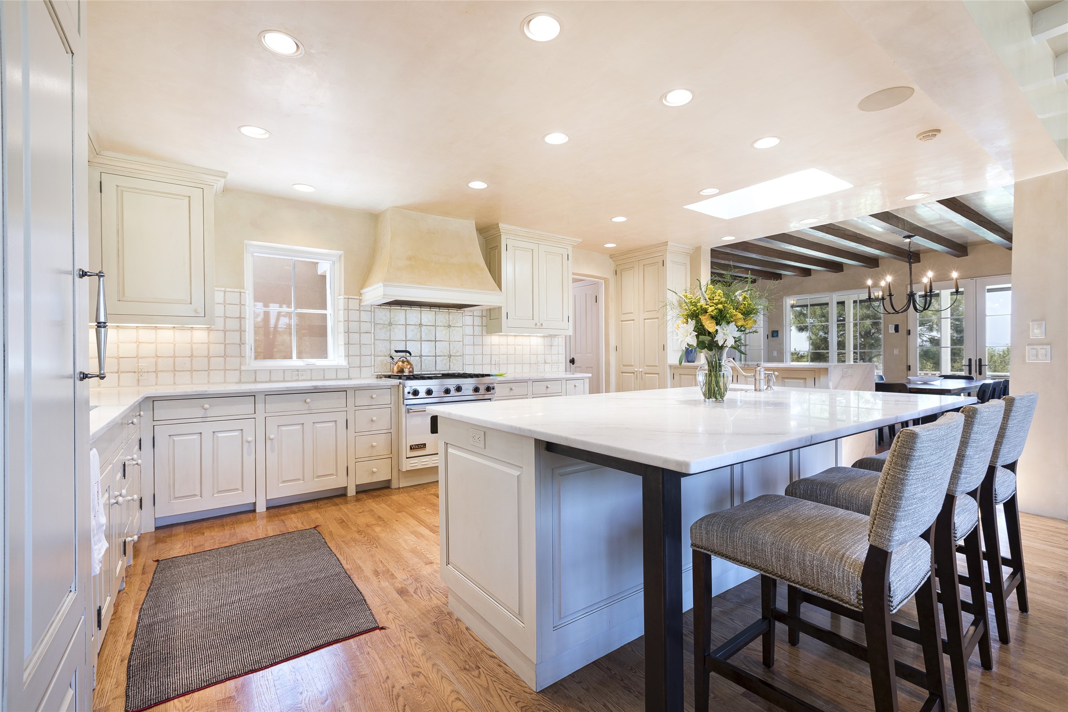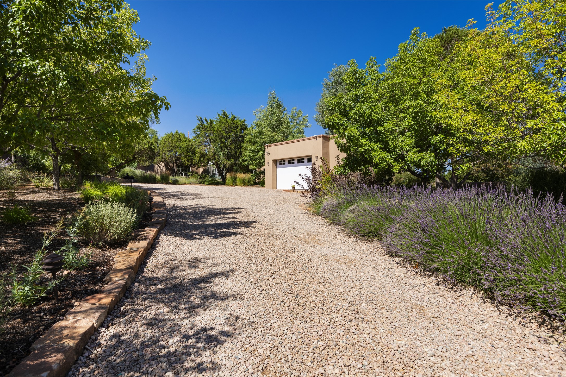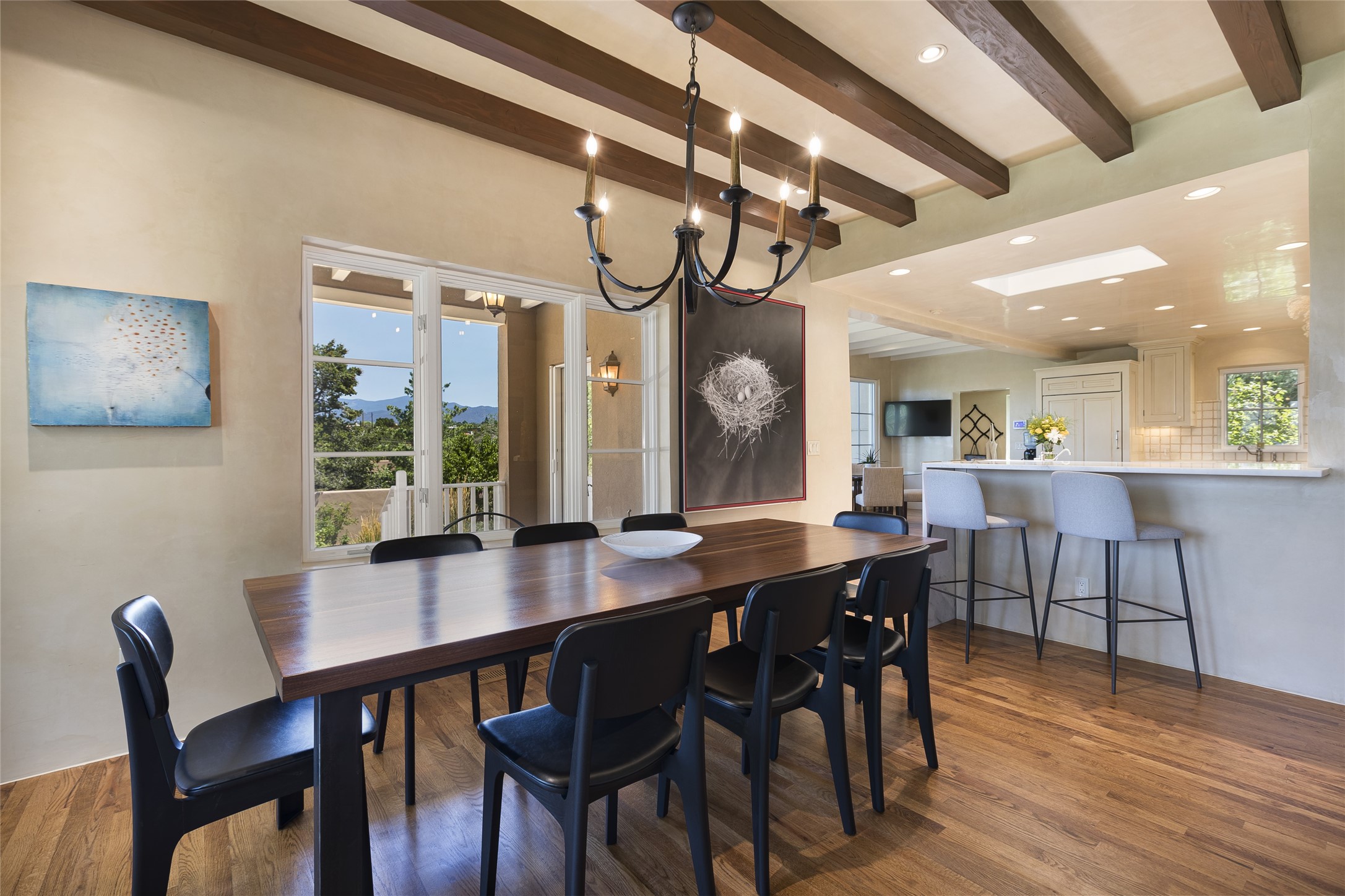 One of the most extraordinary estates in all of Santa Fe, this exquisite, beautifully renovated gated residence by Woods Design Builders, sited on a one-acre view lot, within the ultimate park-like setting, excites and captivates with powerful architecture and exceptional Sangre de Cristo and Jemez Mountain views. Located on one of most secluded and highly sought after streets in Santa Fe, within close proximity to the Plaza and Canyon Road, this quality 4-bedroom home with 3.5 baths, two living rooms and an office area, exemplifies the unique blend of modern design with inherent warmth and sophistication. Ideal for entertaining, this Parade of Homes, award-winning home, offers the ultimate state of the art kitchen complete with luxury appliances, Calacatta Amber marble counters, wine cooler, and dual breakfast bars with expansive seating, which opens to the spacious living room, dining area, and casual living room or breakfast dining area, all with portal access and dual fireplaces. The spacious owner's suite stuns with a grand fireplace, office niche, portal access and the newly expanded and renovated, luxurious spa-like bath with a soaking tub, walk-in shower and large dual closets. Separate from the owner's suite is a fully independent guest wing with an ensuite bedroom, two well-appointed guest bedrooms which share a full bath, a secondary living room, office area, and a cozy built-in daybed. The outdoor living areas are some of the finest in Santa Fe, with elevated outdoor seating which overlooks the mountain views and lush landscape, in addition to a private lounging area ideal for entertaining, complete with a tranquil water feature, surrounding gardens, and a basketball court. Additional features include a welcoming courtyard entrance with a water feature and privacy gate, wood flooring and natural stone counters, updated roof and stucco, and superior craftsmanship throughout.