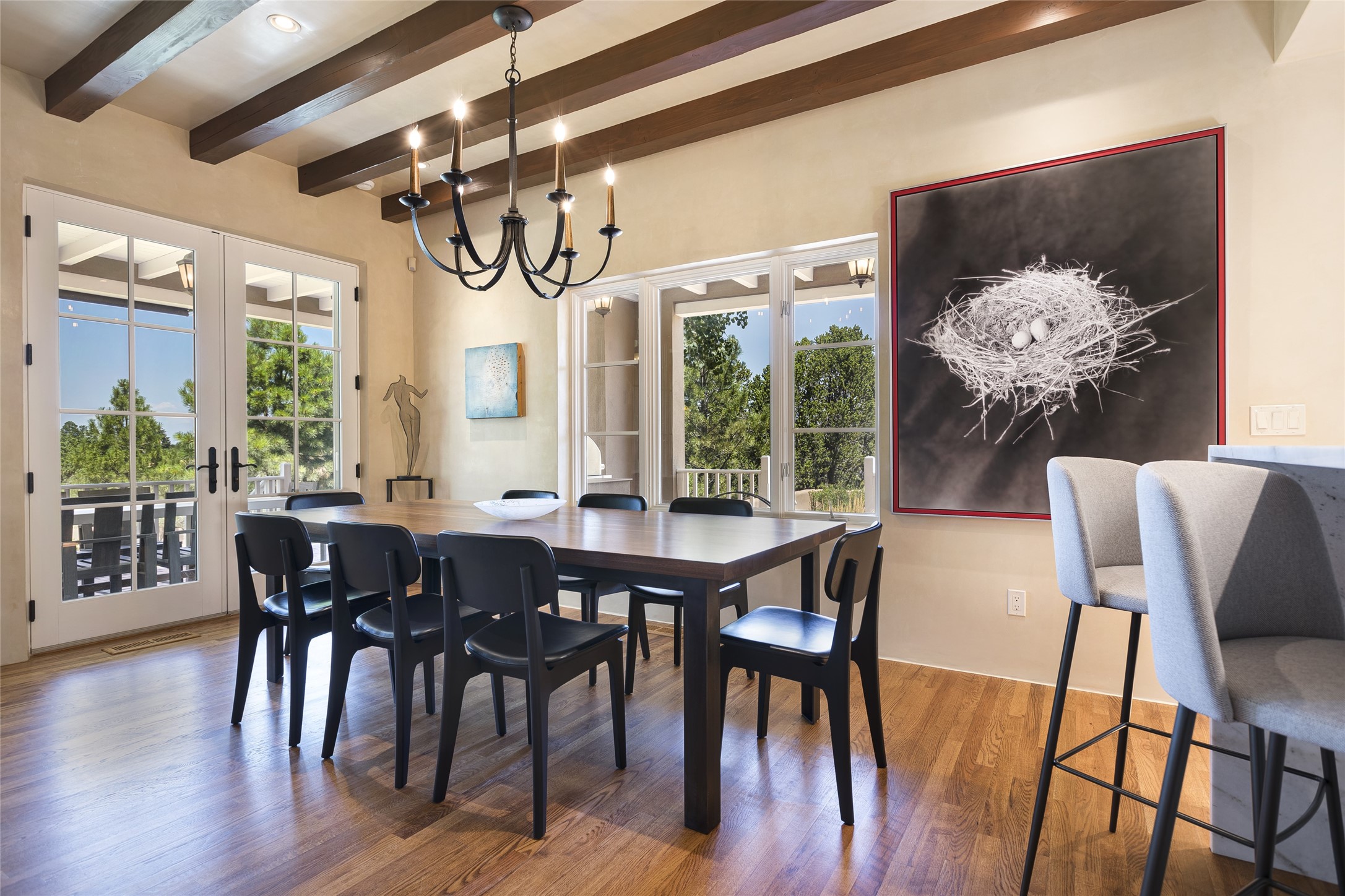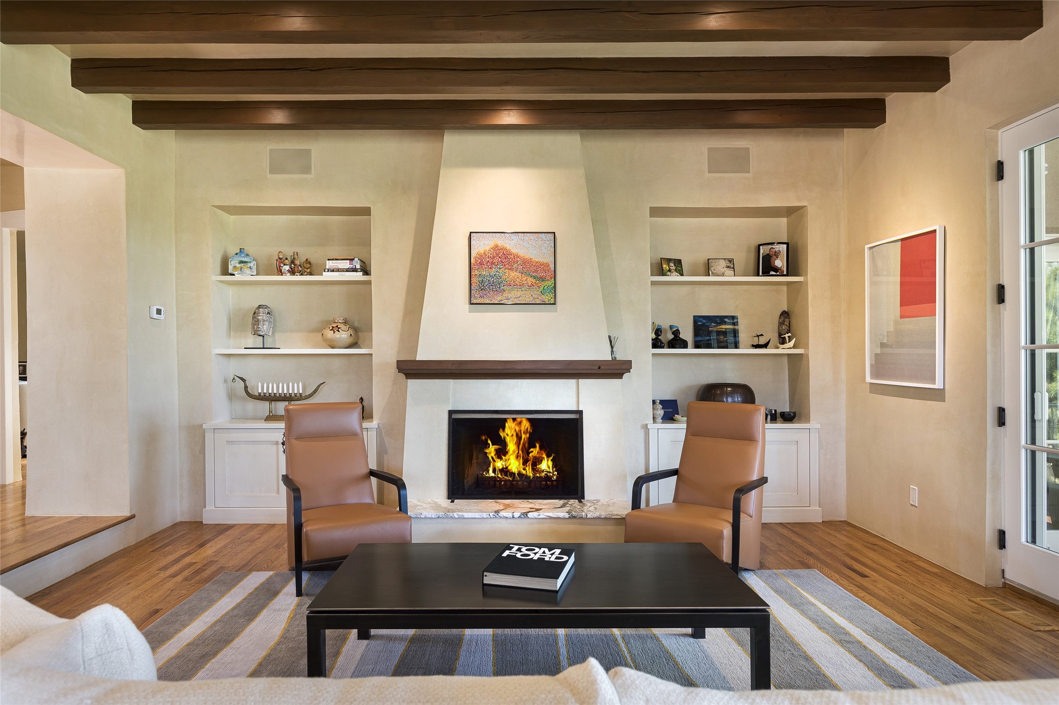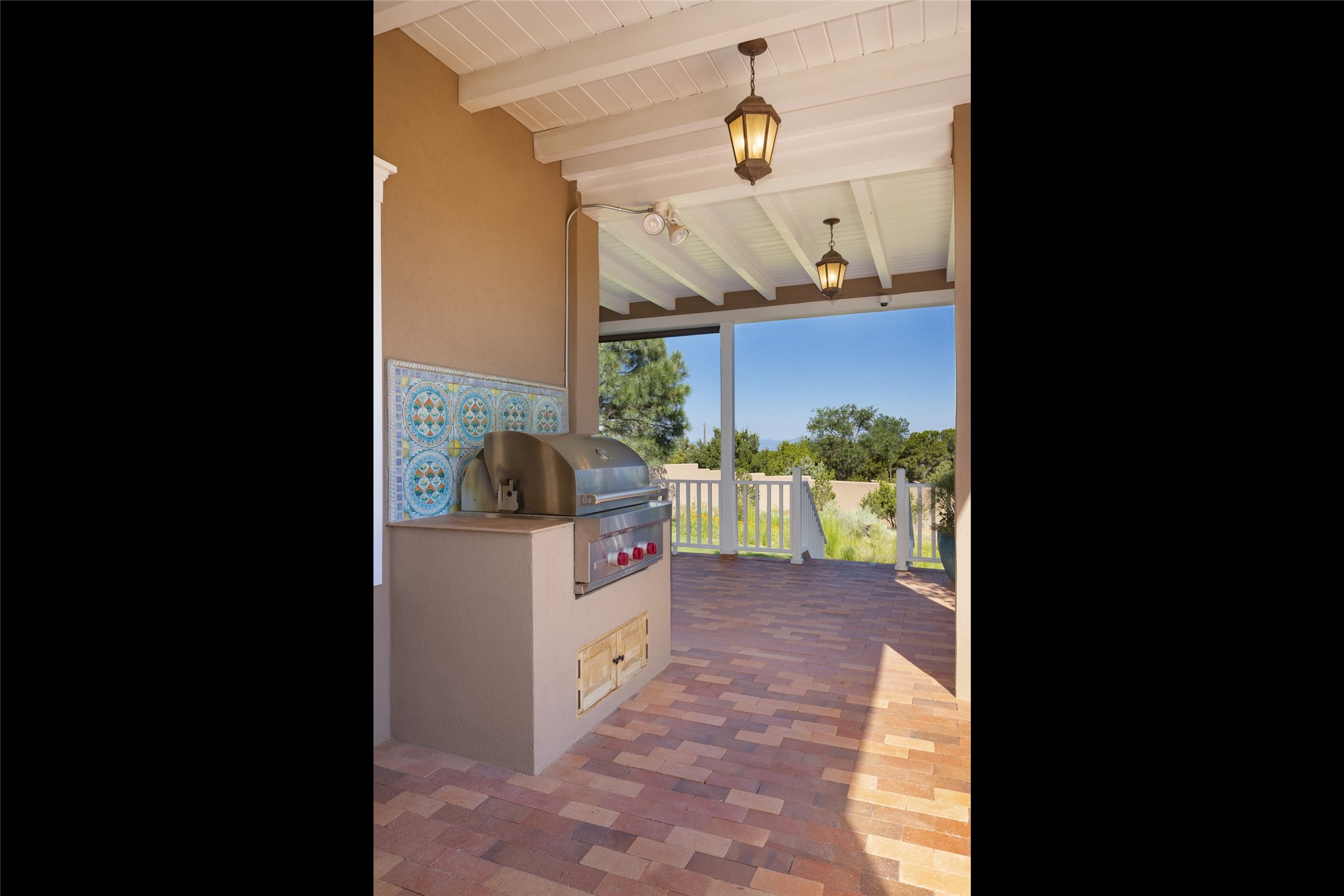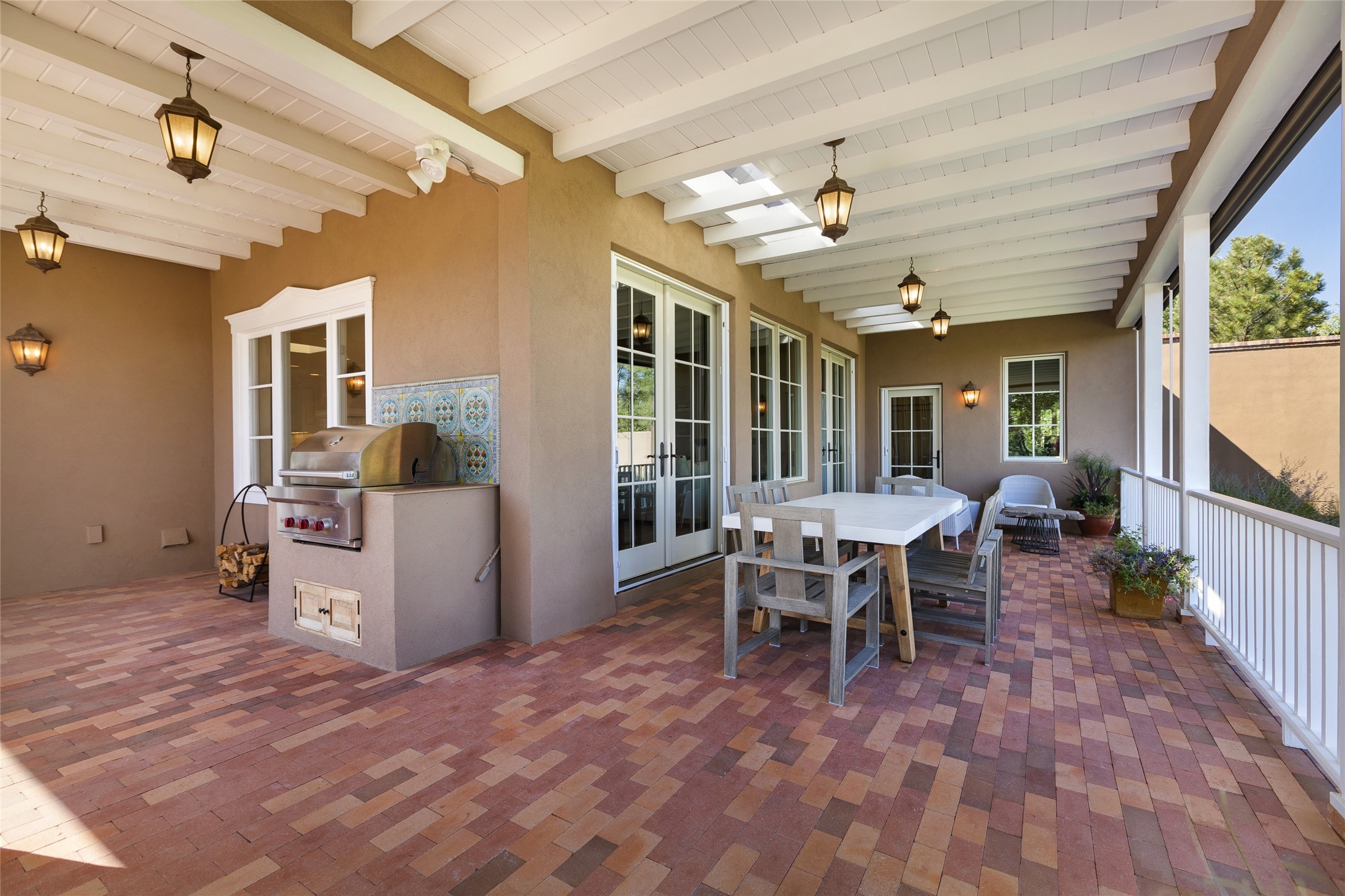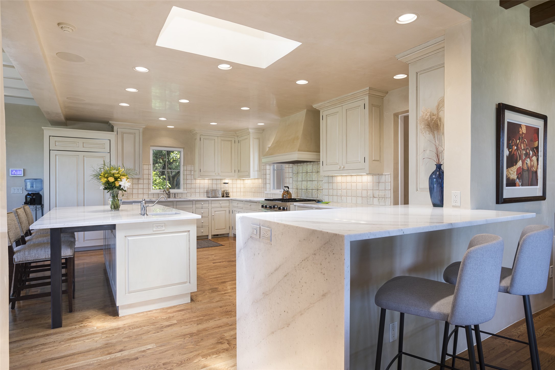 One of the most extraordinary estates in all of Santa Fe, this exquisite, beautifully renovated gated residence by Woods Design Builders, sited on a one-acre view lot, within the ultimate park-like setting, excites and captivates with powerful architecture and exceptional Sangre de Cristo and Jemez Mountain views. Located on one of most secluded and highly sought after streets in Santa Fe, within close proximity to the Plaza and Canyon Road, this quality 4-bedroom home with 3.5 baths, two living rooms and an office area, exemplifies the unique blend of modern design with inherent warmth and sophistication. Ideal for entertaining, this Parade of Homes, award-winning home, offers the ultimate state of the art kitchen complete with luxury appliances, Calacatta Amber marble counters, wine cooler, and dual breakfast bars with expansive seating, which opens to the spacious living room, dining area, and casual living room or breakfast dining area, all with portal access and dual fireplaces. The spacious owner's suite stuns with a grand fireplace, office niche, portal access and the newly expanded and renovated, luxurious spa-like bath with a soaking tub, walk-in shower and large dual closets. Separate from the owner's suite is a fully independent guest wing with an ensuite bedroom, two well-appointed guest bedrooms which share a full bath, a secondary living room, office area, and a cozy built-in daybed. The outdoor living areas are some of the finest in Santa Fe, with elevated outdoor seating which overlooks the mountain views and lush landscape, in addition to a private lounging area ideal for entertaining, complete with a tranquil water feature, surrounding gardens, and a basketball court. Additional features include a welcoming courtyard entrance with a water feature and privacy gate, wood flooring and natural stone counters, updated roof and stucco, and superior craftsmanship throughout.