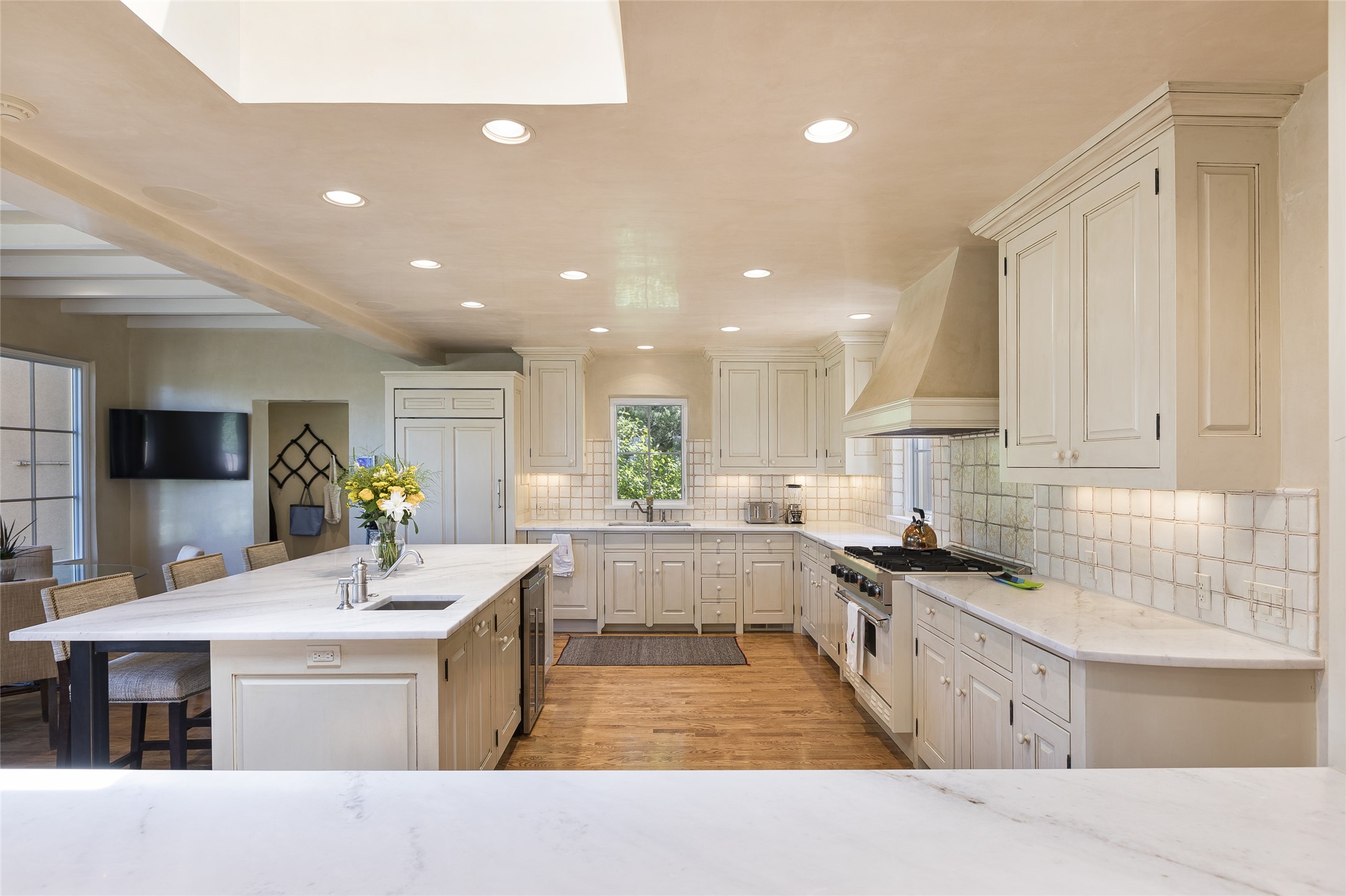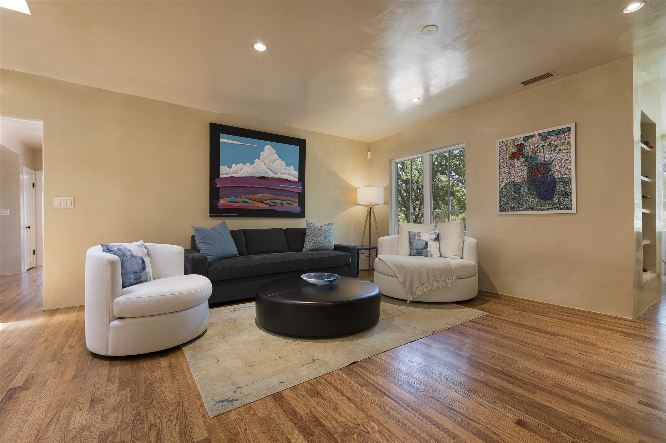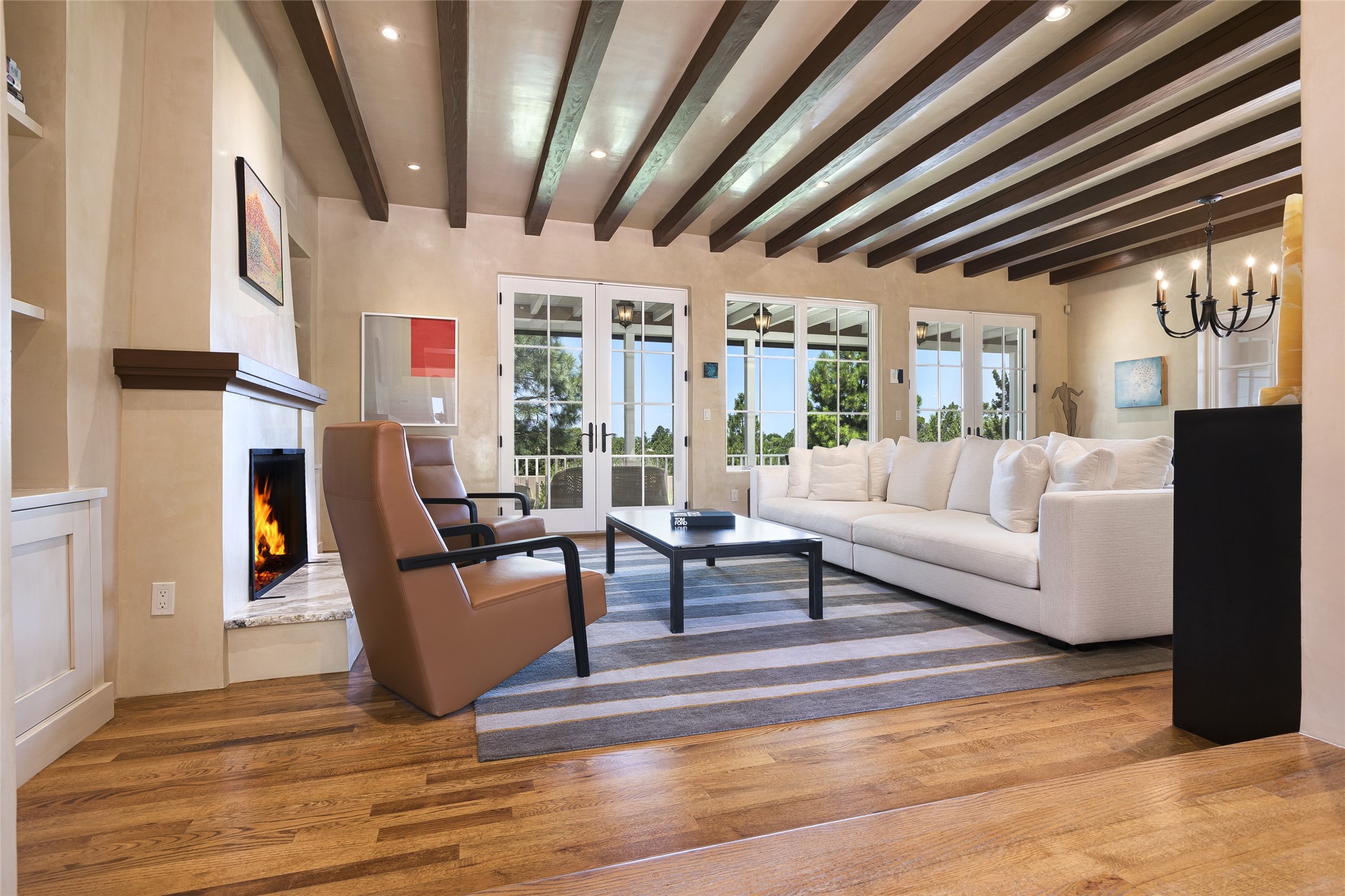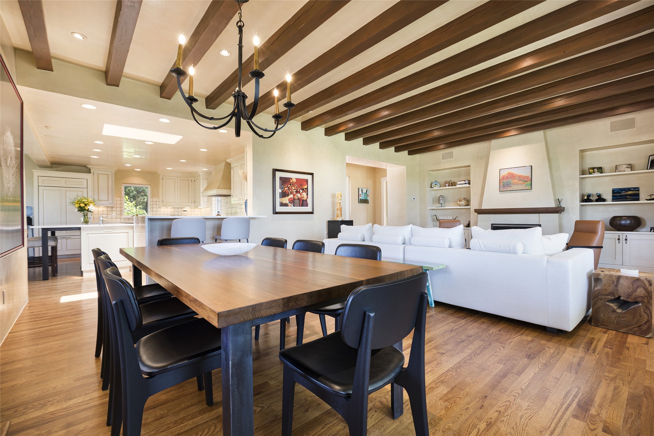 One of the most extraordinary estates in all of Santa Fe, this exquisite, beautifully renovated gated residence by Woods Design Builders, sited on a one-acre view lot, within the ultimate park-like setting, excites and captivates with powerful architecture and exceptional Sangre de Cristo and Jemez Mountain views. Located on one of most secluded and highly sought after streets in Santa Fe, within close proximity to the Plaza and Canyon Road, this quality 4-bedroom home with 3.5 baths, two living rooms and an office area, exemplifies the unique blend of modern design with inherent warmth and sophistication. Ideal for entertaining, this Parade of Homes, award-winning home, offers the ultimate state of the art kitchen complete with luxury appliances, Calacatta Amber marble counters, wine cooler, and dual breakfast bars with expansive seating, which opens to the spacious living room, dining area, and casual living room or breakfast dining area, all with portal access and dual fireplaces. The spacious owner's suite stuns with a grand fireplace, office niche, portal access and the newly expanded and renovated, luxurious spa-like bath with a soaking tub, walk-in shower and large dual closets. Separate from the owner's suite is a fully independent guest wing with an ensuite bedroom, two well-appointed guest bedrooms which share a full bath, a secondary living room, office area, and a cozy built-in daybed. The outdoor living areas are some of the finest in Santa Fe, with elevated outdoor seating which overlooks the mountain views and lush landscape, in addition to a private lounging area ideal for entertaining, complete with a tranquil water feature, surrounding gardens, and a basketball court. Additional features include a welcoming courtyard entrance with a water feature and privacy gate, wood flooring and natural stone counters, updated roof and stucco, and superior craftsmanship throughout.