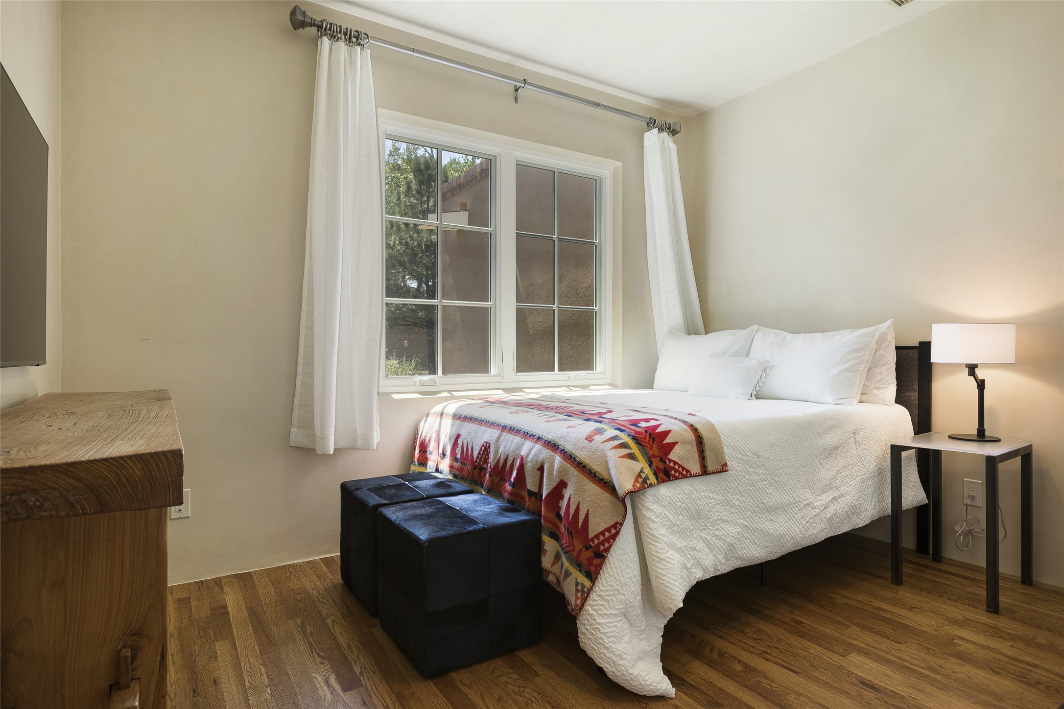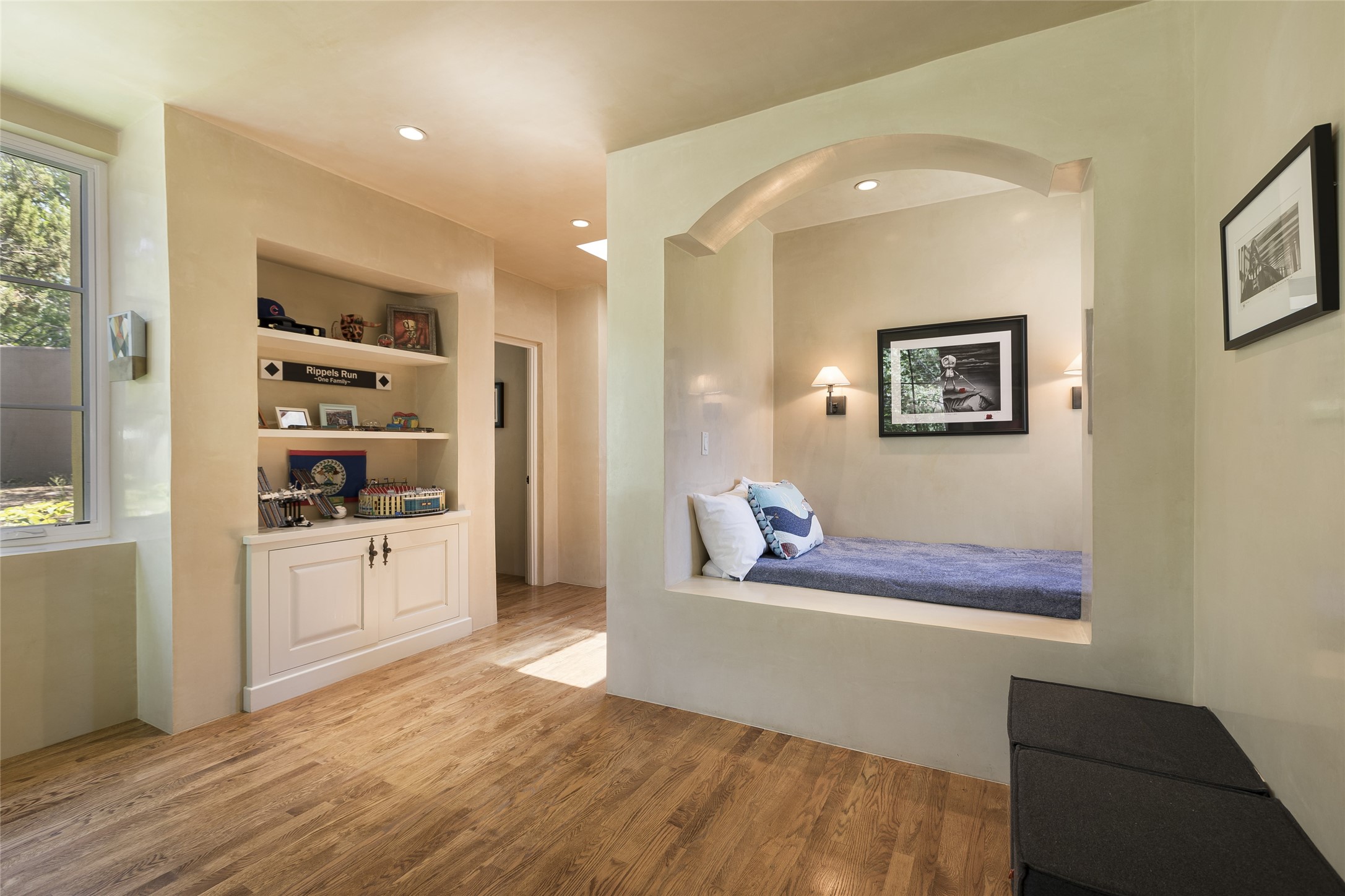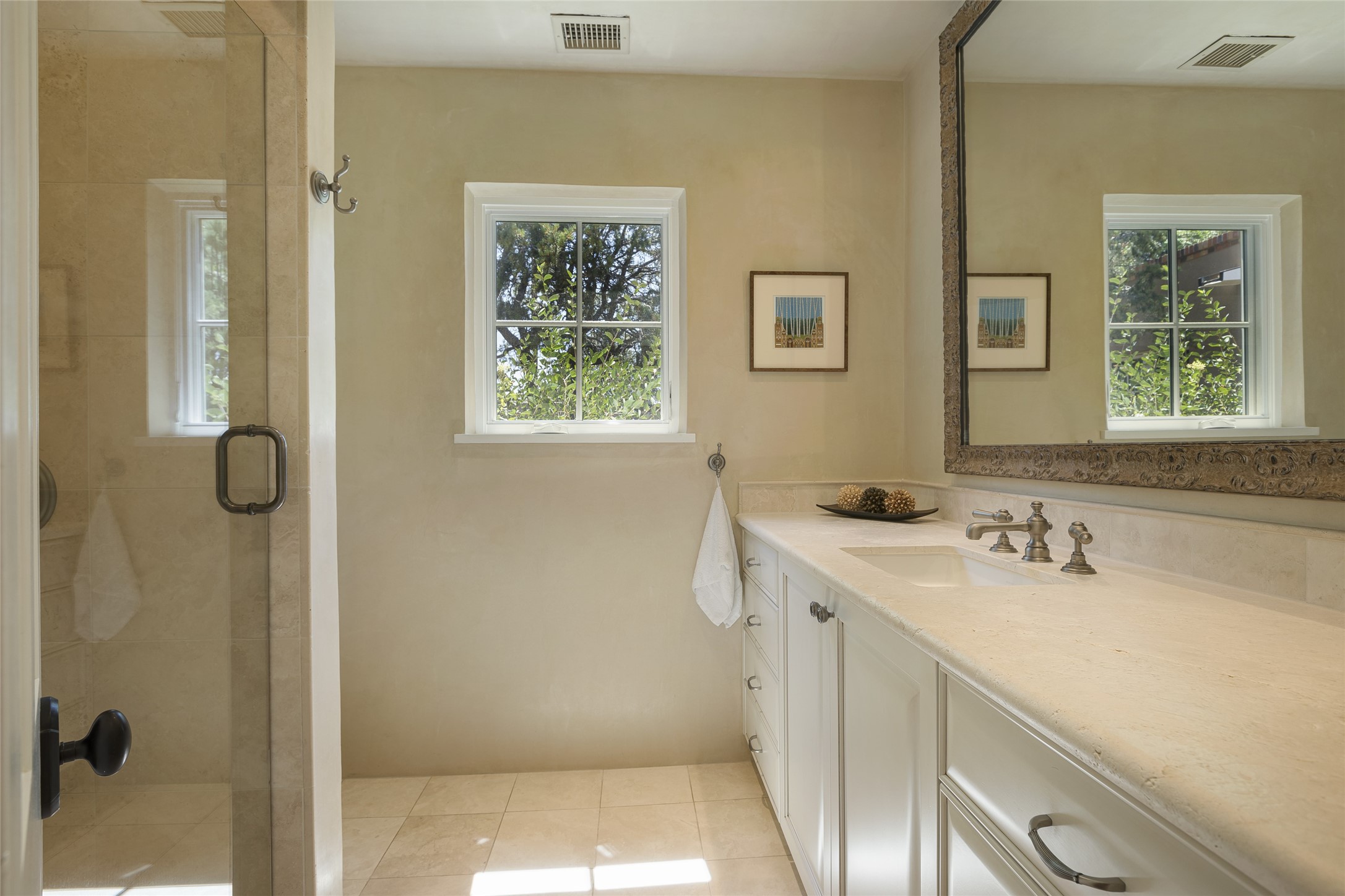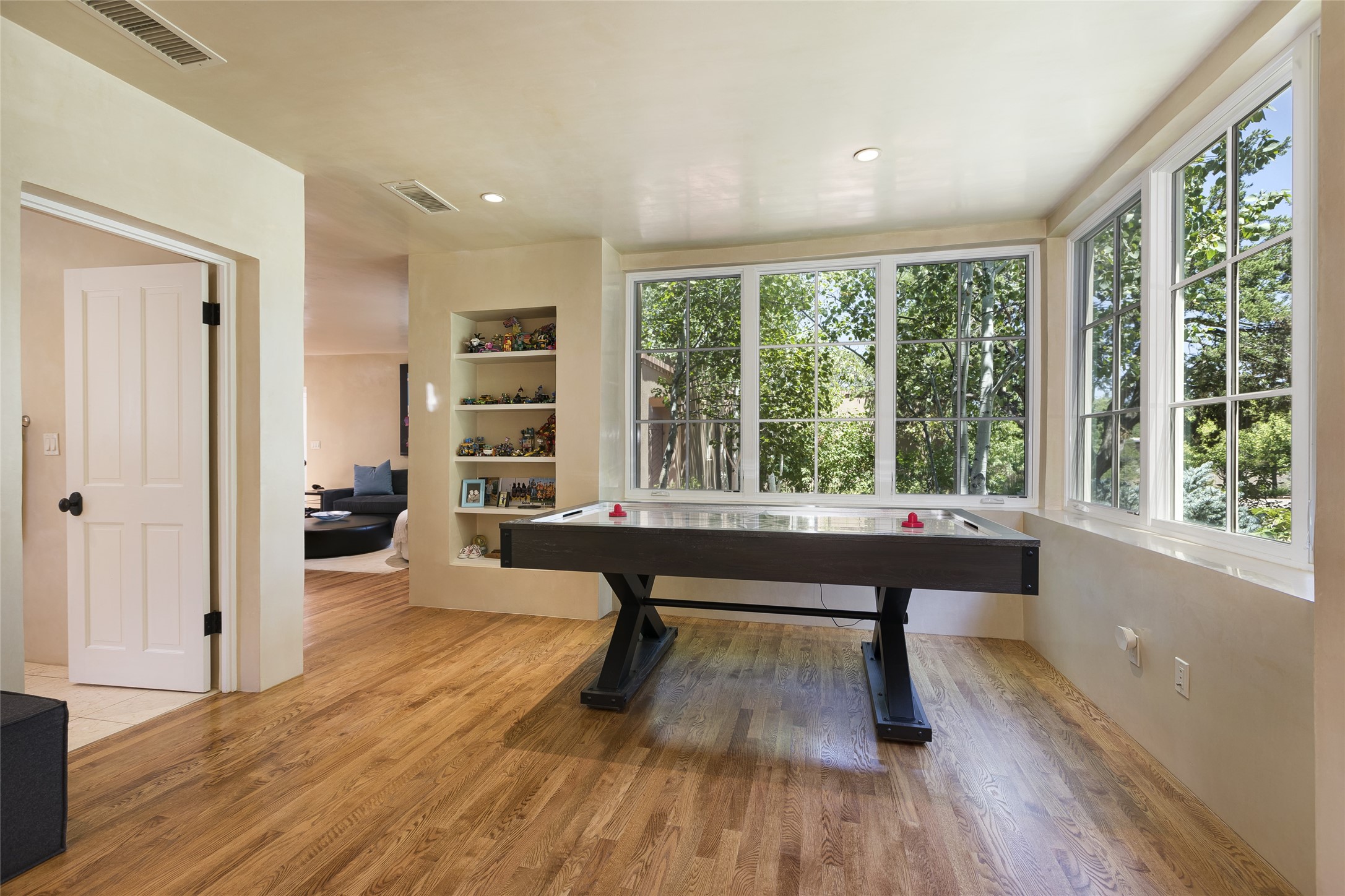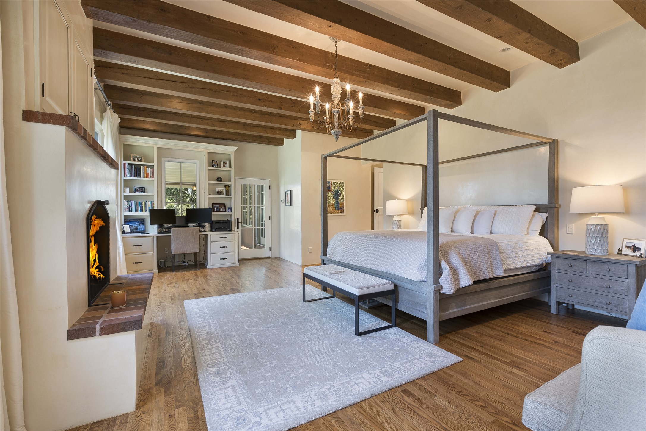 One of the most extraordinary estates in all of Santa Fe, this exquisite, beautifully renovated gated residence by Woods Design Builders, sited on a one-acre view lot, within the ultimate park-like setting, excites and captivates with powerful architecture and exceptional Sangre de Cristo and Jemez Mountain views. Located on one of most secluded and highly sought after streets in Santa Fe, within close proximity to the Plaza and Canyon Road, this quality 4-bedroom home with 3.5 baths, two living rooms and an office area, exemplifies the unique blend of modern design with inherent warmth and sophistication. Ideal for entertaining, this Parade of Homes, award-winning home, offers the ultimate state of the art kitchen complete with luxury appliances, Calacatta Amber marble counters, wine cooler, and dual breakfast bars with expansive seating, which opens to the spacious living room, dining area, and casual living room or breakfast dining area, all with portal access and dual fireplaces. The spacious owner's suite stuns with a grand fireplace, office niche, portal access and the newly expanded and renovated, luxurious spa-like bath with a soaking tub, walk-in shower and large dual closets. Separate from the owner's suite is a fully independent guest wing with an ensuite bedroom, two well-appointed guest bedrooms which share a full bath, a secondary living room, office area, and a cozy built-in daybed. The outdoor living areas are some of the finest in Santa Fe, with elevated outdoor seating which overlooks the mountain views and lush landscape, in addition to a private lounging area ideal for entertaining, complete with a tranquil water feature, surrounding gardens, and a basketball court. Additional features include a welcoming courtyard entrance with a water feature and privacy gate, wood flooring and natural stone counters, updated roof and stucco, and superior craftsmanship throughout.