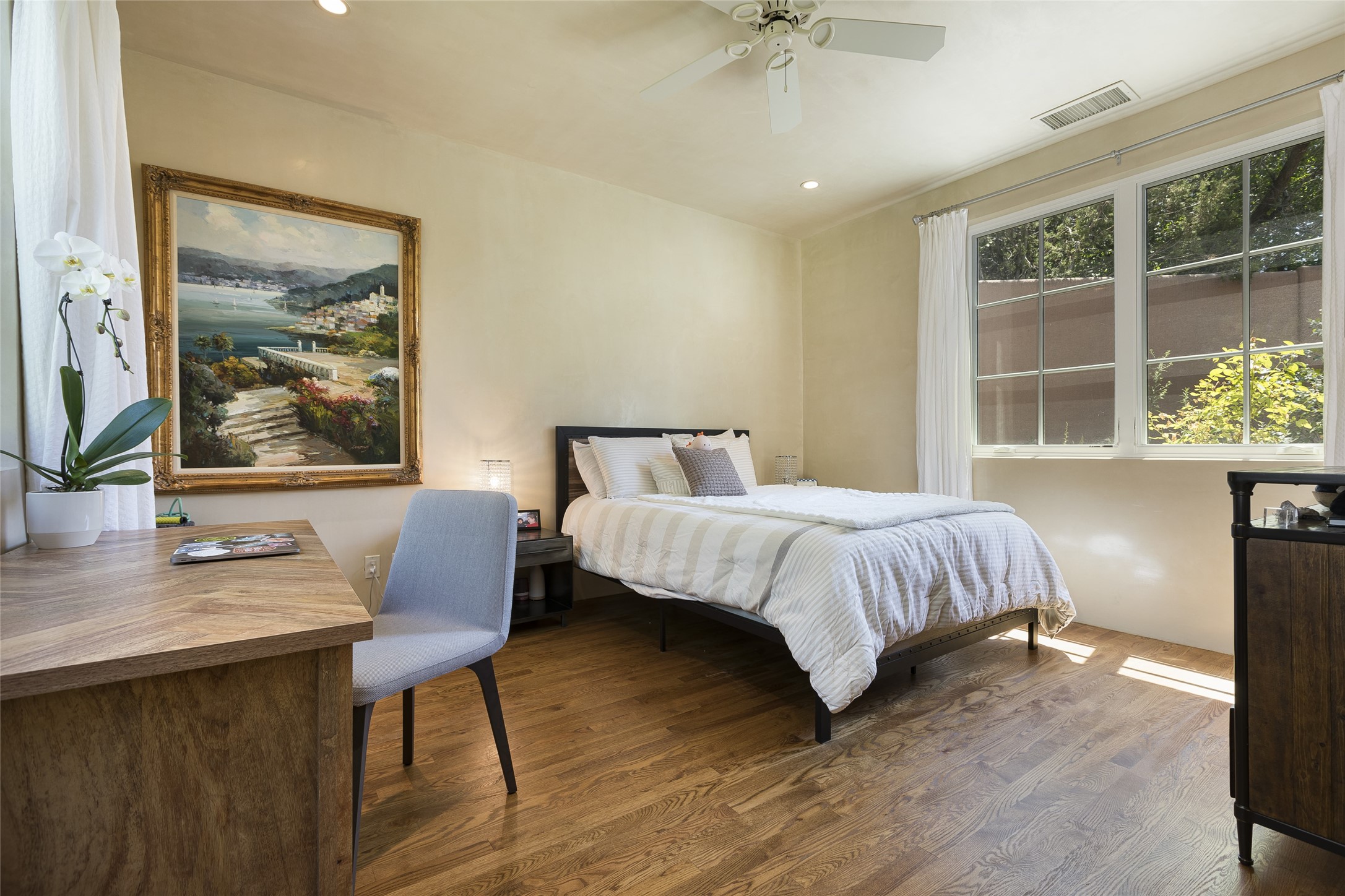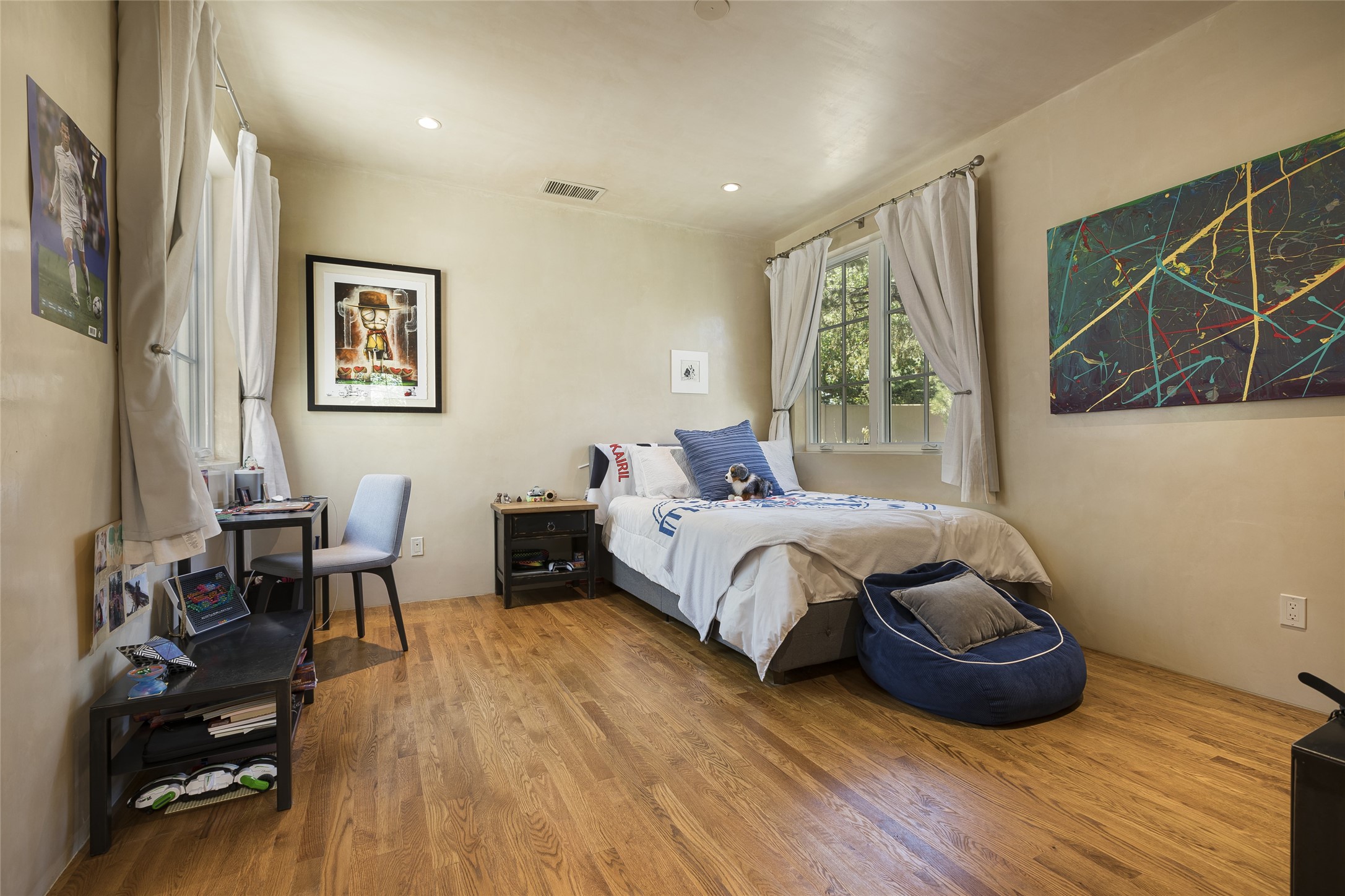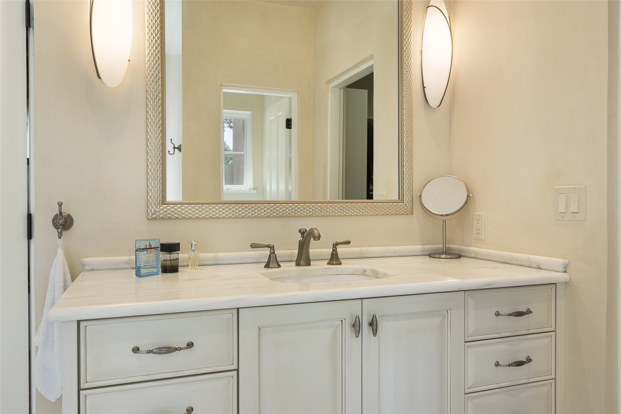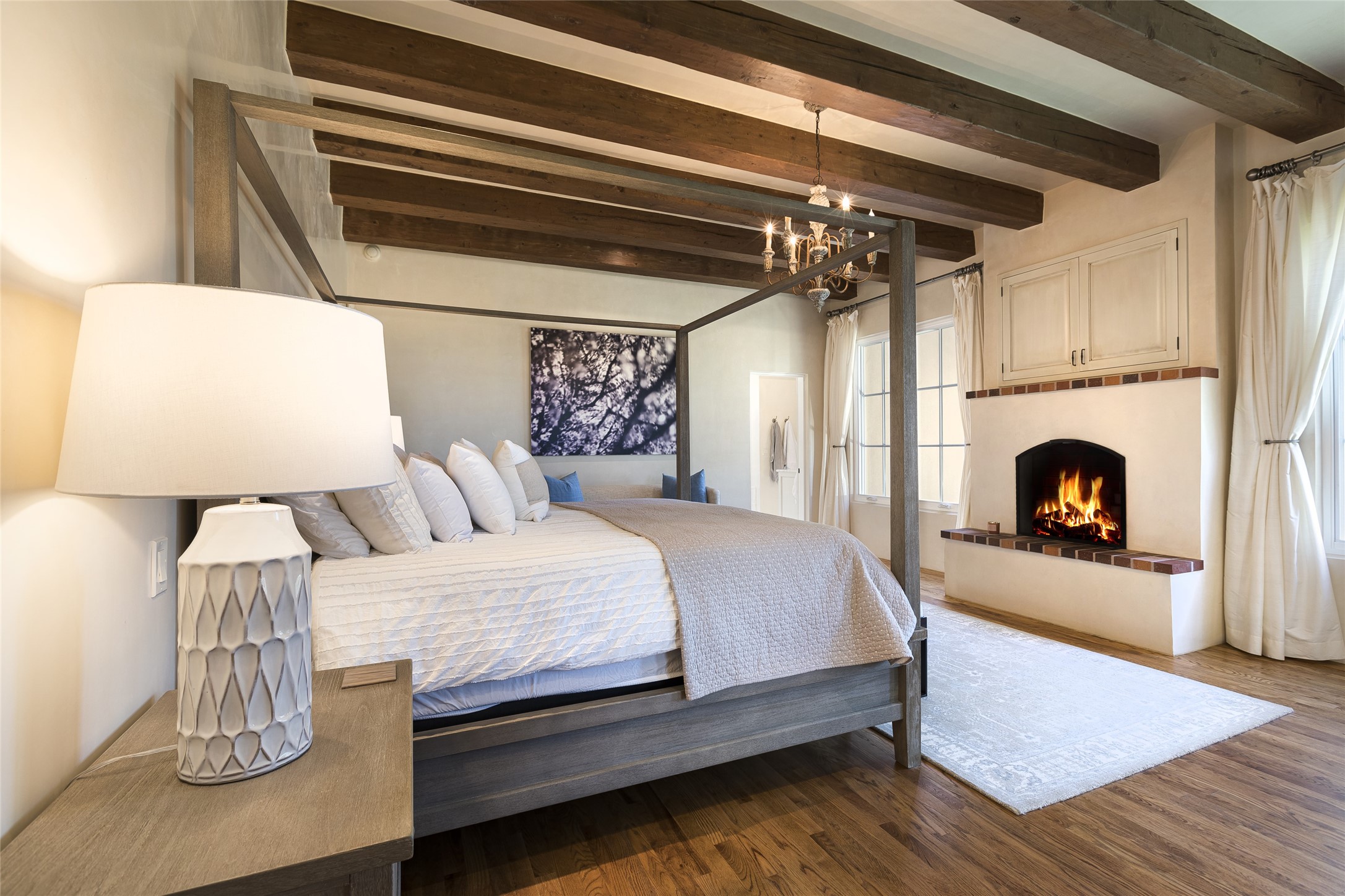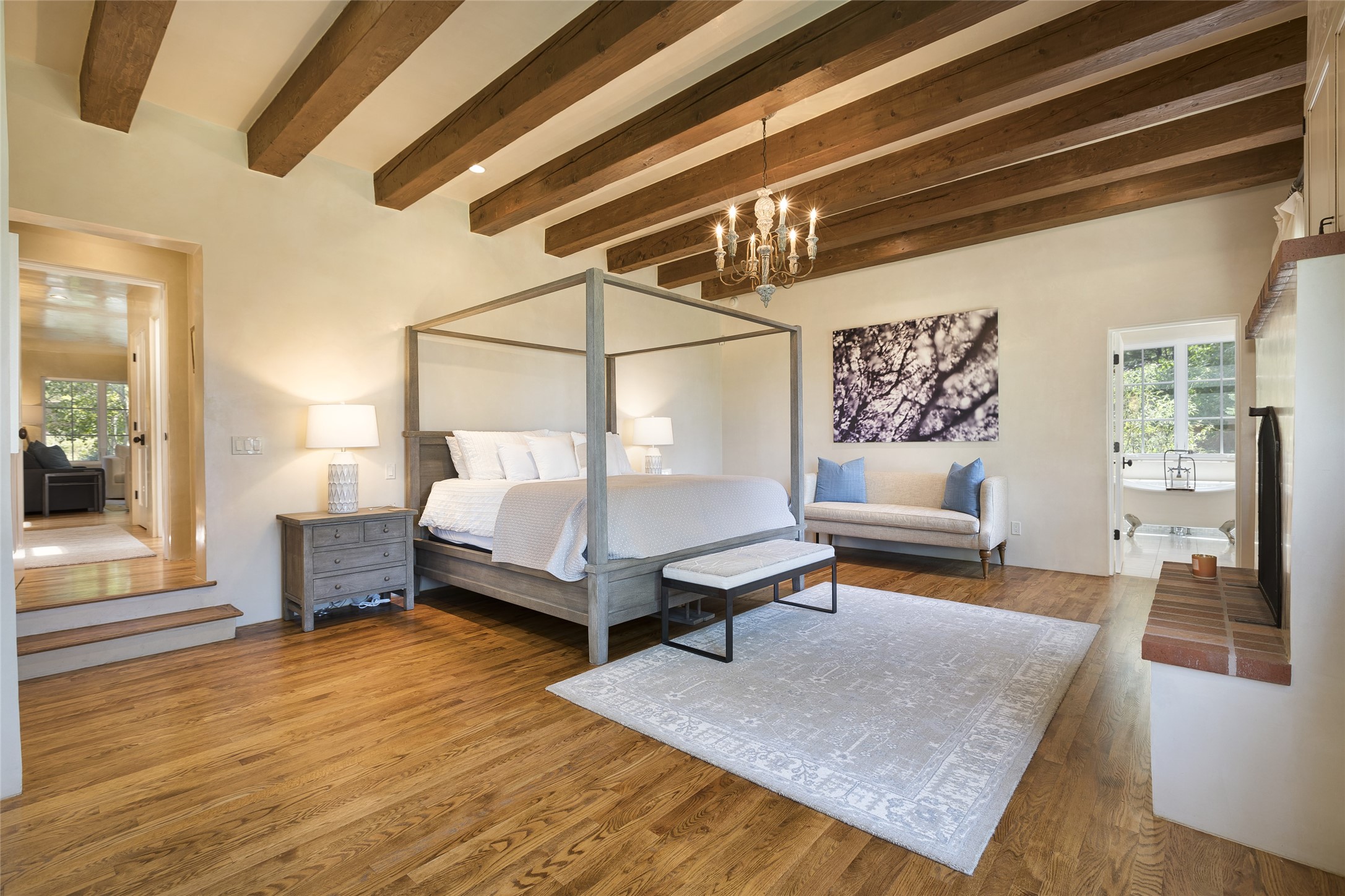 One of the most extraordinary estates in all of Santa Fe, this exquisite, beautifully renovated gated residence by Woods Design Builders, sited on a one-acre view lot, within the ultimate park-like setting, excites and captivates with powerful architecture and exceptional Sangre de Cristo and Jemez Mountain views. Located on one of most secluded and highly sought after streets in Santa Fe, within close proximity to the Plaza and Canyon Road, this quality 4-bedroom home with 3.5 baths, two living rooms and an office area, exemplifies the unique blend of modern design with inherent warmth and sophistication. Ideal for entertaining, this Parade of Homes, award-winning home, offers the ultimate state of the art kitchen complete with luxury appliances, Calacatta Amber marble counters, wine cooler, and dual breakfast bars with expansive seating, which opens to the spacious living room, dining area, and casual living room or breakfast dining area, all with portal access and dual fireplaces. The spacious owner's suite stuns with a grand fireplace, office niche, portal access and the newly expanded and renovated, luxurious spa-like bath with a soaking tub, walk-in shower and large dual closets. Separate from the owner's suite is a fully independent guest wing with an ensuite bedroom, two well-appointed guest bedrooms which share a full bath, a secondary living room, office area, and a cozy built-in daybed. The outdoor living areas are some of the finest in Santa Fe, with elevated outdoor seating which overlooks the mountain views and lush landscape, in addition to a private lounging area ideal for entertaining, complete with a tranquil water feature, surrounding gardens, and a basketball court. Additional features include a welcoming courtyard entrance with a water feature and privacy gate, wood flooring and natural stone counters, updated roof and stucco, and superior craftsmanship throughout.