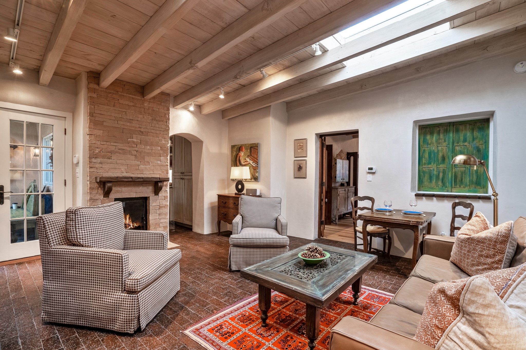Welcome to Atwill Compound, an exquisite residence nestled in the heart of the Historic Eastside. Tucked away behind adobe walls, this compound offers tranquility and a prime location near art galleries and the vibrant ambiance of Canyon Road. Discover a stunning Spanish colonial gem, thoughtfully designed with traditional Southwest elements. The interior boasts thick white plastered adobe walls, complemented by deep-set divided light windows that provide delightful garden views. Immerse yourself in the beauty of polished brick floors in the living, dining room and kitchen, which ensures a stylish yet functional space for contemporary chefs. Step into the captivating primary bedroom and bathroom, featuring inviting wood floors and large walk-in closets. Outside, an enchanting private patio adorned with large potted plants invites you to savor the Santa Fe outdoors a little longer. Atwell Compound is an oasis of elegance and serenity, perfectly situated to embrace the best of Eastside living.