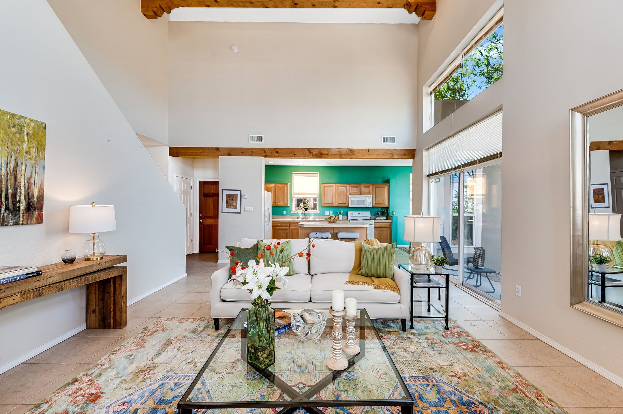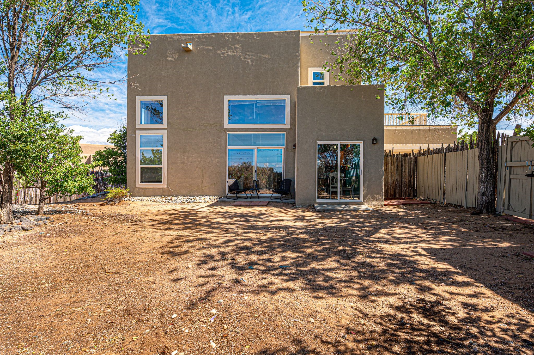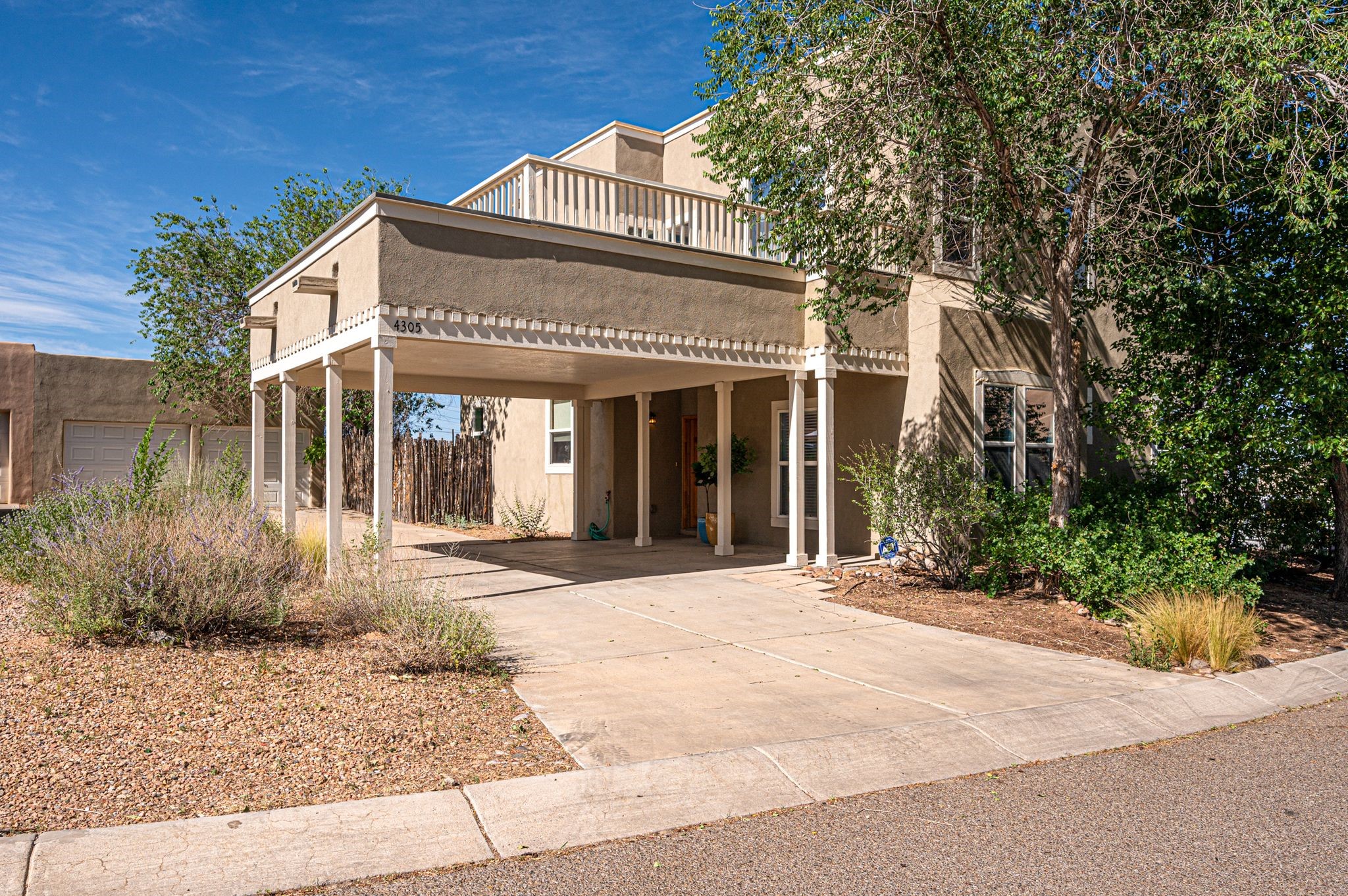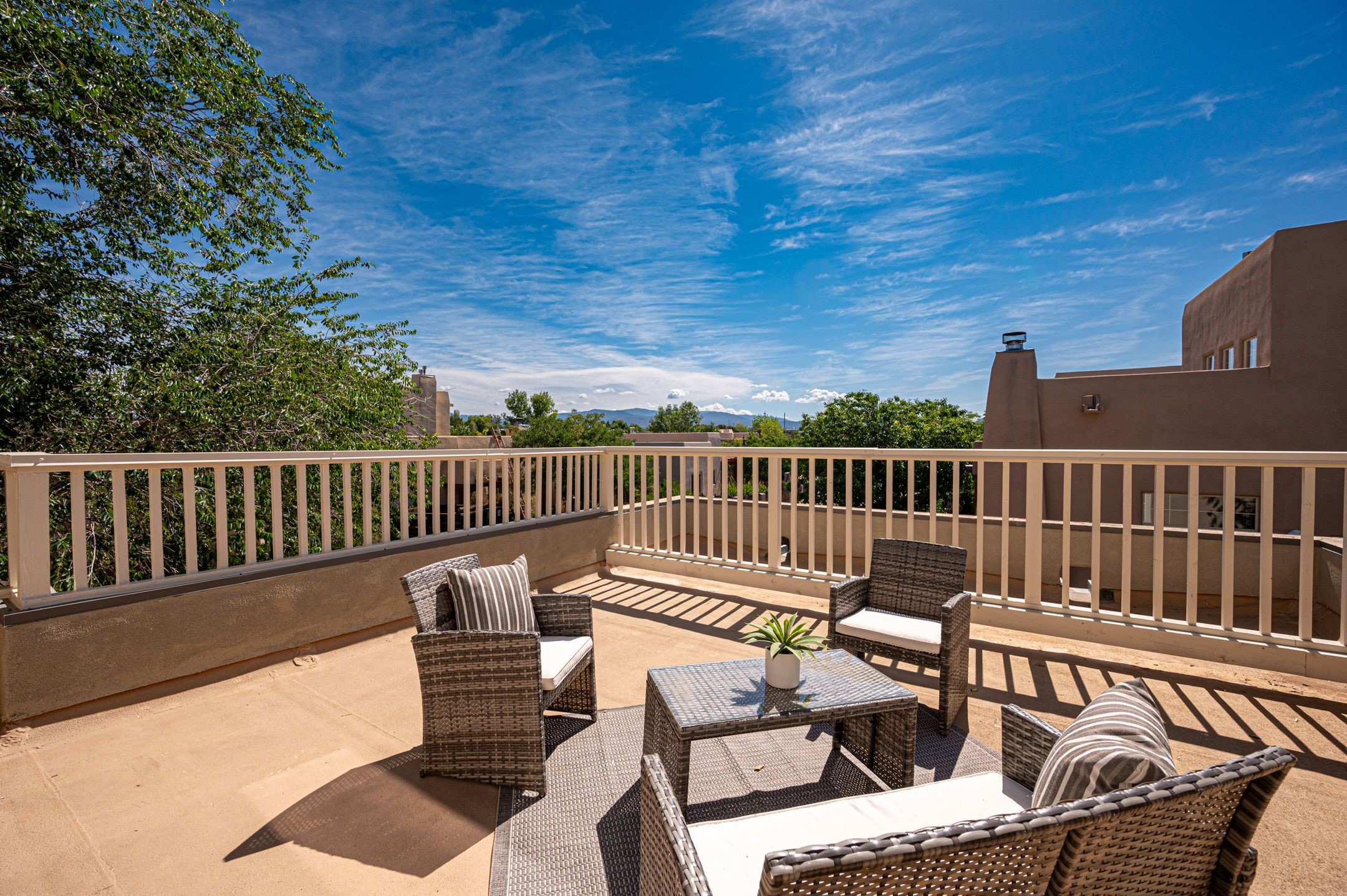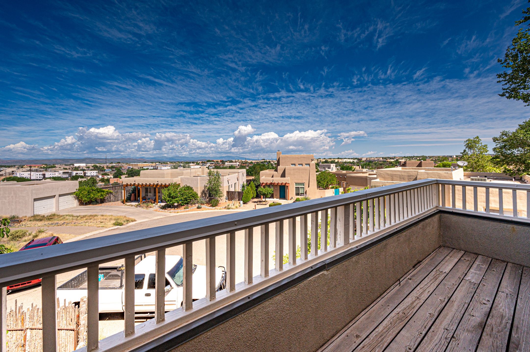 This special property on a cul-de-sac in Nava Ade has so many incredible features. Light and bright, this 3 bedroom/2 bathroom home has high ceilings with beams, a fireplace, and an open kitchen. There are 2 balconies that boast stunning Sangre De Cristo and Santa Fe Ski area views. The fenced deck, that opens up just outside of the primary bedroom is a perfect place to soak up the New Mexico sun, and enjoy the stunning mountain views. The backyard is completely surrounded with coyote fencing and ready to make your own. There is a 2 car garage, large driveway, and carport to make for plentiful parking. A pre-inspection has already been completed on this lovely home. The HOA includes a pool, fitness center, and community area for your enjoyment. The location is near schools, shopping, restaurants, a quick drive to the downtown plaza, and has easy access to I25 and 599 which is great for commuters! This home is such a delight! A brand new air conditioning was installed 8/23 and it comes with a warranty for the new owner and a maintenance agreement!
