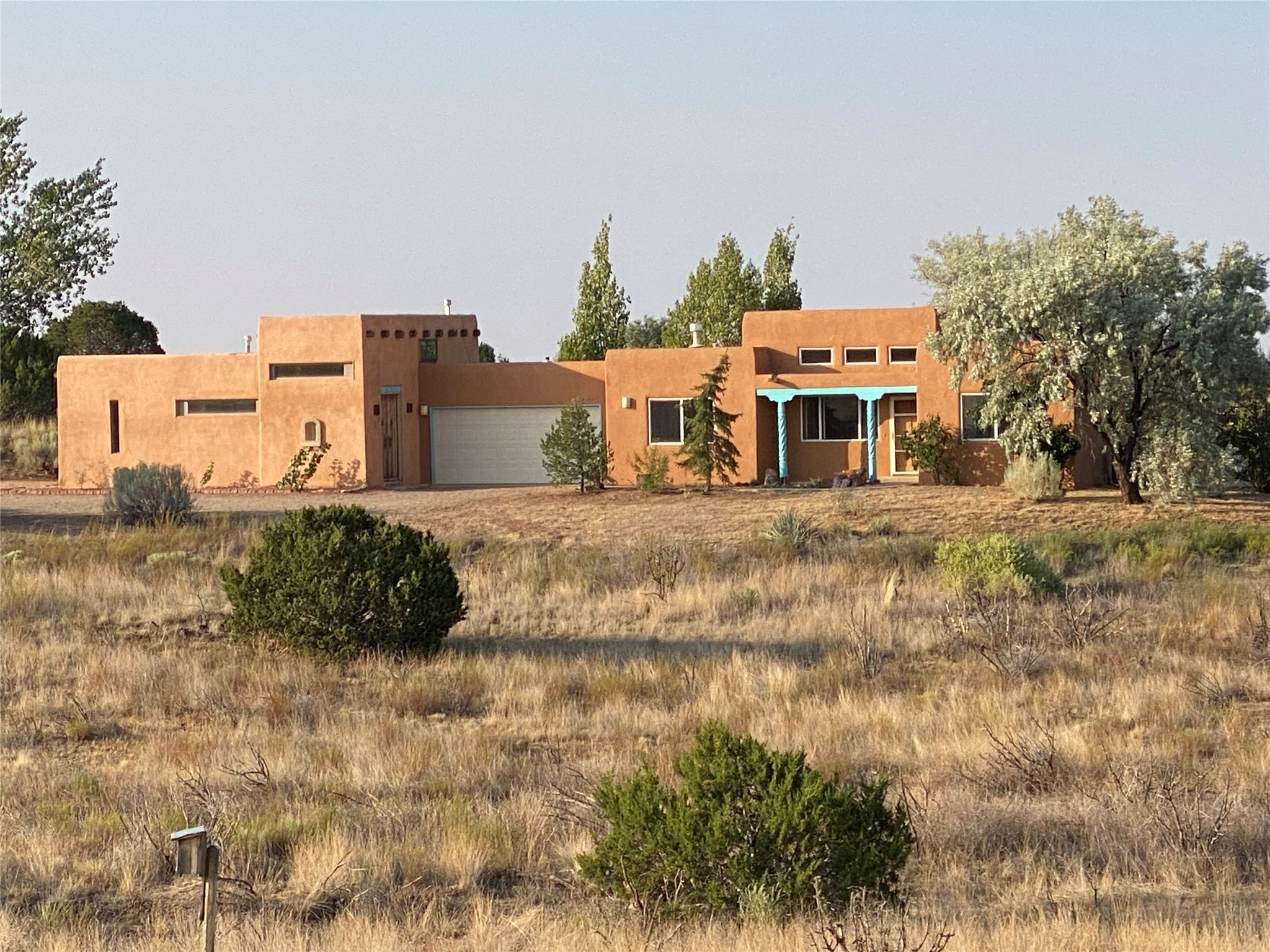Open plan, split 3 bedroom, 2 bath home attached 800 sqft. 2 heated studios with huge high ceilings. Although small the high ceilings create a spacious feel. A sunburst design viga ceiling and corner living room fireplace opens to the kitchen and dining areas. The surrounding landscape is ready and invites your personal touches, and has sweeping mountain and sunset views. A large 2-car garage and plenty of guest parking adds convenience. Privately located on a cul de sac bordering a large greenbelt yet close to paved access roads leading to local shopping, restaurants, schools, senior center, and library. This home accesses all of Eldorado community activities and trails plus only minutes into Santa Fe.