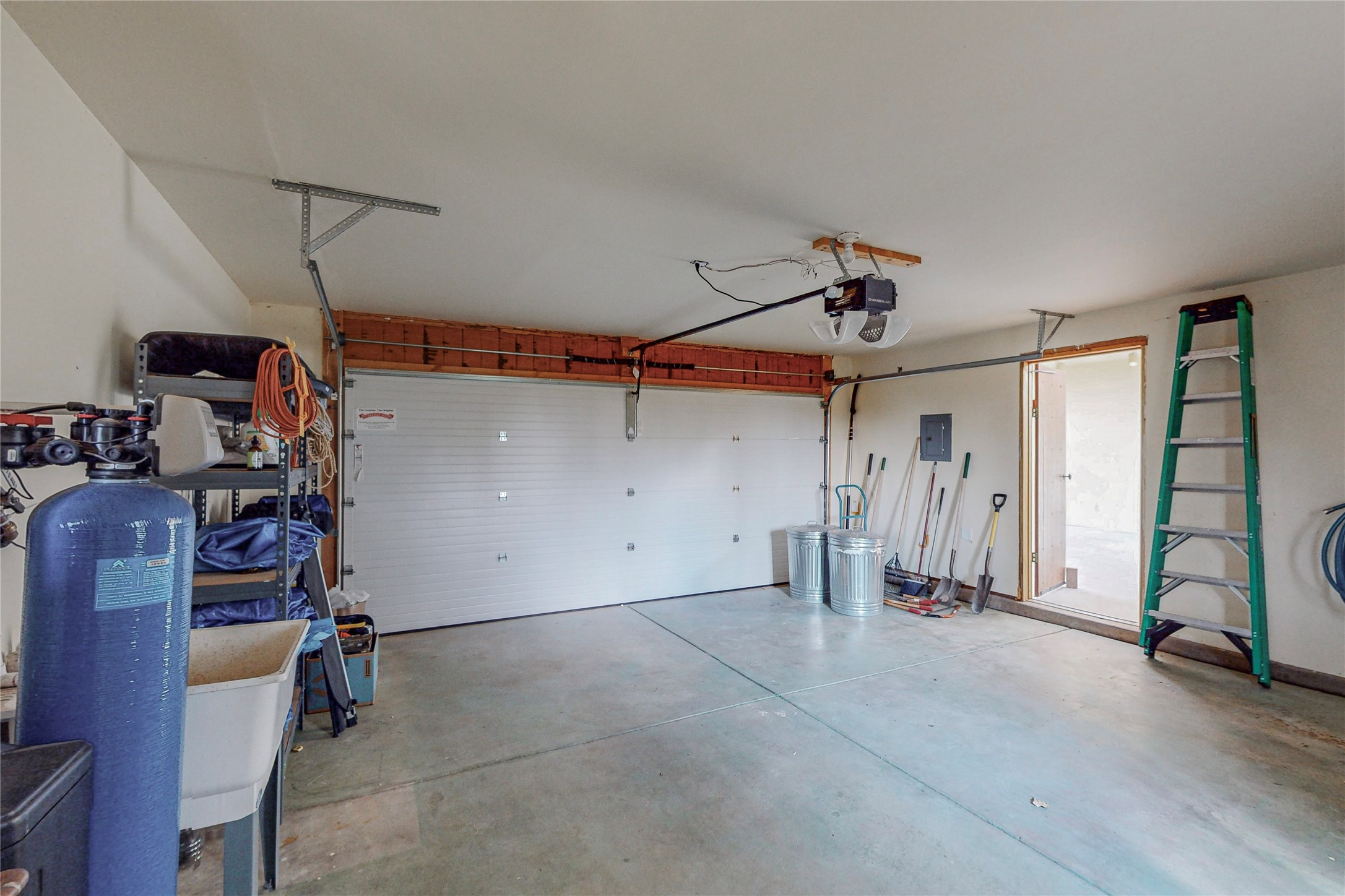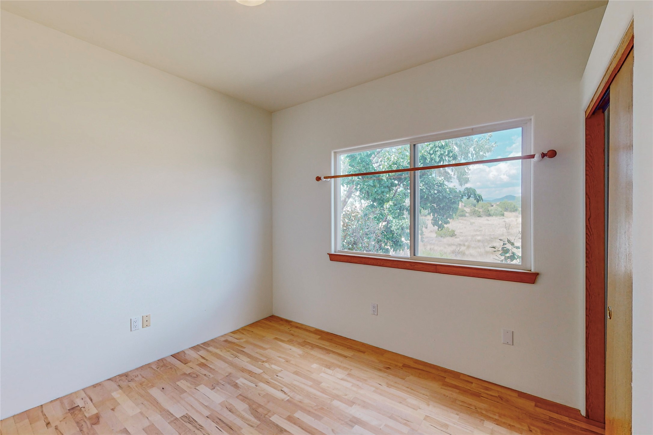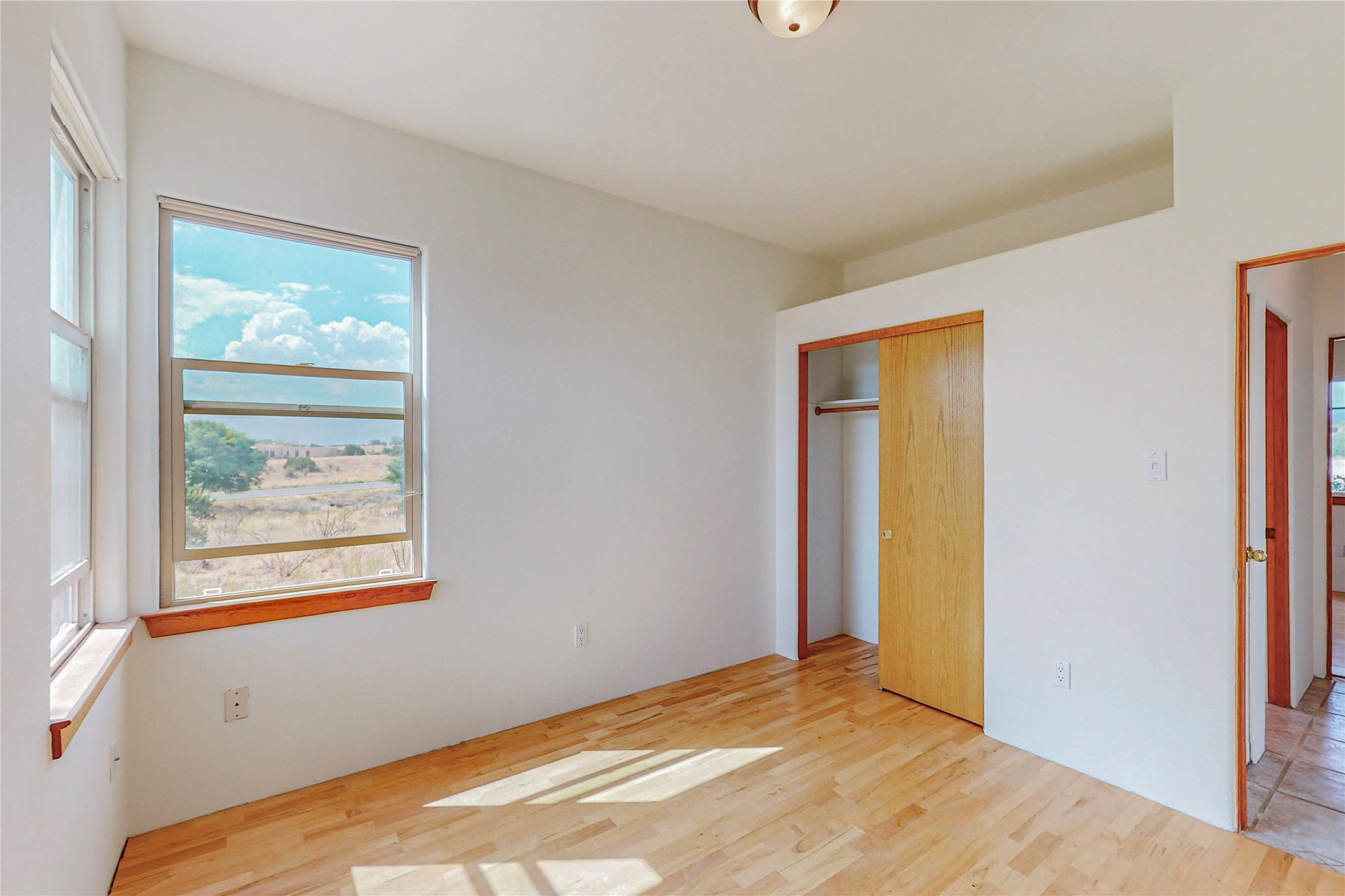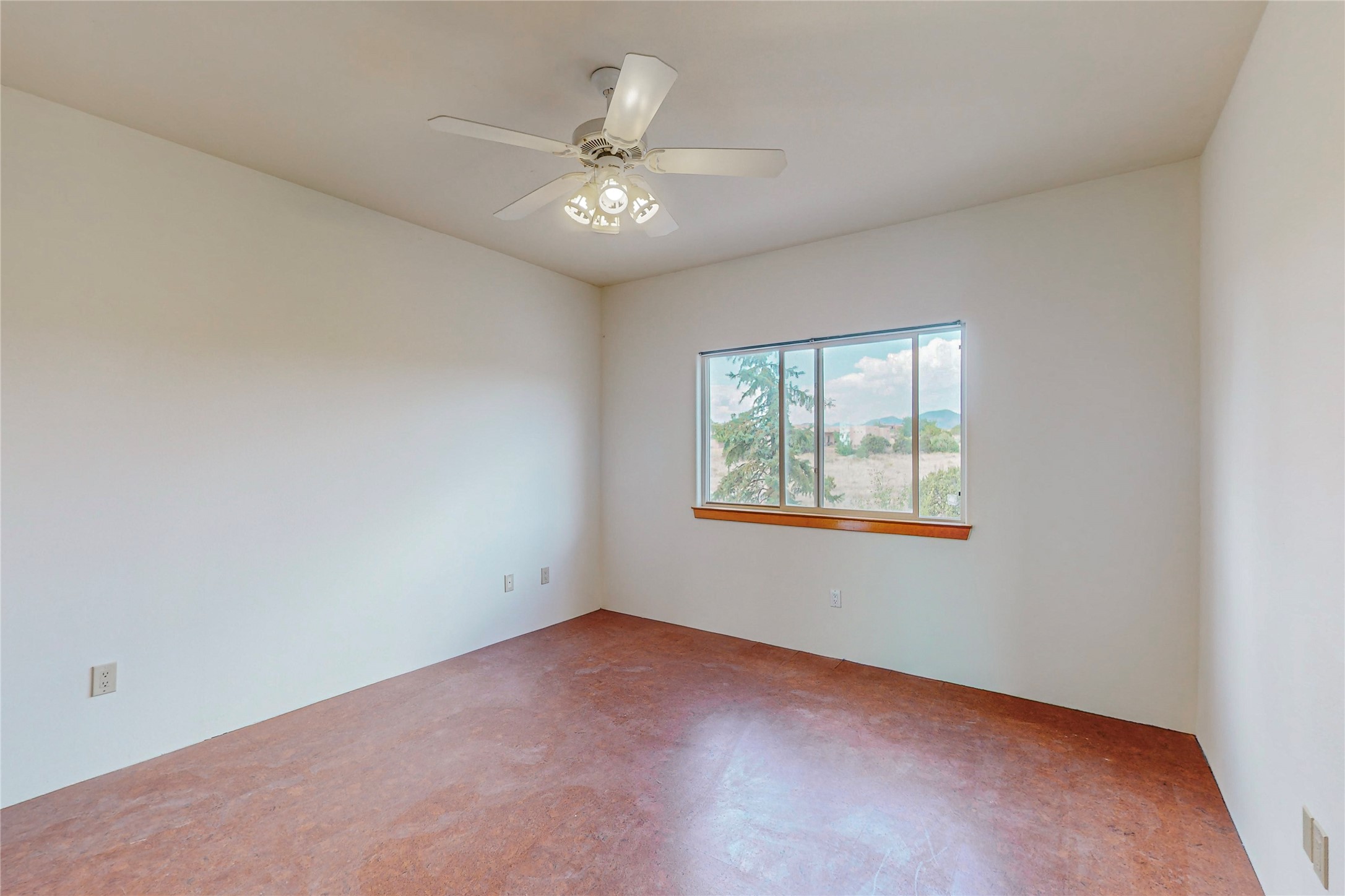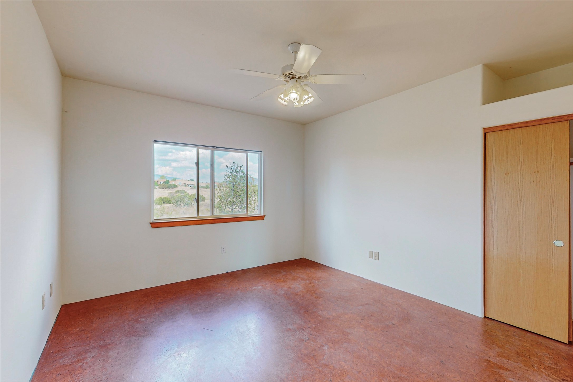 Open plan, split 3 bedroom, 2 bath home attached 800 sqft. 2 heated studios with huge high ceilings. Although small the high ceilings create a spacious feel. A sunburst design viga ceiling and corner living room fireplace opens to the kitchen and dining areas. The surrounding landscape is ready and invites your personal touches, and has sweeping mountain and sunset views. A large 2-car garage and plenty of guest parking adds convenience. Privately located on a cul de sac bordering a large greenbelt yet close to paved access roads leading to local shopping, restaurants, schools, senior center, and library. This home accesses all of Eldorado community activities and trails plus only minutes into Santa Fe.