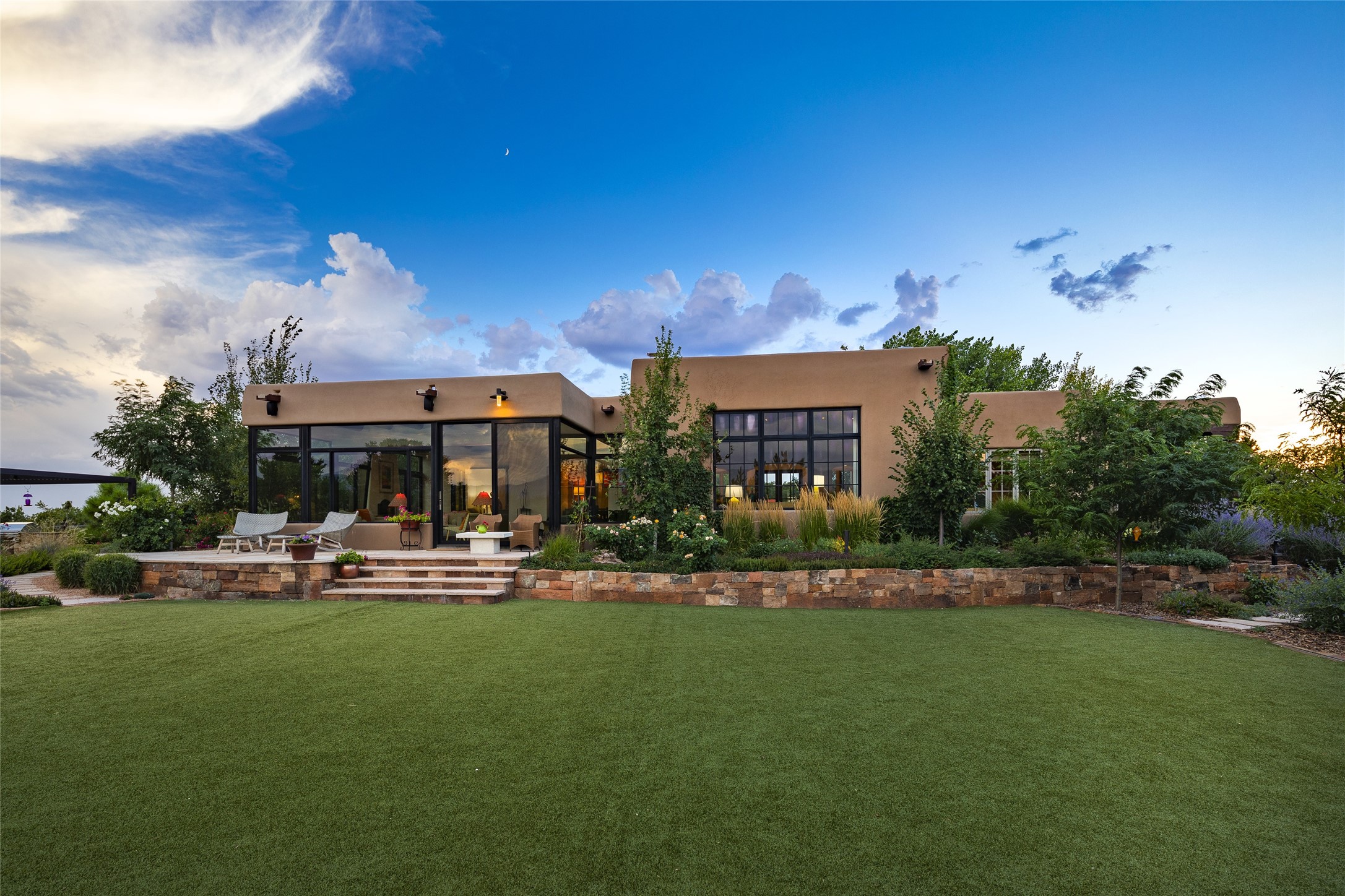 EXPERIENCE THE BEST-OF-THE-BEST IN THIS EXCITING SANTA FE PROPERTY WITH SWEEPING MOUNTAIN VIEWS LOCATED ON A RARE ELEVATED 5+ ACRE PARCEL ON COVETED TANO ROAD. Casa de la Luz is an open, airy, happy, single level home with natural light and lush gardens that enhance the home at every turn. Private gated entry and winding driveway are just the beginning. This exquisite residence has been renovated practically stem-to-stern with first class materials that feel livable, luxurious and relaxing. Dazzling white hand plastered walls, soaring ceilings and banks of windows take your eyes to the WOW views of mountain and sky! Elegant gates lead to the front courtyard with a water feature and impressive double doors that peak through the home to the Sangre de Cristo Mountains. The cook's kitchen is welcoming with plenty of counter space, high-end appliances and a den-like informal dining area. Entertain with style and grace at this stunning property which offers 3 bedrooms, each with an ensuite bathroom, and a separate office. The primary suite features a fireplace, a spa-like bathroom, a soaking tub, separate walk-in shower, and three oversized closets. The living room has soaring ceilings, a fireplace, and large windows that showcase the panoramic views. The sunroom is a perfect place to relax and enjoy the scenery, while the sitting room offers a cozy spot to read or watch TV. The property also includes a 3-car garage with epoxy floors and slat hanging units, a sleek laundry room, and a designer powder room with colors that subtly carry throughout the house. Fall in love with the outdoor living spaces filled with lush landscaping, water features, and mature trees, a covered patio with Lynx grill, and gated vegetable gardens where you can enjoy the peace and tranquility of nature, while being only minutes away from historic downtown Santa Fe. This is a rare opportunity to own a magnificent home in one of the most sought-after locations in Santa Fe. Live...Love...87506!