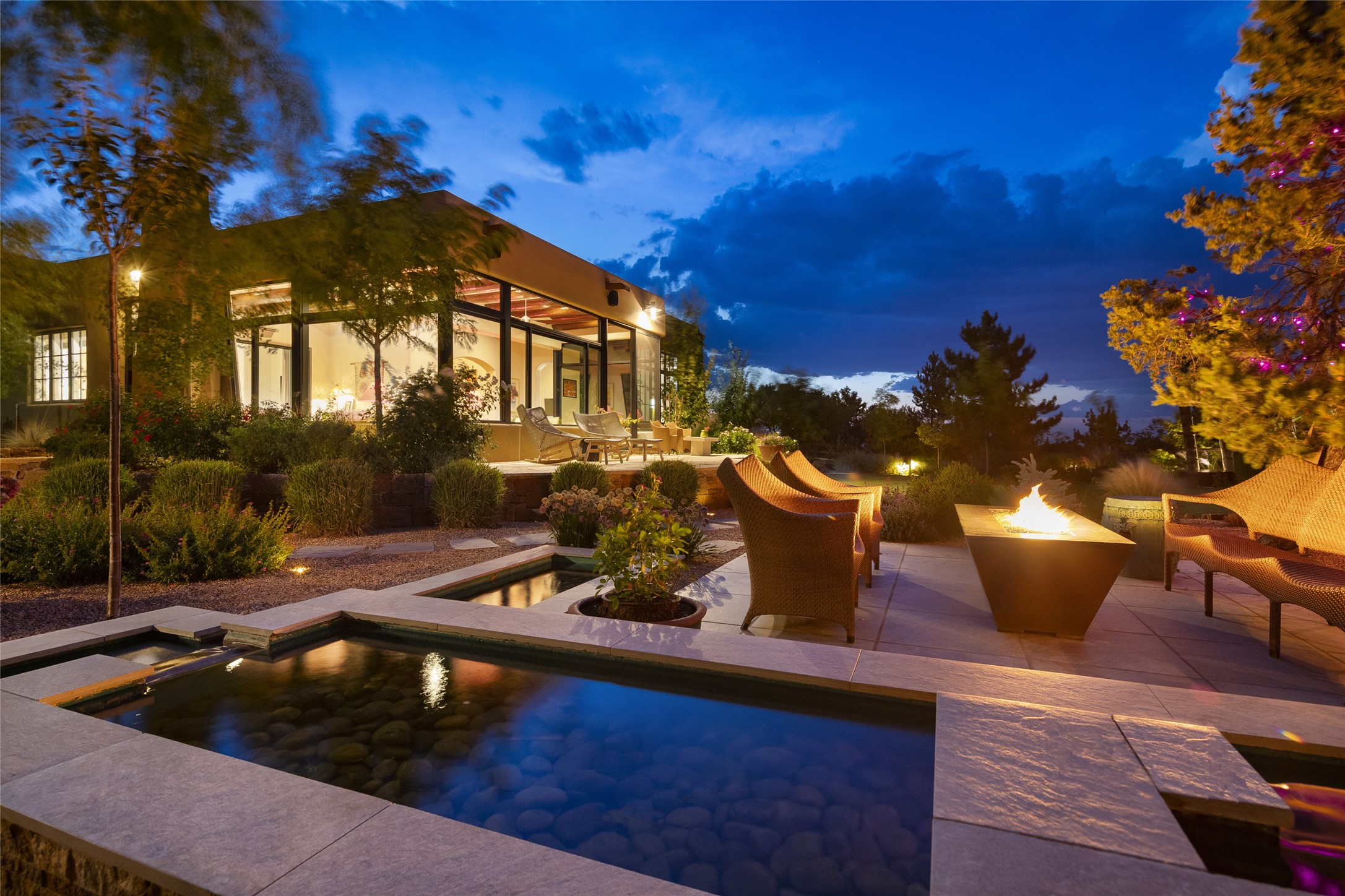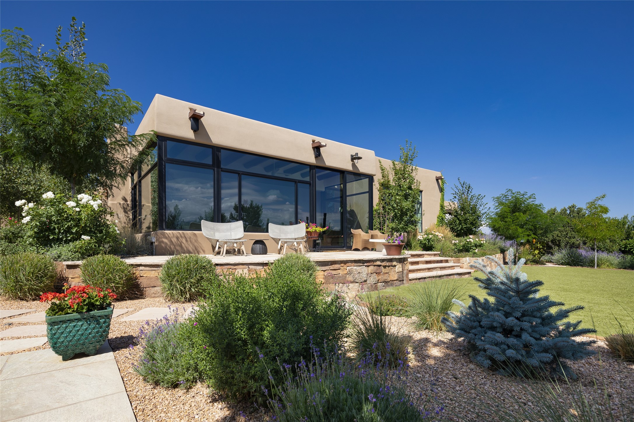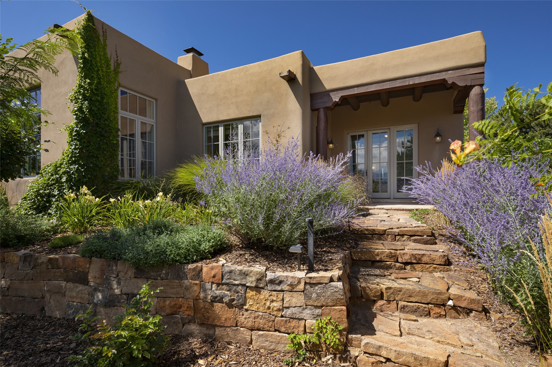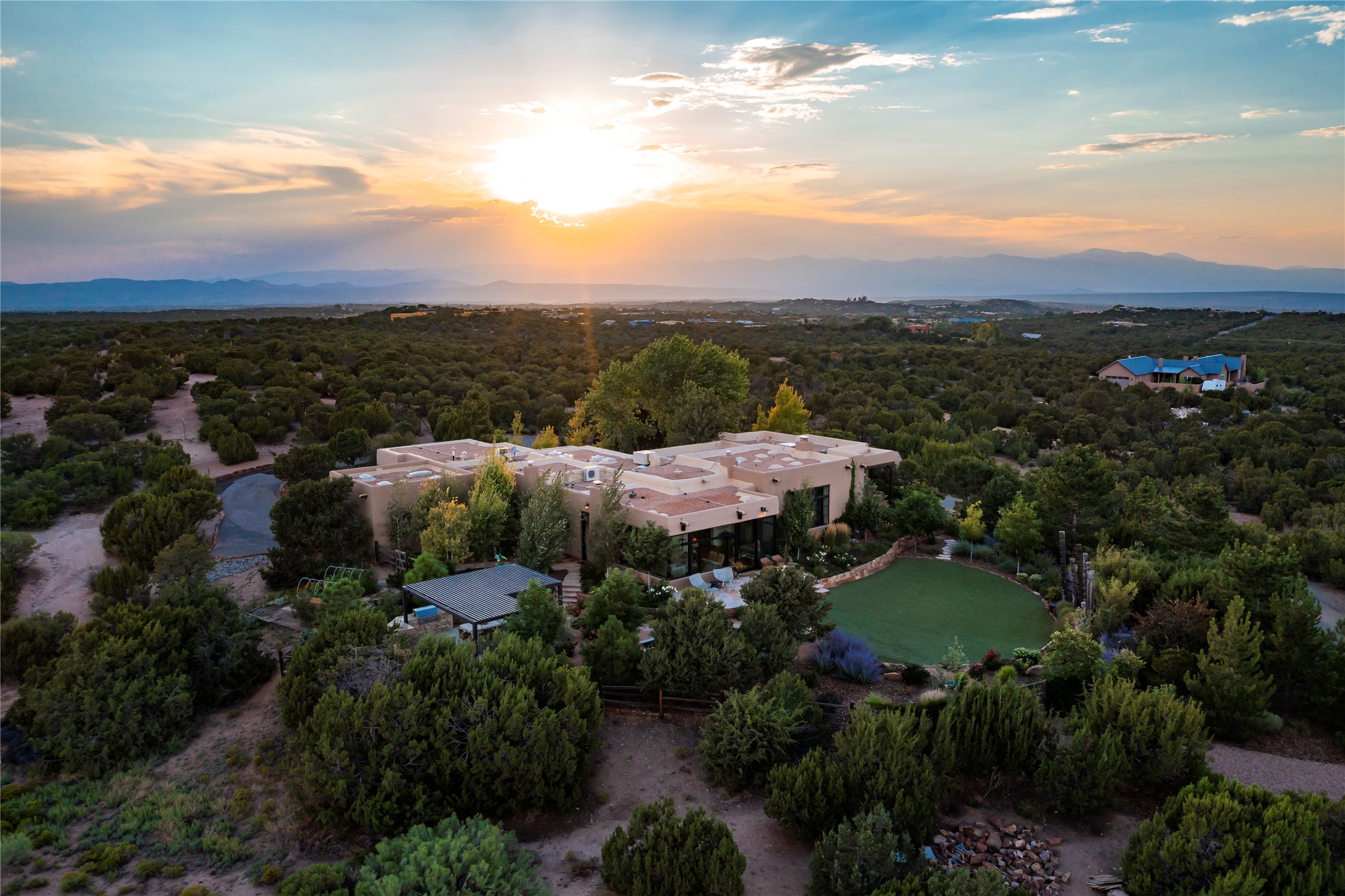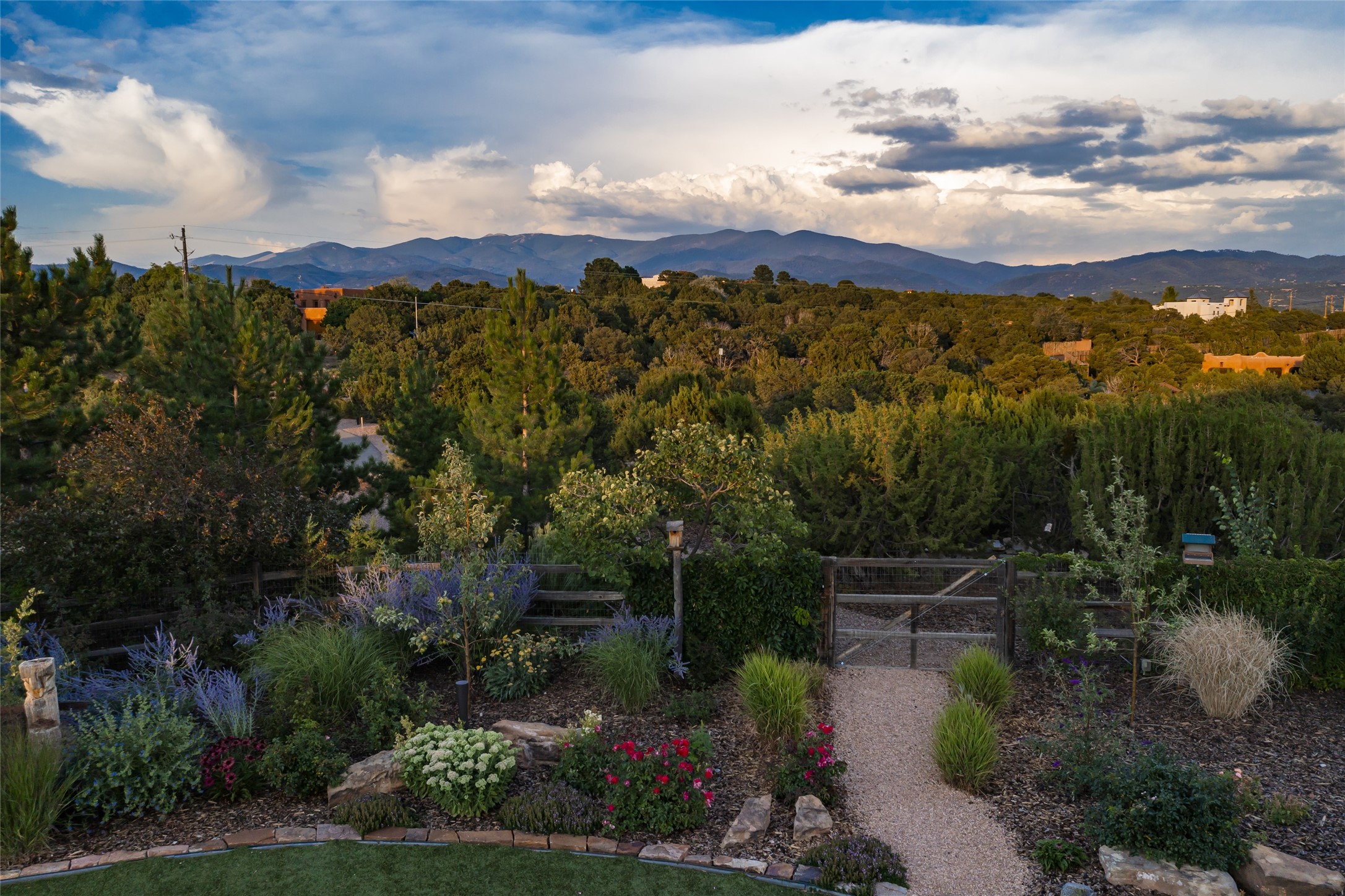 EXPERIENCE THE BEST-OF-THE-BEST IN THIS EXCITING SANTA FE PROPERTY WITH SWEEPING MOUNTAIN VIEWS LOCATED ON A RARE ELEVATED 5+ ACRE PARCEL ON COVETED TANO ROAD. Casa de la Luz is an open, airy, happy, single level home with natural light and lush gardens that enhance the home at every turn. Private gated entry and winding driveway are just the beginning. This exquisite residence has been renovated practically stem-to-stern with first class materials that feel livable, luxurious and relaxing. Dazzling white hand plastered walls, soaring ceilings and banks of windows take your eyes to the WOW views of mountain and sky! Elegant gates lead to the front courtyard with a water feature and impressive double doors that peak through the home to the Sangre de Cristo Mountains. The cook's kitchen is welcoming with plenty of counter space, high-end appliances and a den-like informal dining area. Entertain with style and grace at this stunning property which offers 3 bedrooms, each with an ensuite bathroom, and a separate office. The primary suite features a fireplace, a spa-like bathroom, a soaking tub, separate walk-in shower, and three oversized closets. The living room has soaring ceilings, a fireplace, and large windows that showcase the panoramic views. The sunroom is a perfect place to relax and enjoy the scenery, while the sitting room offers a cozy spot to read or watch TV. The property also includes a 3-car garage with epoxy floors and slat hanging units, a sleek laundry room, and a designer powder room with colors that subtly carry throughout the house. Fall in love with the outdoor living spaces filled with lush landscaping, water features, and mature trees, a covered patio with Lynx grill, and gated vegetable gardens where you can enjoy the peace and tranquility of nature, while being only minutes away from historic downtown Santa Fe. This is a rare opportunity to own a magnificent home in one of the most sought-after locations in Santa Fe. Live...Love...87506!