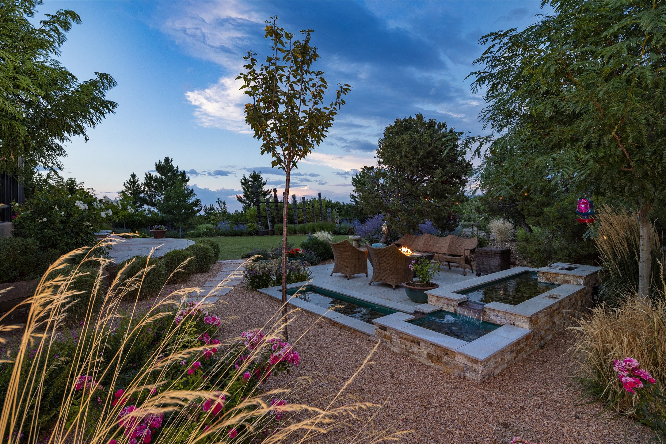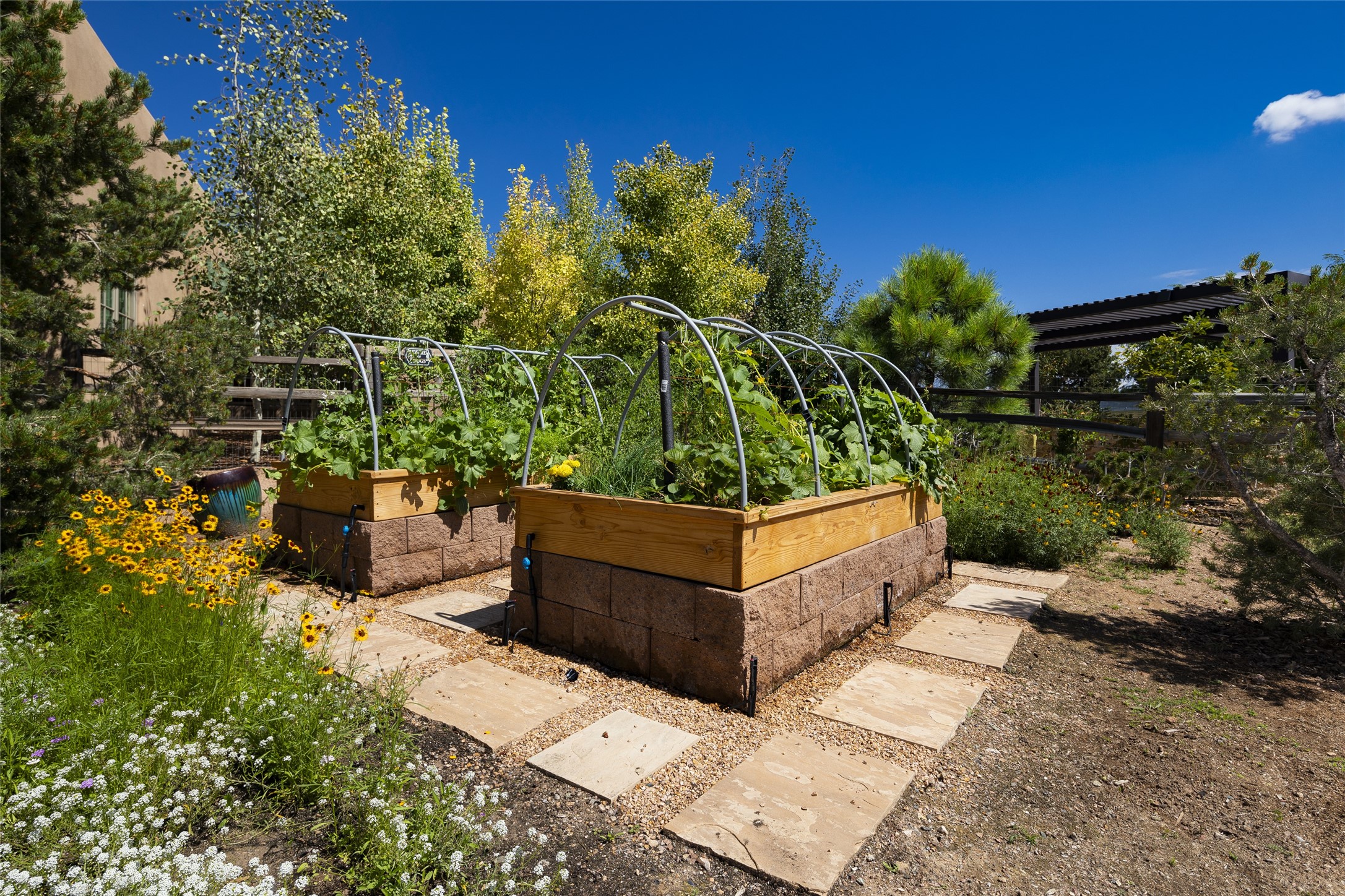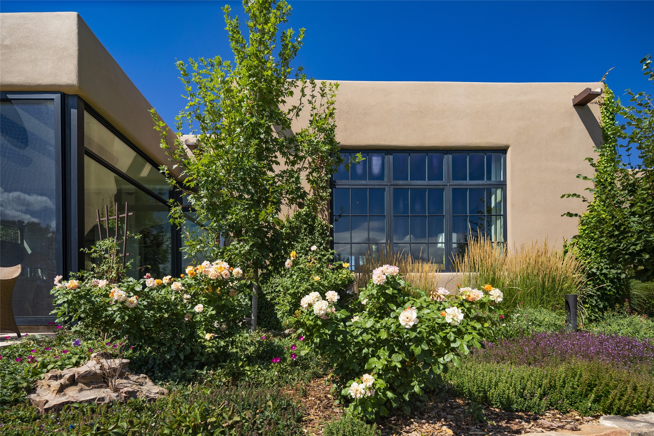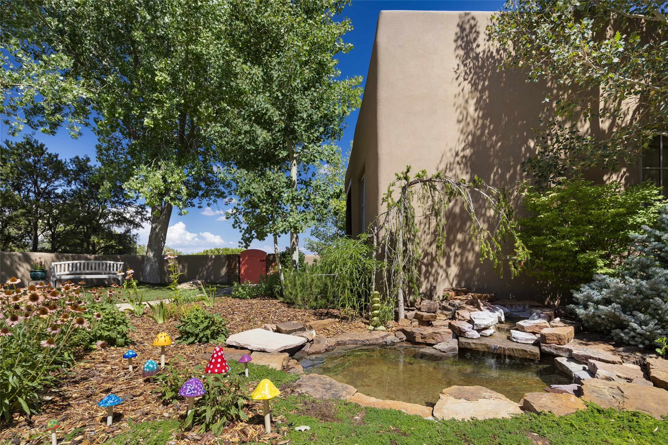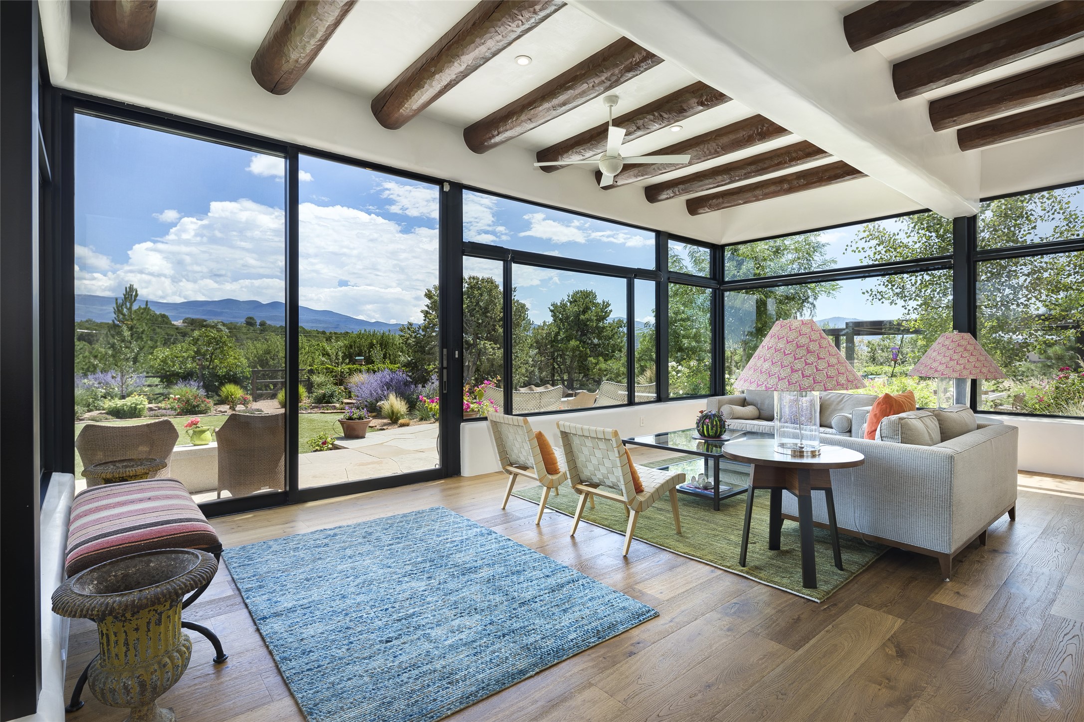 EXPERIENCE THE BEST-OF-THE-BEST IN THIS EXCITING SANTA FE PROPERTY WITH SWEEPING MOUNTAIN VIEWS LOCATED ON A RARE ELEVATED 5+ ACRE PARCEL ON COVETED TANO ROAD. Casa de la Luz is an open, airy, happy, single level home with natural light and lush gardens that enhance the home at every turn. Private gated entry and winding driveway are just the beginning. This exquisite residence has been renovated practically stem-to-stern with first class materials that feel livable, luxurious and relaxing. Dazzling white hand plastered walls, soaring ceilings and banks of windows take your eyes to the WOW views of mountain and sky! Elegant gates lead to the front courtyard with a water feature and impressive double doors that peak through the home to the Sangre de Cristo Mountains. The cook's kitchen is welcoming with plenty of counter space, high-end appliances and a den-like informal dining area. Entertain with style and grace at this stunning property which offers 3 bedrooms, each with an ensuite bathroom, and a separate office. The primary suite features a fireplace, a spa-like bathroom, a soaking tub, separate walk-in shower, and three oversized closets. The living room has soaring ceilings, a fireplace, and large windows that showcase the panoramic views. The sunroom is a perfect place to relax and enjoy the scenery, while the sitting room offers a cozy spot to read or watch TV. The property also includes a 3-car garage with epoxy floors and slat hanging units, a sleek laundry room, and a designer powder room with colors that subtly carry throughout the house. Fall in love with the outdoor living spaces filled with lush landscaping, water features, and mature trees, a covered patio with Lynx grill, and gated vegetable gardens where you can enjoy the peace and tranquility of nature, while being only minutes away from historic downtown Santa Fe. This is a rare opportunity to own a magnificent home in one of the most sought-after locations in Santa Fe. Live...Love...87506!