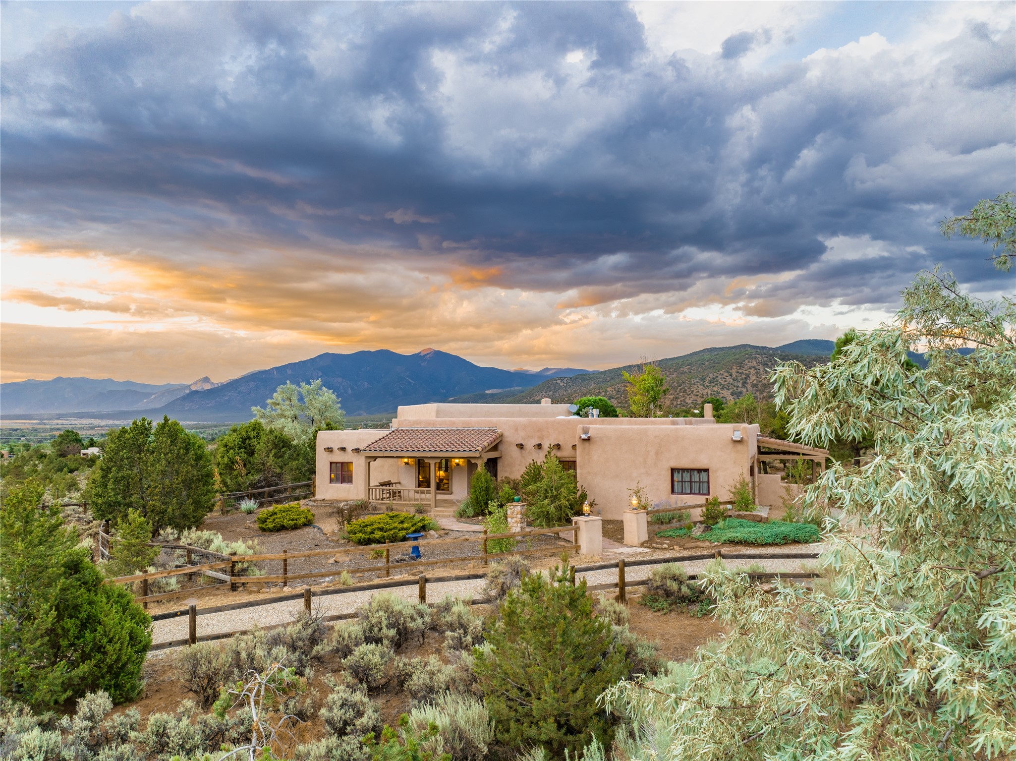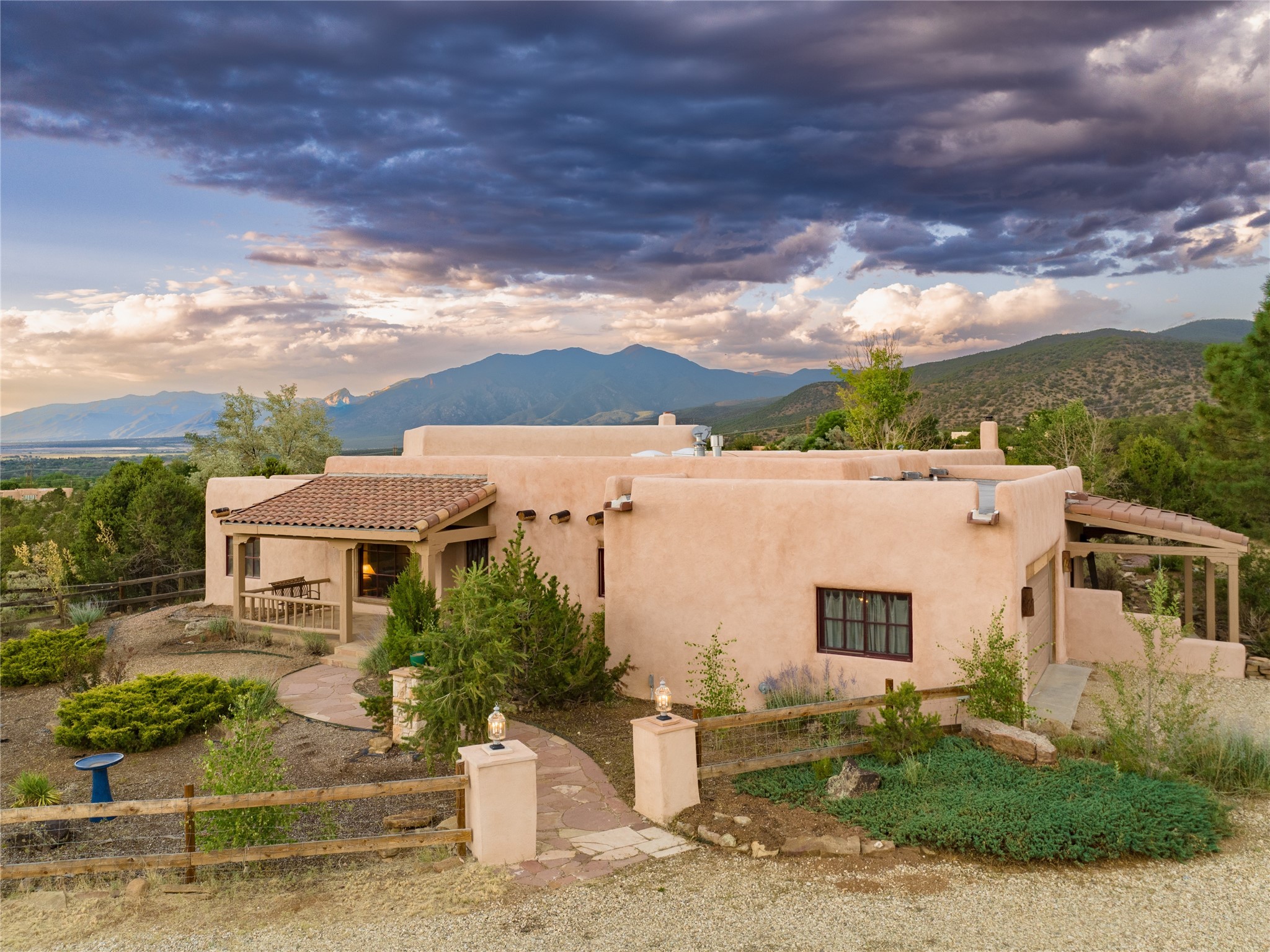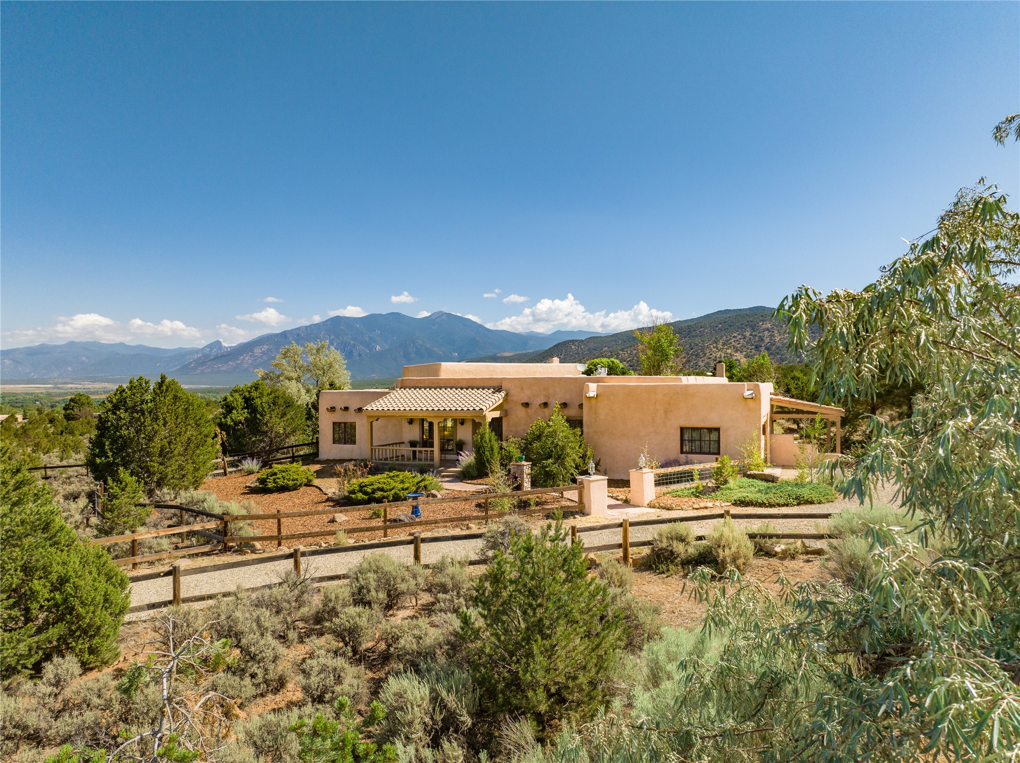 Come see this stunning Taos property before it's gone! Set on 3 acres in the Weimer neighborhood, the beautiful adobe-style home comes with excellent views of the Sangre de Cristo mountains. Inside, enjoy iconic Southwestern features such as saltillo tile floors, plaster walls, and large vigas throughout the entire home. Marvel at the unobstructed views of the mountains from the spacious living area with a vaulted ceiling, wood-burning fireplace, and access to the covered patio. The large kitchen offers beautiful wood cabinetry and tilework, a large pantry, and ample space for creating gourmet meals on the granite countertops. The primary bedroom has a kiva-style fireplace and the ensuite bathroom features a walk-in shower and large tub with luxury tiling and a massive walk-in closet. Two guest bedrooms with ensuite bathrooms offer plenty of room for the entire family. Additional features include a fourth bedroom that is currently setup as a billiards room and a laundry room with full size washer and dryer. An attached garage has room for two vehicles, and a separate outbuilding can store two more vehicles or be finished out as a studio or workshop. Enjoy the comforts of southwestern luxury with 1101 Hennings Street!