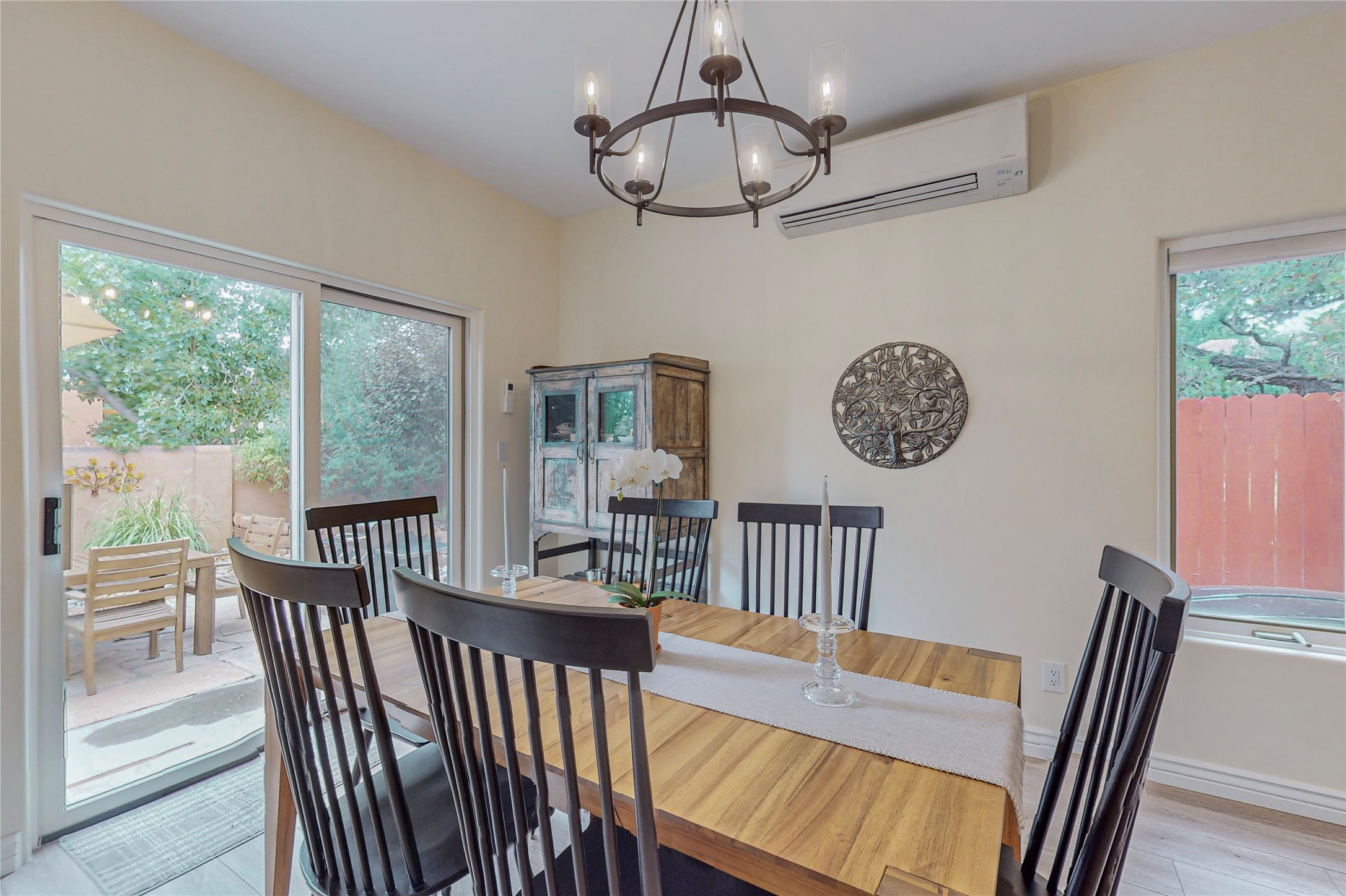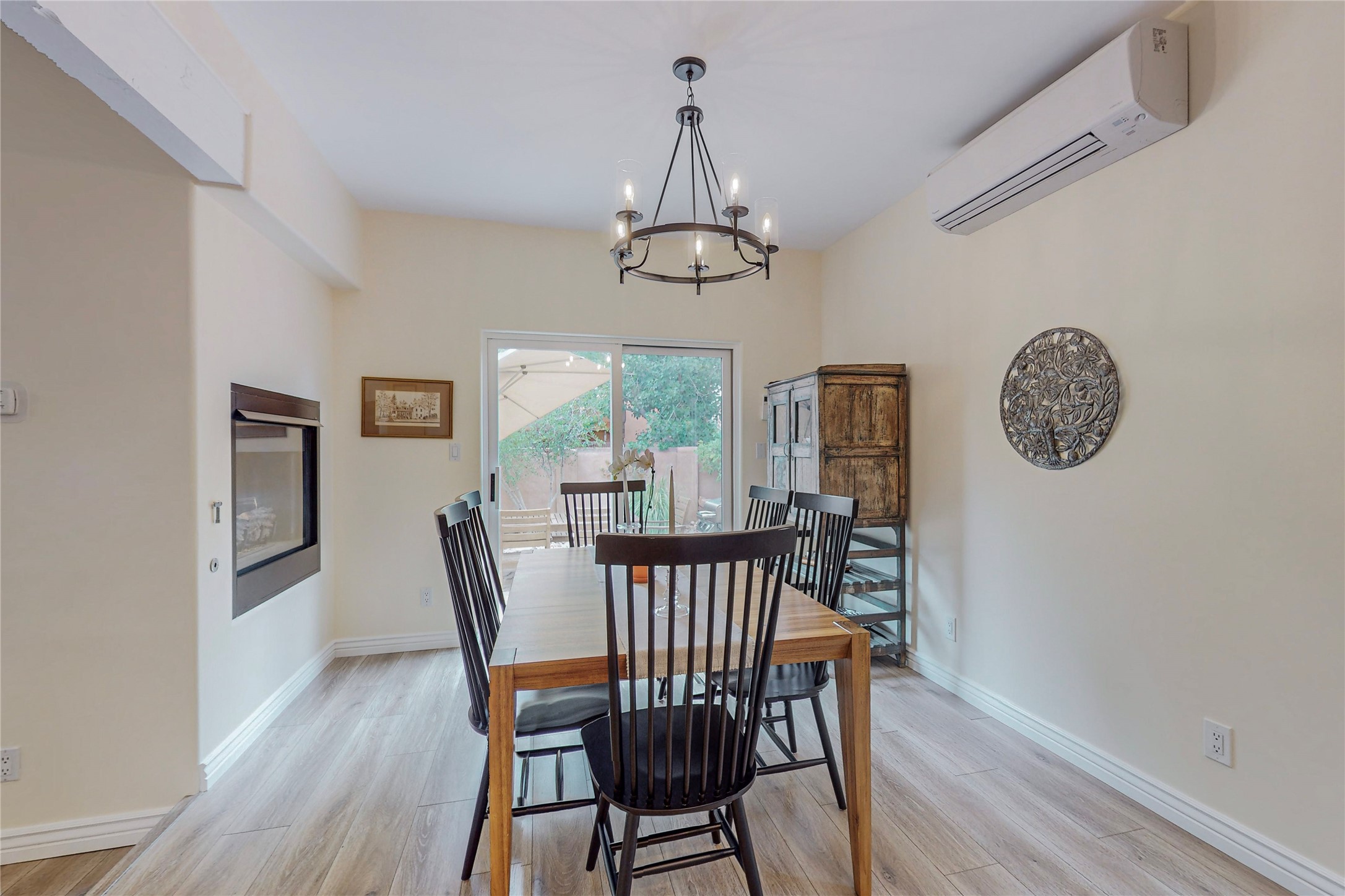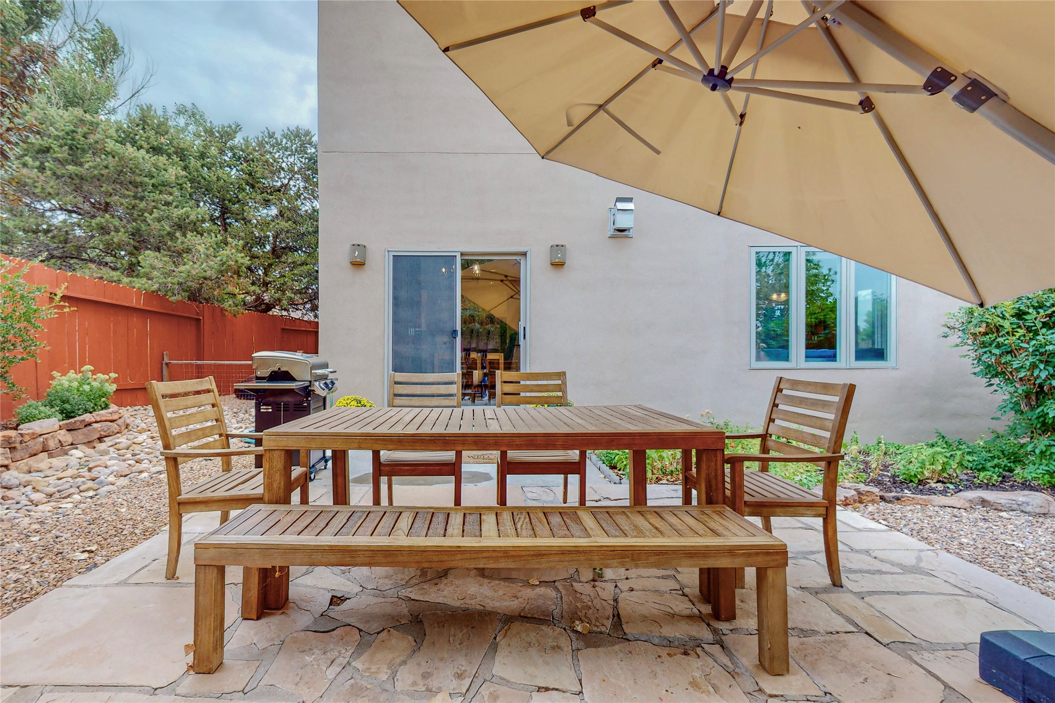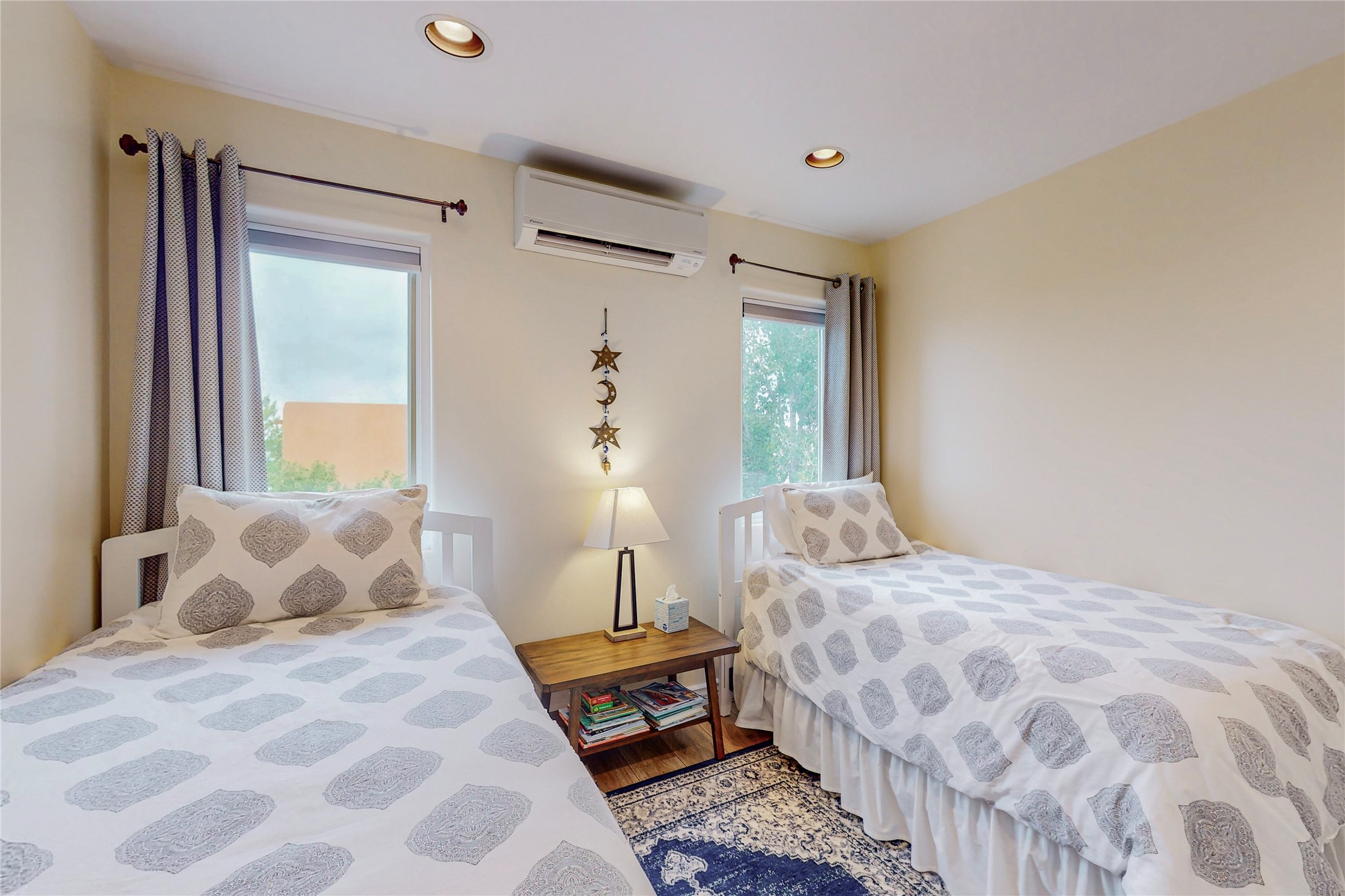 This 3 bed, 3 bath home is located on a quiet cul-de-sac in the desirable Pueblos Del Sol neighborhood. Recent updates include new flooring, new kitchen cabinets, new countertops and all new appliances. All the baths in the home have been updated. This owner has recently had new ductless (mini-split) HVAC units that both cool and heat added. Enjoy views of the Sangre de Cristo Mountains from the primary bedroom and western views from the upstairs guest bedroom. One fireplace that serves dining and living areas. Primary shower is a walk-in. There is one guest bedroom and full bath on the ground level.
