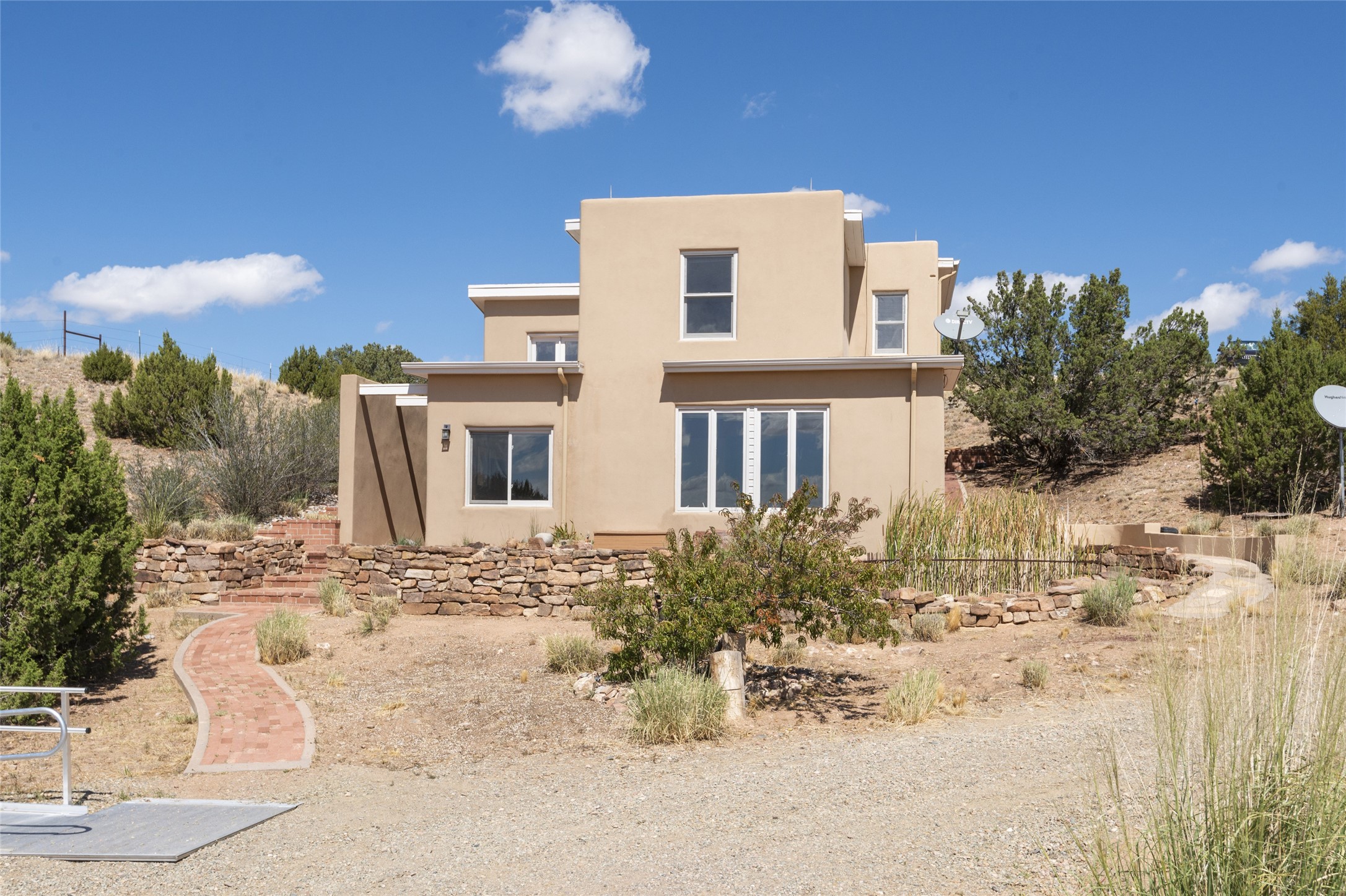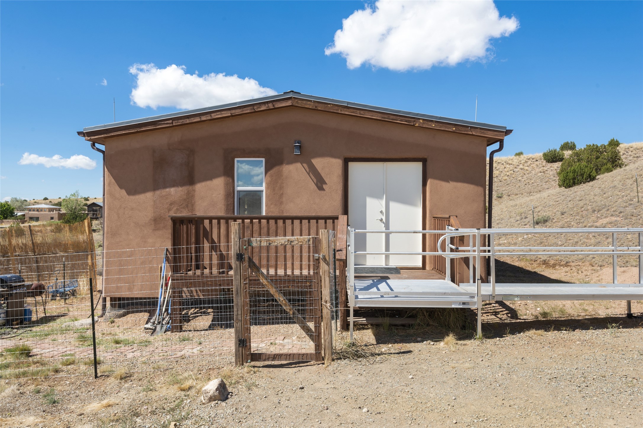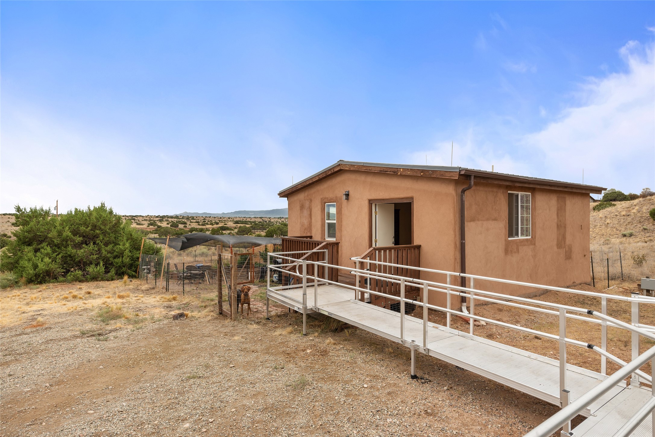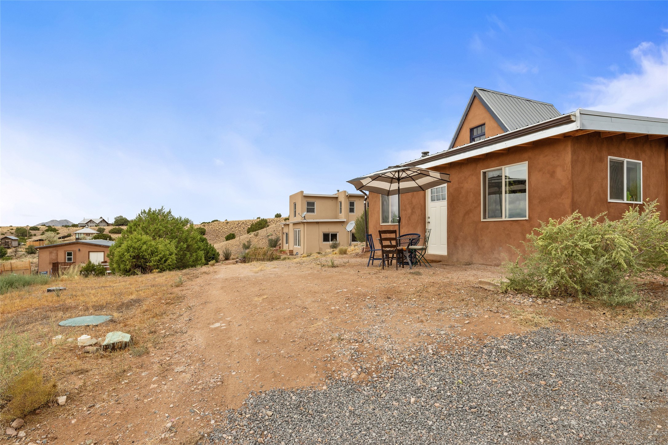 Live the Good Life with views of the Ortiz Mountains plus an instant revenue from the two sweet rentals, the present owners have been growing their own food and also installed a Universal Advanced Water System on the property, using the abundant well on site.The spacious 3 bedroom two bathroom house sits atop the hill, viewing the land around. It is 2,165 sq ft built in 2009. There are two additional guest houses, each with their own bathroom and bedroom. We think the first dwelling was built in 1979, that is 580sq ft. The other guest house/casita is 675sq ft, it is ADA compliant with a ramp, which can easily be removed if desired. The sellers have been using this as a family compound but any of the units could be a wonderful source of revenue for the buyer. This is just a 20 minute drive from town, 25 minutes to downtown.