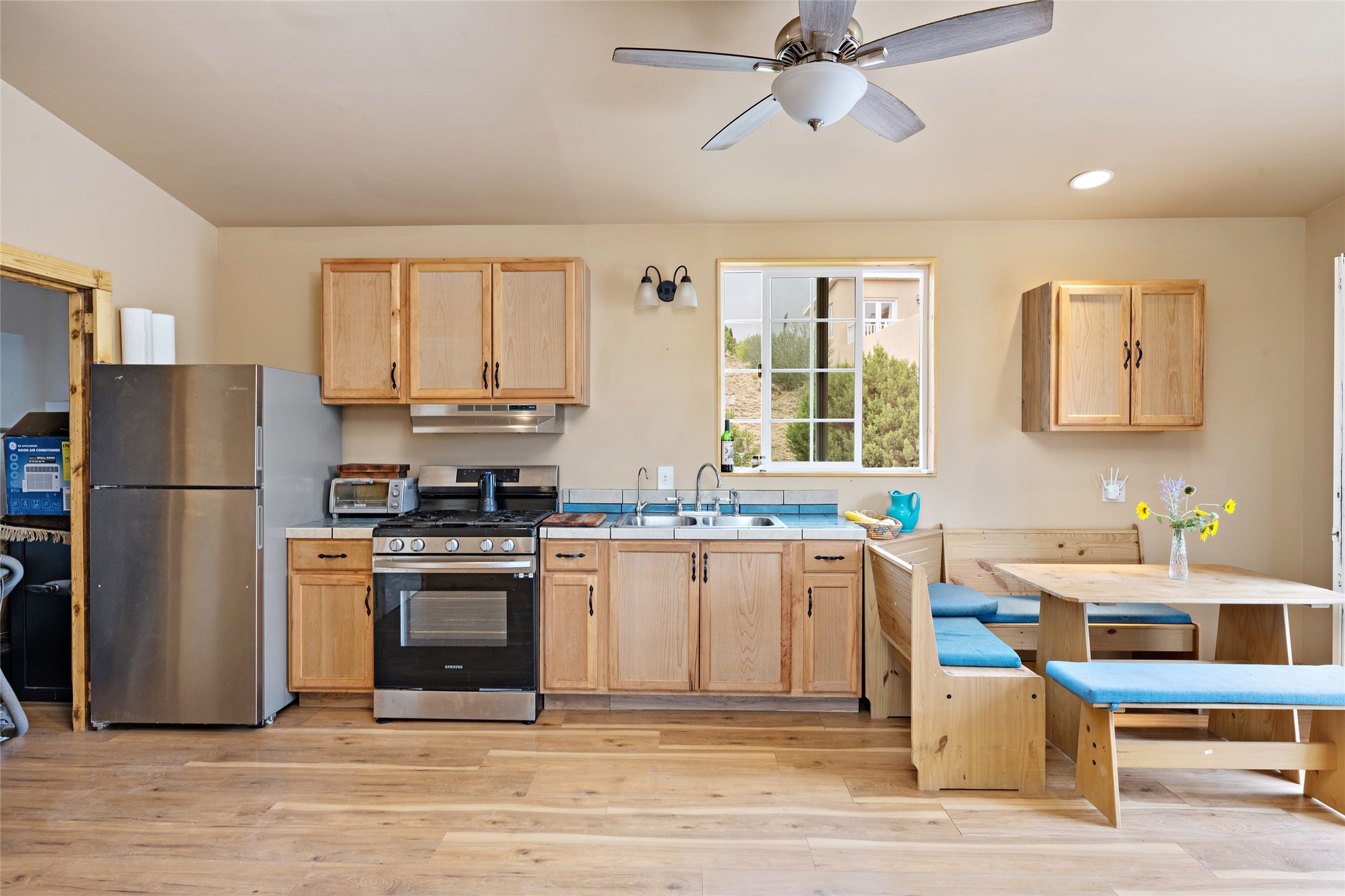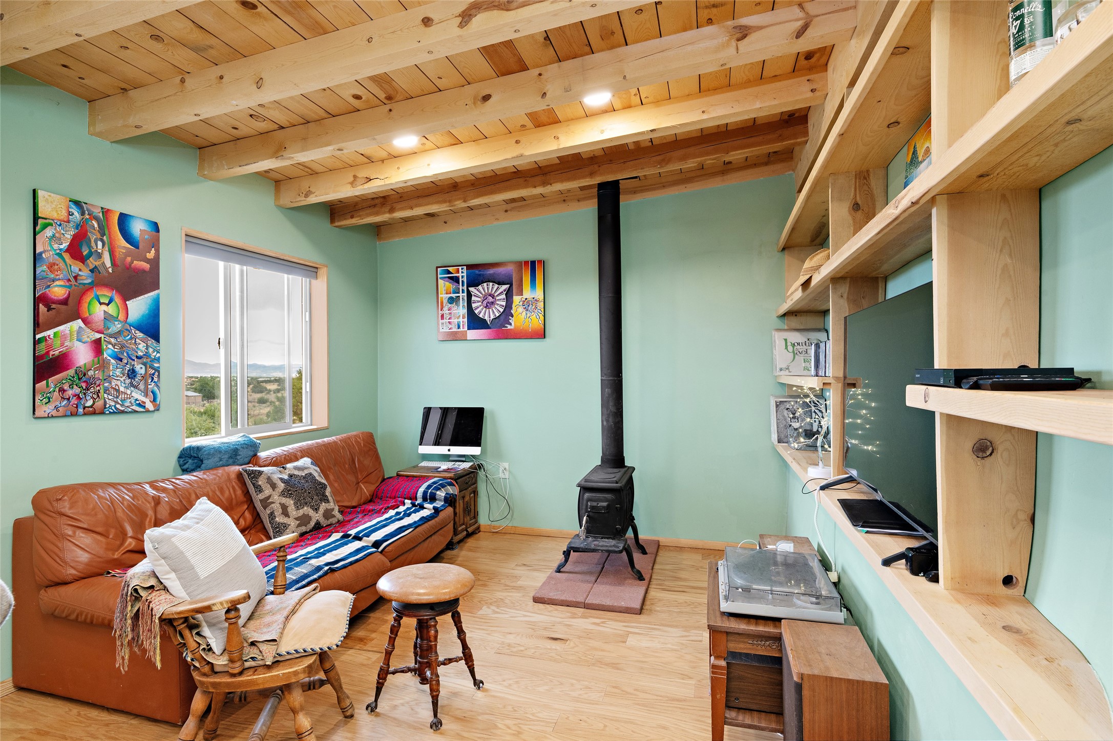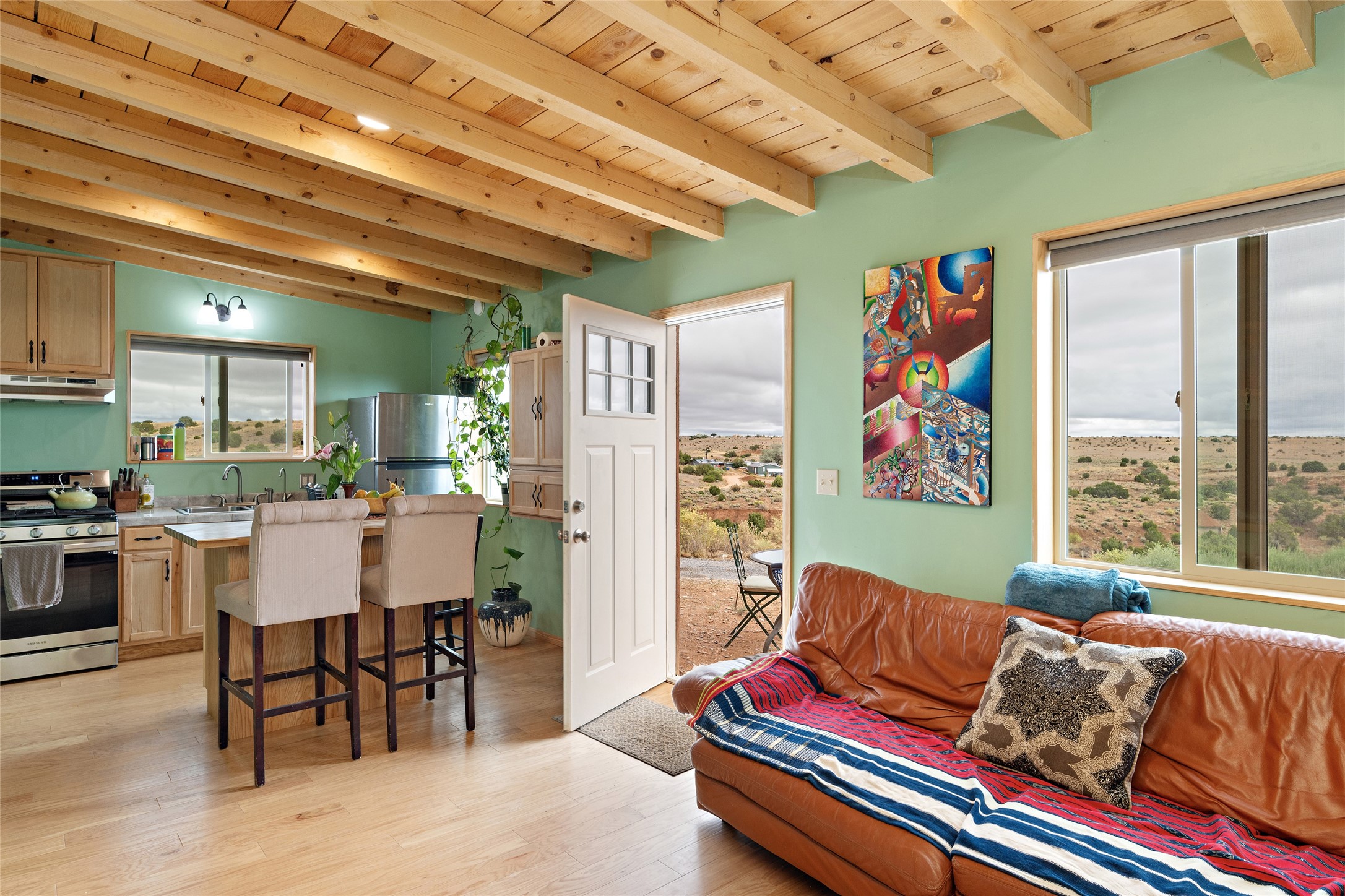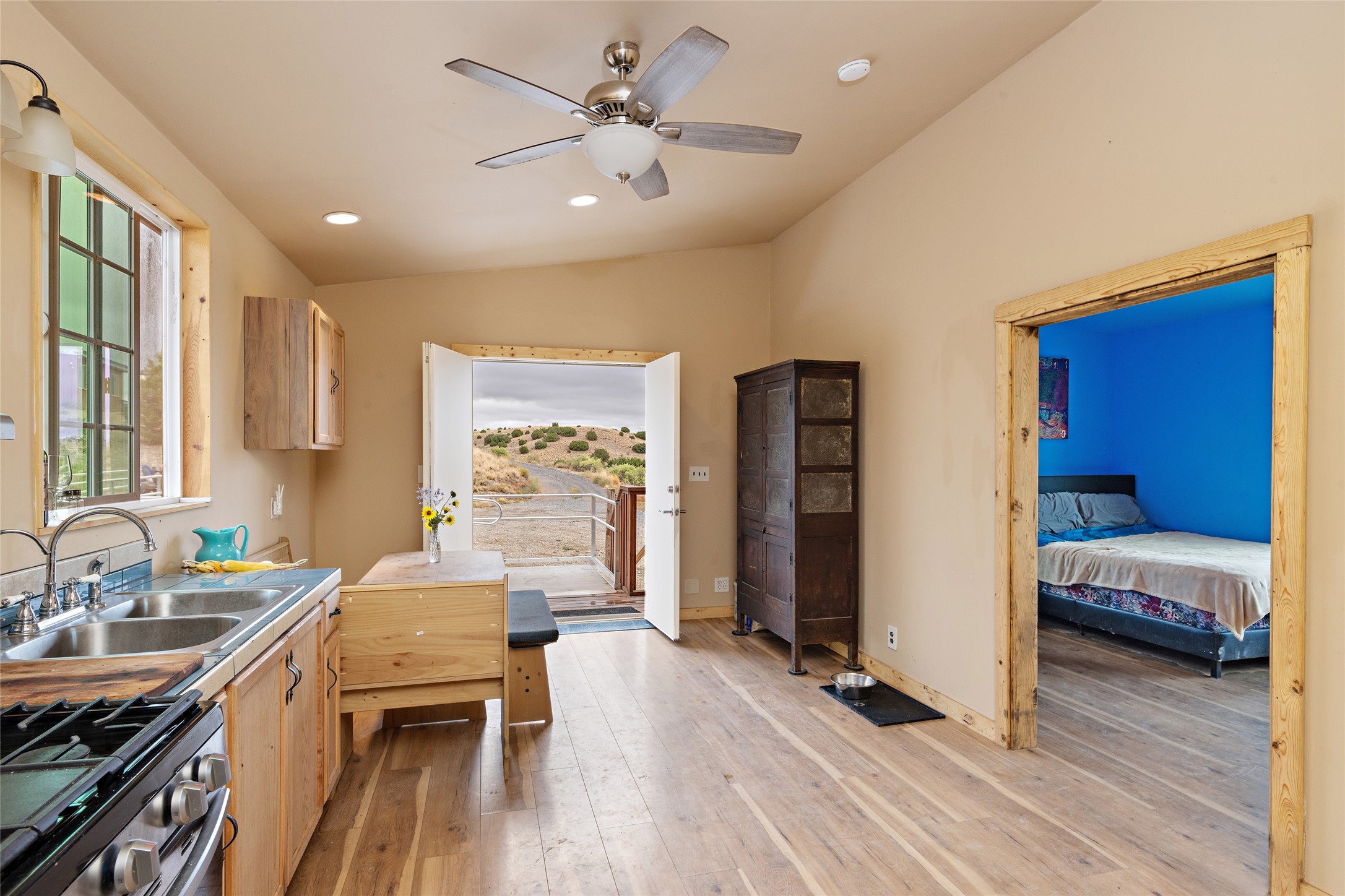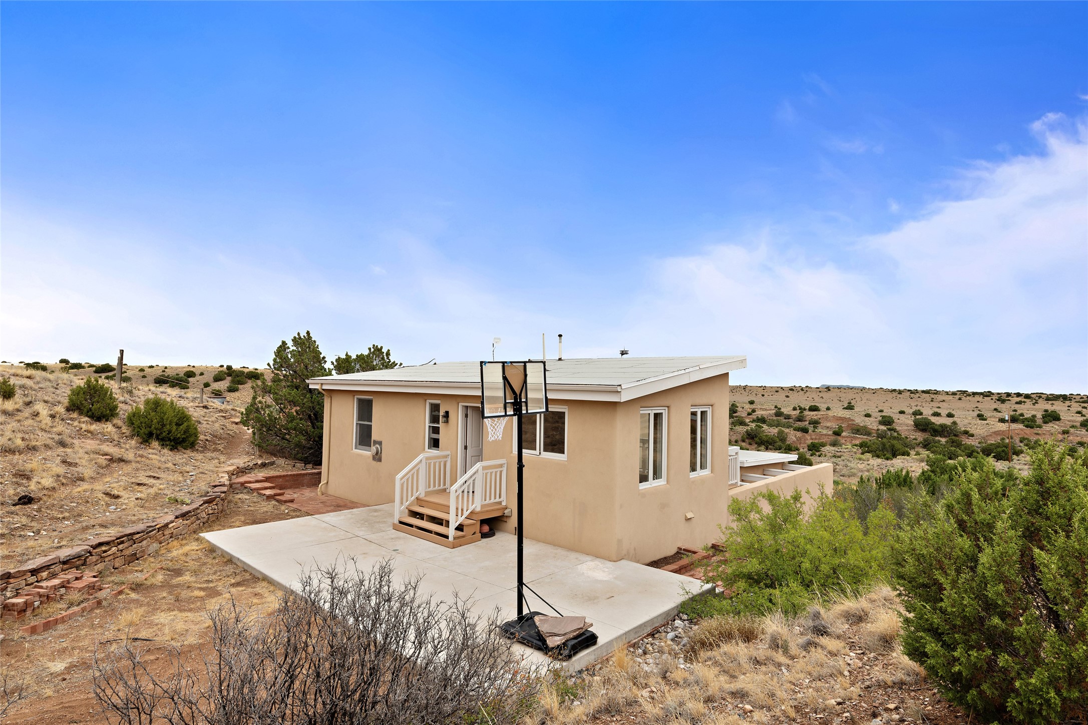 Live the Good Life with views of the Ortiz Mountains plus an instant revenue from the two sweet rentals, the present owners have been growing their own food and also installed a Universal Advanced Water System on the property, using the abundant well on site.The spacious 3 bedroom two bathroom house sits atop the hill, viewing the land around. It is 2,165 sq ft built in 2009. There are two additional guest houses, each with their own bathroom and bedroom. We think the first dwelling was built in 1979, that is 580sq ft. The other guest house/casita is 675sq ft, it is ADA compliant with a ramp, which can easily be removed if desired. The sellers have been using this as a family compound but any of the units could be a wonderful source of revenue for the buyer. This is just a 20 minute drive from town, 25 minutes to downtown.