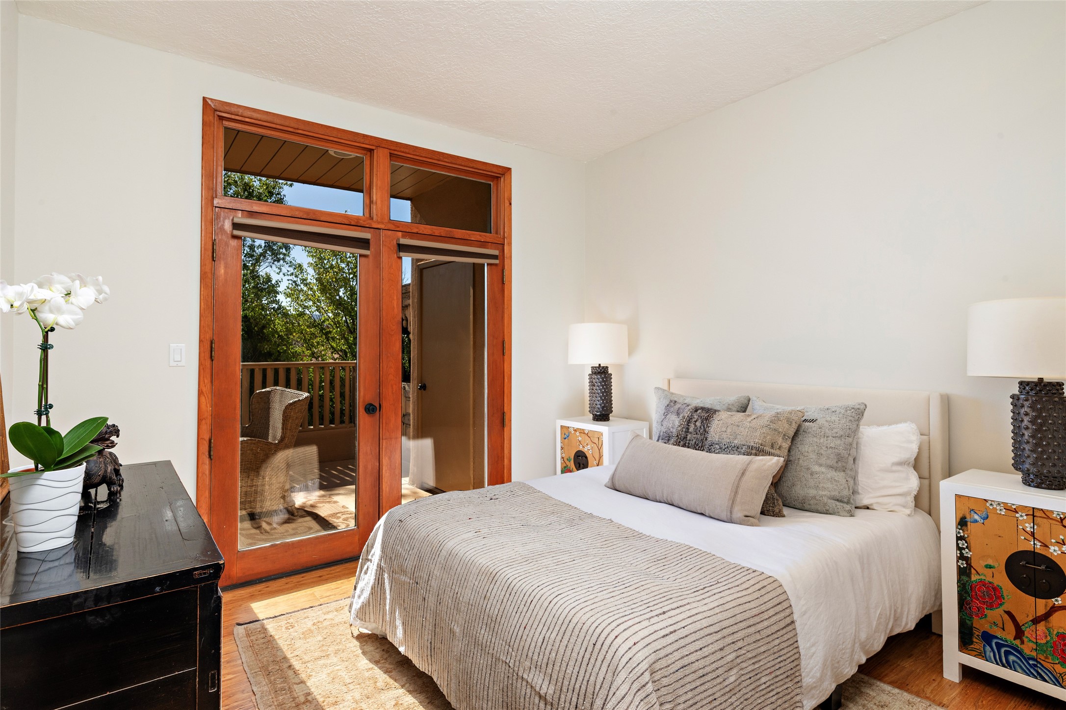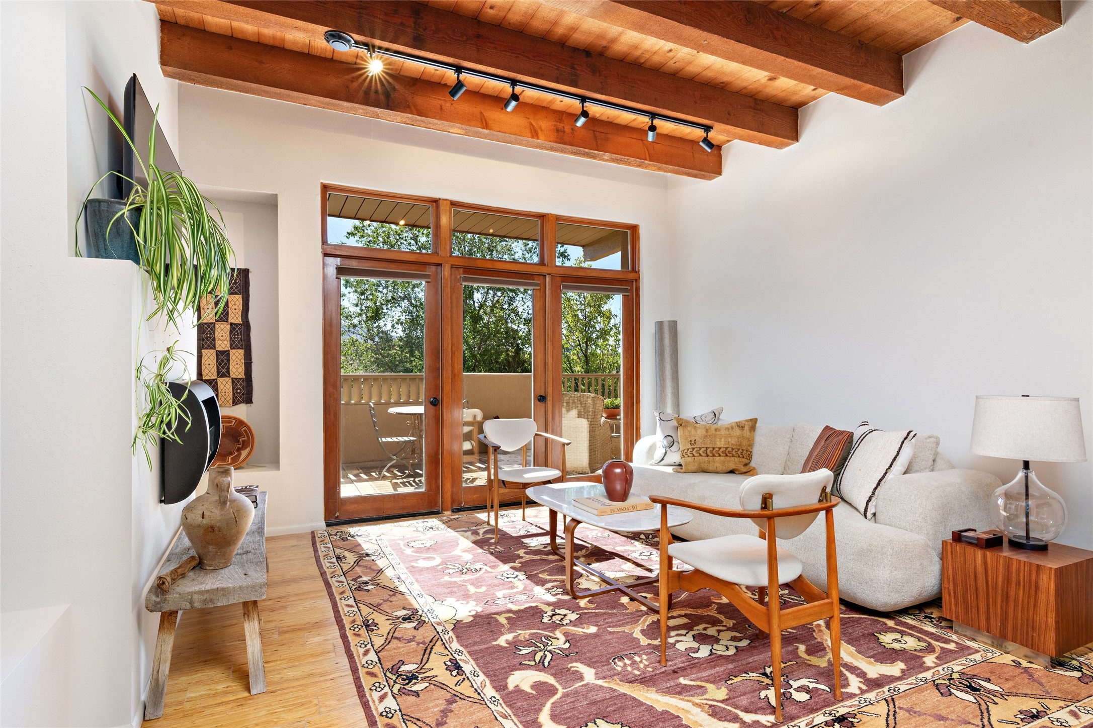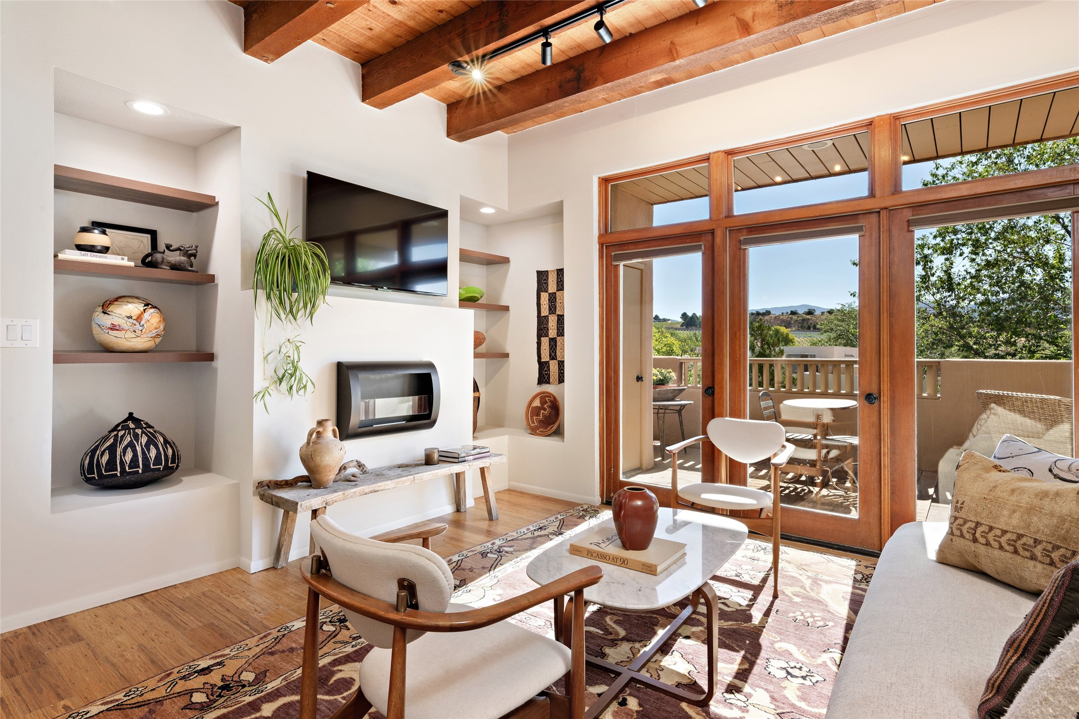 What is not to like about this crisp, compact, newly refurbished condominium in a superb location just minutes from the heart of Santa Fe? At the end unit of the Vieto del Norte complex, the sweet home enjoys the advantage of no neighbors on the north side; hence, more windows for better light and extra views. A bright interior flows seamlessly into the large balcony off both the living room and bedroom, nearly doubling the enjoyable space for entertaining and peaceful relaxation. Wood floors, plank and square cut beam ceilings, and wood frame glass paned doors offer a handsome counterpoint to the lighter touch given to the rest of the dcor. The kitchen and dining spaces are cozy yet fully functional with renovated shelves and countertops as well as new appliances. The bathroom has been completely renovated and the space maximized by installing a large reach-in closet. A stacked washer/dryer lives in the kitchen pantry/storage closet and a downstairs garage provides room for one vehicle and additional storage. A perfect home for quick and easy access to all of Santa Fe's special summer fairs and festivals and an equally easy spot to languish in after long winter days spent at the ski basin. Whether looking for an easy seasonal foothold in Santa Fe, a profitable rental property, or a charming carefree home in a prime part of Santa Fe, this special unit should not be missed.