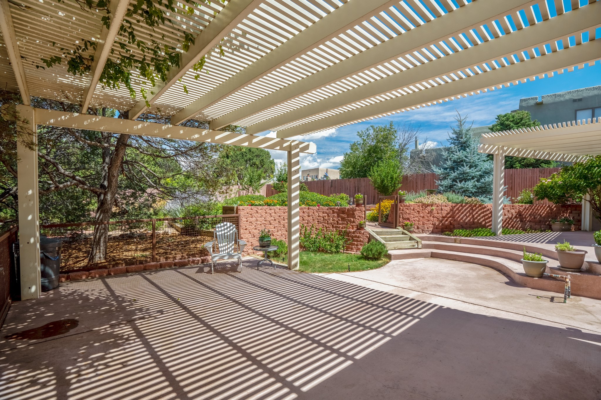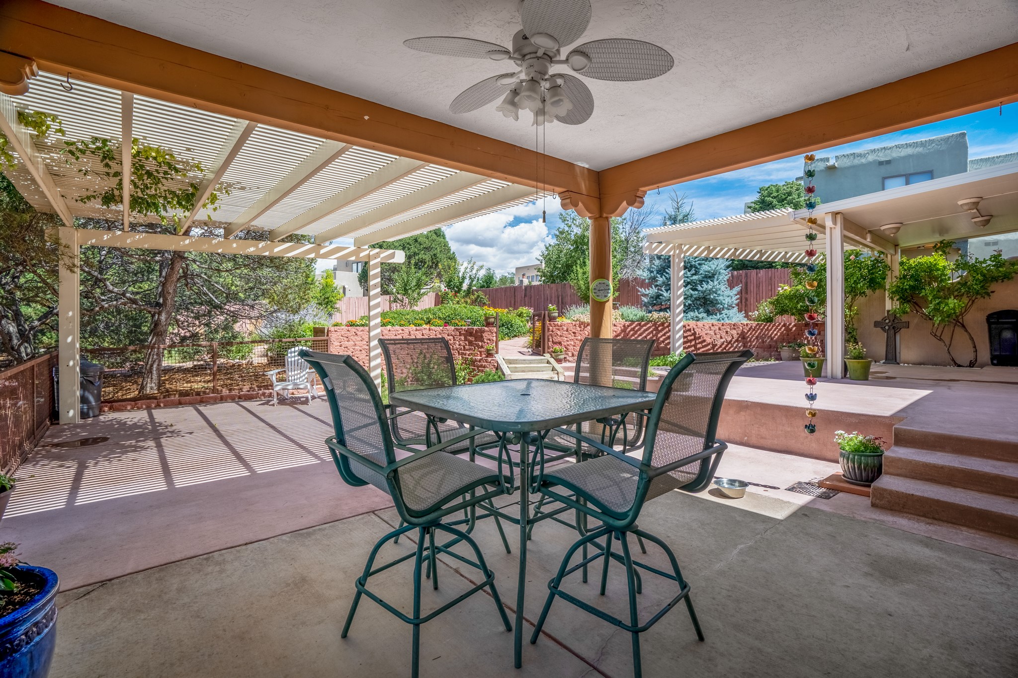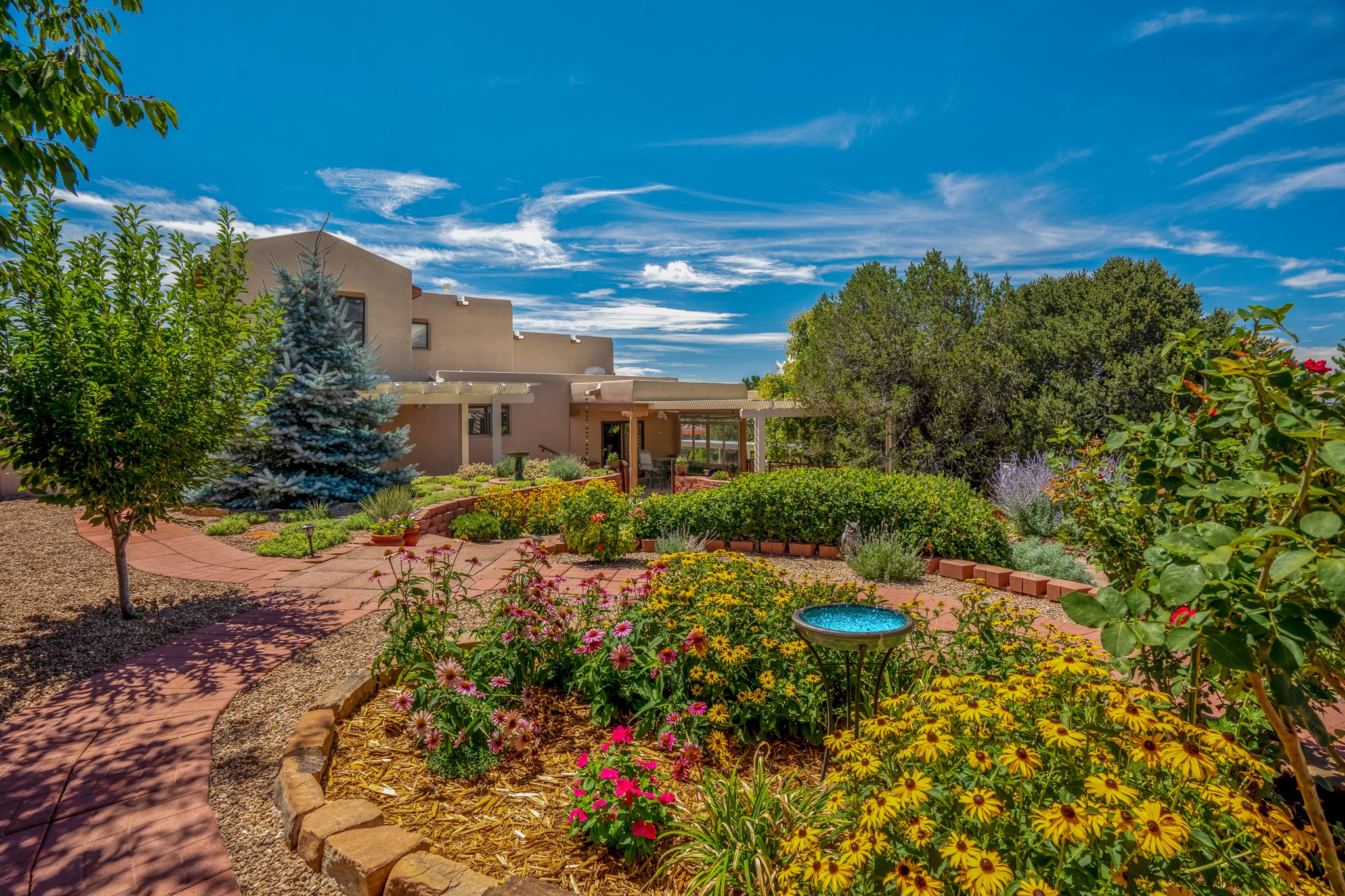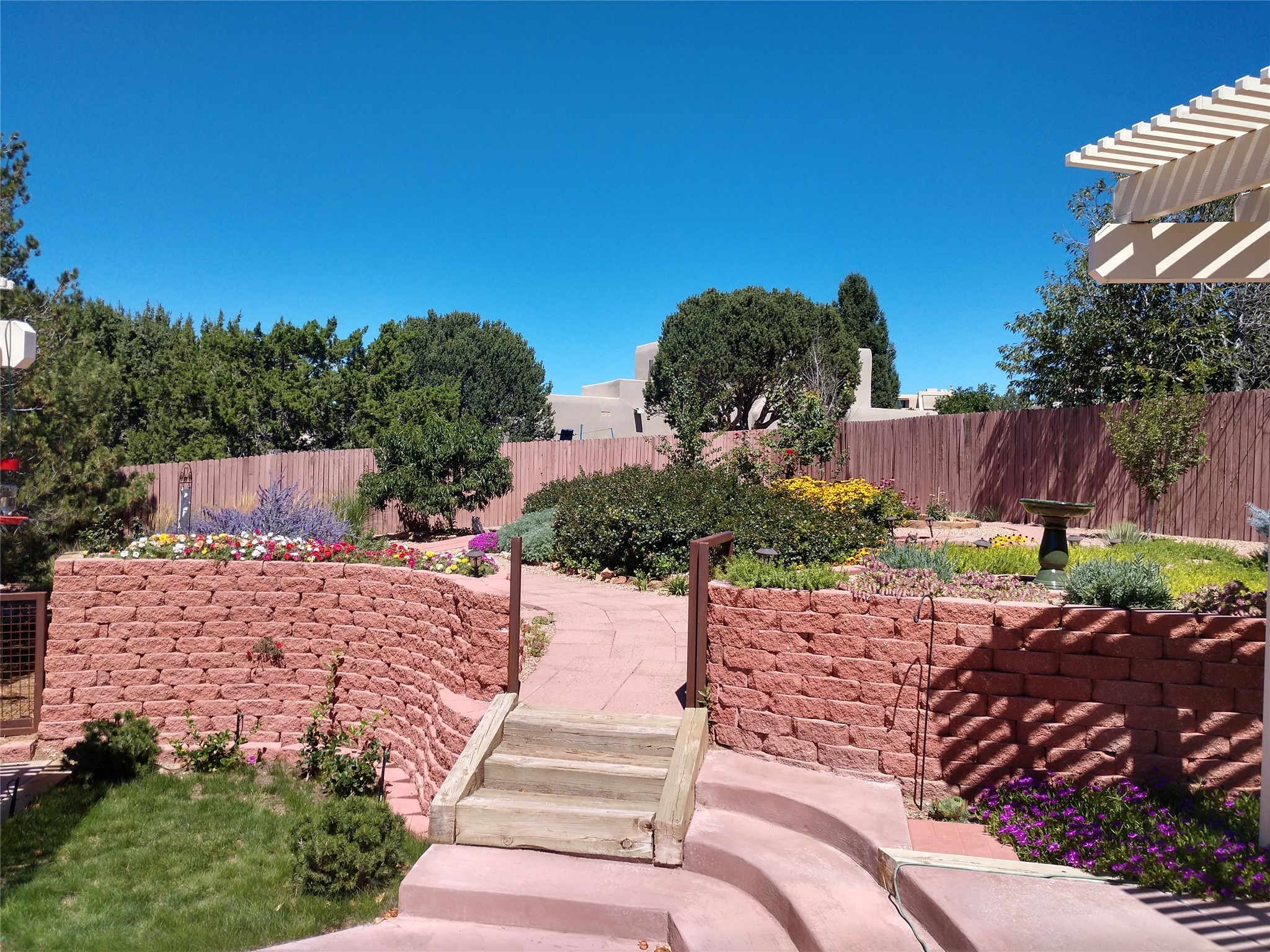 Experience Villa Caballero, a highly sought-after neighborhood known for quiet living, great location, and oversize lots. The area is particularly admired for its marvelous blend of natural beauty and charming residential spaces. One sweet gem is this multi-level home with a flexible floor plan featuring three bedrooms upstairs plus an office/den off the Primary Suite. An optional fourth bedroom is on the main level with access to the backyard pergola offering flexibility in living spaces. All bedrooms are spacious and feature stunning views. This Santa Fe style home is complete with beautiful vigas, nichos, and kiva fireplace on the main floor with plenty of space to entertain. The spacious primary bedroom suite offers a comfortable retreat, including a large bath with jetted tub and a separate office/sitting space and a view deck to enjoy sunsets and mountain views. The separated bedroom plan ensures privacy for everyone in the household and includes an additional view deck. The kitchen is spacious including an island and access to a huge utility/laundry room. A flexible family/dining/tv room with access to the back pergola is just off the kitchen in one direction and the formal dining and living room are off the other direction. This is truly a fabulous home for ease of entertaining. In addition, the views out virtually every window allow enjoyment of the breathtaking scenery and views, and invite you to soak in the surrounding beauty.Speaking of beauty, the lush and mature landscaping of this home boasts wonderful pathways meandering through multiple fruit trees, flowering beds, and shrubs. The thoughtful design creates a serene and inviting atmosphere. To add to the tranquility, there's even a large backyard pergola, perfect for peaceful entertaining and relaxation with wonderful architectural plays of shadow and light.Not only will you feel at peace in this home, but the lush landscaping will also attract birds and bees, creating a haven for wildlife enthusiasts and nature lovers alike. It truly is a wonderful environment to appreciate the harmony of nature and a great place to call home.