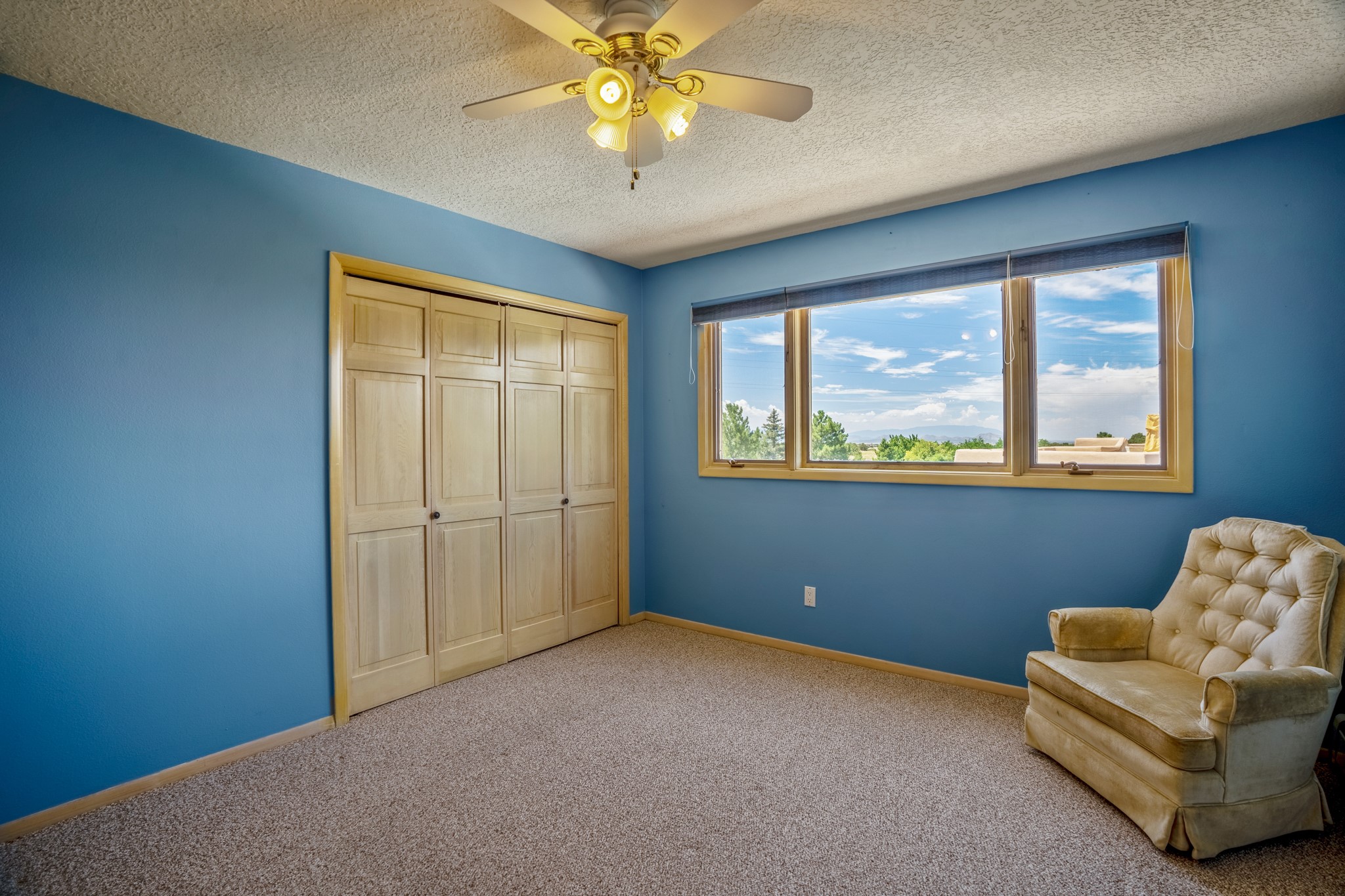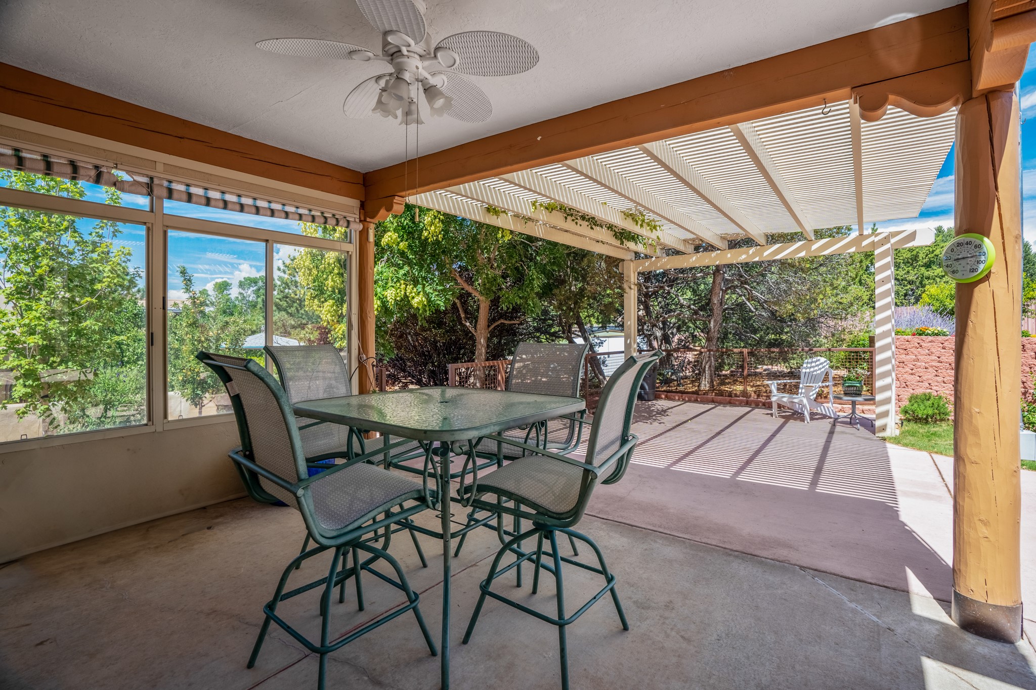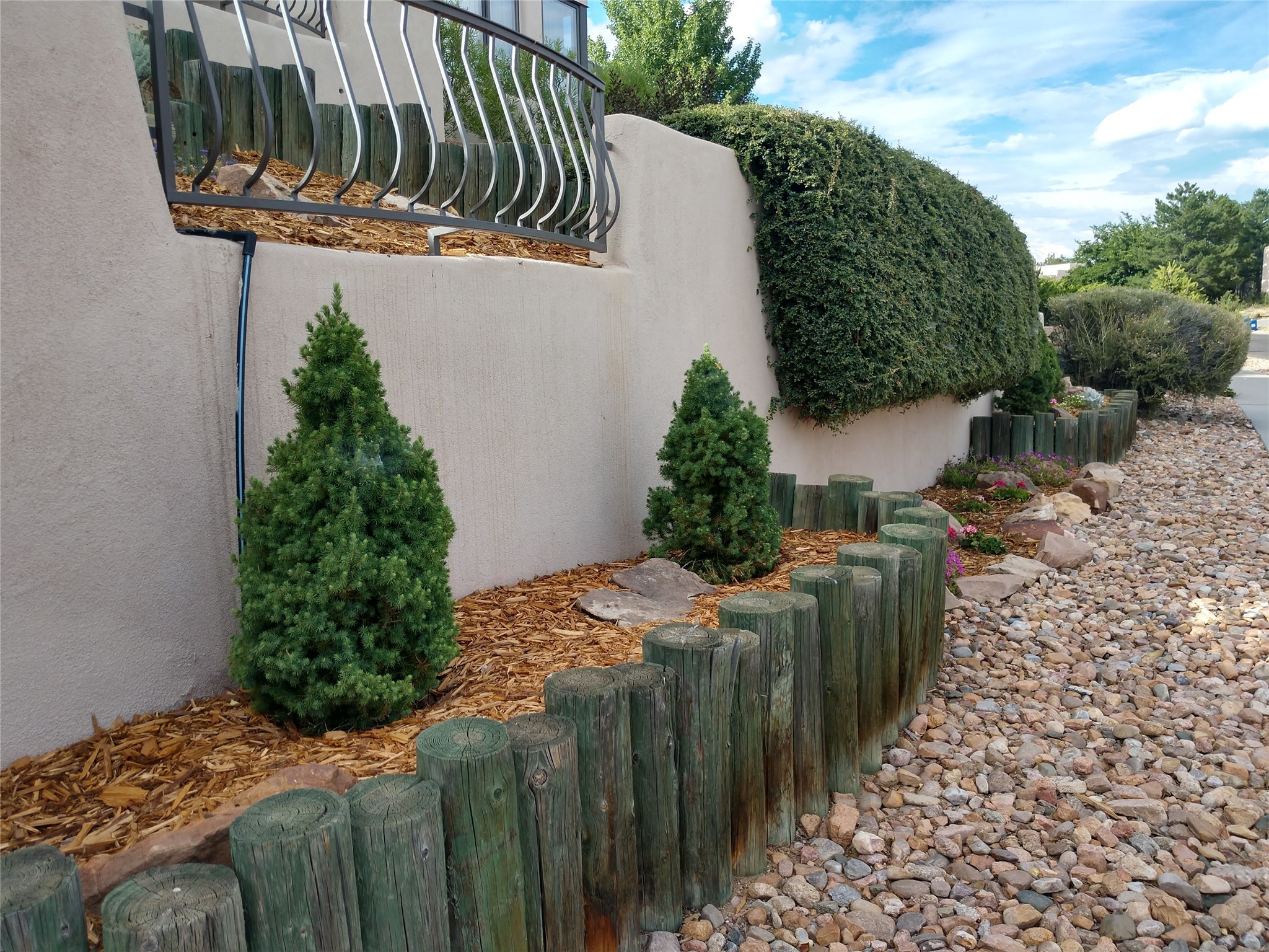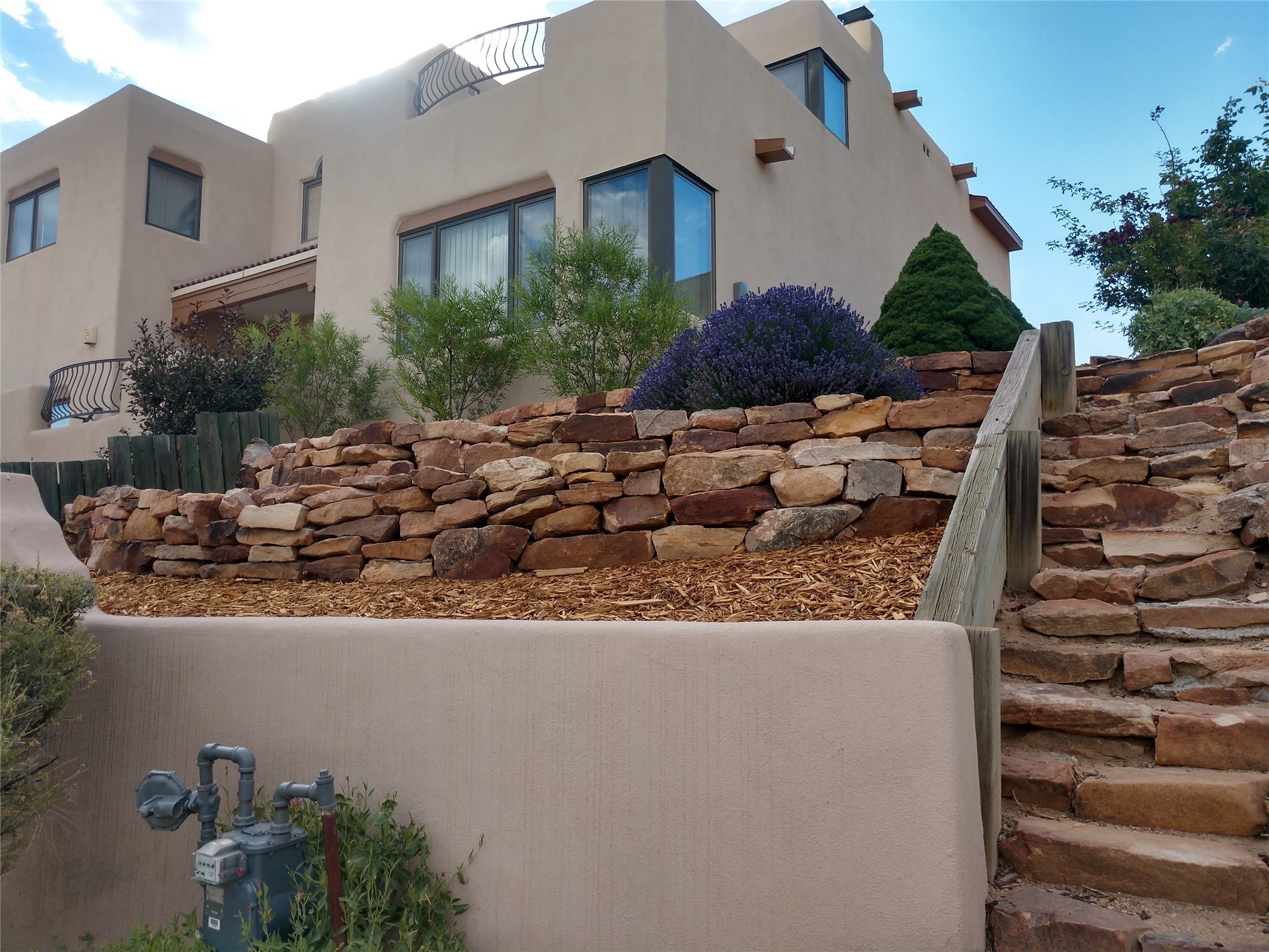 Experience Villa Caballero, a highly sought-after neighborhood known for quiet living, great location, and oversize lots. The area is particularly admired for its marvelous blend of natural beauty and charming residential spaces. One sweet gem is this multi-level home with a flexible floor plan featuring three bedrooms upstairs plus an office/den off the Primary Suite. An optional fourth bedroom is on the main level with access to the backyard pergola offering flexibility in living spaces. All bedrooms are spacious and feature stunning views. This Santa Fe style home is complete with beautiful vigas, nichos, and kiva fireplace on the main floor with plenty of space to entertain. The spacious primary bedroom suite offers a comfortable retreat, including a large bath with jetted tub and a separate office/sitting space and a view deck to enjoy sunsets and mountain views. The separated bedroom plan ensures privacy for everyone in the household and includes an additional view deck. The kitchen is spacious including an island and access to a huge utility/laundry room. A flexible family/dining/tv room with access to the back pergola is just off the kitchen in one direction and the formal dining and living room are off the other direction. This is truly a fabulous home for ease of entertaining. In addition, the views out virtually every window allow enjoyment of the breathtaking scenery and views, and invite you to soak in the surrounding beauty.Speaking of beauty, the lush and mature landscaping of this home boasts wonderful pathways meandering through multiple fruit trees, flowering beds, and shrubs. The thoughtful design creates a serene and inviting atmosphere. To add to the tranquility, there's even a large backyard pergola, perfect for peaceful entertaining and relaxation with wonderful architectural plays of shadow and light.Not only will you feel at peace in this home, but the lush landscaping will also attract birds and bees, creating a haven for wildlife enthusiasts and nature lovers alike. It truly is a wonderful environment to appreciate the harmony of nature and a great place to call home.