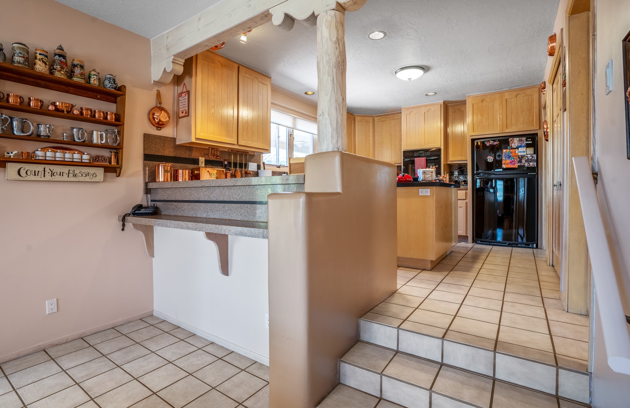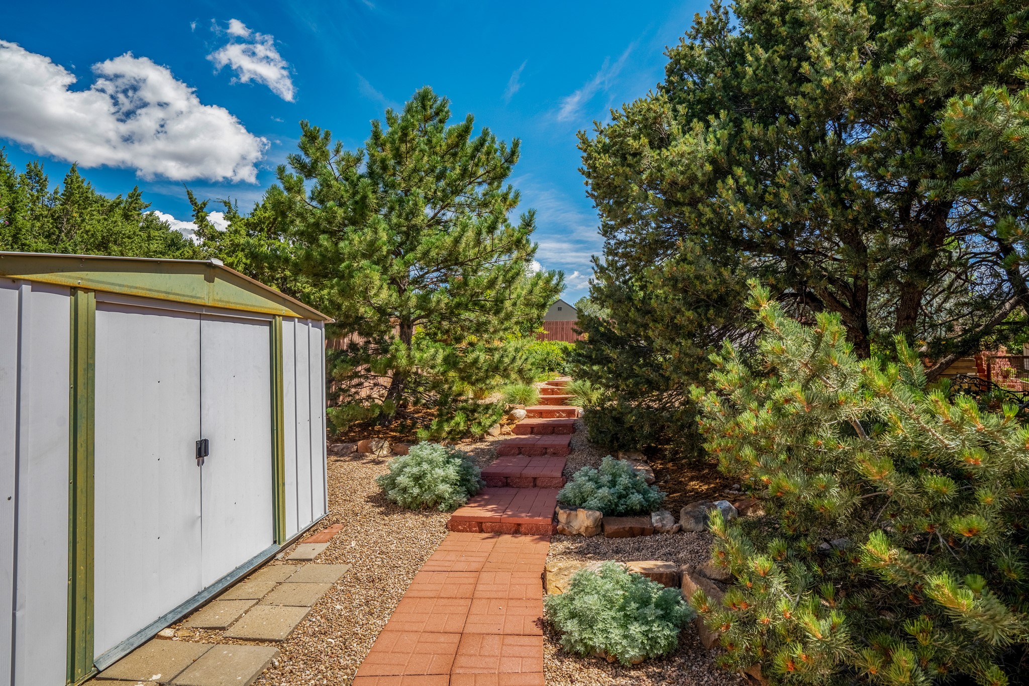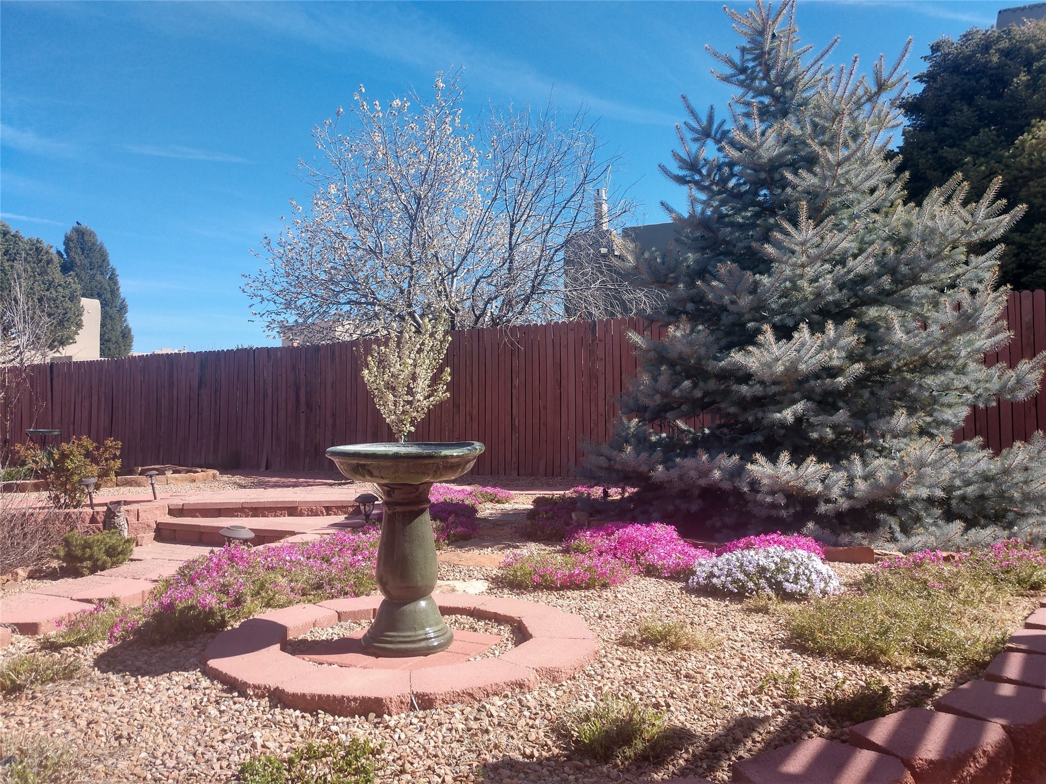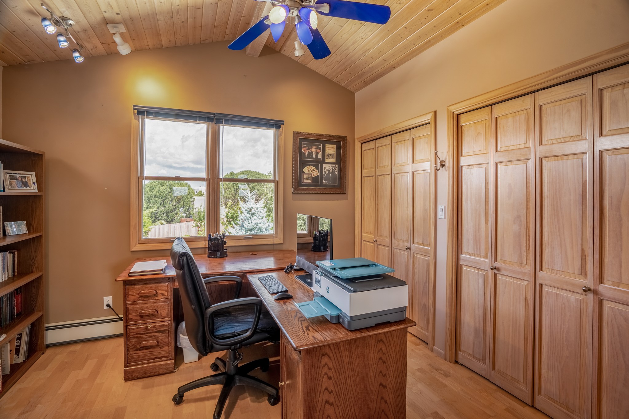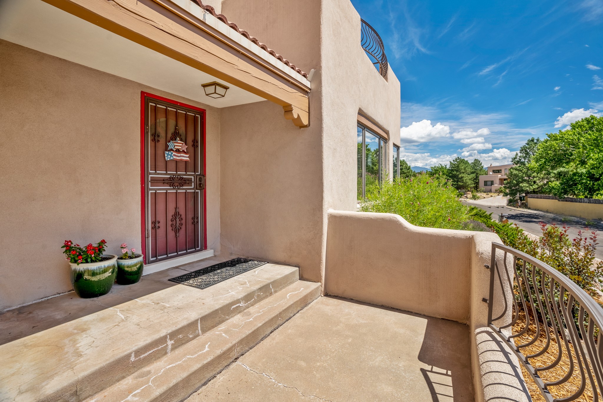 Experience Villa Caballero, a highly sought-after neighborhood known for quiet living, great location, and oversize lots. The area is particularly admired for its marvelous blend of natural beauty and charming residential spaces. One sweet gem is this multi-level home with a flexible floor plan featuring three bedrooms upstairs plus an office/den off the Primary Suite. An optional fourth bedroom is on the main level with access to the backyard pergola offering flexibility in living spaces. All bedrooms are spacious and feature stunning views. This Santa Fe style home is complete with beautiful vigas, nichos, and kiva fireplace on the main floor with plenty of space to entertain. The spacious primary bedroom suite offers a comfortable retreat, including a large bath with jetted tub and a separate office/sitting space and a view deck to enjoy sunsets and mountain views. The separated bedroom plan ensures privacy for everyone in the household and includes an additional view deck. The kitchen is spacious including an island and access to a huge utility/laundry room. A flexible family/dining/tv room with access to the back pergola is just off the kitchen in one direction and the formal dining and living room are off the other direction. This is truly a fabulous home for ease of entertaining. In addition, the views out virtually every window allow enjoyment of the breathtaking scenery and views, and invite you to soak in the surrounding beauty.Speaking of beauty, the lush and mature landscaping of this home boasts wonderful pathways meandering through multiple fruit trees, flowering beds, and shrubs. The thoughtful design creates a serene and inviting atmosphere. To add to the tranquility, there's even a large backyard pergola, perfect for peaceful entertaining and relaxation with wonderful architectural plays of shadow and light.Not only will you feel at peace in this home, but the lush landscaping will also attract birds and bees, creating a haven for wildlife enthusiasts and nature lovers alike. It truly is a wonderful environment to appreciate the harmony of nature and a great place to call home.