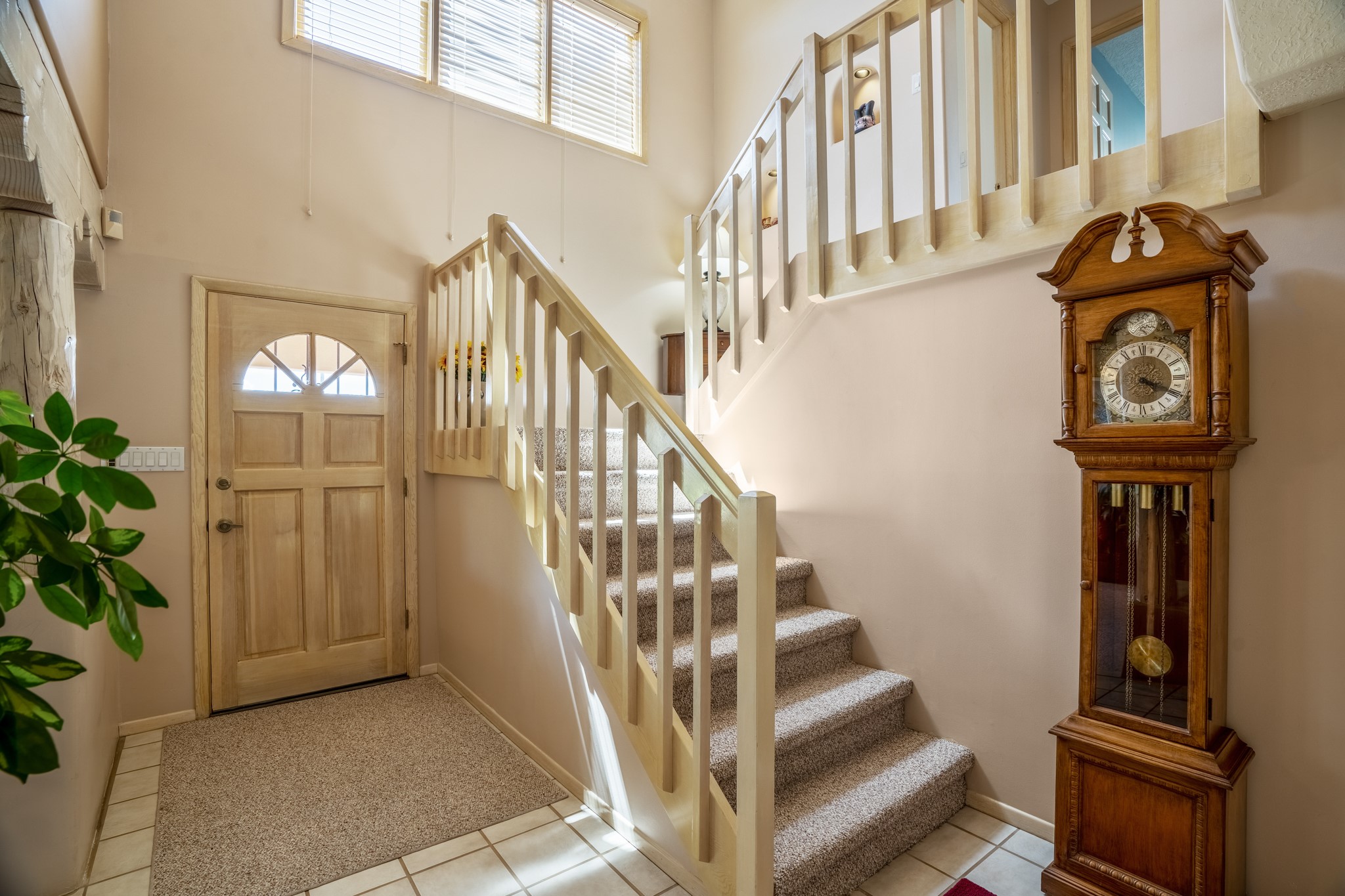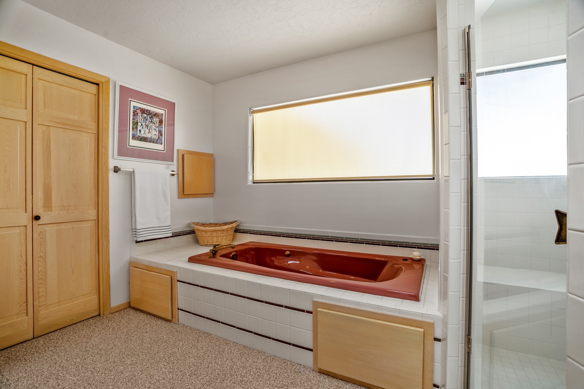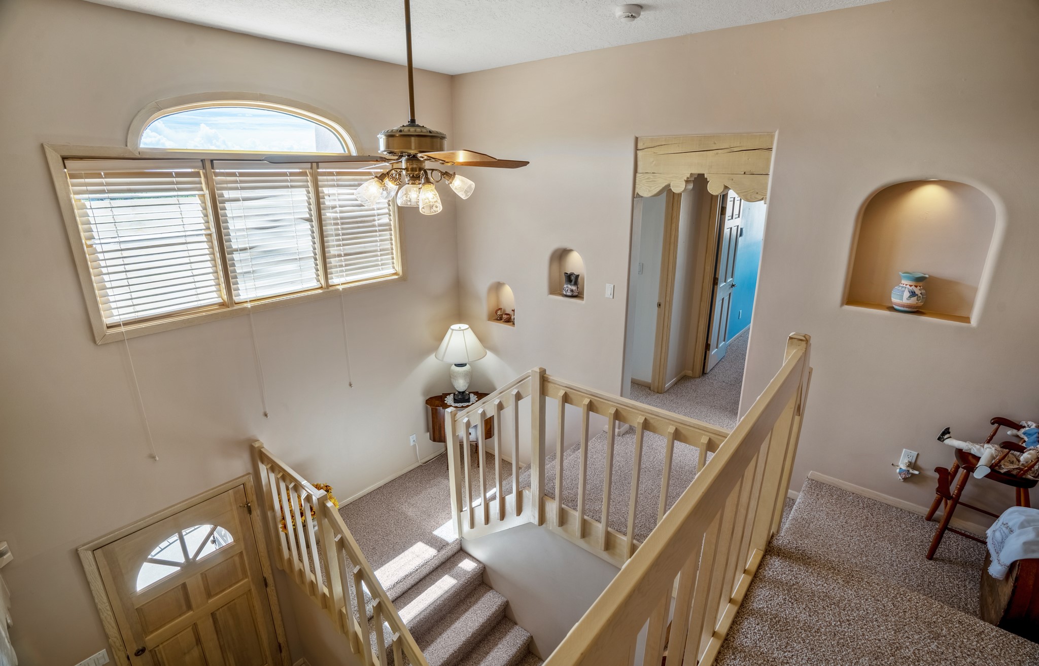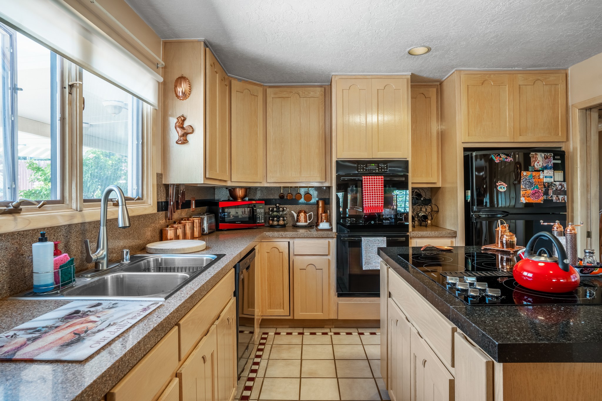 Experience Villa Caballero, a highly sought-after neighborhood known for quiet living, great location, and oversize lots. The area is particularly admired for its marvelous blend of natural beauty and charming residential spaces. One sweet gem is this multi-level home with a flexible floor plan featuring three bedrooms upstairs plus an office/den off the Primary Suite. An optional fourth bedroom is on the main level with access to the backyard pergola offering flexibility in living spaces. All bedrooms are spacious and feature stunning views. This Santa Fe style home is complete with beautiful vigas, nichos, and kiva fireplace on the main floor with plenty of space to entertain. The spacious primary bedroom suite offers a comfortable retreat, including a large bath with jetted tub and a separate office/sitting space and a view deck to enjoy sunsets and mountain views. The separated bedroom plan ensures privacy for everyone in the household and includes an additional view deck. The kitchen is spacious including an island and access to a huge utility/laundry room. A flexible family/dining/tv room with access to the back pergola is just off the kitchen in one direction and the formal dining and living room are off the other direction. This is truly a fabulous home for ease of entertaining. In addition, the views out virtually every window allow enjoyment of the breathtaking scenery and views, and invite you to soak in the surrounding beauty.Speaking of beauty, the lush and mature landscaping of this home boasts wonderful pathways meandering through multiple fruit trees, flowering beds, and shrubs. The thoughtful design creates a serene and inviting atmosphere. To add to the tranquility, there's even a large backyard pergola, perfect for peaceful entertaining and relaxation with wonderful architectural plays of shadow and light.Not only will you feel at peace in this home, but the lush landscaping will also attract birds and bees, creating a haven for wildlife enthusiasts and nature lovers alike. It truly is a wonderful environment to appreciate the harmony of nature and a great place to call home.