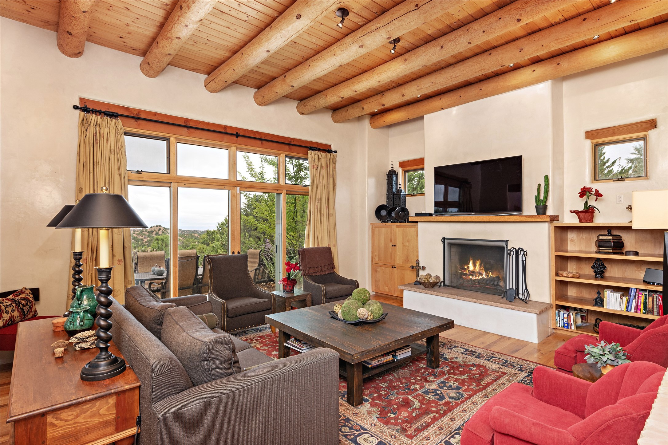 Timeless Santa Fe design, in this Bishop's Lodge Villa, which is currently the only one on the market. Numerous possibilities -full time residence, 2nd home, or vacation rental opportunities. As you walk up to the Villa, from the private gated parking area, you will notice the rolling hills to the east and west. Custom front gate leads to the wrap around coyote fenced courtyards. Spacious outdoor areas with flagstone patios. Oversized front door with grand entry. Living room features include large fireplace with flagstone hearth, built-in custom bookshelves and cabinets, as well as sliding doors that lead to an outdoor patio. Generous U-shaped kitchen with pantry, storage and bar counter seating, ideal for entertaining. Kitchen opens to expansive dining area, with beautiful natural light throughout. Two of the bedroom suites have a kiva fireplace. All 3 bedrooms have private bathrooms and separate outdoor patios. One ensuite has a steam shower and jetted tub. Traditional Santa Fe architectural elements throughout. High ceilings including tongue/groove with beams, corbels, plaster walls, wood & tile flooring, granite countertops, custom doors, and beam trimmed windows. Serene mountain views & lush natural landscaping. Within the cluster of villas is also a private pool. A pristine & charming neighborhood just north of downtown Santa Fe. This very private property, in beautiful Santa Fe is sure to not disappoint. Owners attentiveness to detail has this Villa move-in ready!