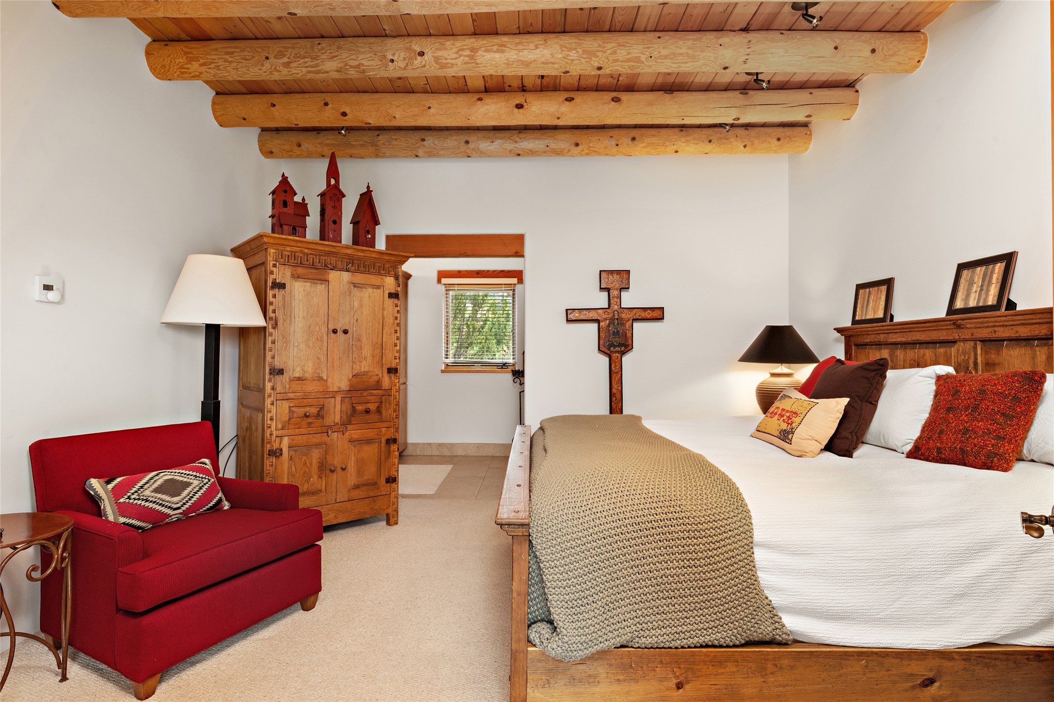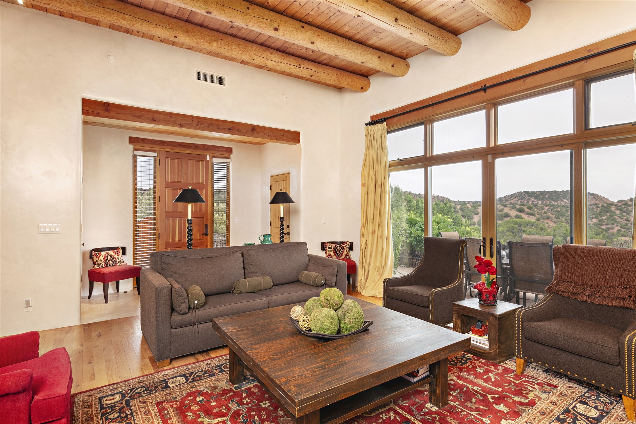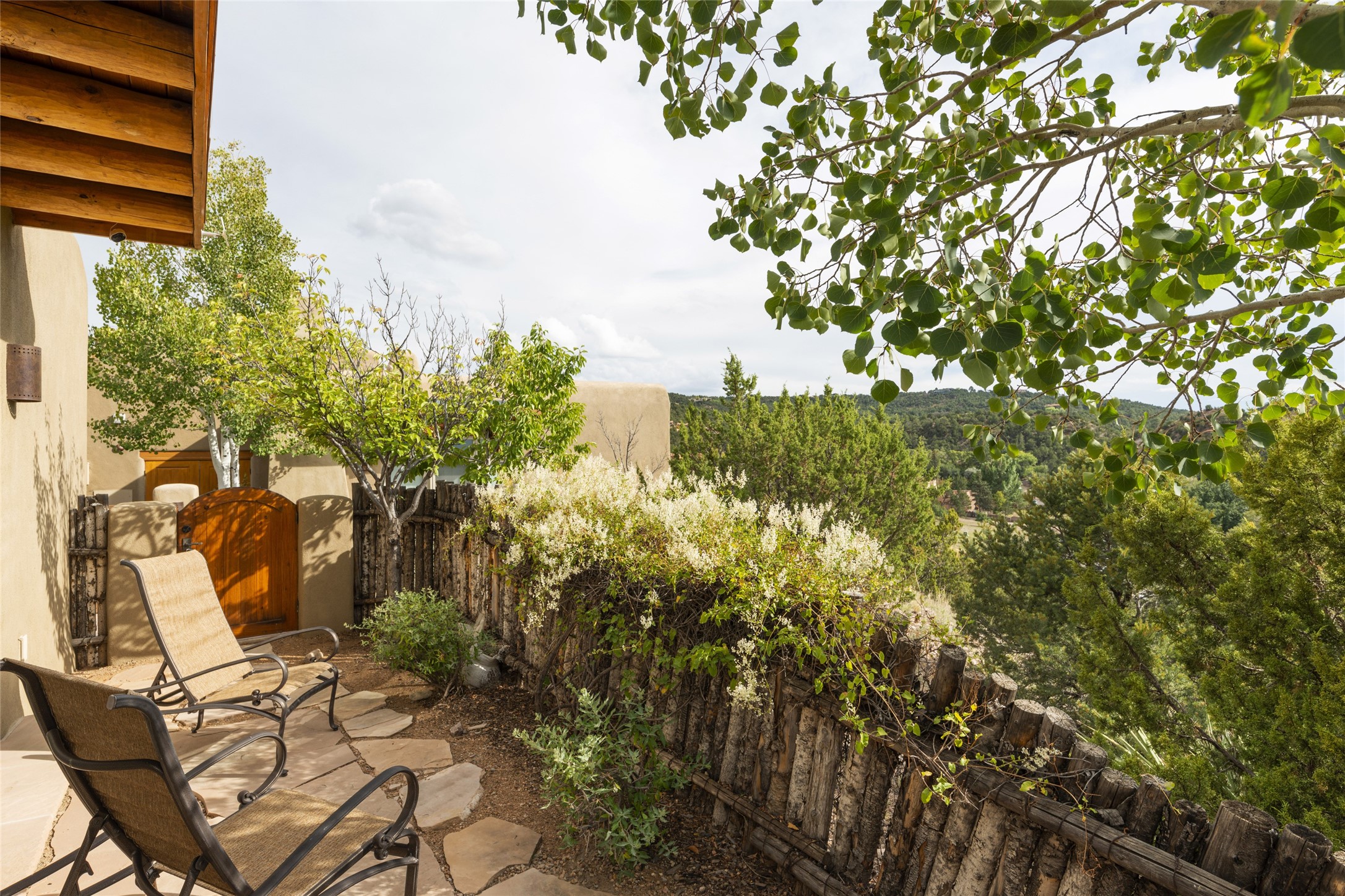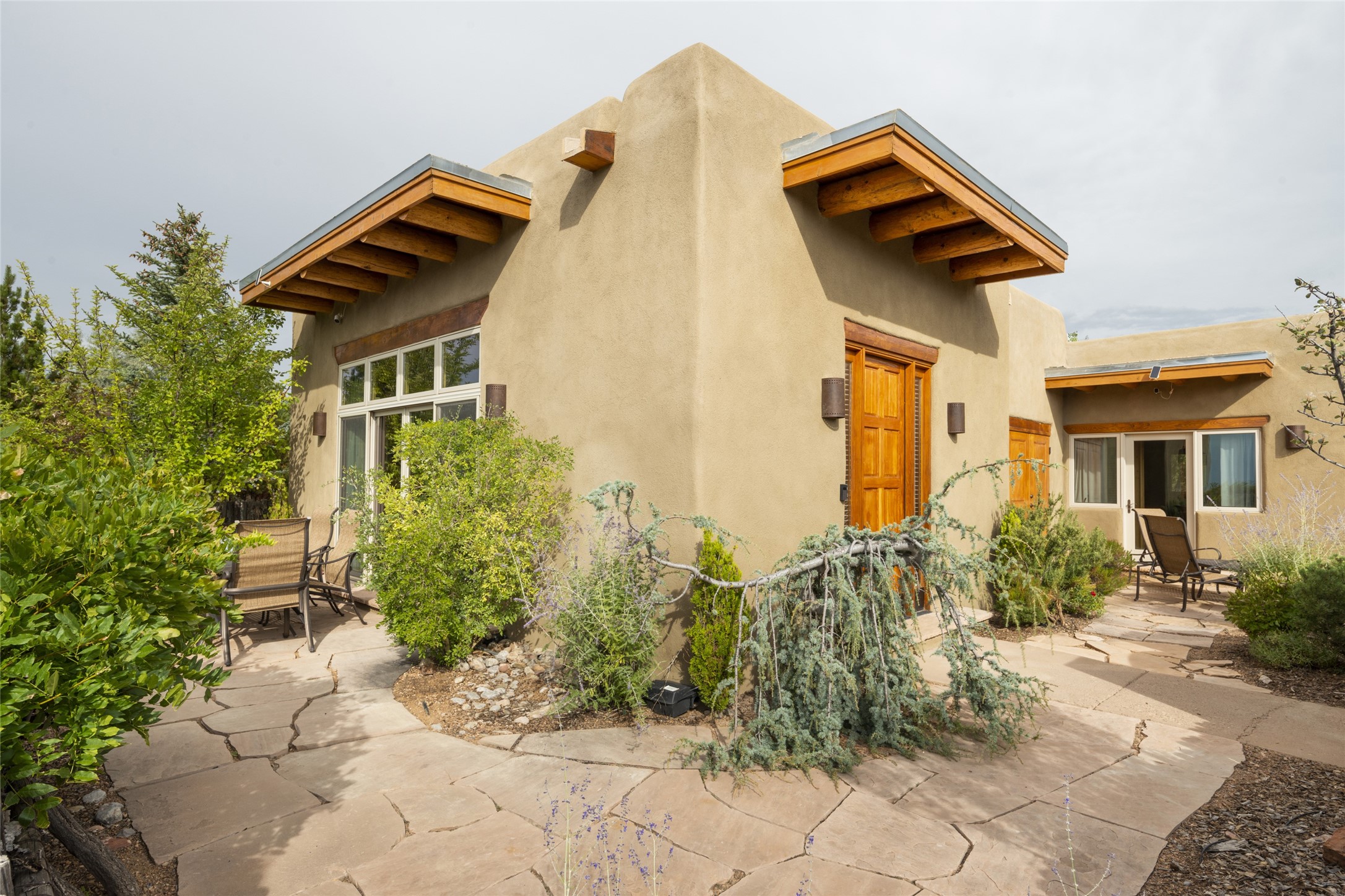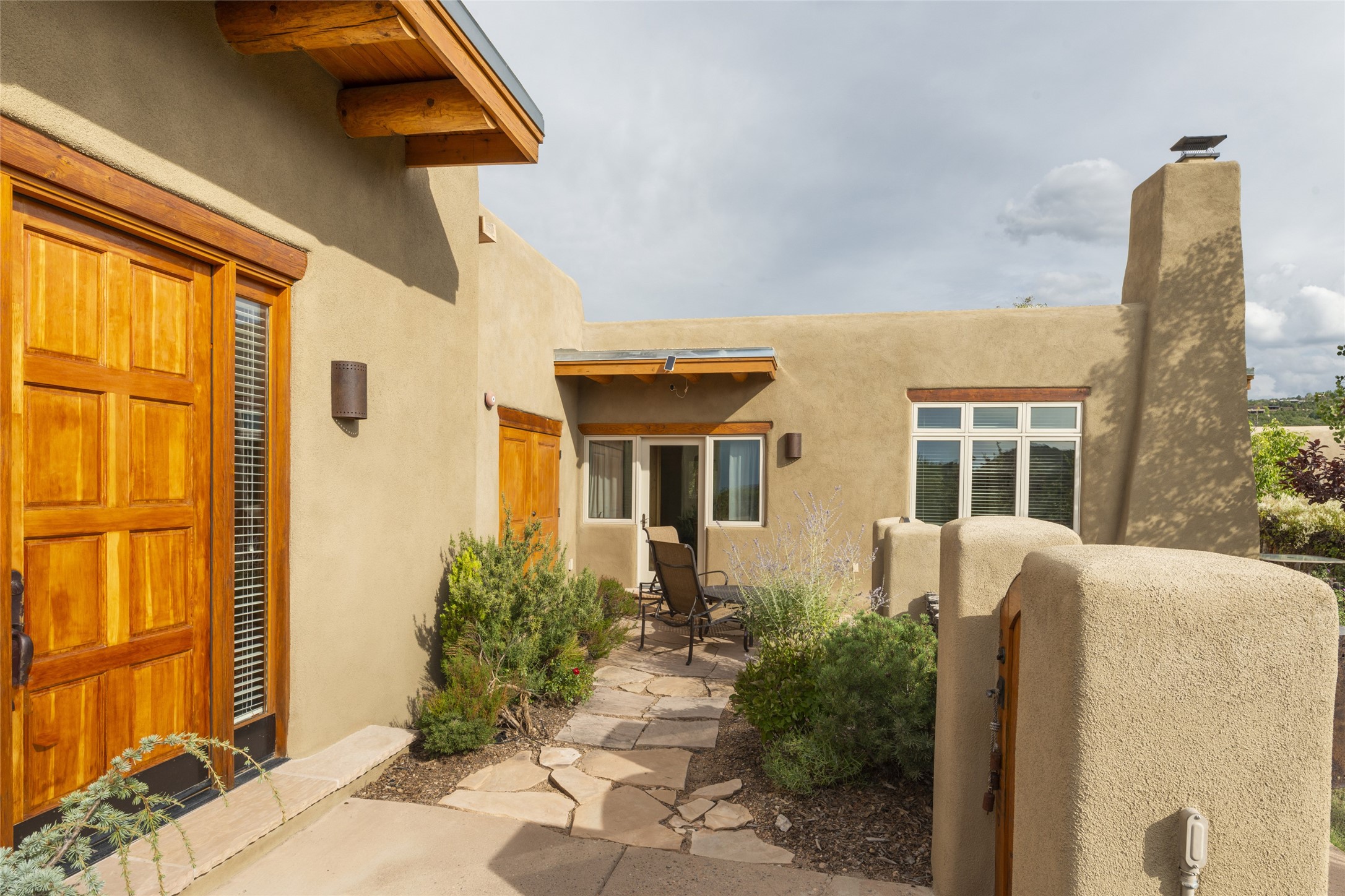 Timeless Santa Fe design, in this Bishop's Lodge Villa, which is currently the only one on the market. Numerous possibilities -full time residence, 2nd home, or vacation rental opportunities. As you walk up to the Villa, from the private gated parking area, you will notice the rolling hills to the east and west. Custom front gate leads to the wrap around coyote fenced courtyards. Spacious outdoor areas with flagstone patios. Oversized front door with grand entry. Living room features include large fireplace with flagstone hearth, built-in custom bookshelves and cabinets, as well as sliding doors that lead to an outdoor patio. Generous U-shaped kitchen with pantry, storage and bar counter seating, ideal for entertaining. Kitchen opens to expansive dining area, with beautiful natural light throughout. Two of the bedroom suites have a kiva fireplace. All 3 bedrooms have private bathrooms and separate outdoor patios. One ensuite has a steam shower and jetted tub. Traditional Santa Fe architectural elements throughout. High ceilings including tongue/groove with beams, corbels, plaster walls, wood & tile flooring, granite countertops, custom doors, and beam trimmed windows. Serene mountain views & lush natural landscaping. Within the cluster of villas is also a private pool. A pristine & charming neighborhood just north of downtown Santa Fe. This very private property, in beautiful Santa Fe is sure to not disappoint. Owners attentiveness to detail has this Villa move-in ready!