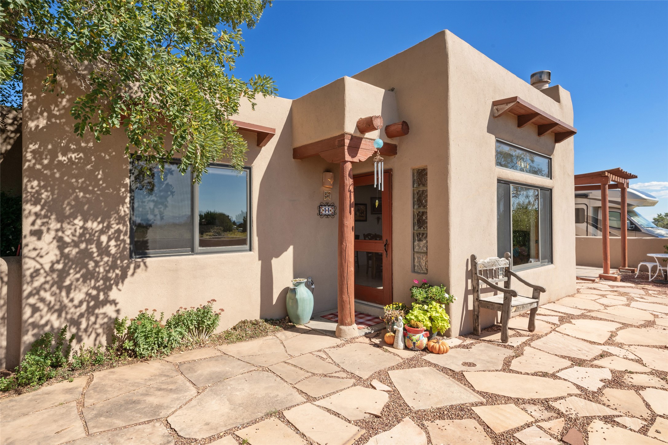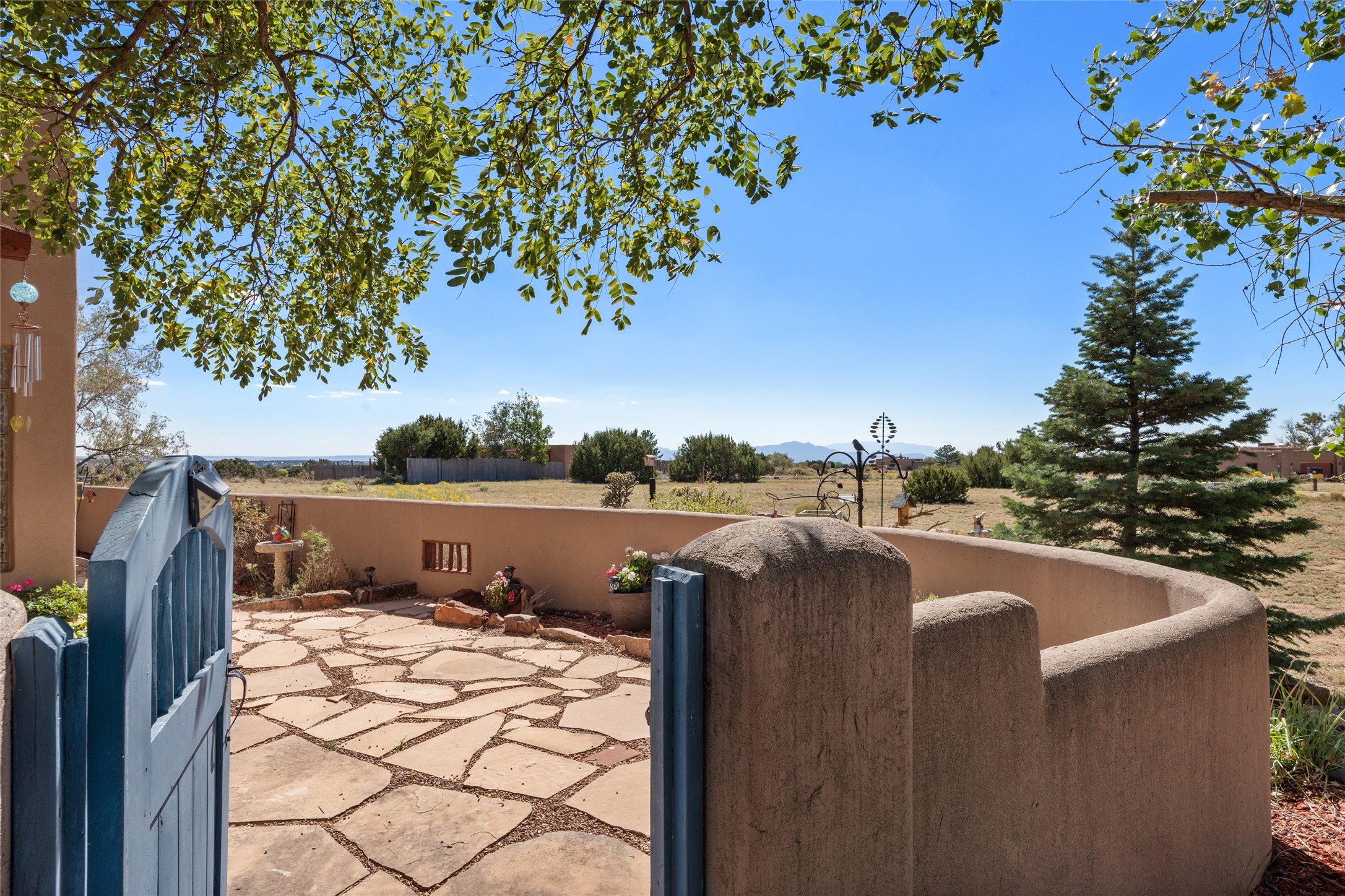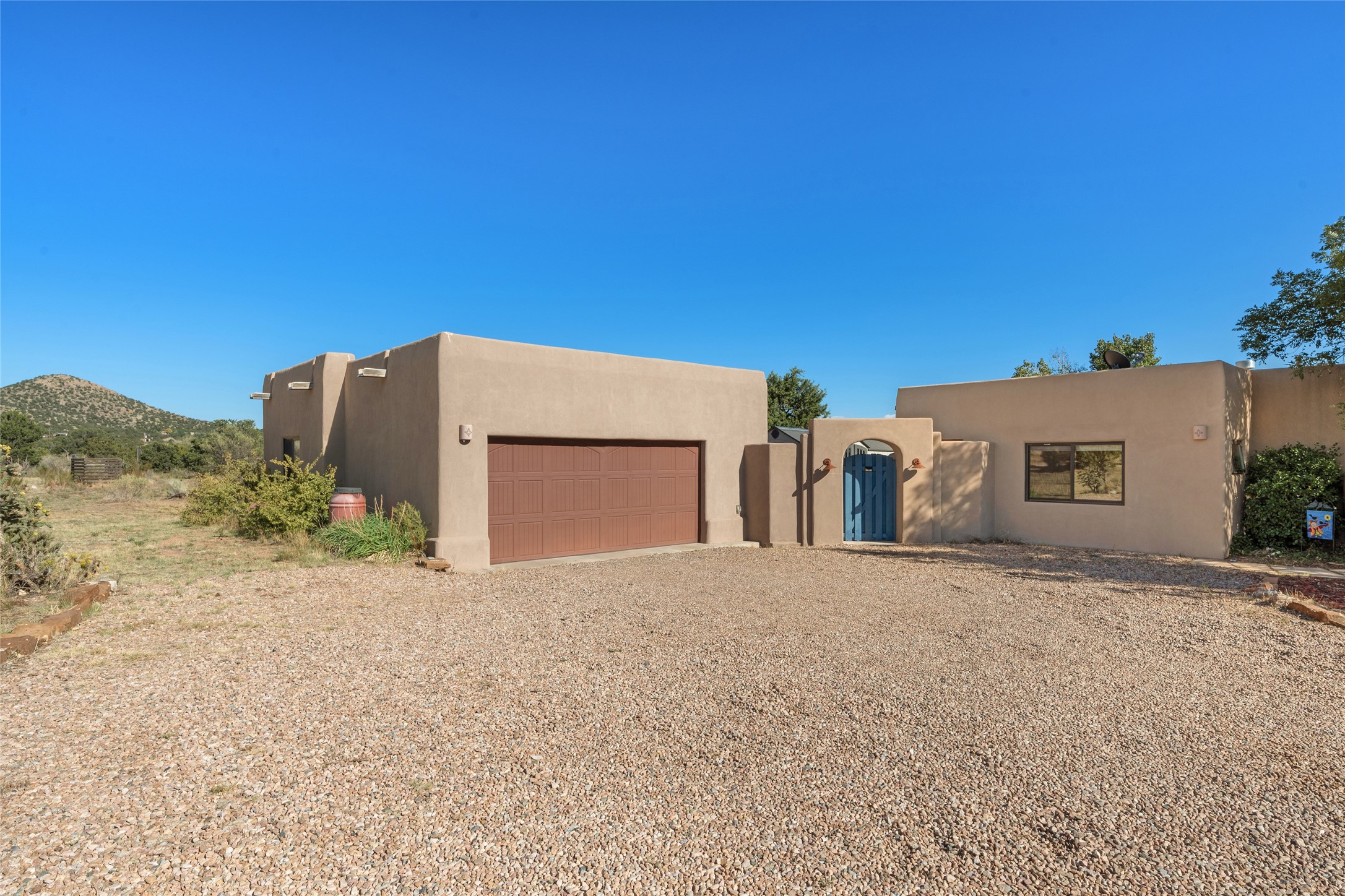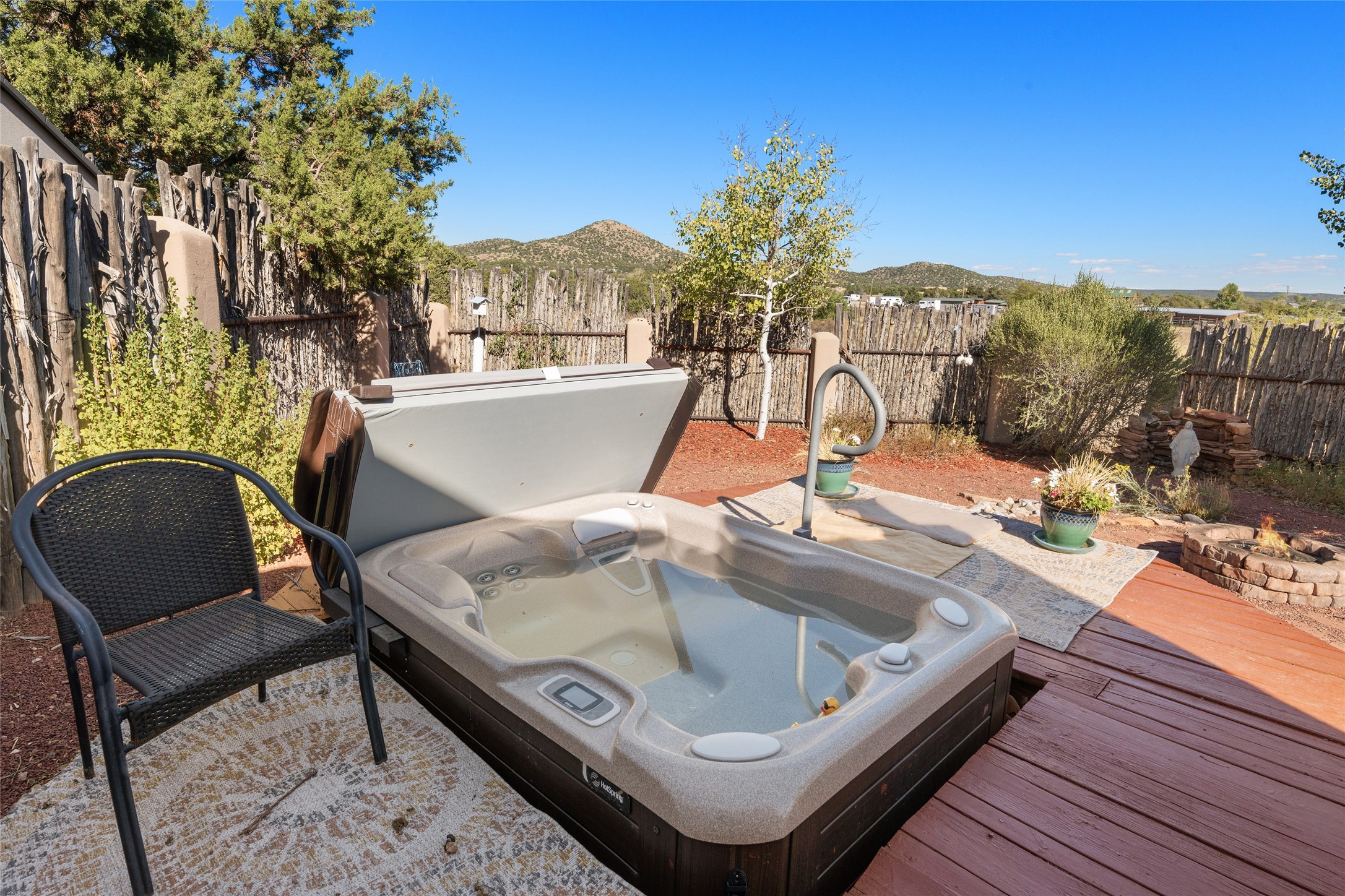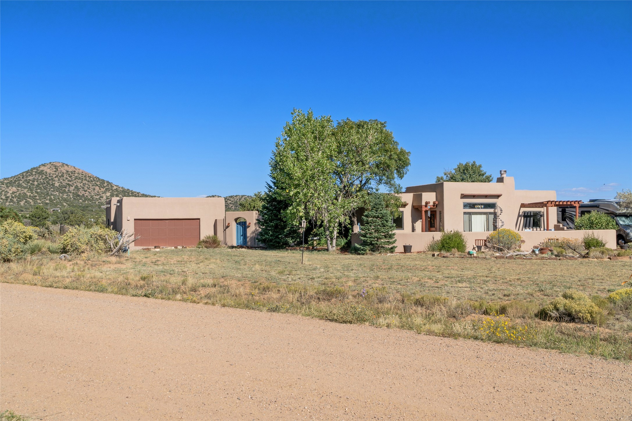 Beautiful Eldorado home where you can stargaze from the hot tub, park your RV and listen to the quaking of the happy Aspen trees. Plaster finish in most of the house with nichos. Kitchen has double ovens, convection microwave, large deep sink, pantry and extra work area. In-floor, natural gas radiant heat tubing is Pex - photo in supplements - domestic supply is copper. Oversized and heated 800+ square-foot 2-car garage. There are two kiva fireplaces, one in the dining room and one in the living room which have electric inserts which can be easily removed to make them woodburning. Walled front courtyard and fully fenced backyard both on drip irrigation. New boiler in January 2023, all stainless kitchen appliances are less than 4 years old. Recent roof maintenance. Water heater new in 2018. Hot tub has new top Sept. 2023. Media room could be third bedroom. One step down into mudroom. ECIA approved RV parking with cover to match stucco. New shed. Mountain and Galisteo Basin views. Rain barrels, extra fridge in mudroom, outdoor heater on back patio and all garage shelving convey with the property. NO KITEC, NO CARPET. Lot corners are flagged. Close to shopping and easy access to I25. Seller may need leaseback for up to 90 days.