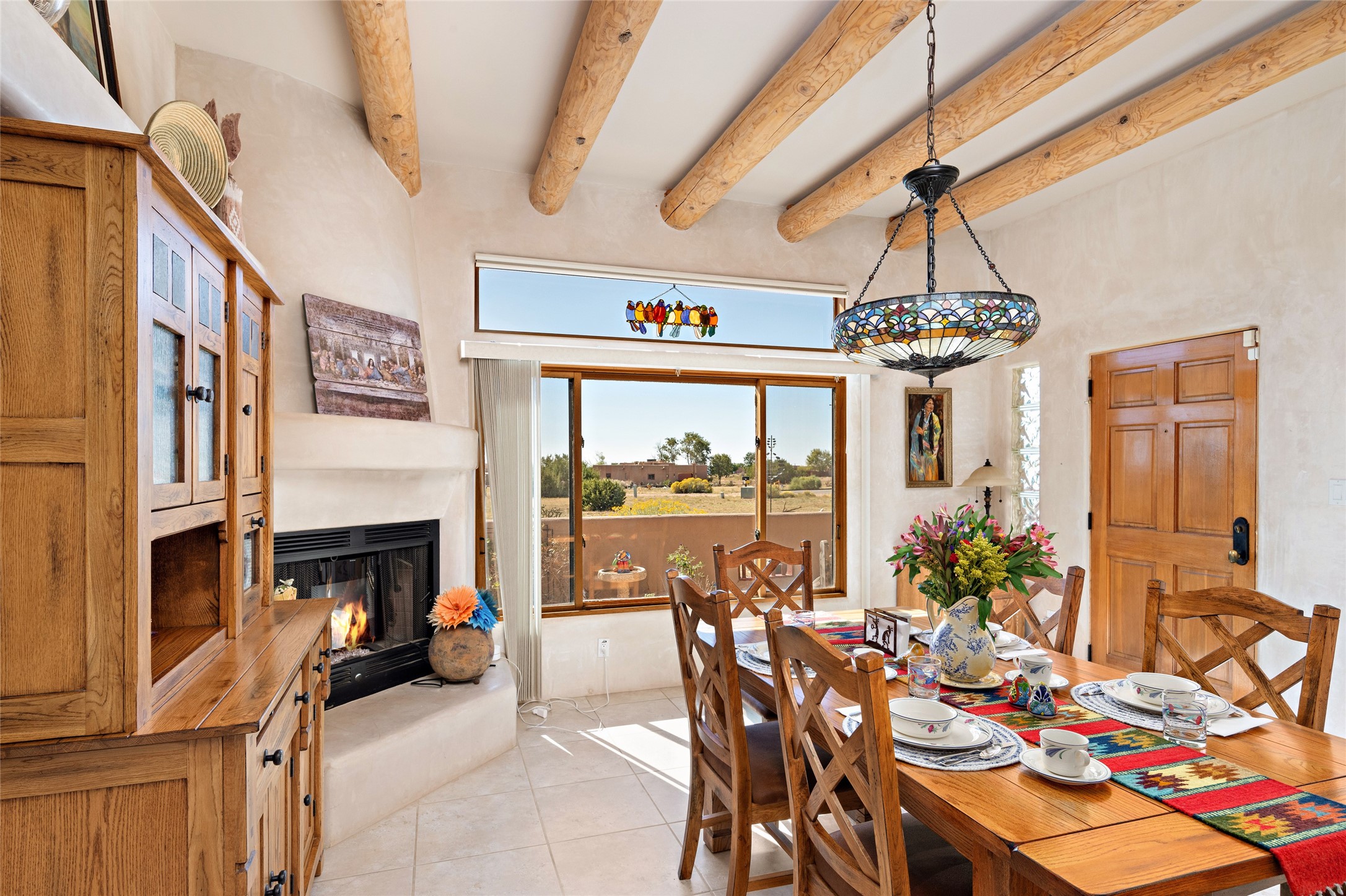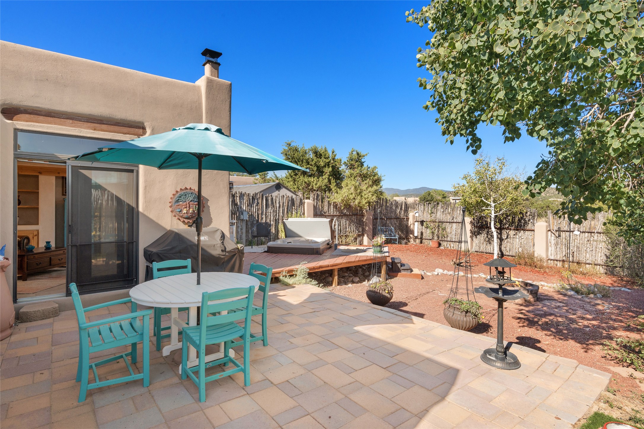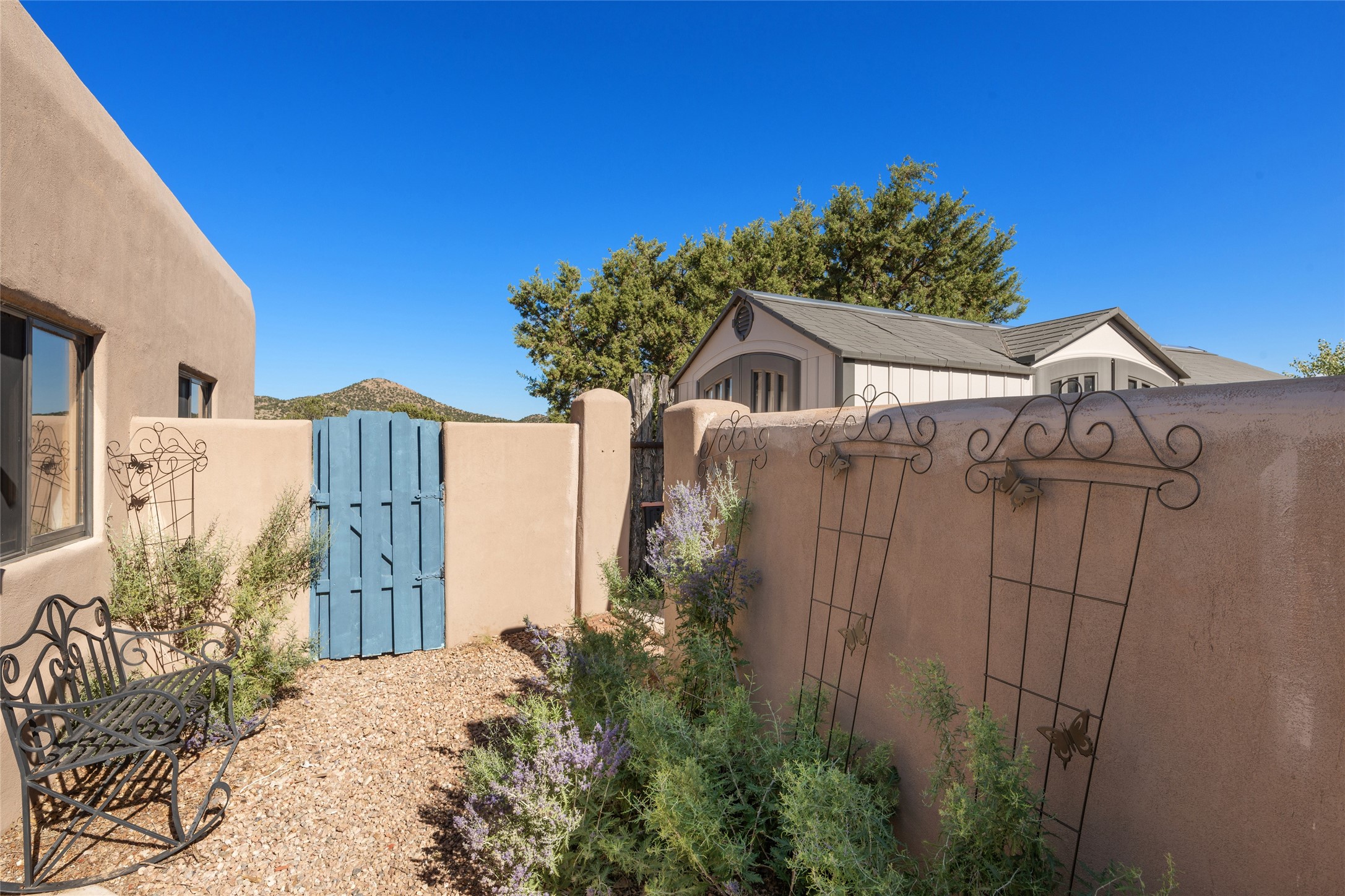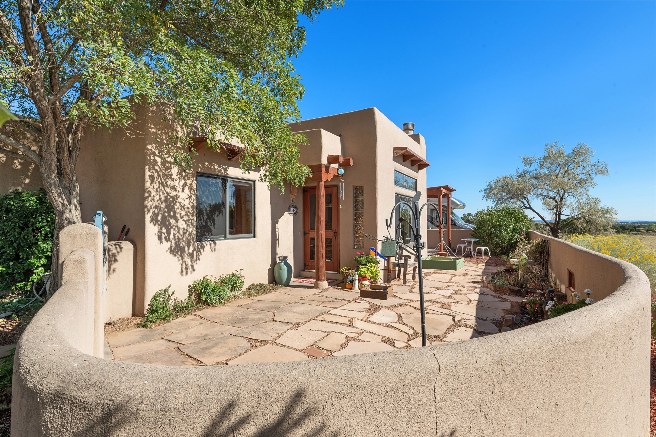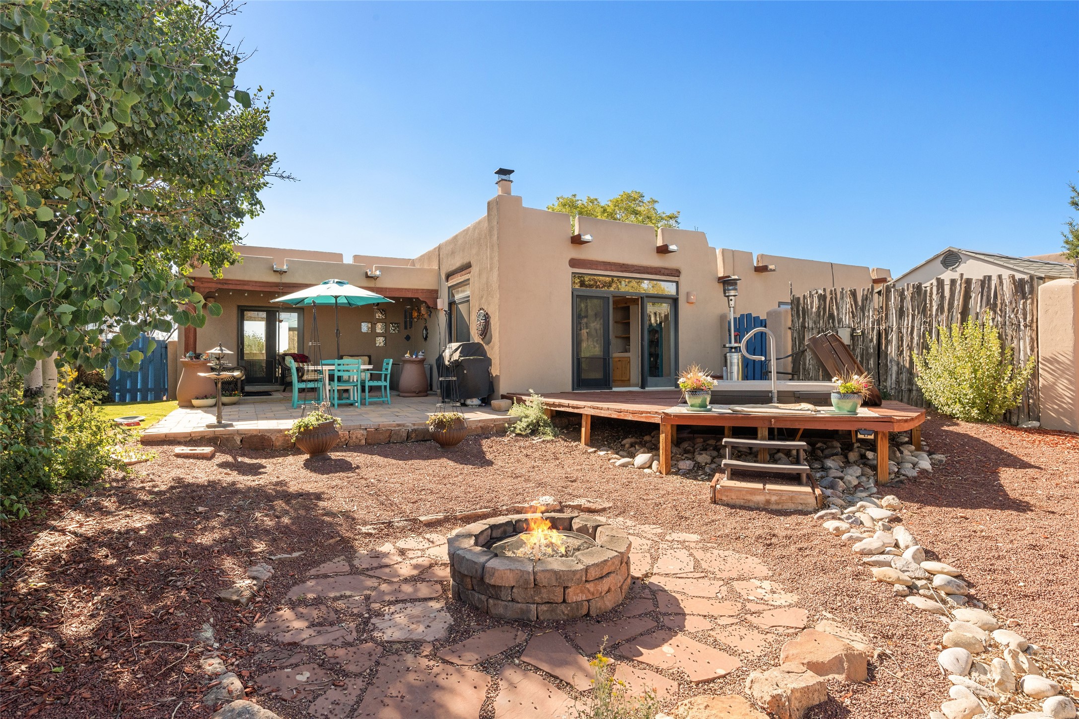 Beautiful Eldorado home where you can stargaze from the hot tub, park your RV and listen to the quaking of the happy Aspen trees. Plaster finish in most of the house with nichos. Kitchen has double ovens, convection microwave, large deep sink, pantry and extra work area. In-floor, natural gas radiant heat tubing is Pex - photo in supplements - domestic supply is copper. Oversized and heated 800+ square-foot 2-car garage. There are two kiva fireplaces, one in the dining room and one in the living room which have electric inserts which can be easily removed to make them woodburning. Walled front courtyard and fully fenced backyard both on drip irrigation. New boiler in January 2023, all stainless kitchen appliances are less than 4 years old. Recent roof maintenance. Water heater new in 2018. Hot tub has new top Sept. 2023. Media room could be third bedroom. One step down into mudroom. ECIA approved RV parking with cover to match stucco. New shed. Mountain and Galisteo Basin views. Rain barrels, extra fridge in mudroom, outdoor heater on back patio and all garage shelving convey with the property. NO KITEC, NO CARPET. Lot corners are flagged. Close to shopping and easy access to I25. Seller may need leaseback for up to 90 days.