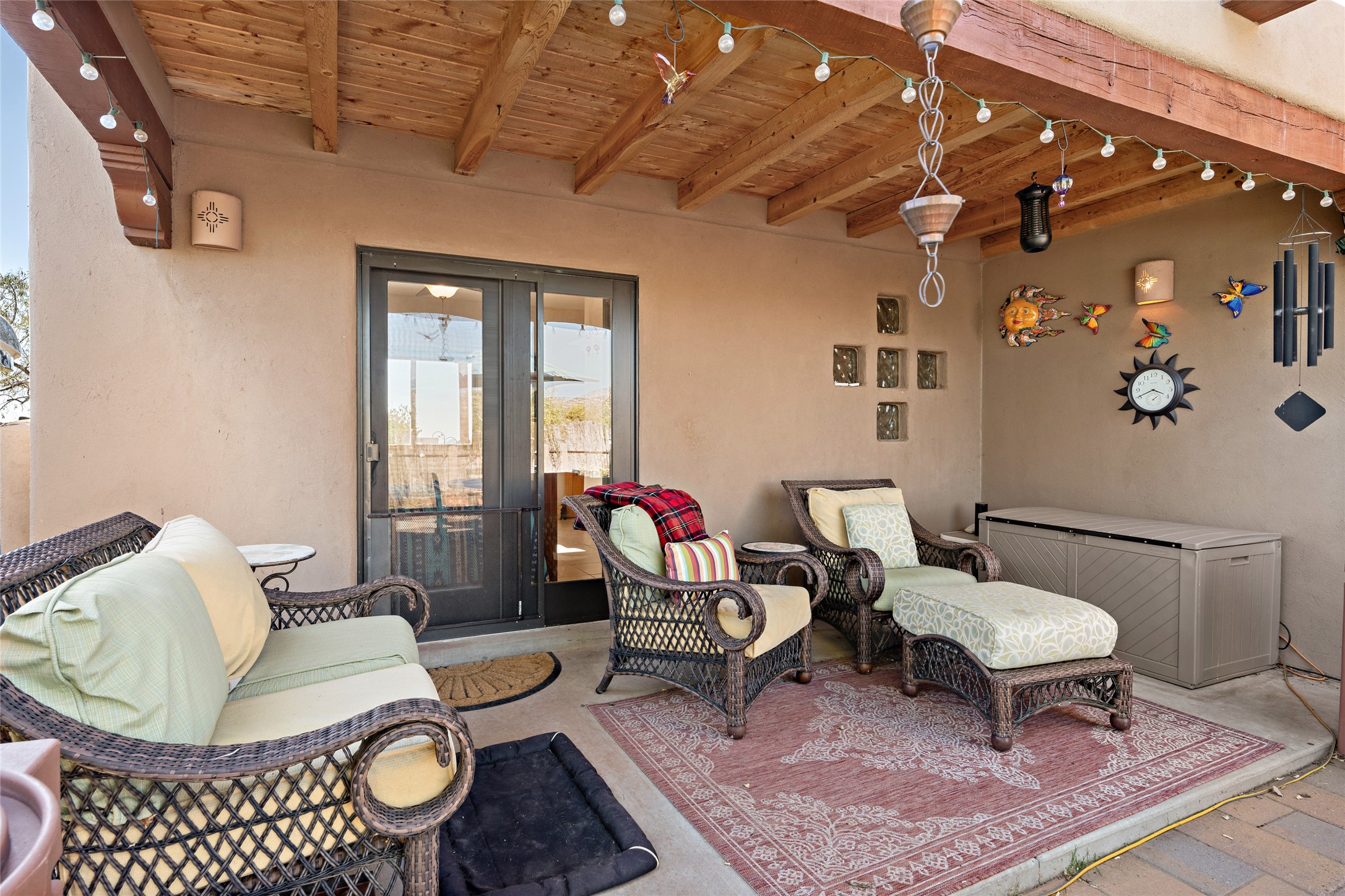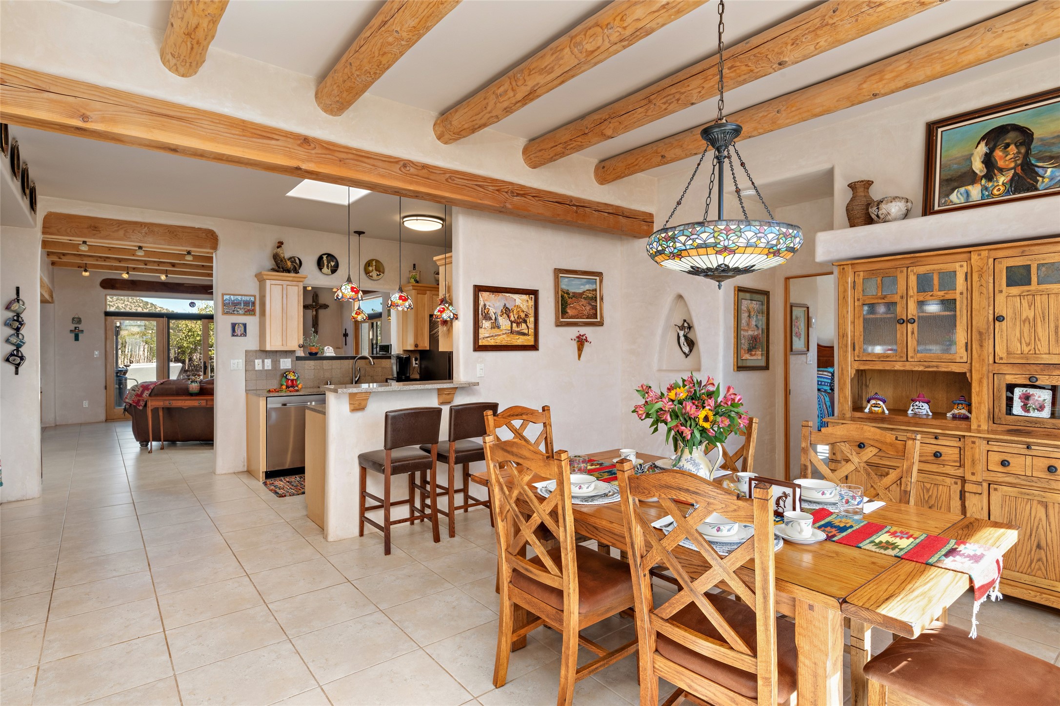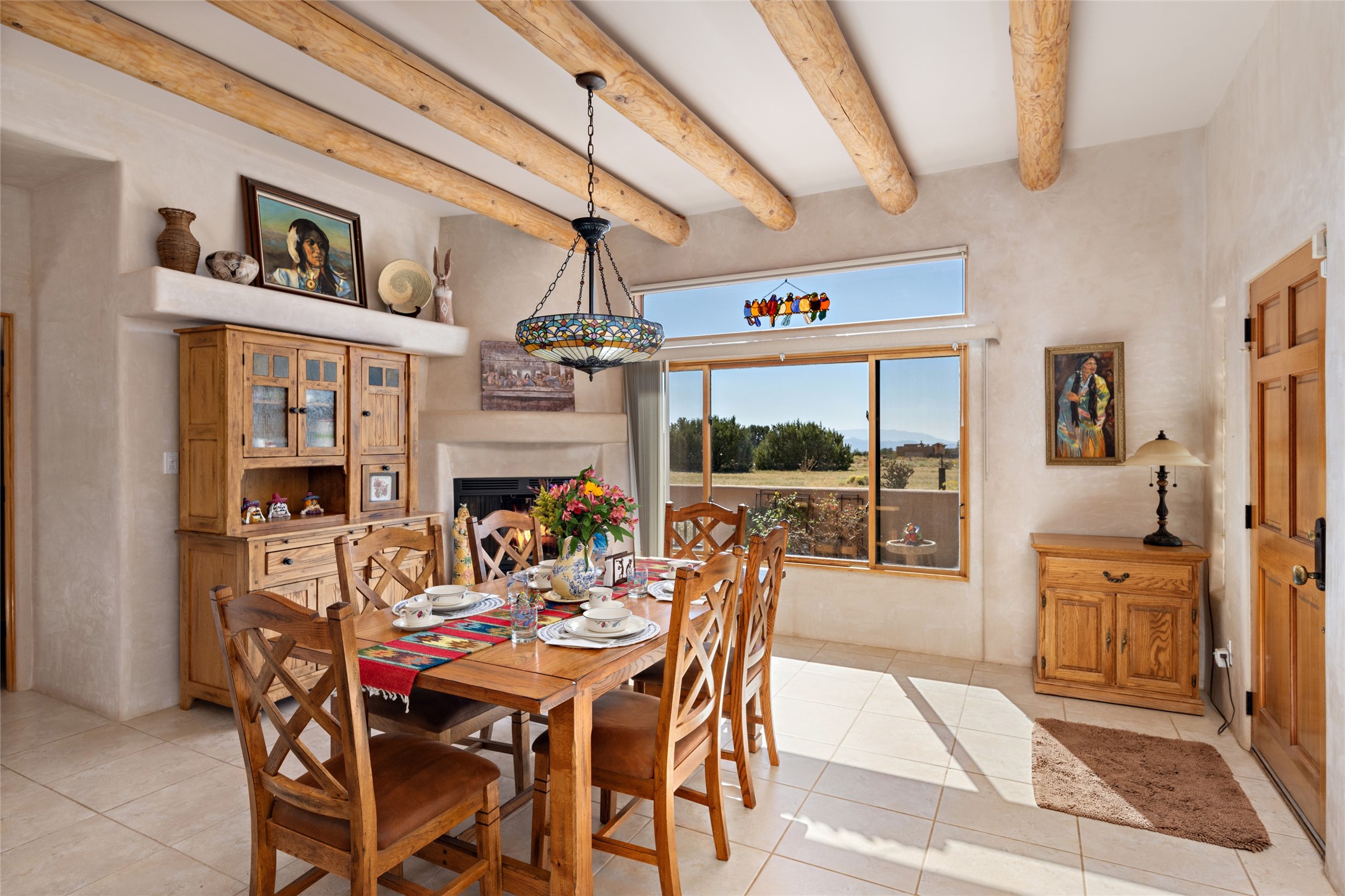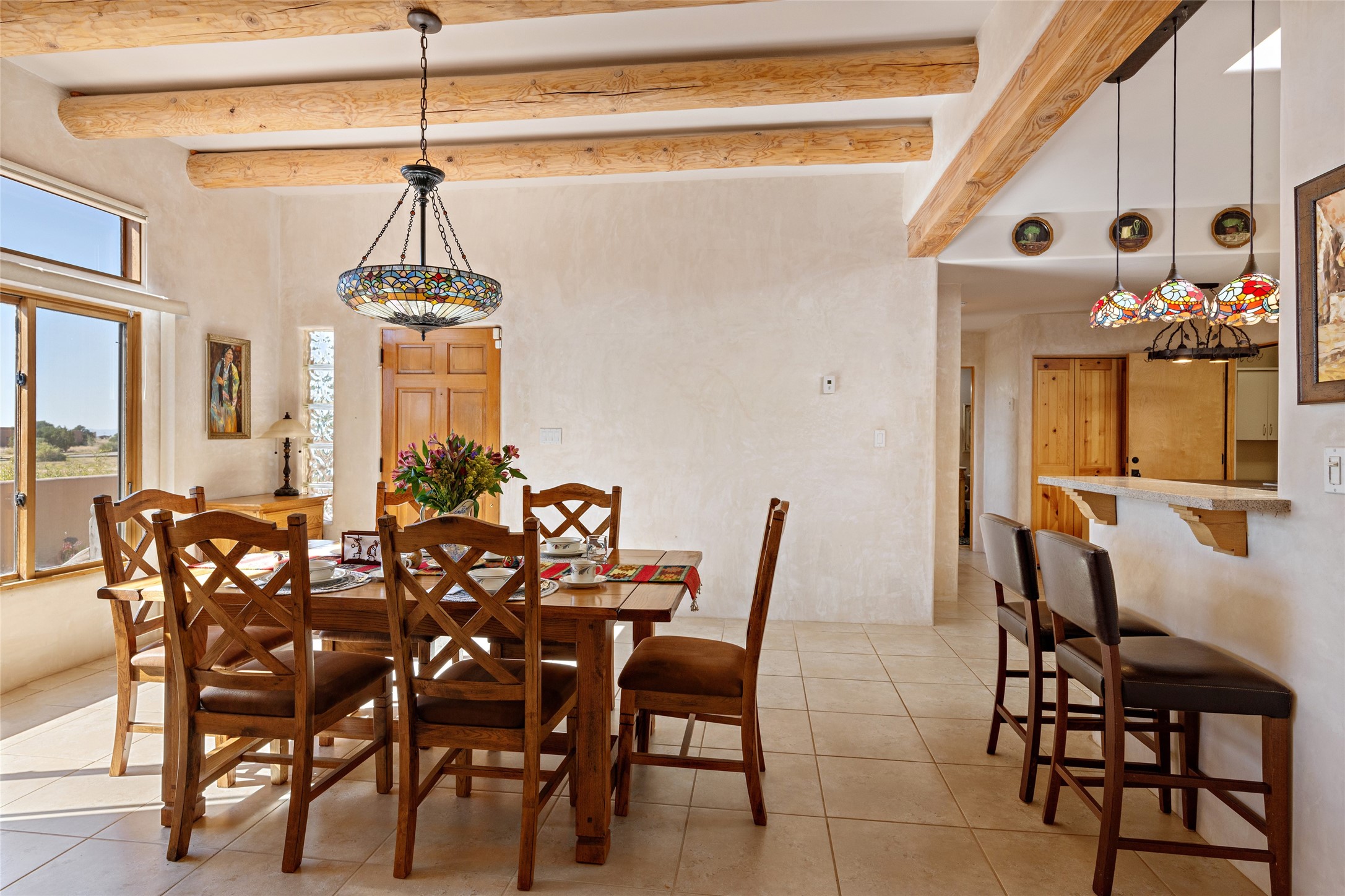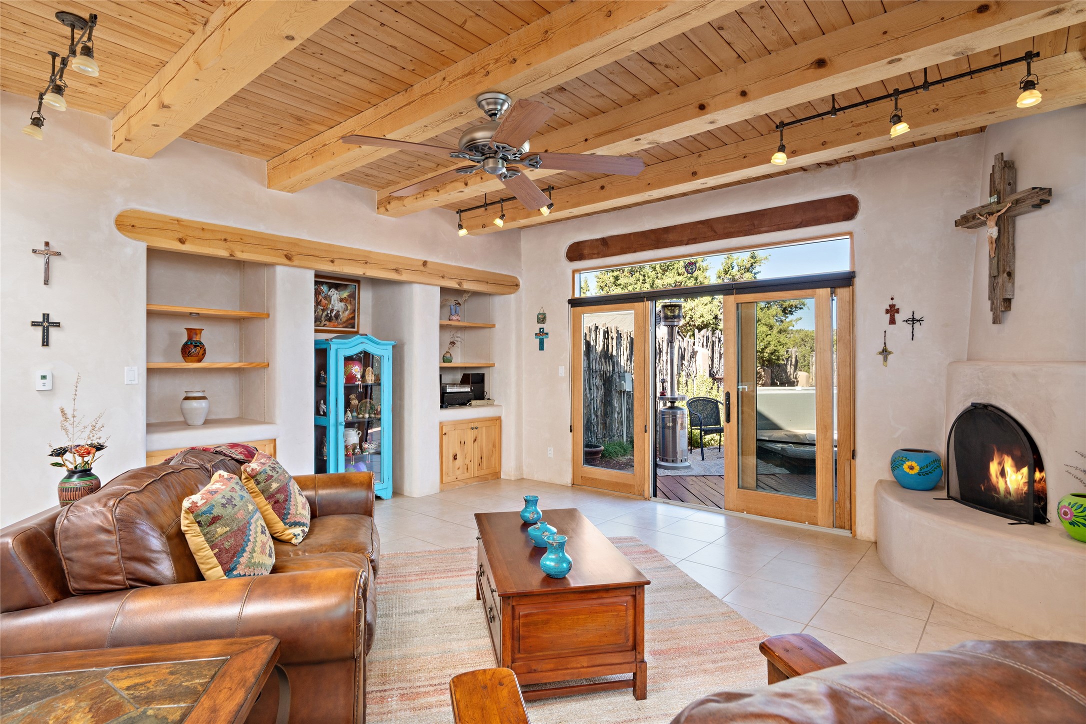 Beautiful Eldorado home where you can stargaze from the hot tub, park your RV and listen to the quaking of the happy Aspen trees. Plaster finish in most of the house with nichos. Kitchen has double ovens, convection microwave, large deep sink, pantry and extra work area. In-floor, natural gas radiant heat tubing is Pex - photo in supplements - domestic supply is copper. Oversized and heated 800+ square-foot 2-car garage. There are two kiva fireplaces, one in the dining room and one in the living room which have electric inserts which can be easily removed to make them woodburning. Walled front courtyard and fully fenced backyard both on drip irrigation. New boiler in January 2023, all stainless kitchen appliances are less than 4 years old. Recent roof maintenance. Water heater new in 2018. Hot tub has new top Sept. 2023. Media room could be third bedroom. One step down into mudroom. ECIA approved RV parking with cover to match stucco. New shed. Mountain and Galisteo Basin views. Rain barrels, extra fridge in mudroom, outdoor heater on back patio and all garage shelving convey with the property. NO KITEC, NO CARPET. Lot corners are flagged. Close to shopping and easy access to I25. Seller may need leaseback for up to 90 days.