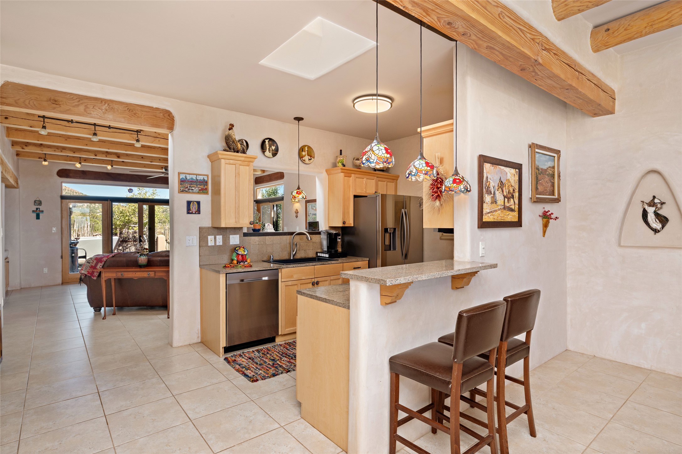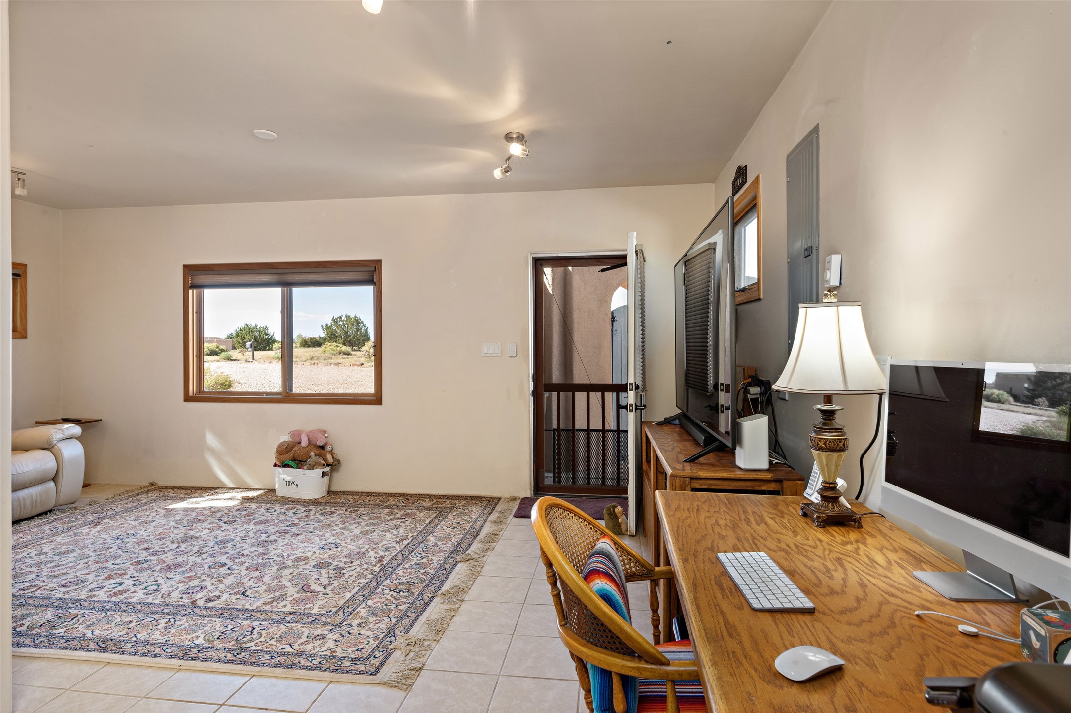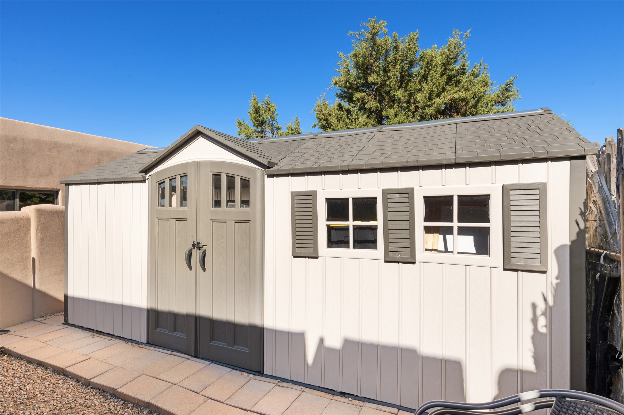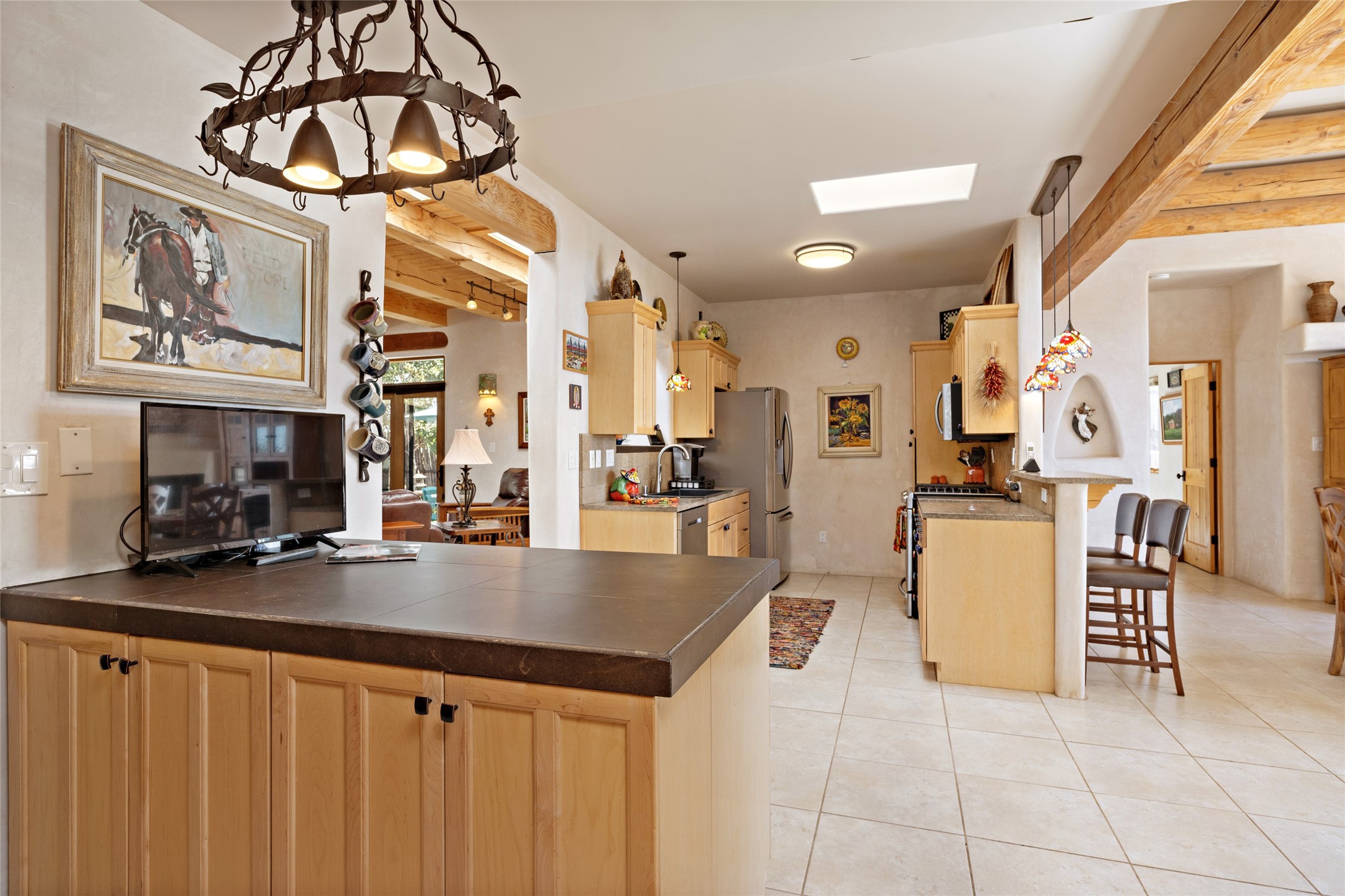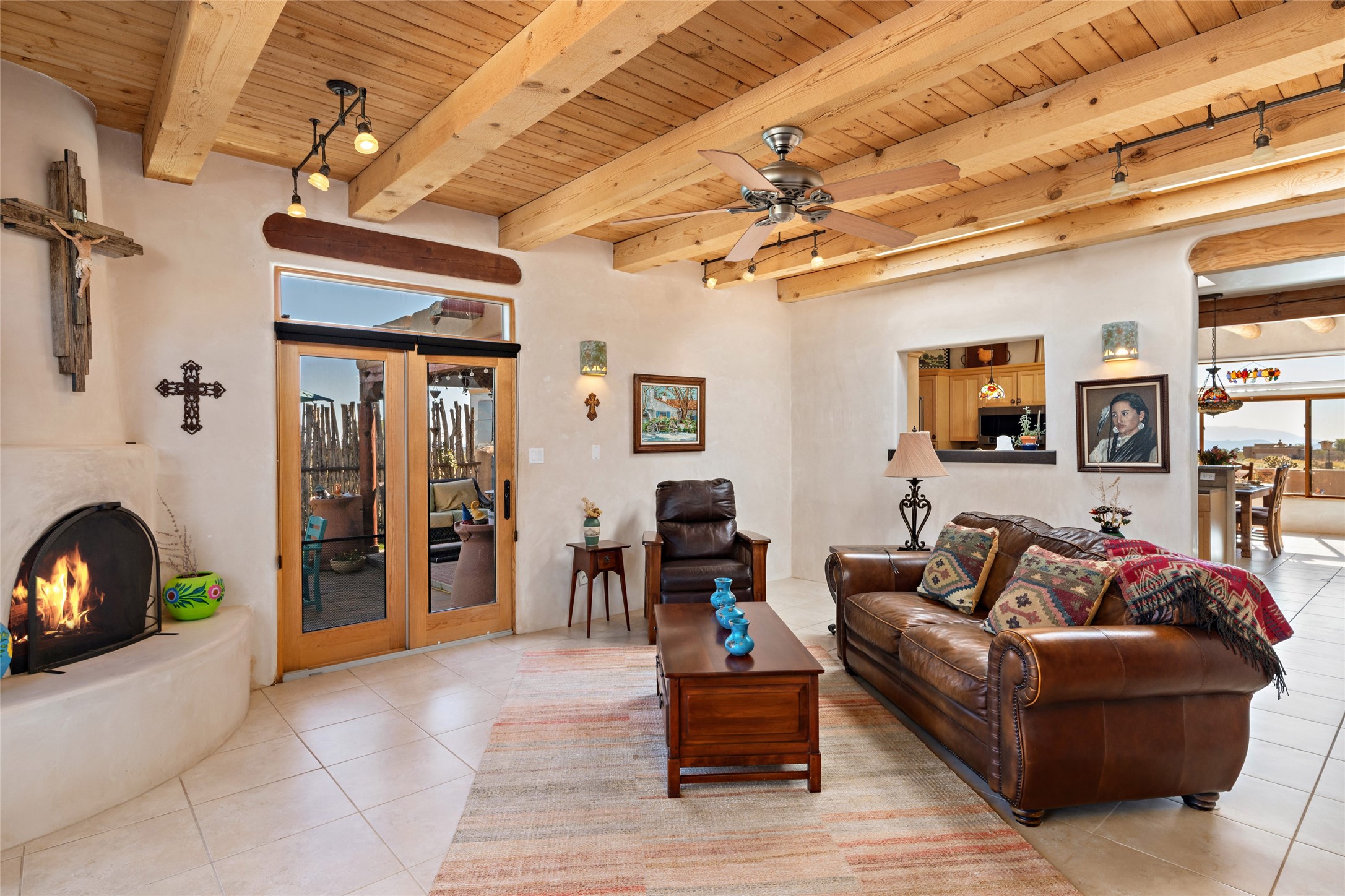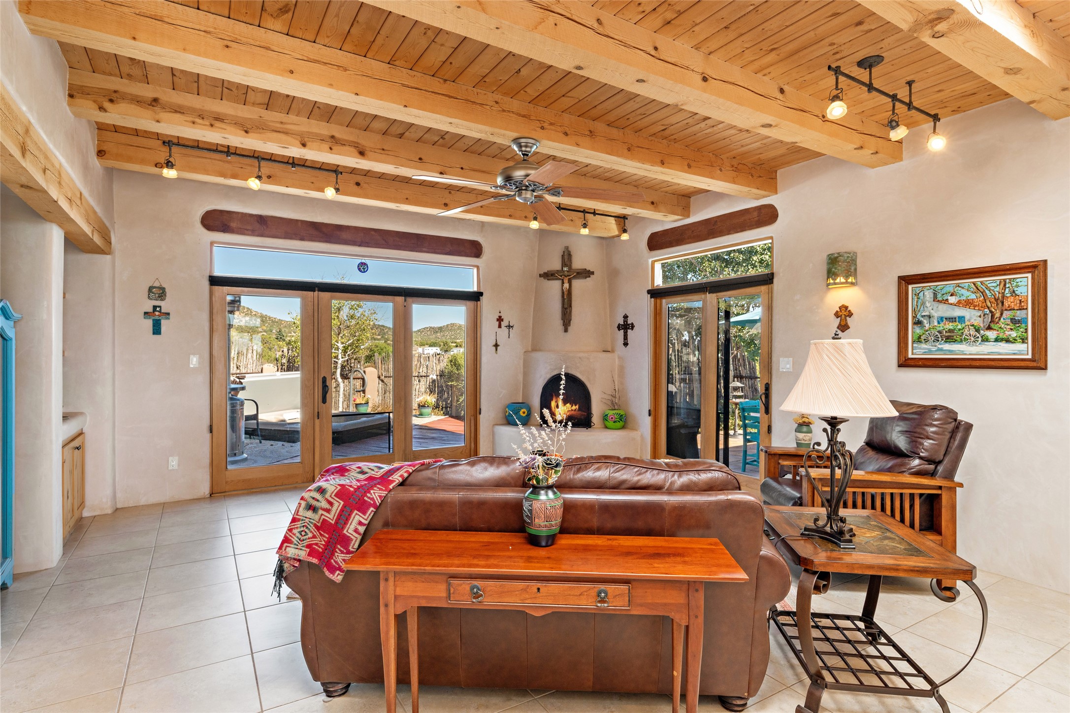 Beautiful Eldorado home where you can stargaze from the hot tub, park your RV and listen to the quaking of the happy Aspen trees. Plaster finish in most of the house with nichos. Kitchen has double ovens, convection microwave, large deep sink, pantry and extra work area. In-floor, natural gas radiant heat tubing is Pex - photo in supplements - domestic supply is copper. Oversized and heated 800+ square-foot 2-car garage. There are two kiva fireplaces, one in the dining room and one in the living room which have electric inserts which can be easily removed to make them woodburning. Walled front courtyard and fully fenced backyard both on drip irrigation. New boiler in January 2023, all stainless kitchen appliances are less than 4 years old. Recent roof maintenance. Water heater new in 2018. Hot tub has new top Sept. 2023. Media room could be third bedroom. One step down into mudroom. ECIA approved RV parking with cover to match stucco. New shed. Mountain and Galisteo Basin views. Rain barrels, extra fridge in mudroom, outdoor heater on back patio and all garage shelving convey with the property. NO KITEC, NO CARPET. Lot corners are flagged. Close to shopping and easy access to I25. Seller may need leaseback for up to 90 days.