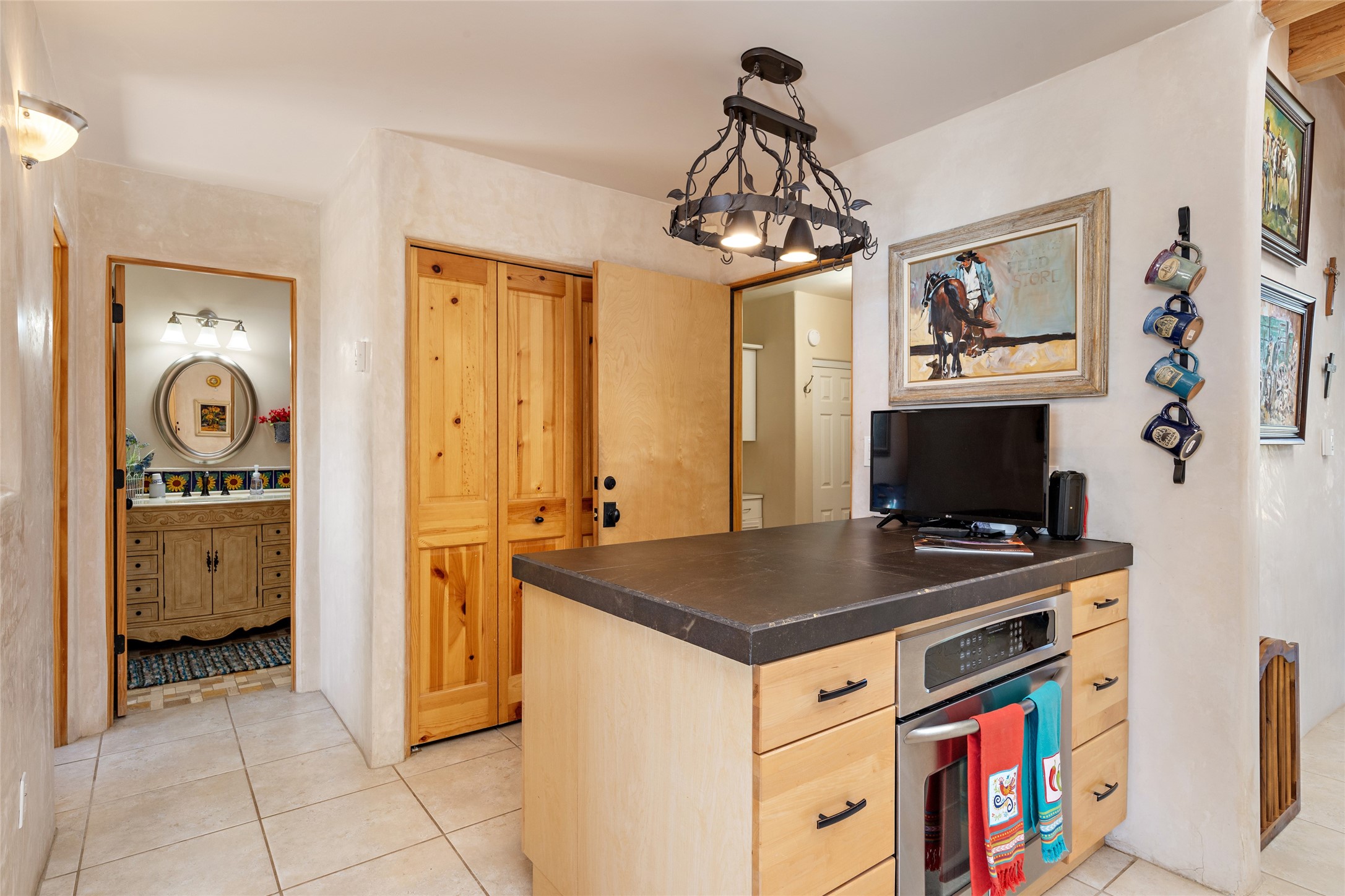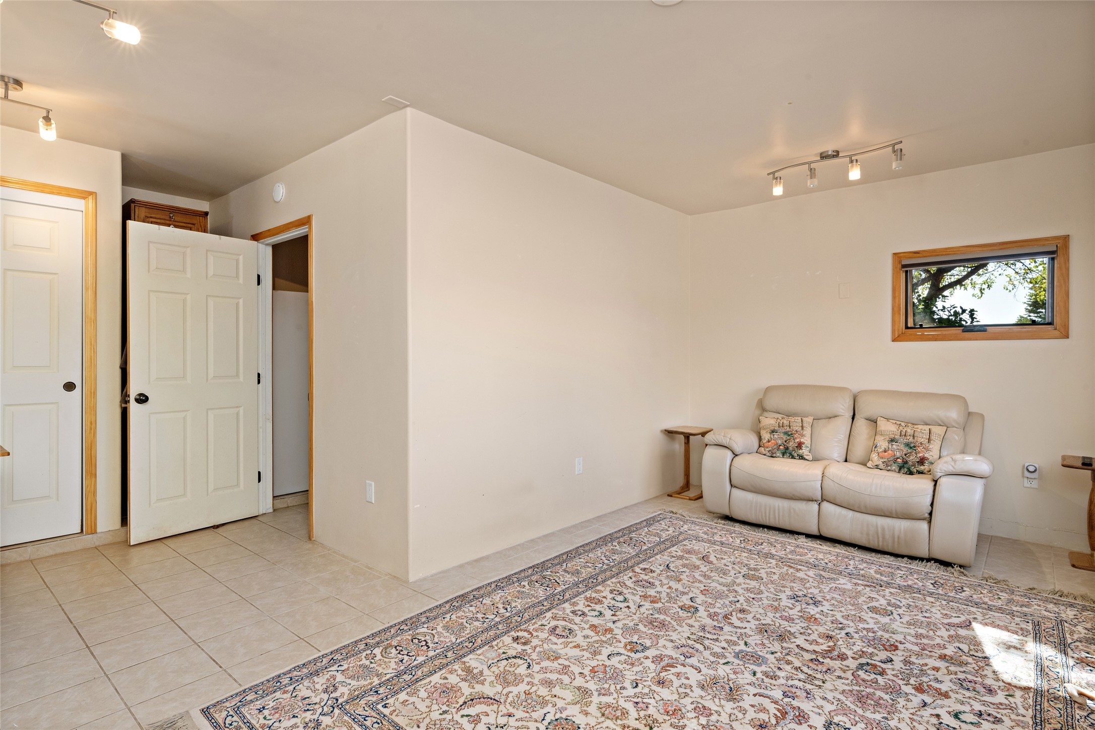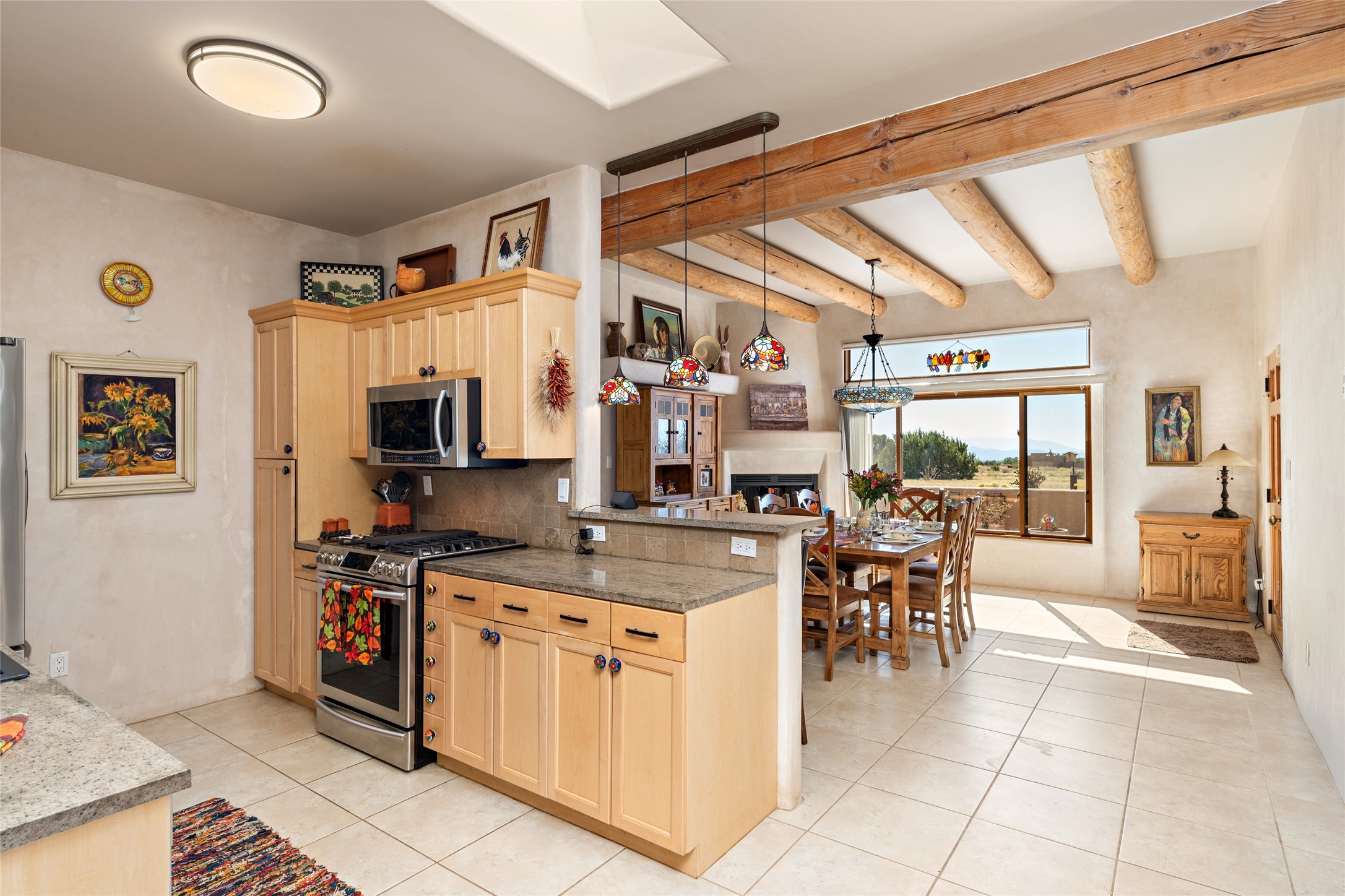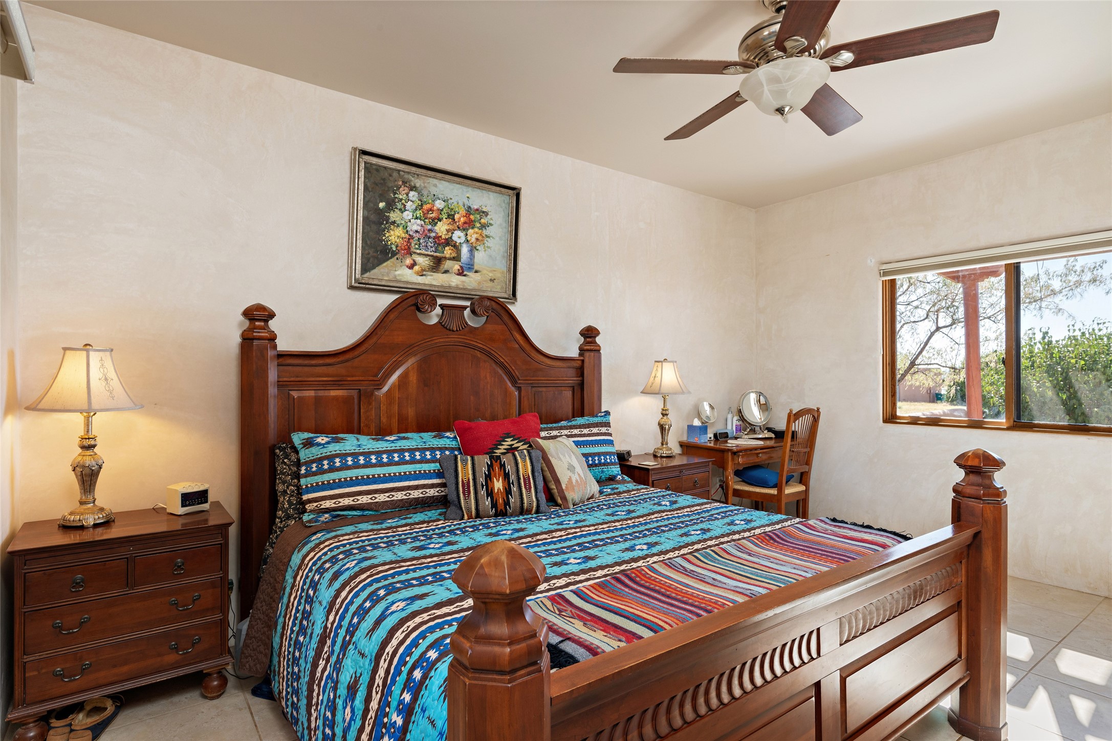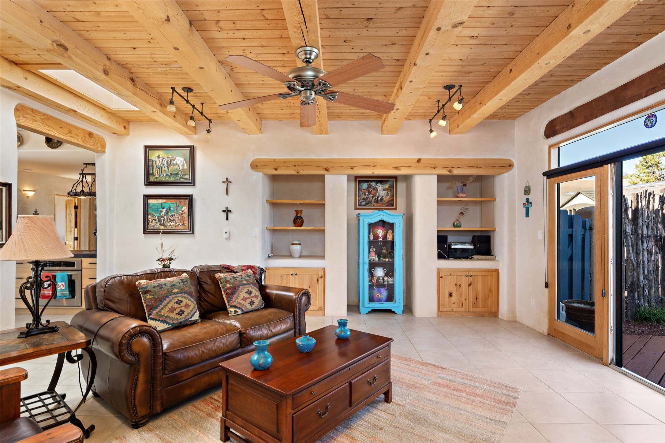 Beautiful Eldorado home where you can stargaze from the hot tub, park your RV and listen to the quaking of the happy Aspen trees. Plaster finish in most of the house with nichos. Kitchen has double ovens, convection microwave, large deep sink, pantry and extra work area. In-floor, natural gas radiant heat tubing is Pex - photo in supplements - domestic supply is copper. Oversized and heated 800+ square-foot 2-car garage. There are two kiva fireplaces, one in the dining room and one in the living room which have electric inserts which can be easily removed to make them woodburning. Walled front courtyard and fully fenced backyard both on drip irrigation. New boiler in January 2023, all stainless kitchen appliances are less than 4 years old. Recent roof maintenance. Water heater new in 2018. Hot tub has new top Sept. 2023. Media room could be third bedroom. One step down into mudroom. ECIA approved RV parking with cover to match stucco. New shed. Mountain and Galisteo Basin views. Rain barrels, extra fridge in mudroom, outdoor heater on back patio and all garage shelving convey with the property. NO KITEC, NO CARPET. Lot corners are flagged. Close to shopping and easy access to I25. Seller may need leaseback for up to 90 days.