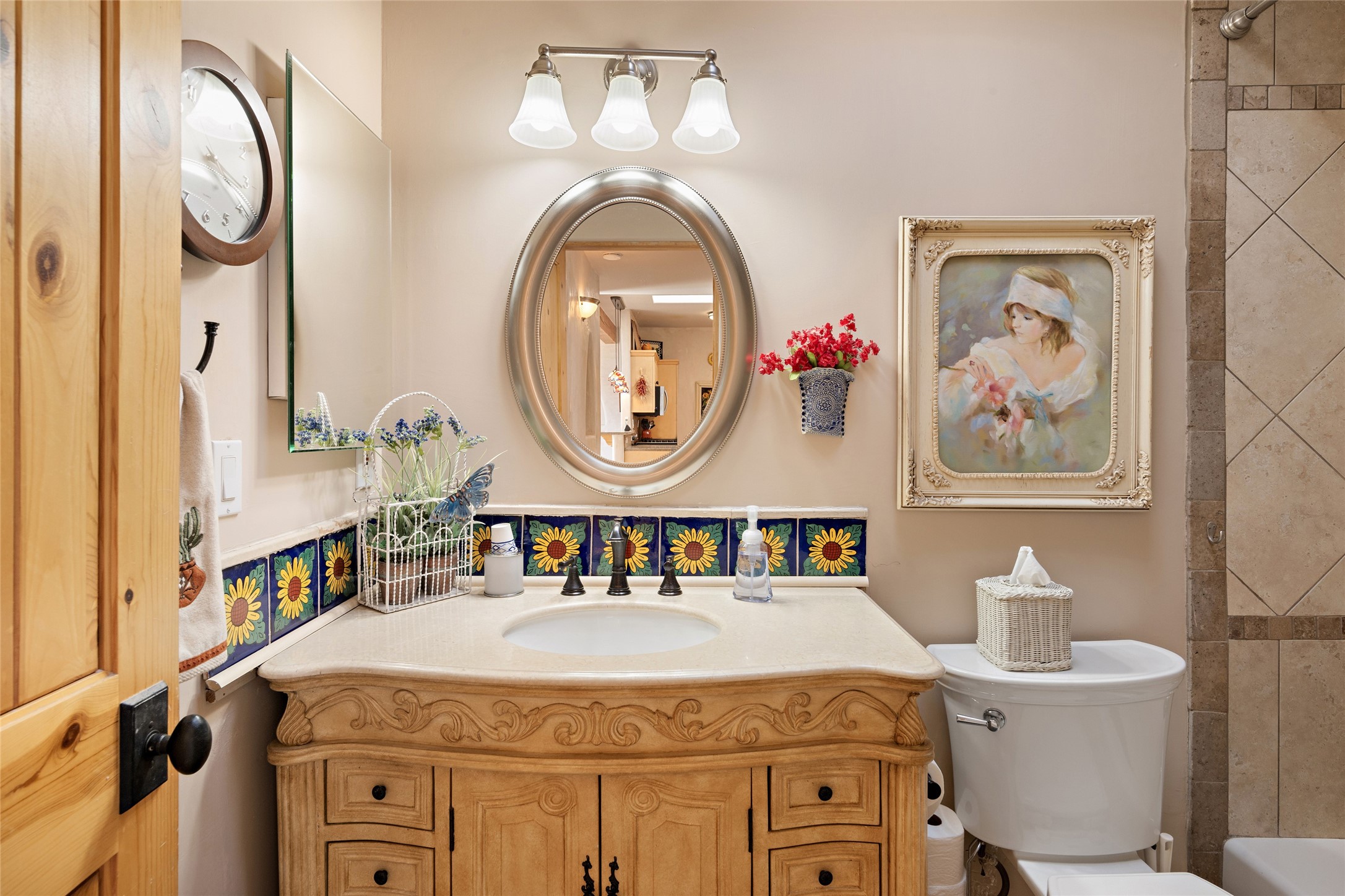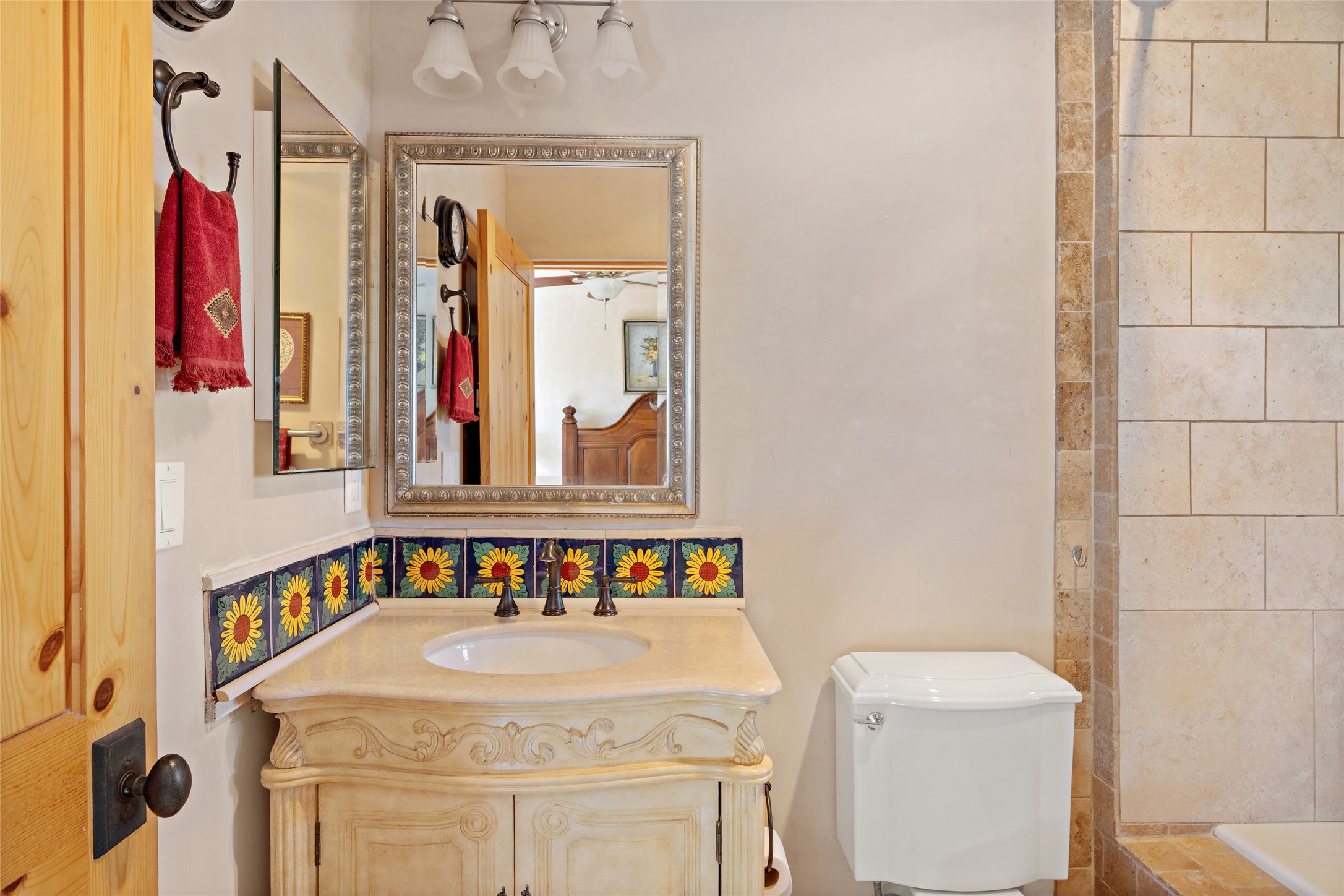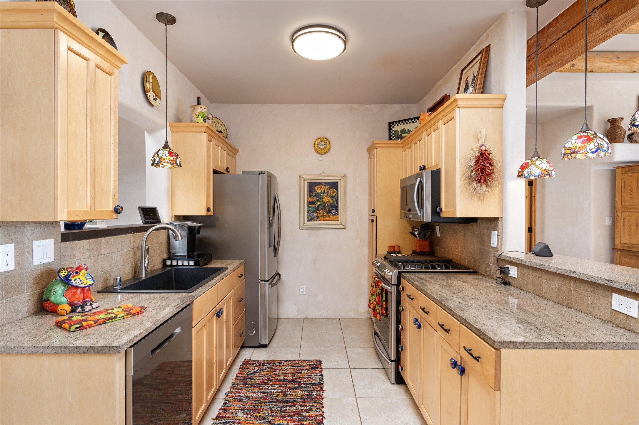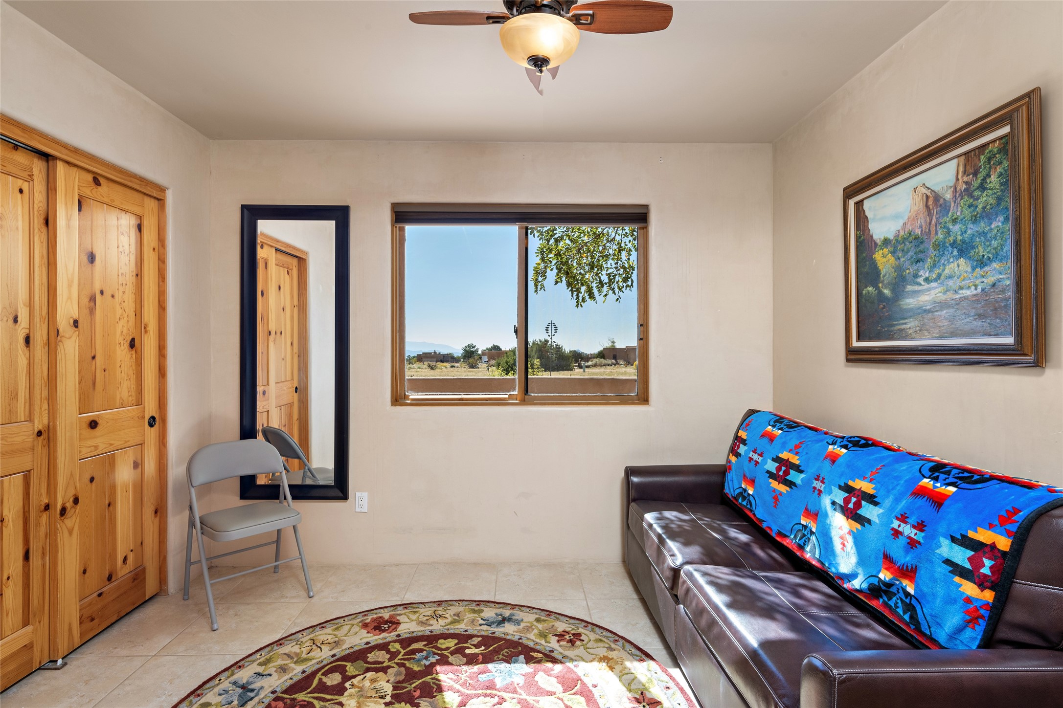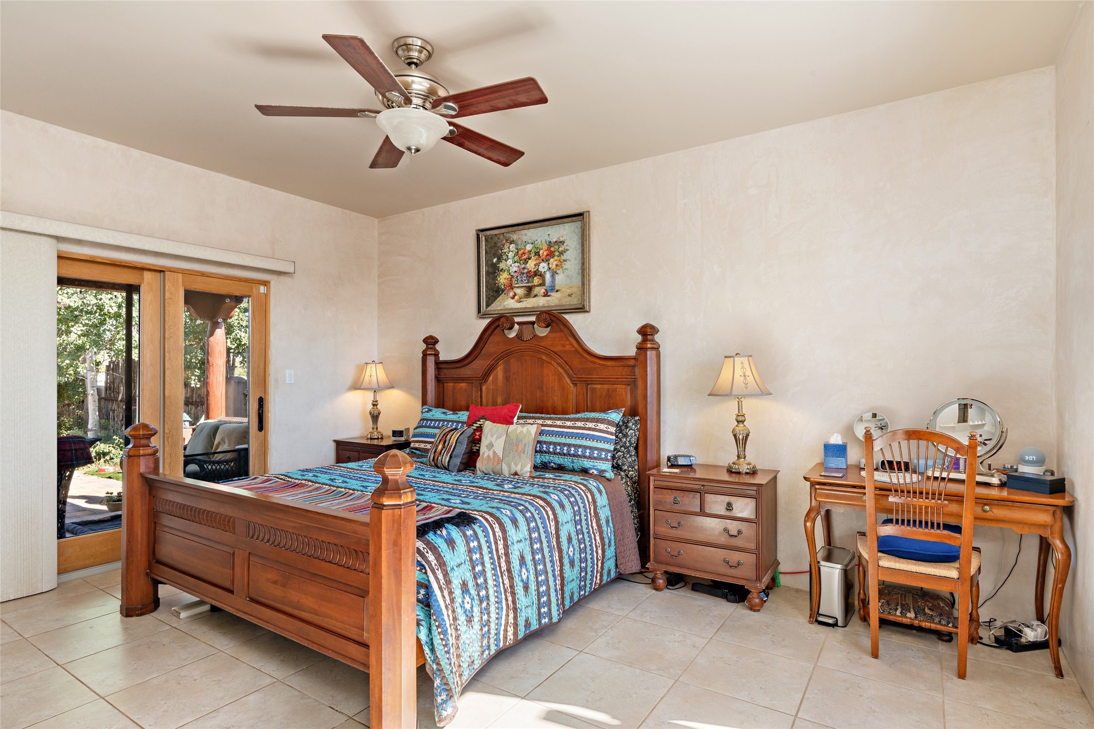 Beautiful Eldorado home where you can stargaze from the hot tub, park your RV and listen to the quaking of the happy Aspen trees. Plaster finish in most of the house with nichos. Kitchen has double ovens, convection microwave, large deep sink, pantry and extra work area. In-floor, natural gas radiant heat tubing is Pex - photo in supplements - domestic supply is copper. Oversized and heated 800+ square-foot 2-car garage. There are two kiva fireplaces, one in the dining room and one in the living room which have electric inserts which can be easily removed to make them woodburning. Walled front courtyard and fully fenced backyard both on drip irrigation. New boiler in January 2023, all stainless kitchen appliances are less than 4 years old. Recent roof maintenance. Water heater new in 2018. Hot tub has new top Sept. 2023. Media room could be third bedroom. One step down into mudroom. ECIA approved RV parking with cover to match stucco. New shed. Mountain and Galisteo Basin views. Rain barrels, extra fridge in mudroom, outdoor heater on back patio and all garage shelving convey with the property. NO KITEC, NO CARPET. Lot corners are flagged. Close to shopping and easy access to I25. Seller may need leaseback for up to 90 days.