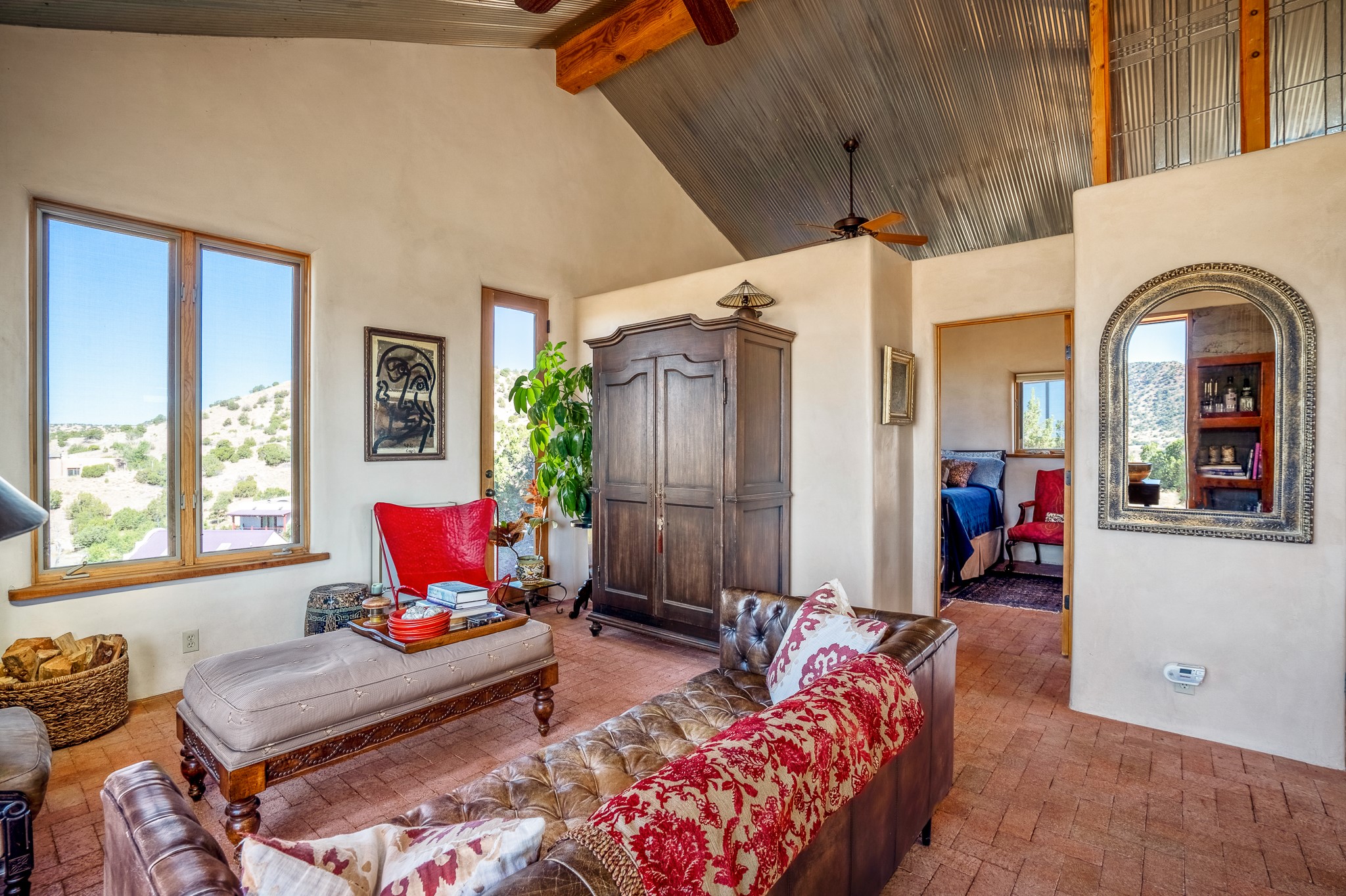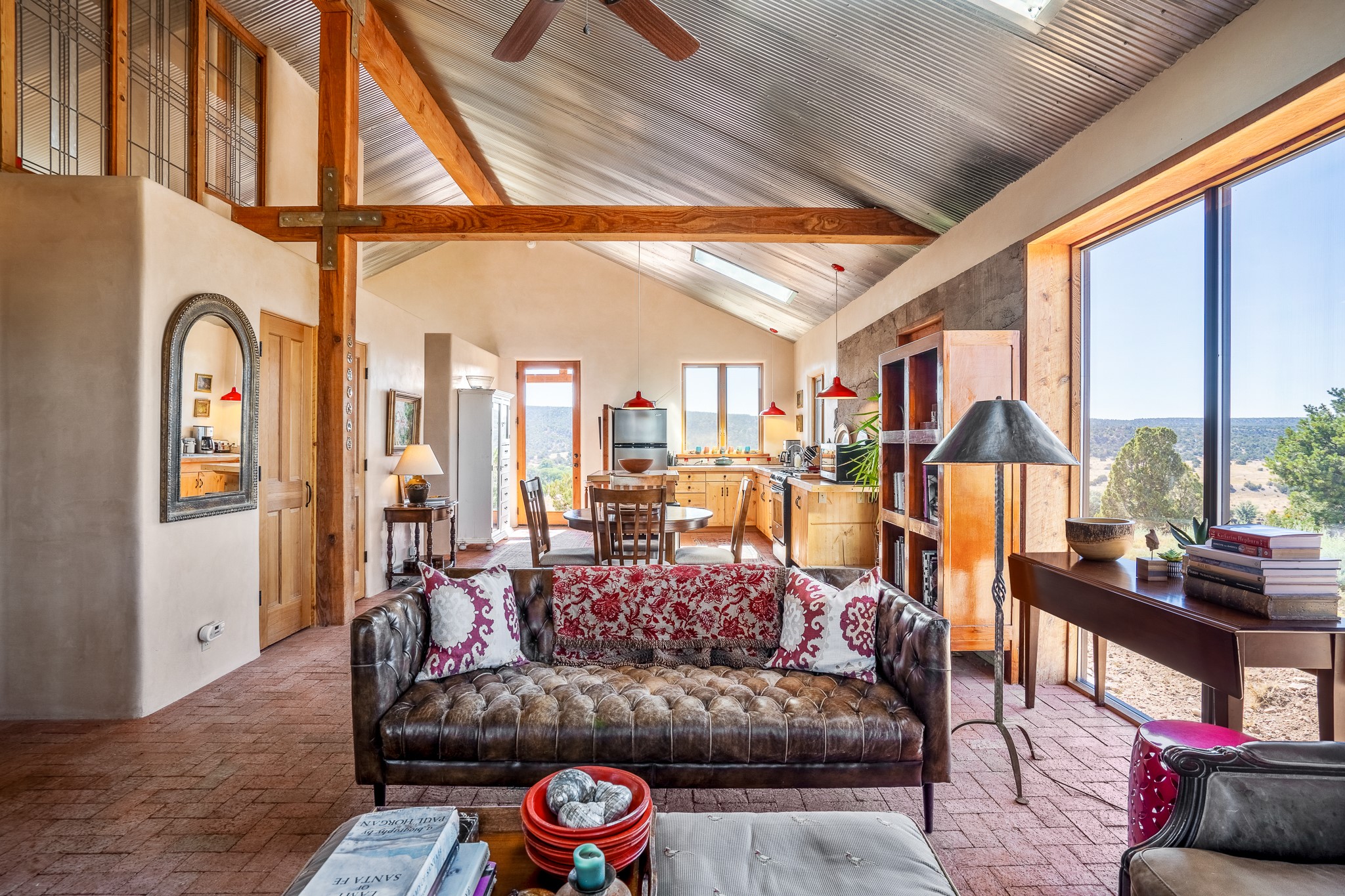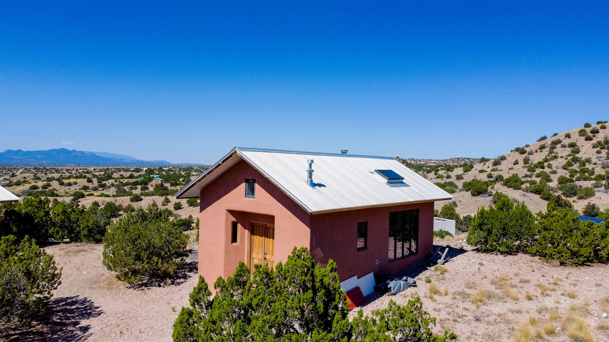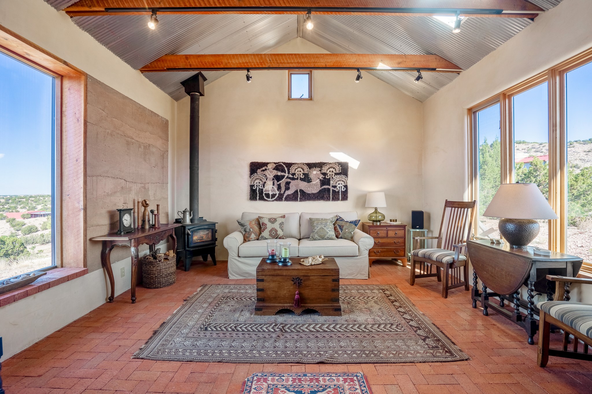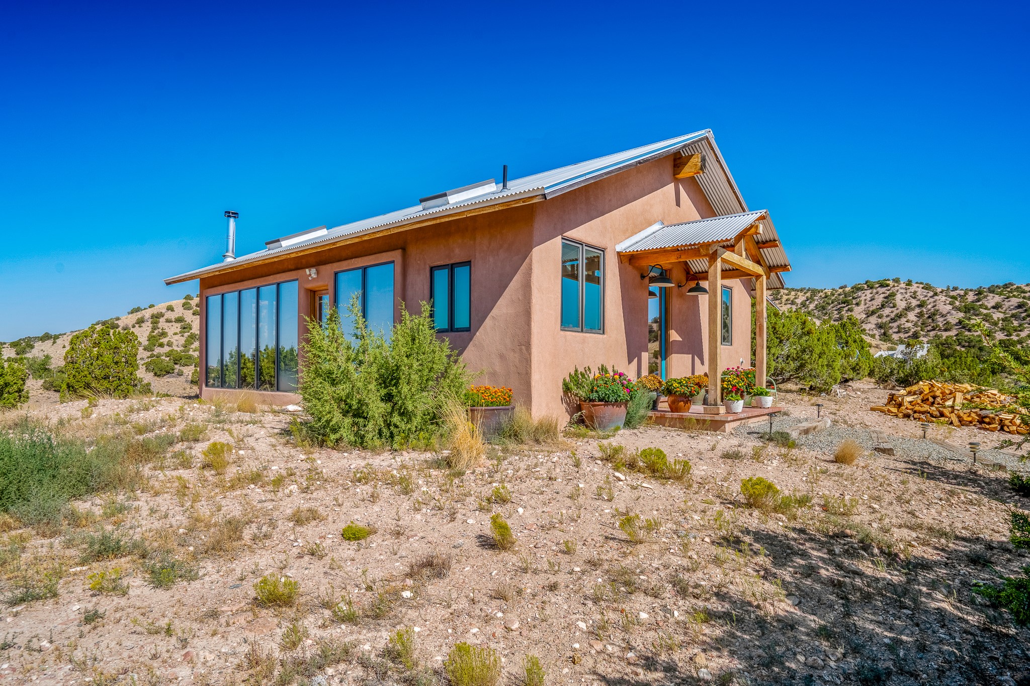 Panoramic views from a beautiful house and casita in Lamy! Located just minutes fromThe Agora shopping area in Eldorado and sited atop a picturesque hill, this uniqueproperty boasts a charming 1044 sq. ft. 2-bedroom, 2-bathroom E-crete home with a pitched roof,along with a detached 436 sq. ft. casita featuring a pitched roof and a 3/4 bathroom. Sited on 3acres with community water and constructed in 2006 by famed local builder Karen Terry, known as a pioneer in passive solar and eco-conscious design. Both structures incorporate Trombe walls - these walls collect heat from the sun and radiate it into the interior. Heat is further supplemented by gas wall heaters and cozy wood-burning stoves. The many 6' and floor to ceiling insulated double panewindows are highly energy efficient and provide an abundance of natural light.Impeccably styled with sleek, modern aesthetics, this property exudes the authenticNorthern New Mexico atmosphere, showcasing beautiful brick flooring and plasteredwalls. A true Lamy gem.