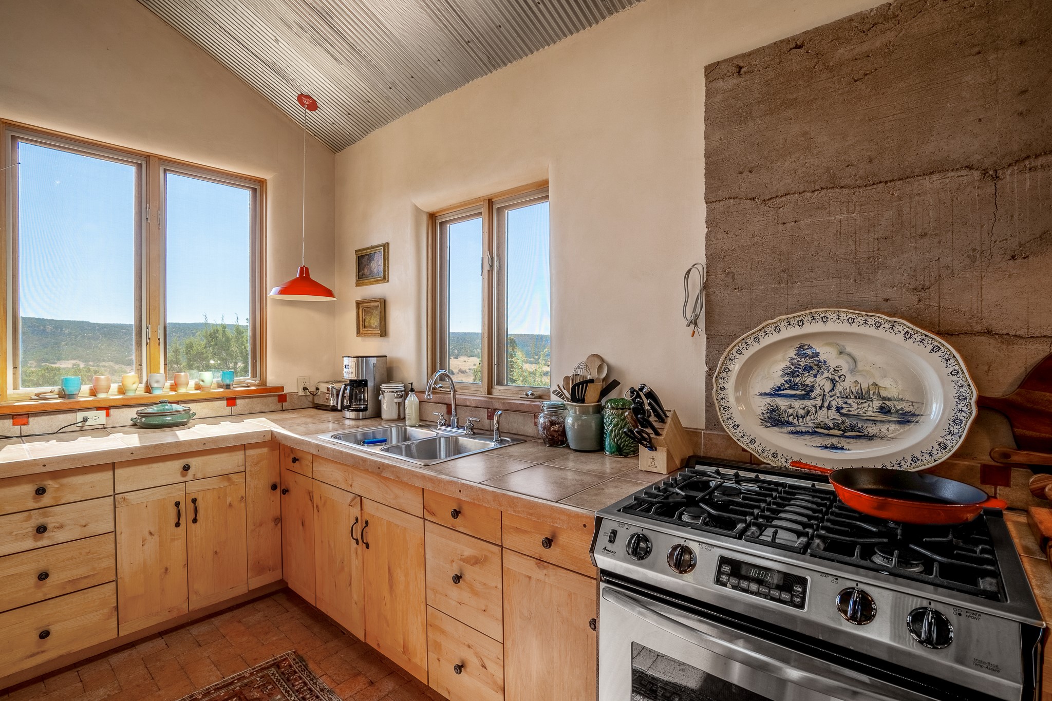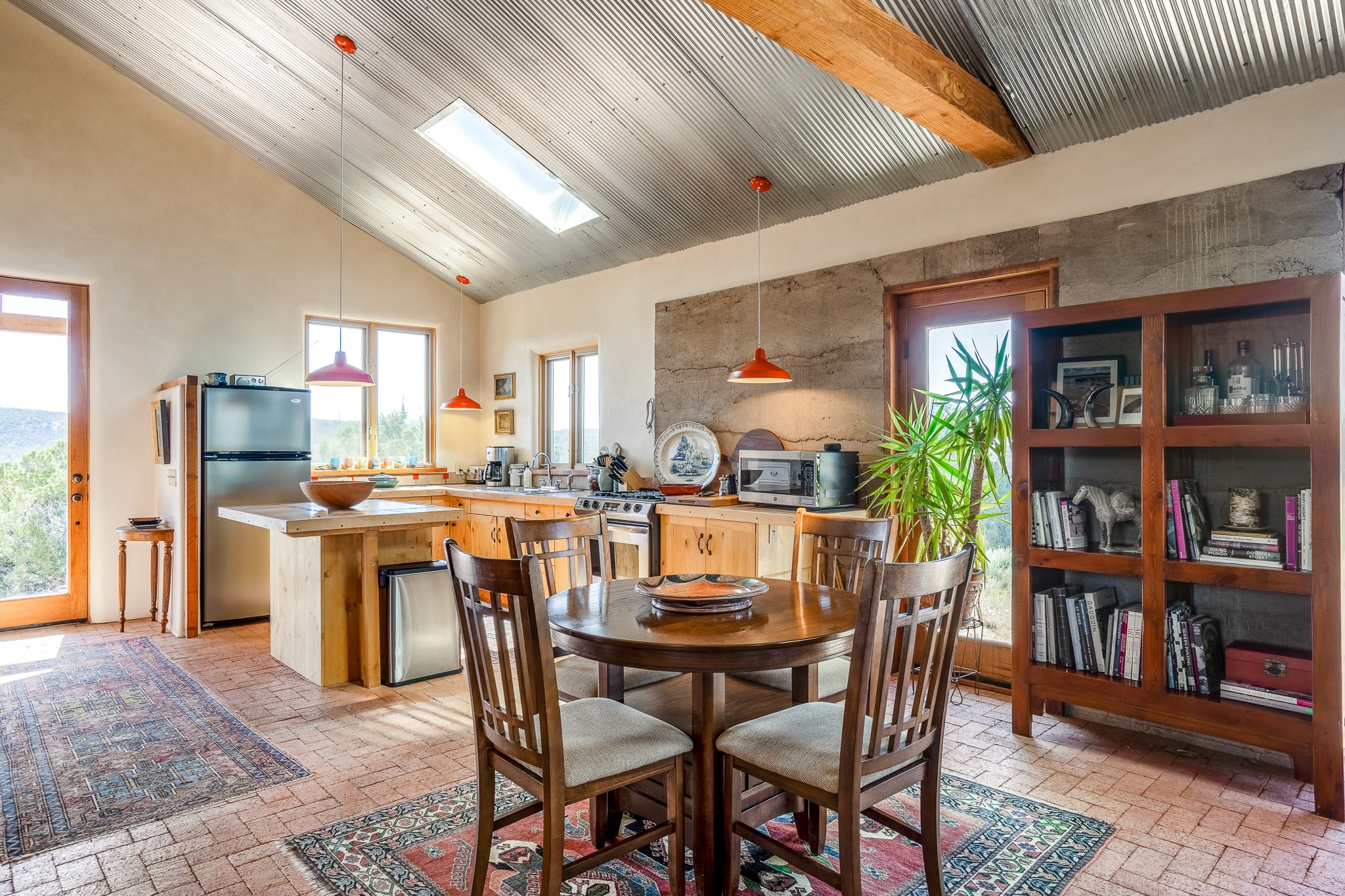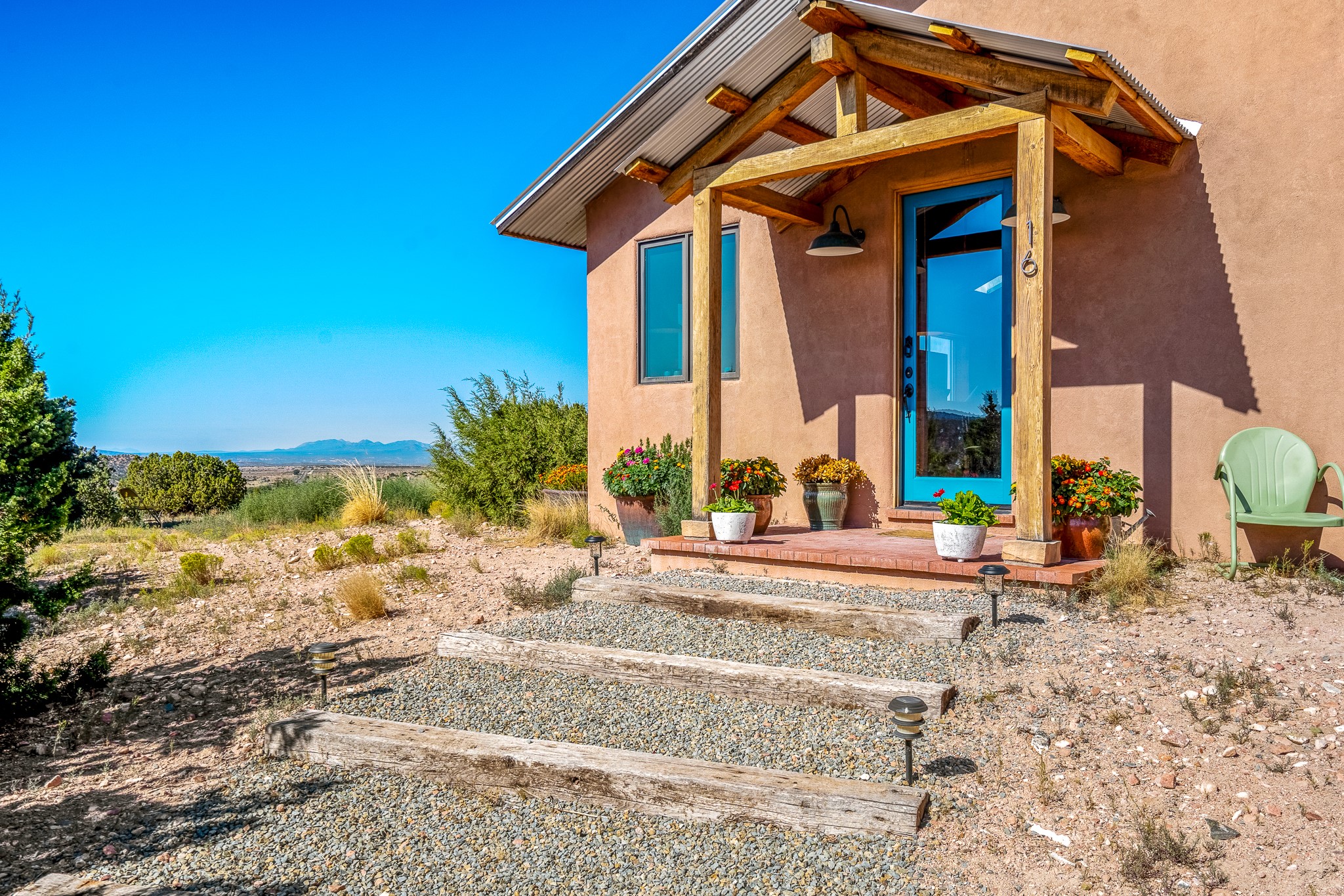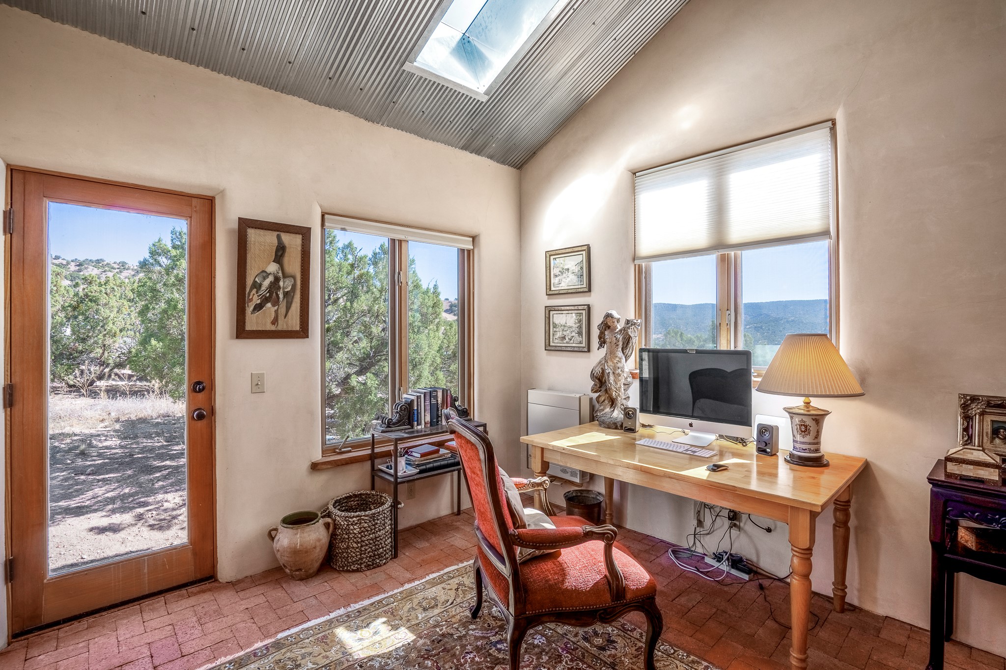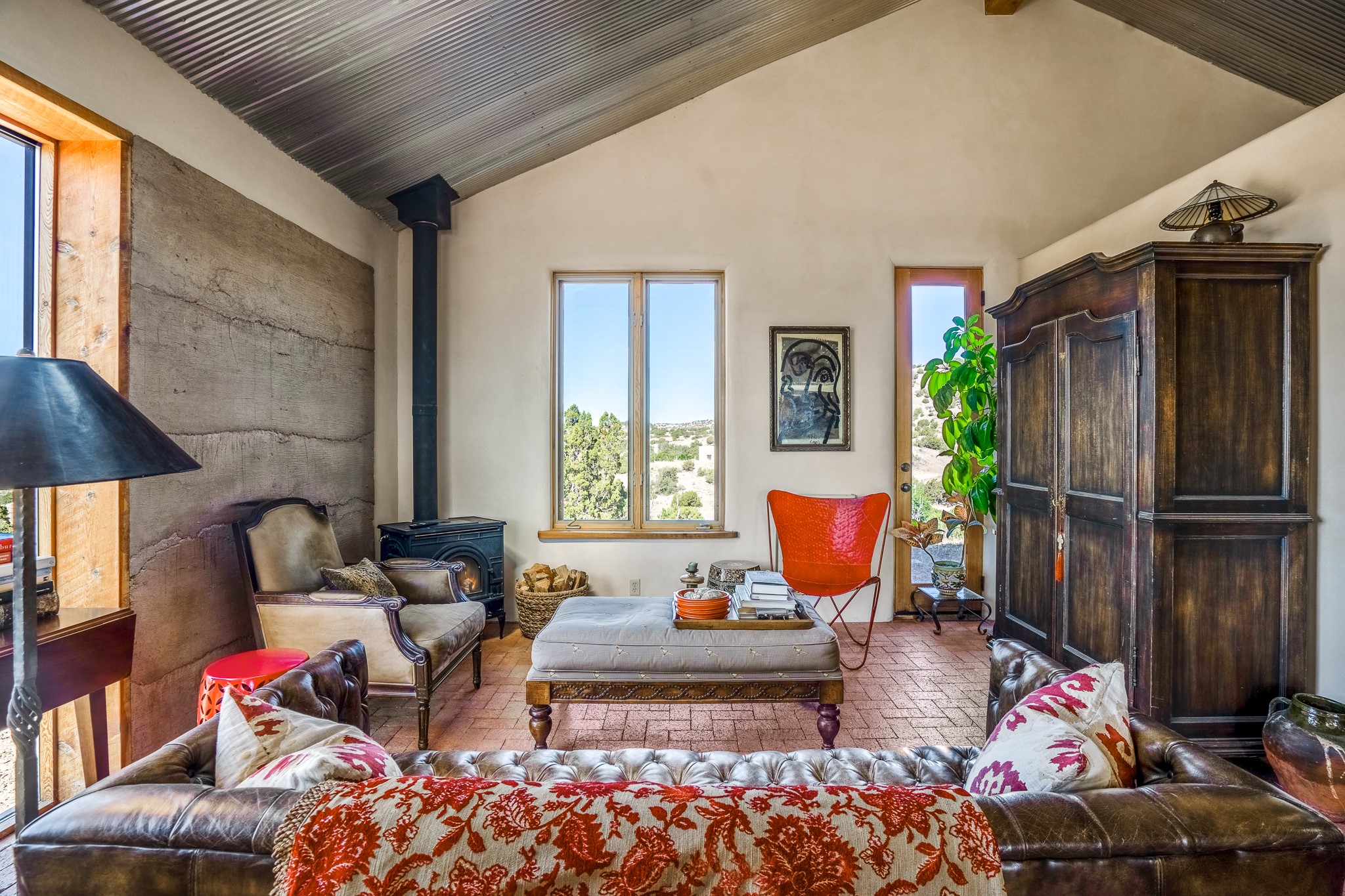 Panoramic views from a beautiful house and casita in Lamy! Located just minutes fromThe Agora shopping area in Eldorado and sited atop a picturesque hill, this uniqueproperty boasts a charming 1044 sq. ft. 2-bedroom, 2-bathroom E-crete home with a pitched roof,along with a detached 436 sq. ft. casita featuring a pitched roof and a 3/4 bathroom. Sited on 3acres with community water and constructed in 2006 by famed local builder Karen Terry, known as a pioneer in passive solar and eco-conscious design. Both structures incorporate Trombe walls - these walls collect heat from the sun and radiate it into the interior. Heat is further supplemented by gas wall heaters and cozy wood-burning stoves. The many 6' and floor to ceiling insulated double panewindows are highly energy efficient and provide an abundance of natural light.Impeccably styled with sleek, modern aesthetics, this property exudes the authenticNorthern New Mexico atmosphere, showcasing beautiful brick flooring and plasteredwalls. A true Lamy gem.