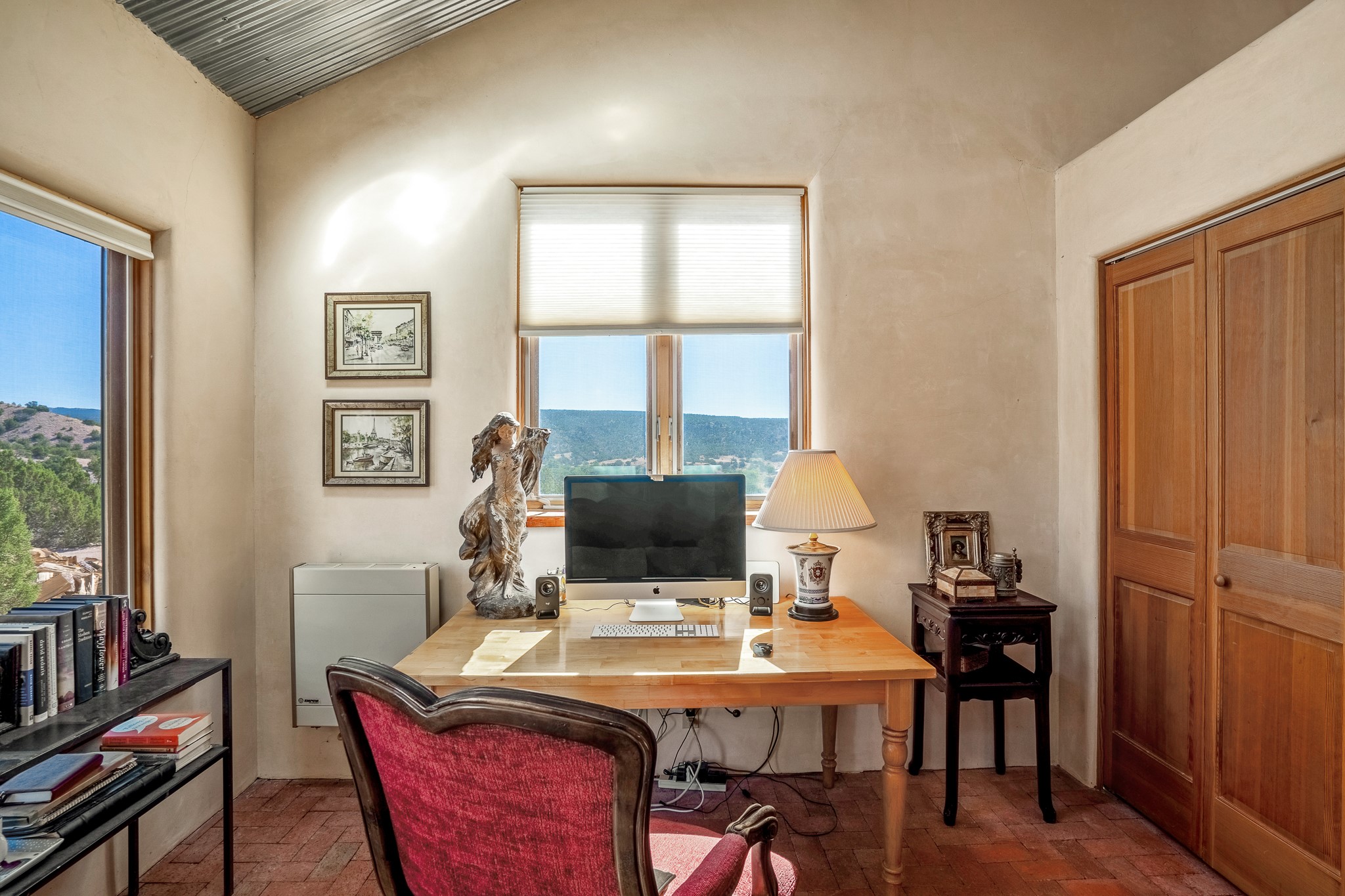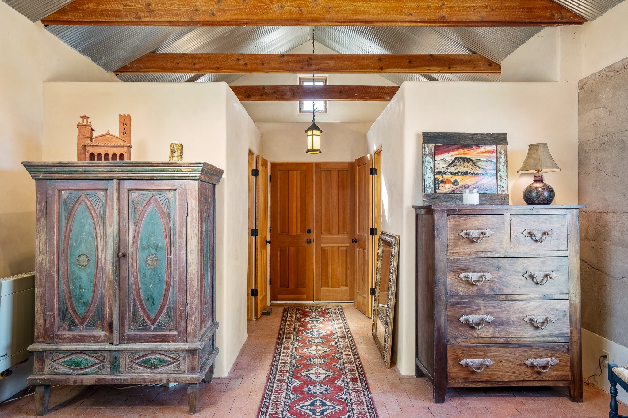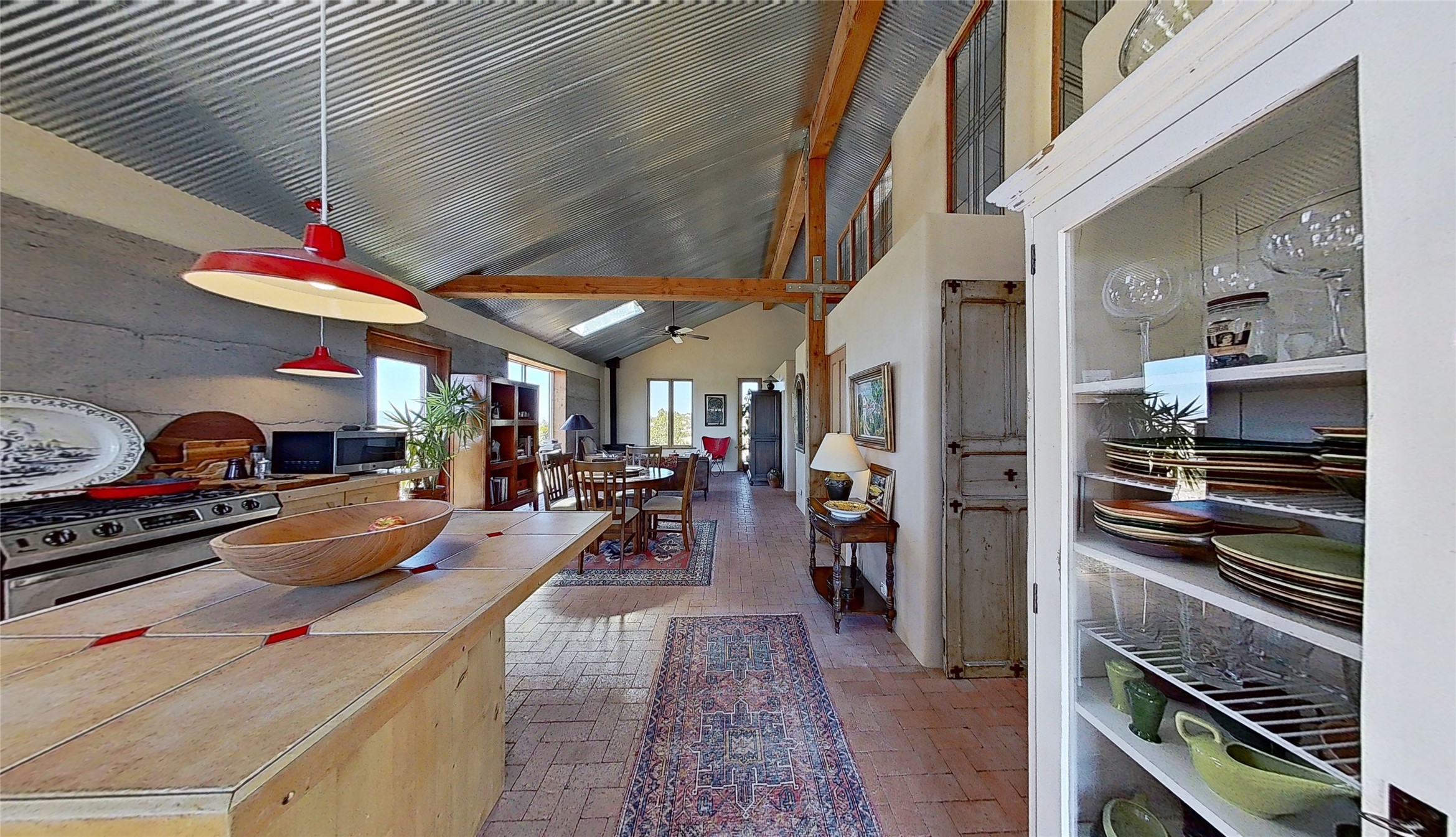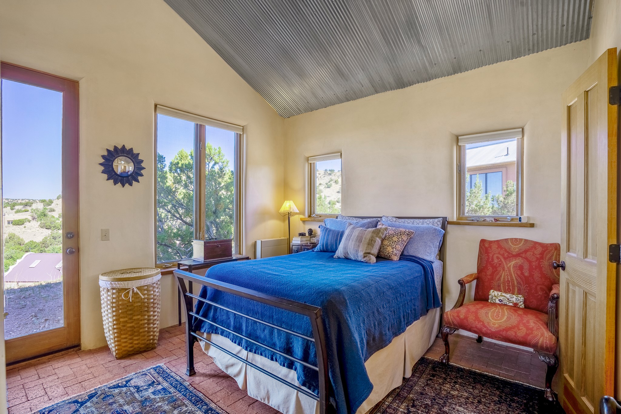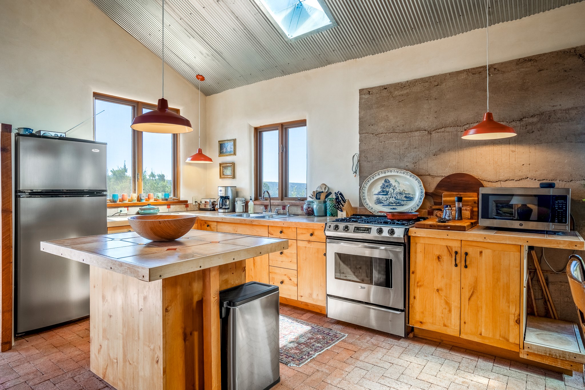 Panoramic views from a beautiful house and casita in Lamy! Located just minutes fromThe Agora shopping area in Eldorado and sited atop a picturesque hill, this uniqueproperty boasts a charming 1044 sq. ft. 2-bedroom, 2-bathroom E-crete home with a pitched roof,along with a detached 436 sq. ft. casita featuring a pitched roof and a 3/4 bathroom. Sited on 3acres with community water and constructed in 2006 by famed local builder Karen Terry, known as a pioneer in passive solar and eco-conscious design. Both structures incorporate Trombe walls - these walls collect heat from the sun and radiate it into the interior. Heat is further supplemented by gas wall heaters and cozy wood-burning stoves. The many 6' and floor to ceiling insulated double panewindows are highly energy efficient and provide an abundance of natural light.Impeccably styled with sleek, modern aesthetics, this property exudes the authenticNorthern New Mexico atmosphere, showcasing beautiful brick flooring and plasteredwalls. A true Lamy gem.