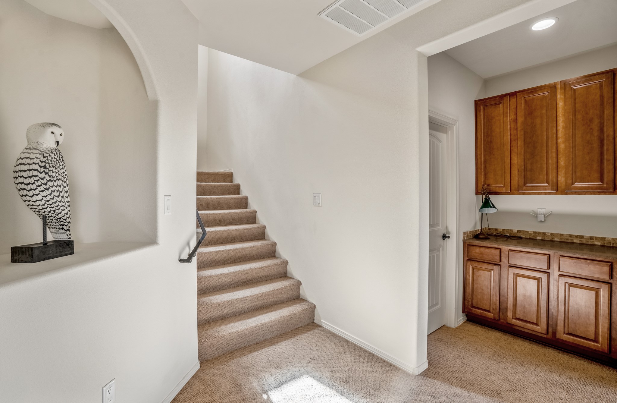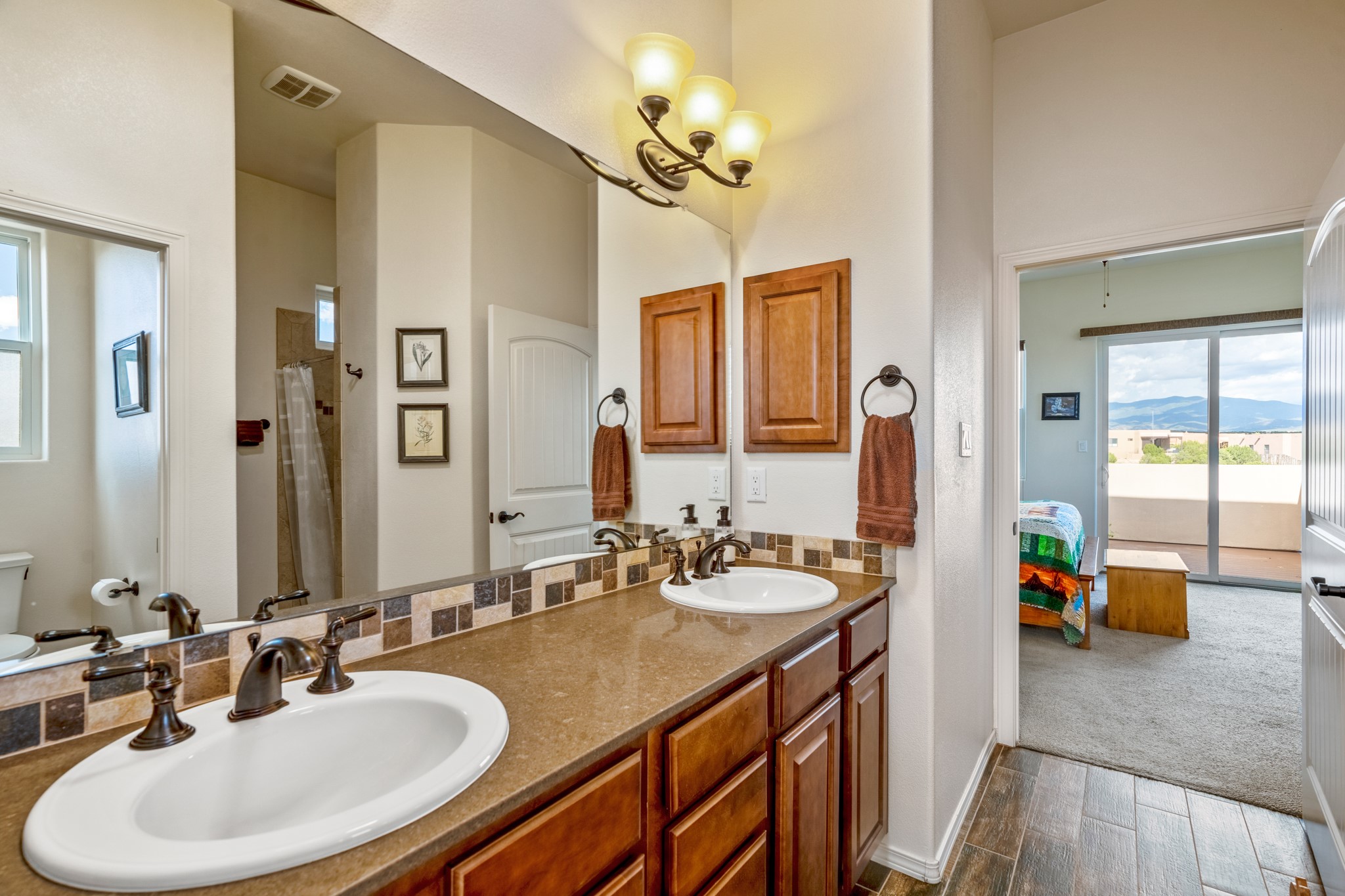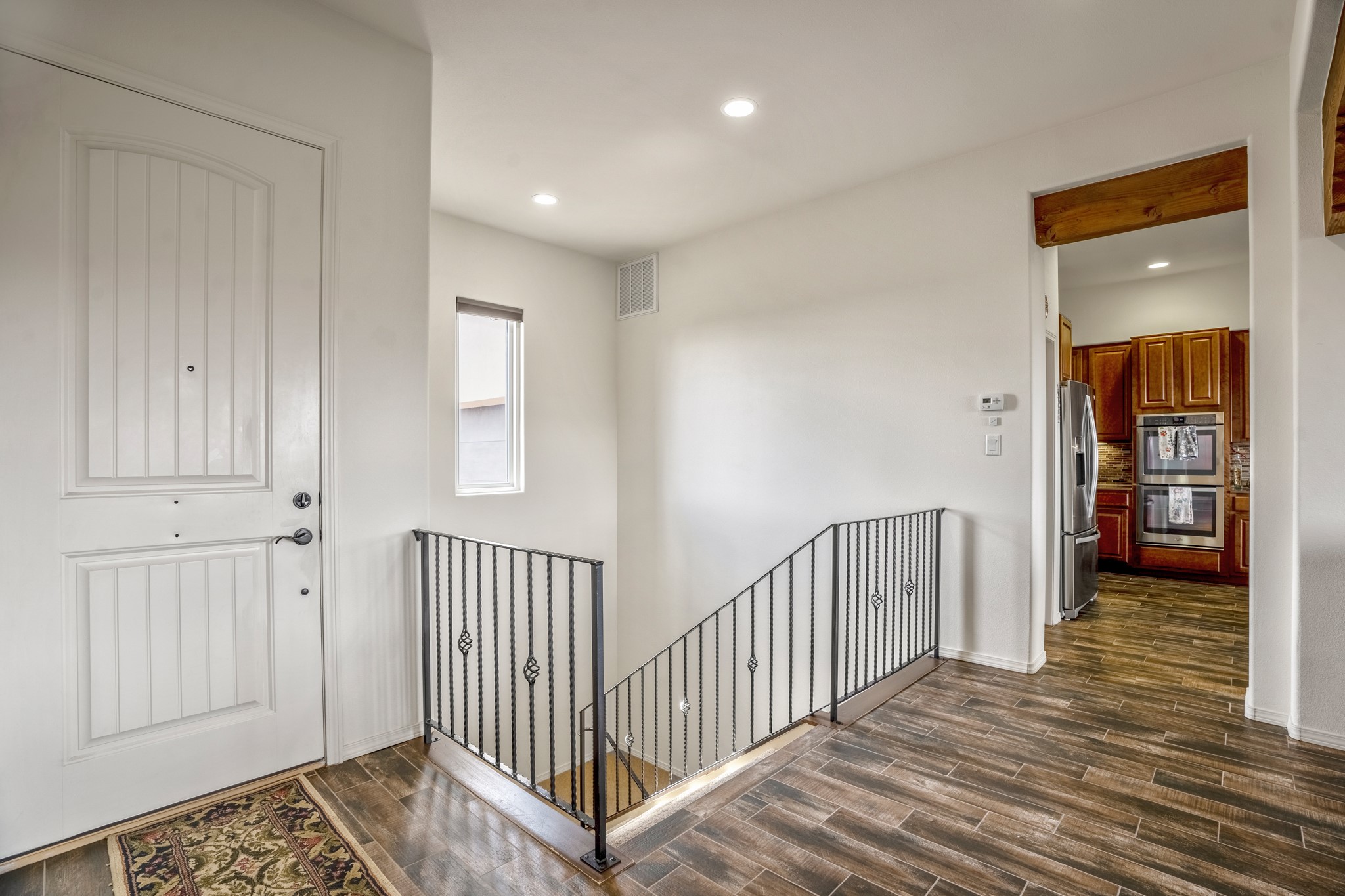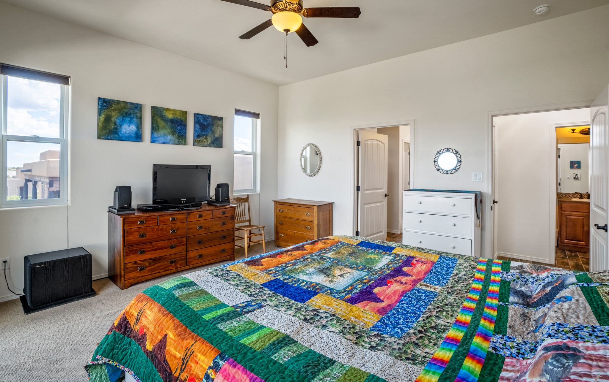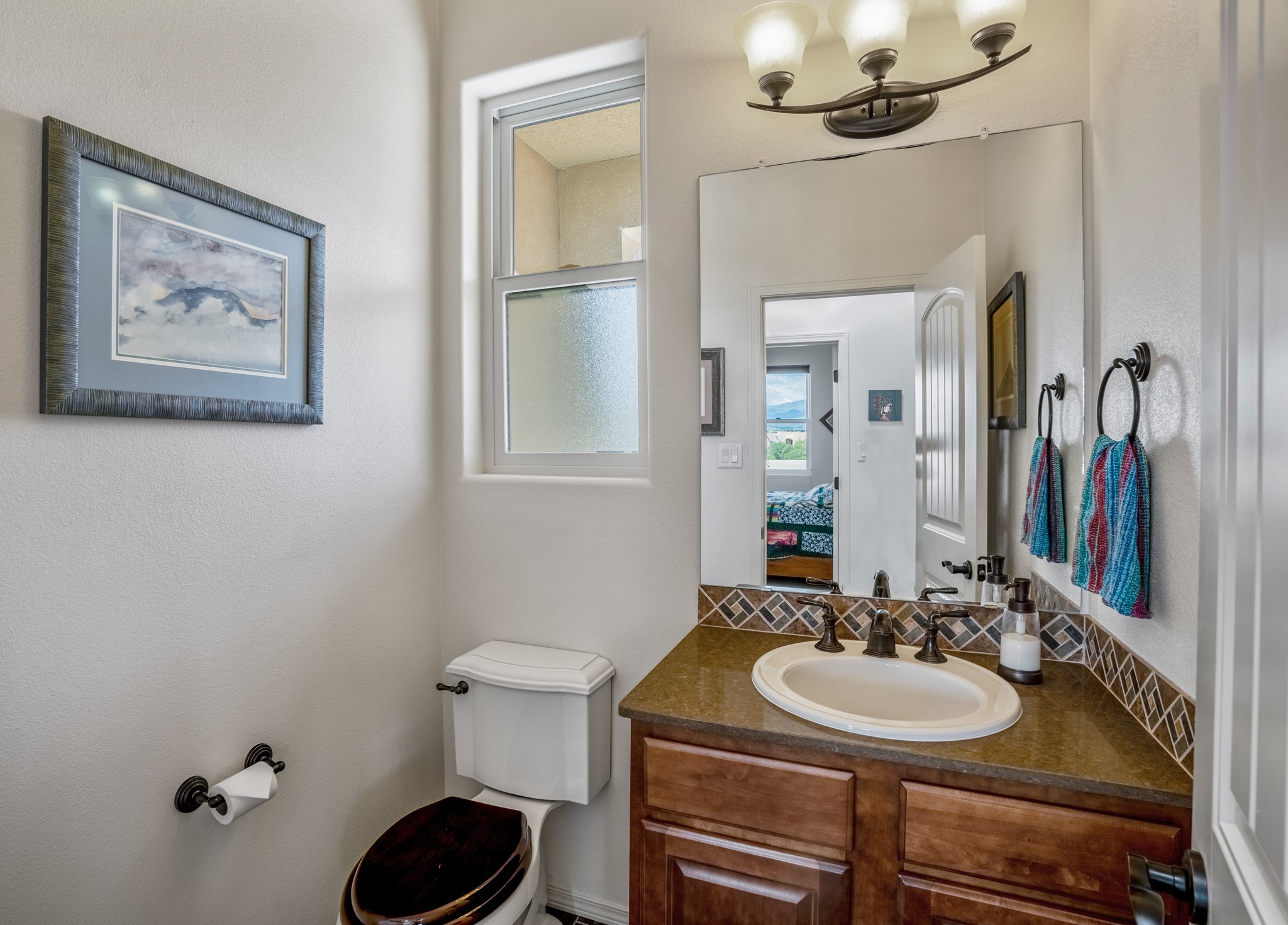 Introducing a slice of paradise with this remarkable property that offers more than just a home - it offers a lifestyle. Set against the breathtaking backdrop of the Sangre de Cristo mountains, the living room, Primary bedroom, and deck provide an awe-inspiring view that captivates your senses and soothes your soul.Unveil the beauty of open space as you gaze beyond the rear of your residence to the distant houses, creating a sense of privacy that is truly special. Embrace the outdoors with an exceptional trail system that weaves its way through the neighborhood and extends to the enchanting realm of Aldea and beyond. Each morning, embark on a unique journey as you explore these trails, ensuring that no two walks are alike within a week.Every detail has been carefully considered to enhance your living experience. Say goodbye to the hassle of propane gas tanks - a natural gas outlet on the deck ensures endless grilling sessions without interruption. As the deck faces east, indulge in the cooler shade during evening grilling sessions and relish delightful dinners on the deck throughout the summer season.Nestle by the warmth of the gas kiva fireplace on winter nights, creating an unparalleled coziness perfect for intimate gatherings and cherished moments. Storage will never be a concern with an oversized garage that provides ample space for all your belongings. Discover convenience in every corner, as walk-in closets grace each bedroom, while the closet under the stairs - affectionately known as the "Harry Potter" closet - offers even more storage options.Hosting guests is a breeze in the junior master bedroom, offering them a retreat of their own, complete with an en-suite bathroom for added comfort. Sliding doors lead to a back portal, allowing them to bask in the beauty of the outdoors while maintaining their privacy.