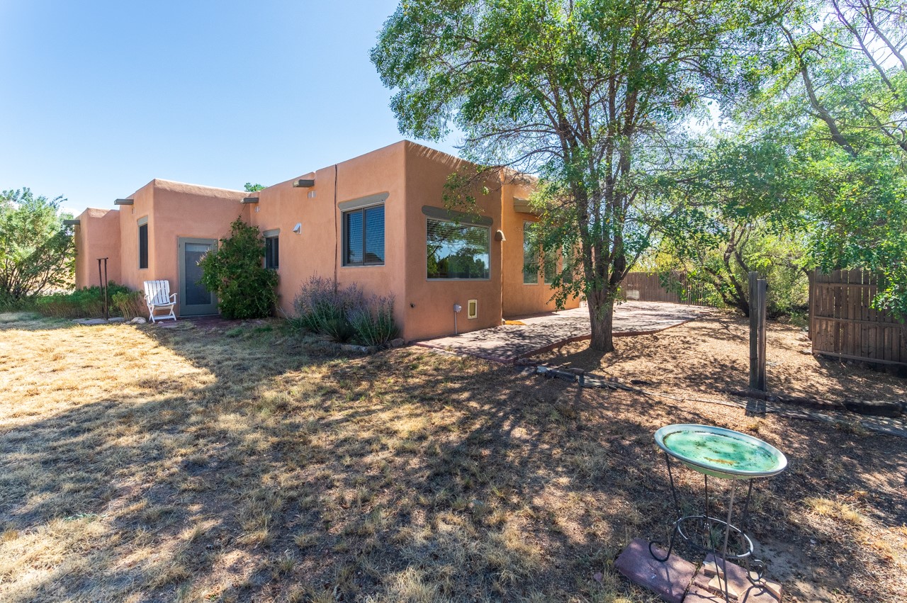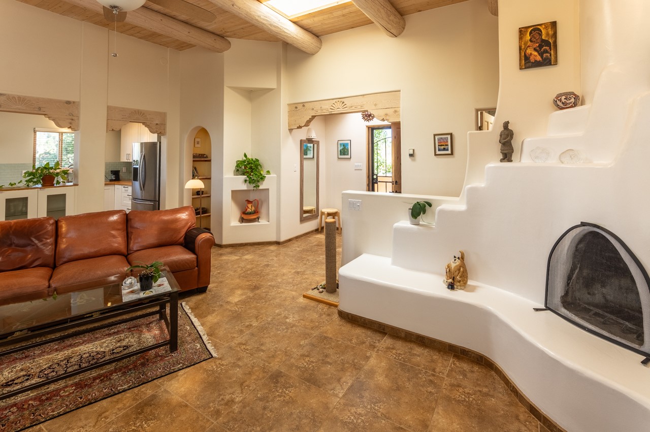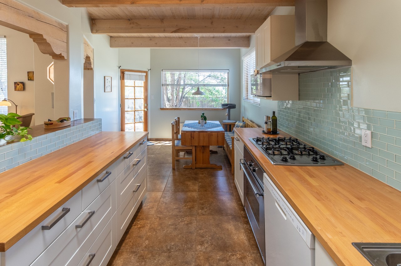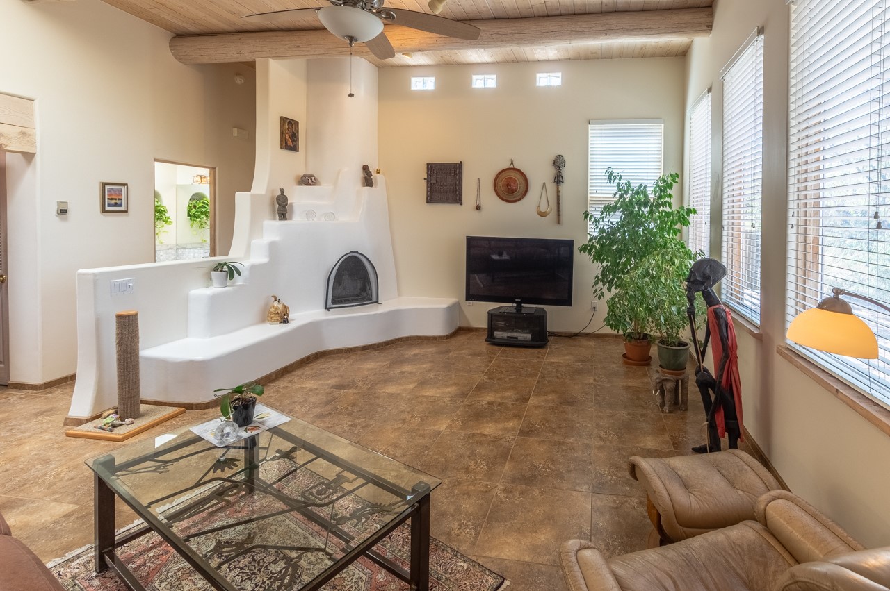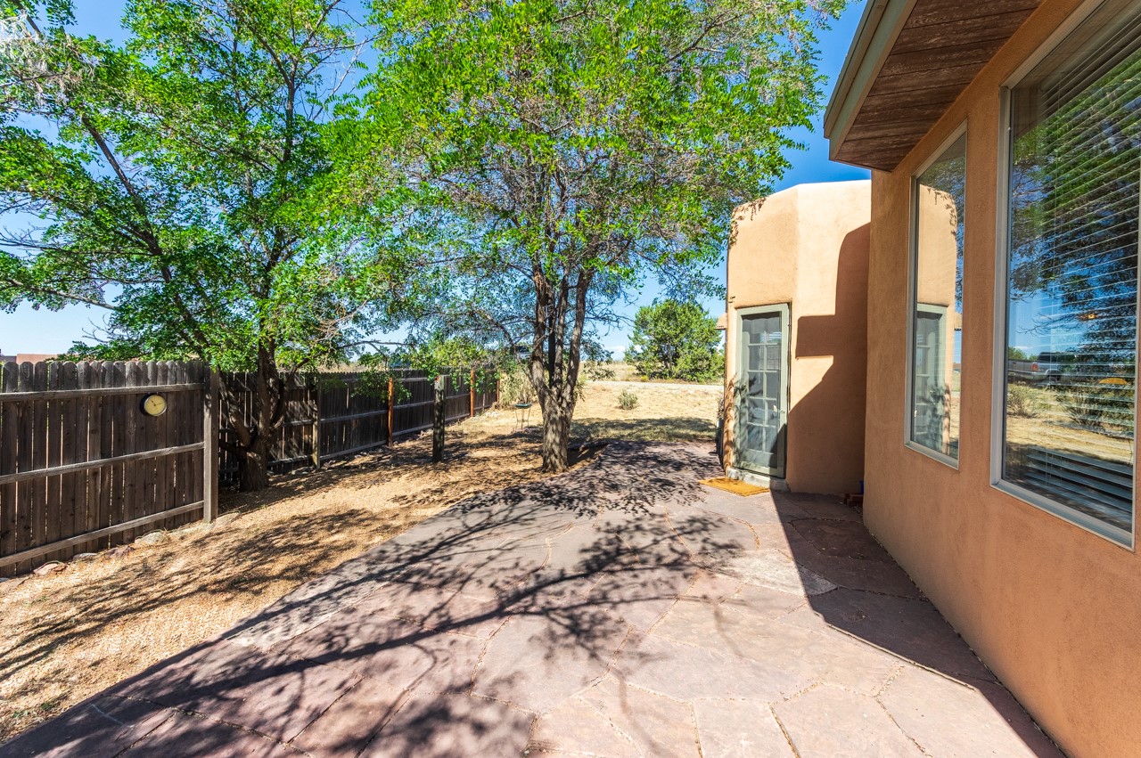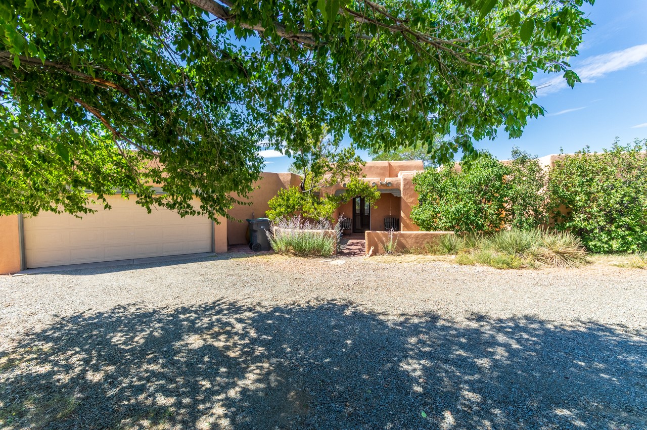 Charming home move-in ready. Light and bright with a high ceiling in the main living room, kiva fireplace, and open to the kitchen. The kitchen is very inviting along with the eat-in dining space. The primary bedroom is oversized with a beautifully remodeled bath area and door to the backyard. The second bedroom is nicely sized and also has a door to the back and is set up currently as an office and exercise area. The third bedroom is cozy for guests and the hall bath has also been beautifully remodeled. The hall to the two-car garage has a stacked washer and dryer. The oversized garage has a workbench and closet containing the heating and hot water heater. The backyard facing the sunset is partially fenced for privacy and could be totally enclosed for pets.