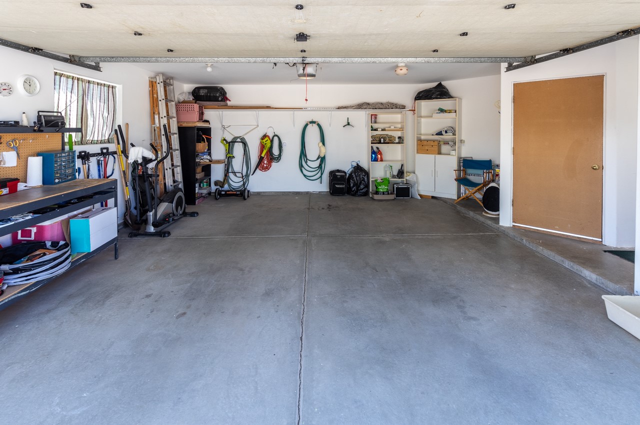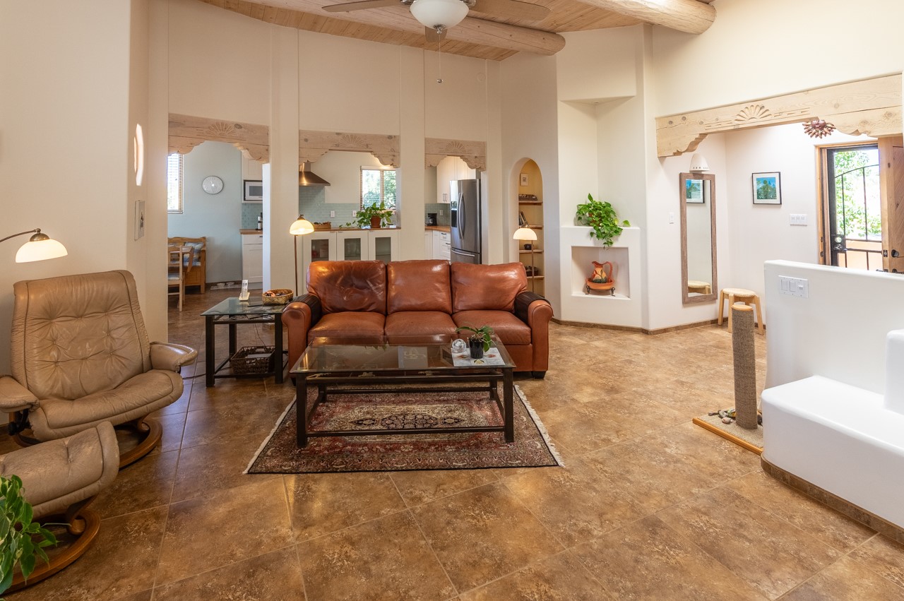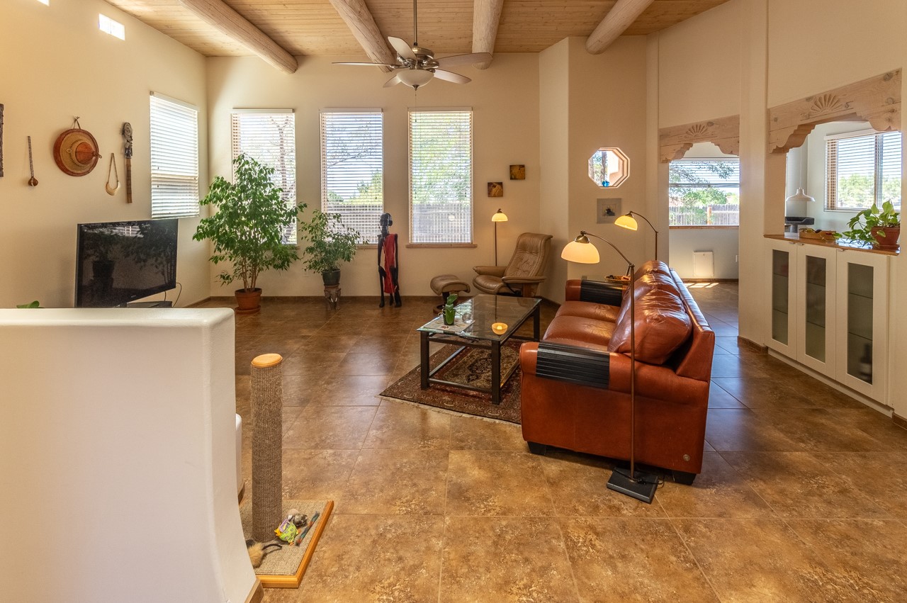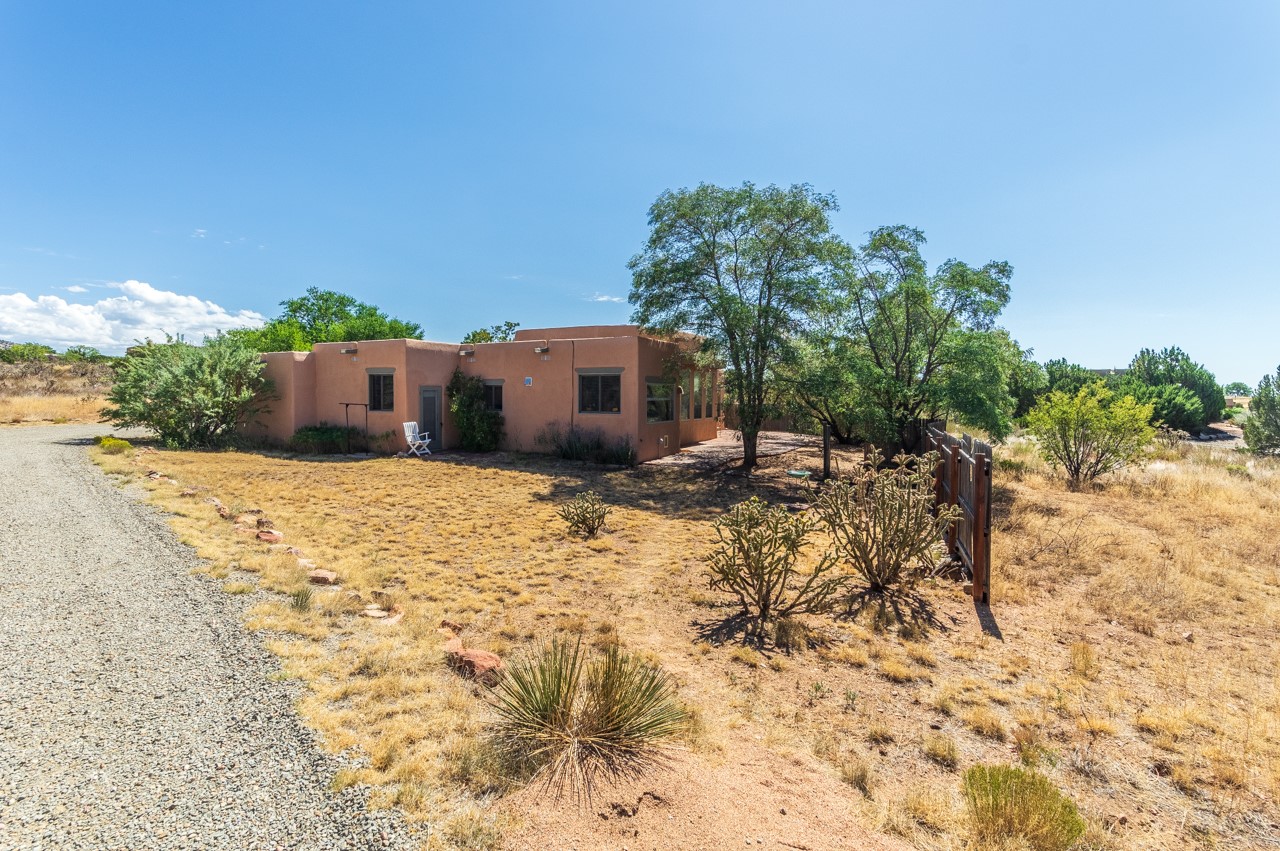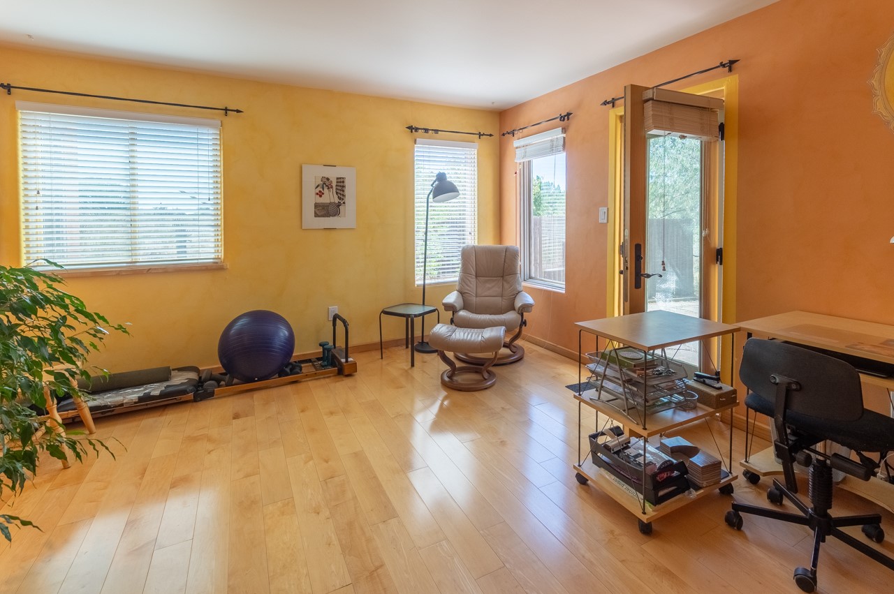 Charming home move-in ready. Light and bright with a high ceiling in the main living room, kiva fireplace, and open to the kitchen. The kitchen is very inviting along with the eat-in dining space. The primary bedroom is oversized with a beautifully remodeled bath area and door to the backyard. The second bedroom is nicely sized and also has a door to the back and is set up currently as an office and exercise area. The third bedroom is cozy for guests and the hall bath has also been beautifully remodeled. The hall to the two-car garage has a stacked washer and dryer. The oversized garage has a workbench and closet containing the heating and hot water heater. The backyard facing the sunset is partially fenced for privacy and could be totally enclosed for pets.
