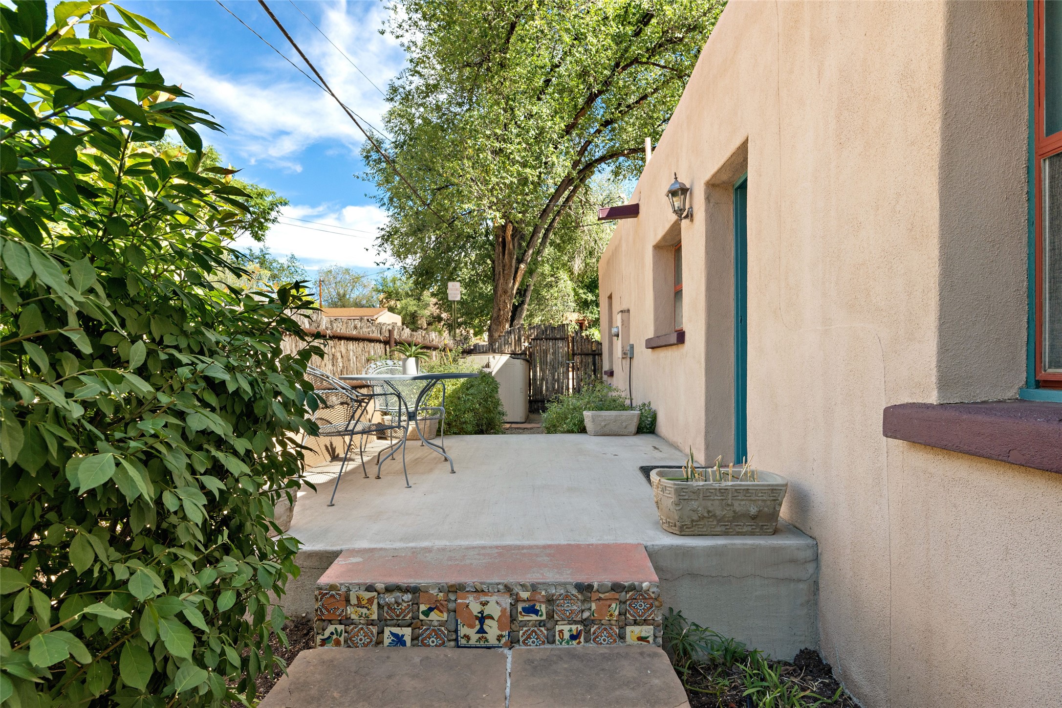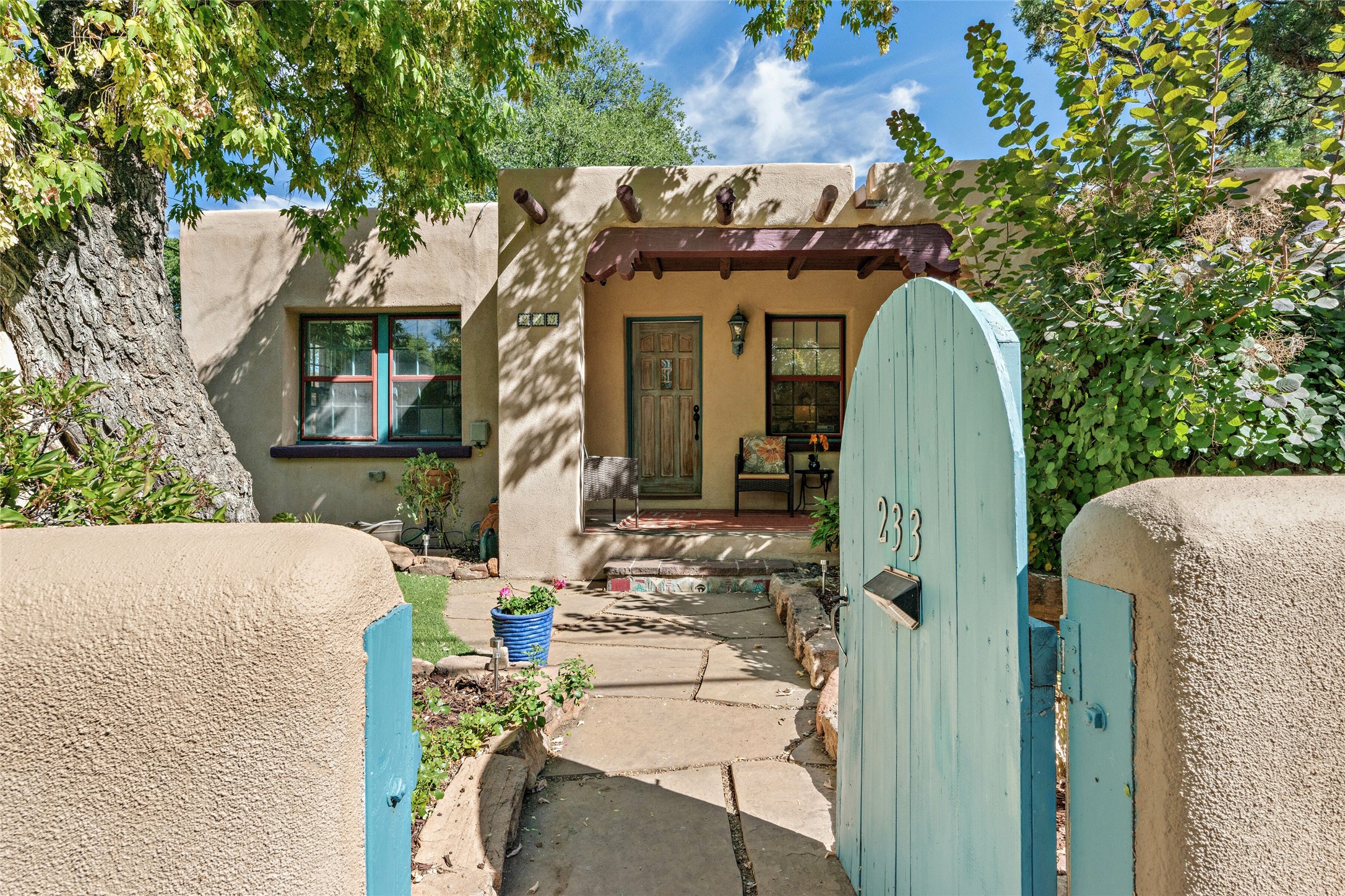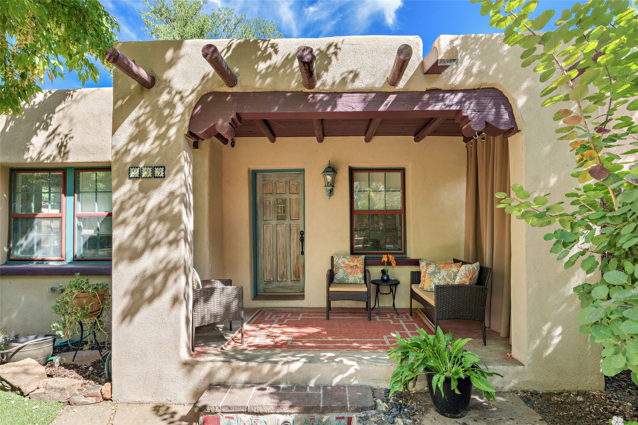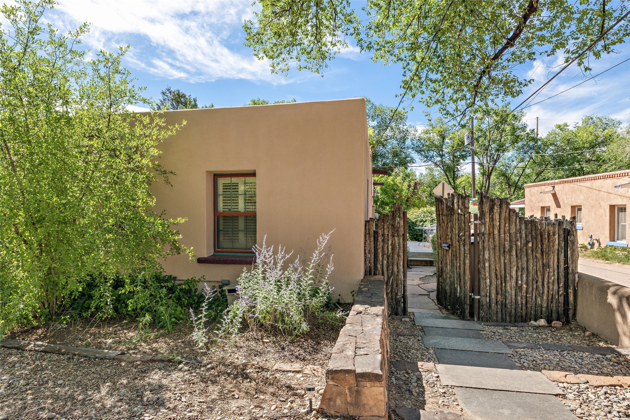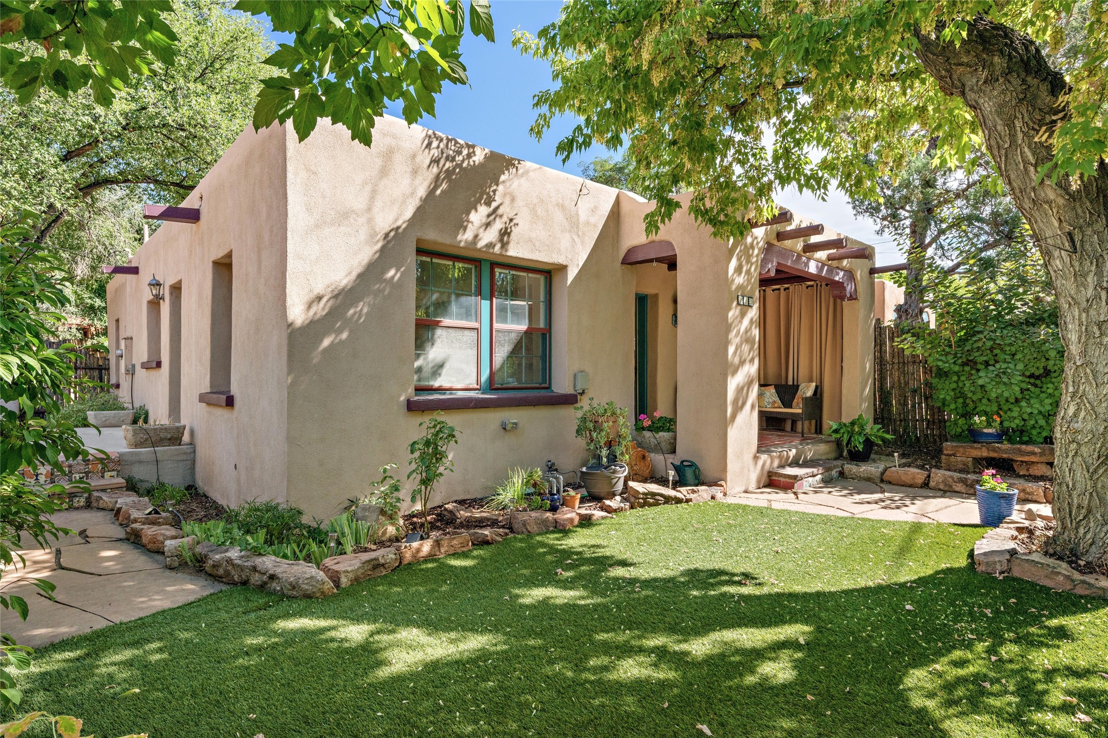 Charming 1945 adobe free-standing-bungalow-style 1210 sq ft condo w/2 bdrm/1 bath in the historic St. Catherine's neighborhood across from the beautiful tree-lined Arroyo Mascaras. Located on the corner of Rosario Boulevard and Del Norte Lane, this much-loved home is being parted with by out-of-state seller after only 4-yr ownership. The largest of 3 condos in the Tres Rosarios Condominium Assoc is being offered "as is" and furnishings belonging to owner and/or stager are available for purchase via separate bill of sale. Accessed from either Griffin, Old Taos Hwy or the Historic Santa Fe Foundation El Puente De Los Hidalgos "Bridge of the Noblemen" built 1920 that originally served as part of State Hwy 487 and US Hwy 64 as the connection between the state capitol and towns to the north. Friendly neighborhood environment, easy one-half mile walking distance to Plaza and 2 deeded parking spaces immediately behind.