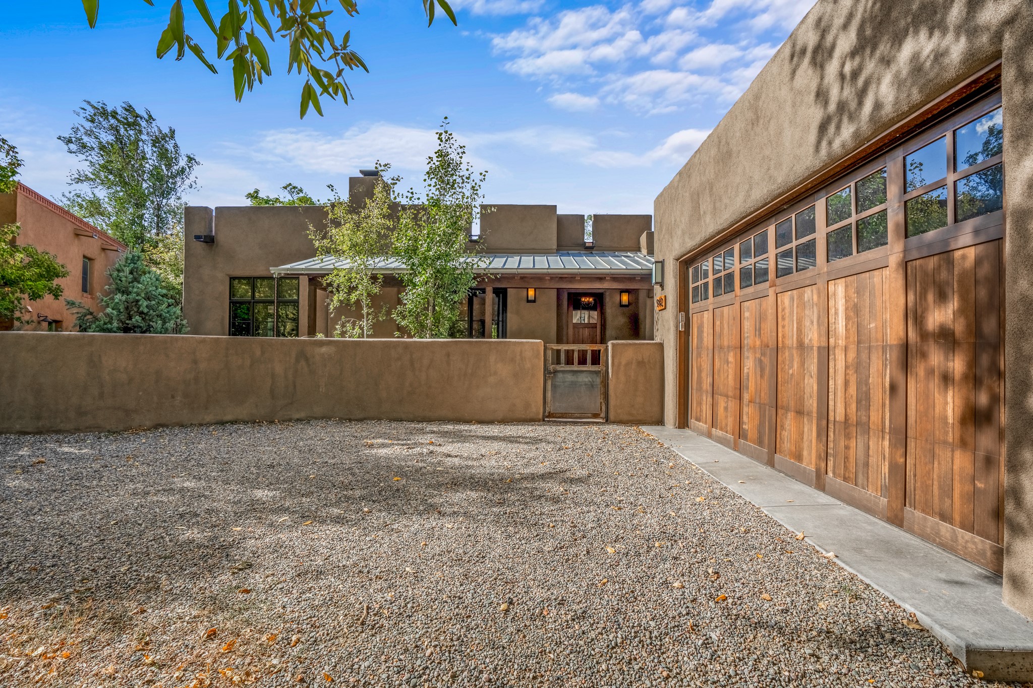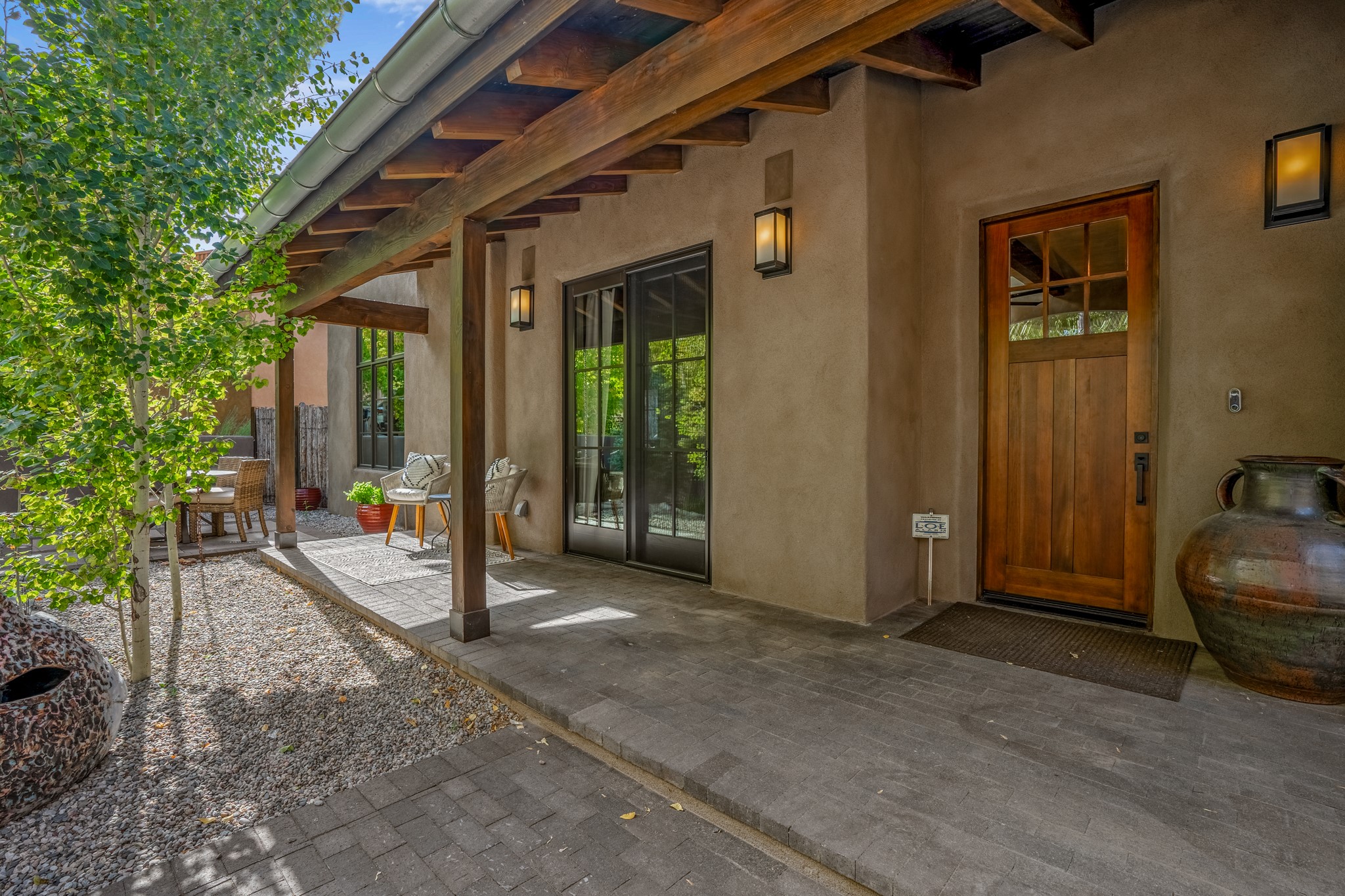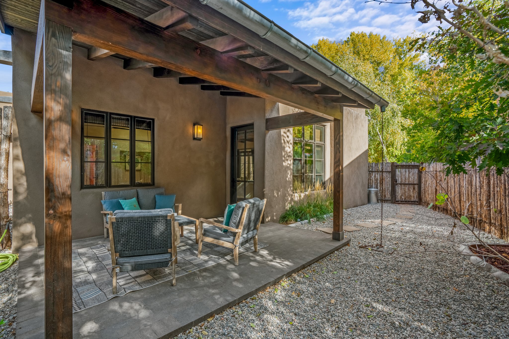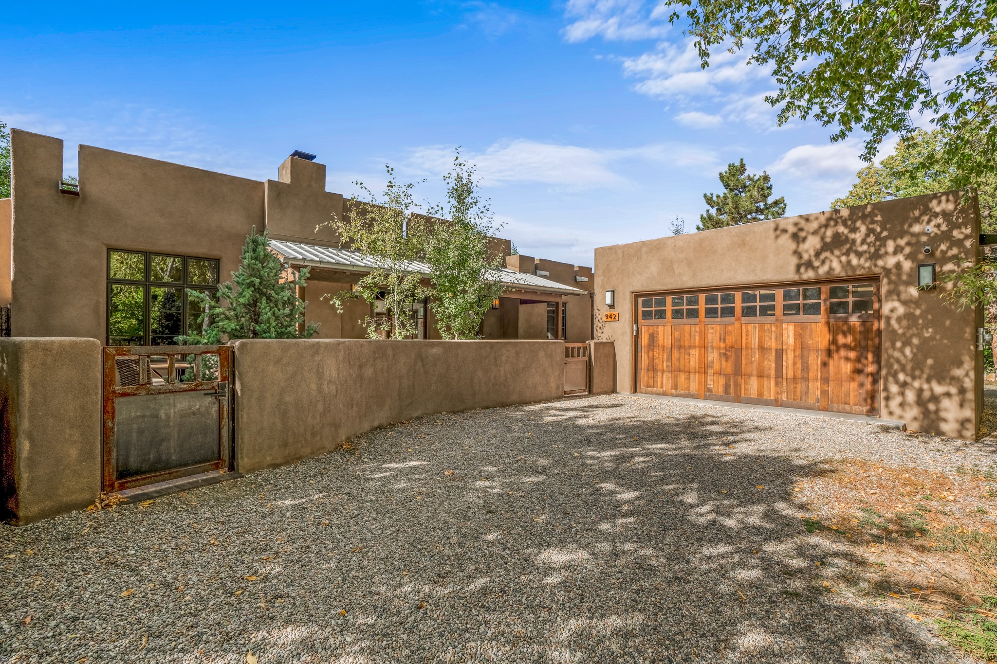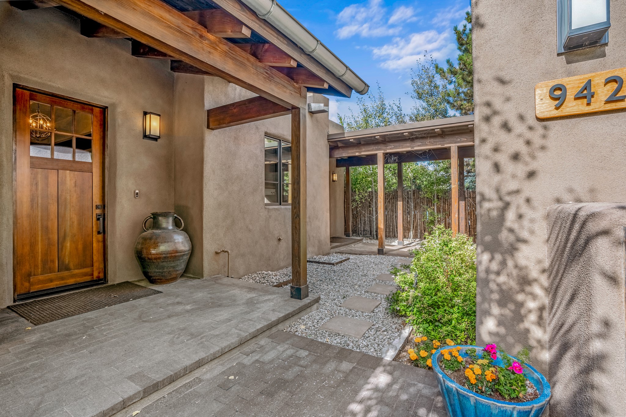 Newly constructed in 2020, this exceptional single-level dwelling harmoniously fuses the rich heritage of Historic Eastside with contemporary elegance. Ideally positioned between E. Alameda and Canyon Rd, this property exudes distinction, featuring a gated entrance and a heated 2-car garage. The heart of this home is a captivating open concept living and dining area. Accentuated by high-beamed ceilings and rich wood flooring, this space is anchored by a commanding wood-burning fireplace. Adjoining this area are French doors that lead to the front portal, offering an idyllic view of the Santa Fe River, enabling one to savor its ever-changing seasonal beauty. The kitchen, both functional and stylish, boasts a vibrant contemporary ambiance with stone countertops and state-of-the-art stainless steel appliances. The primary suite enjoys the view of the east-facing portal and features a double vanity, a steam shower, and a spacious walk-in closet. The guest bedroom, designed with flexibility in mind, can effortlessly serve as an office space or a comfortable guest room. A delightful covered breezeway connects the combined mudroom/laundry room to the garage, offering convenience and protection from Santa Fe's hourly-changing weather. The property is solar-powered and attached to the grid, has forced air heating, central A/C and city utilities. 942 E. Palace is a true testament to the art of blending history and modernity in one exceptional dwelling; a rare opportunity to experience the finest in custom, new construction within a stone's throw of the cherished Canyon Rd.