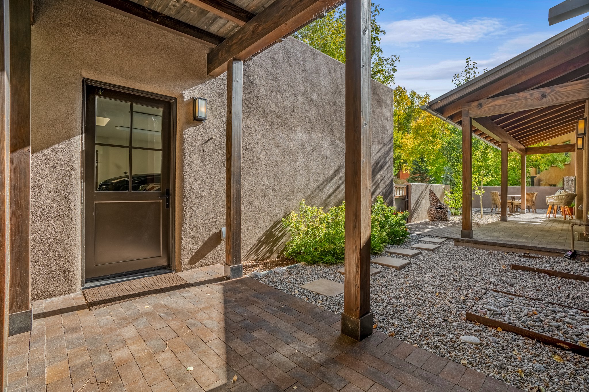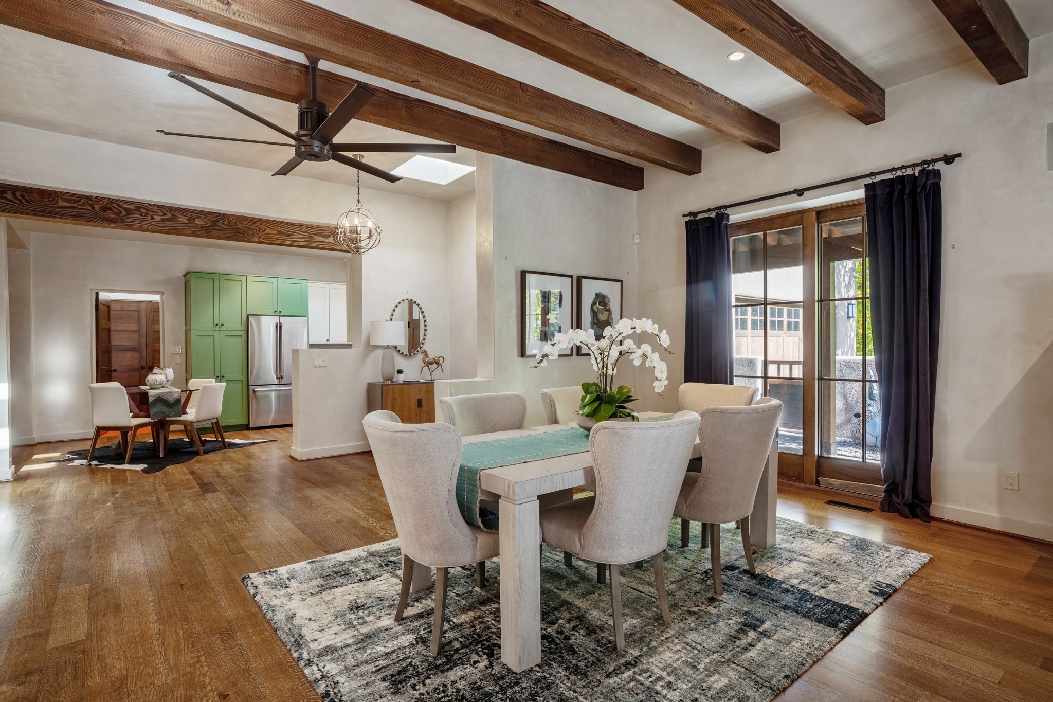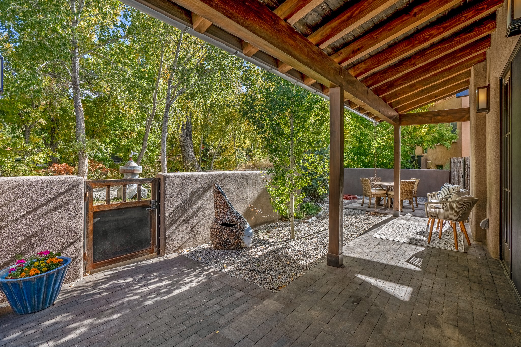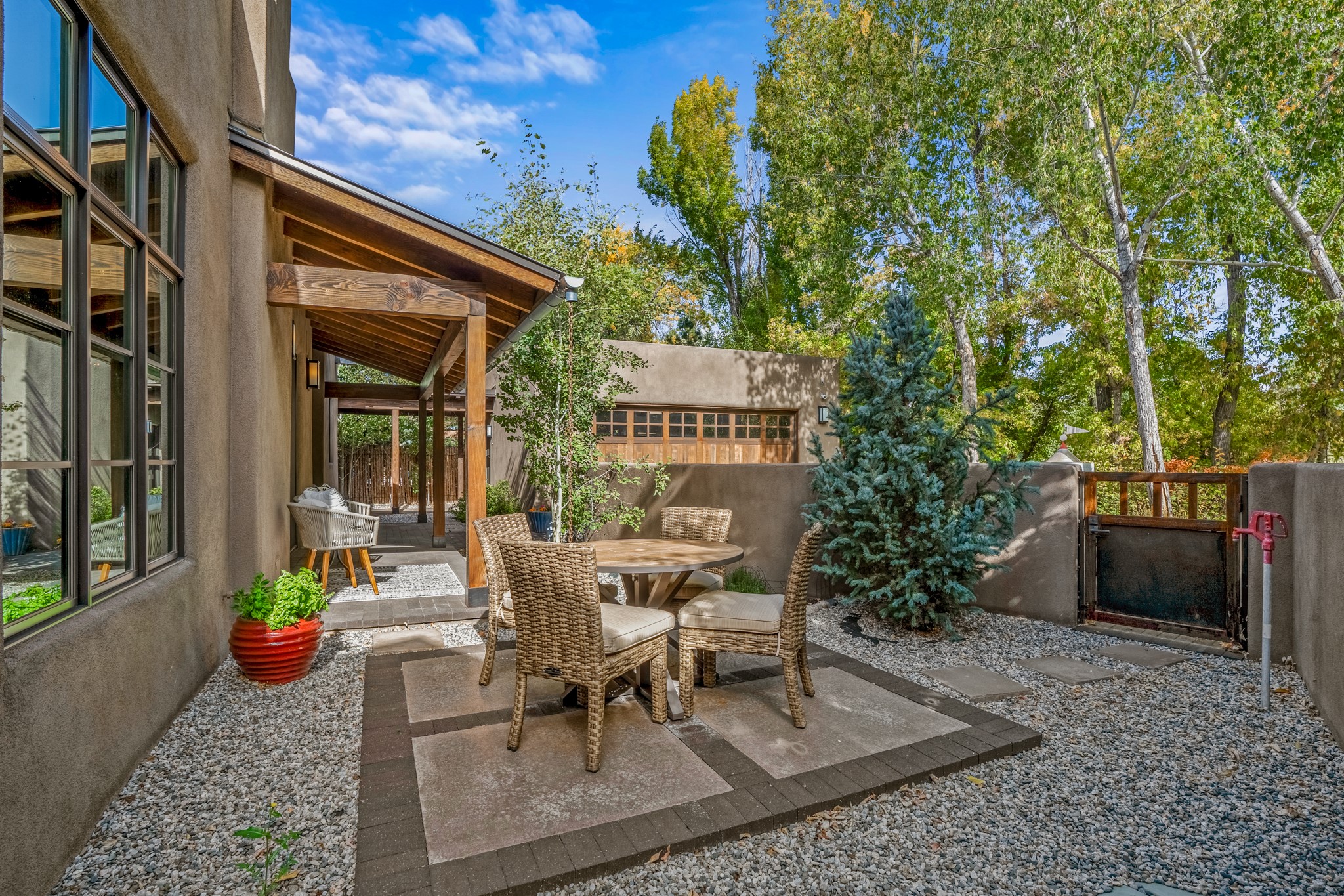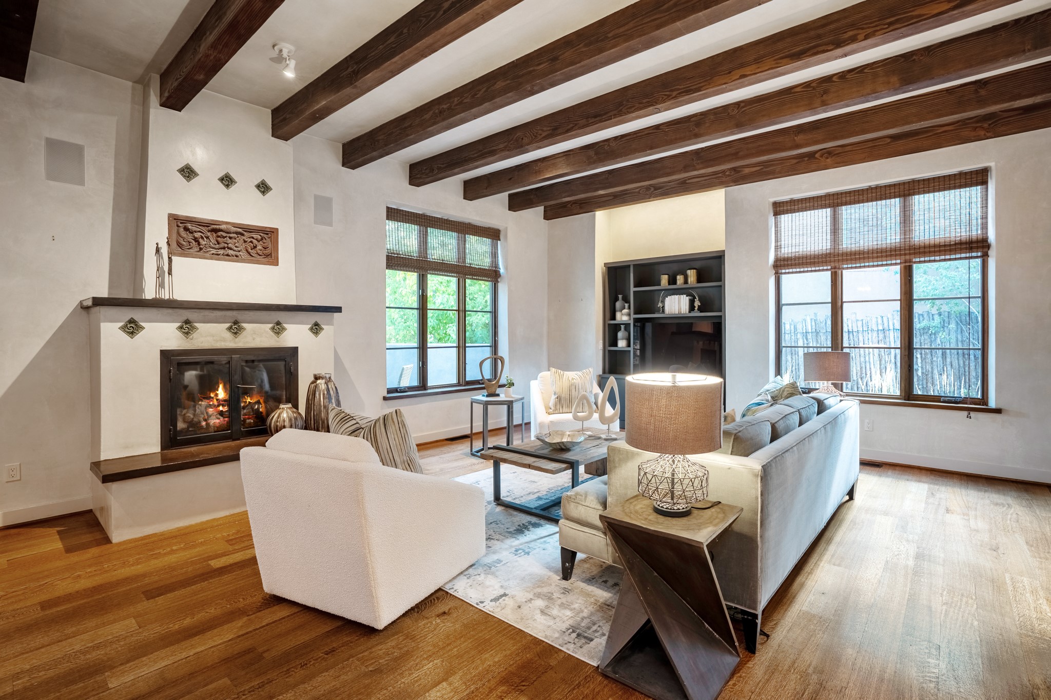 Newly constructed in 2020, this exceptional single-level dwelling harmoniously fuses the rich heritage of Historic Eastside with contemporary elegance. Ideally positioned between E. Alameda and Canyon Rd, this property exudes distinction, featuring a gated entrance and a heated 2-car garage. The heart of this home is a captivating open concept living and dining area. Accentuated by high-beamed ceilings and rich wood flooring, this space is anchored by a commanding wood-burning fireplace. Adjoining this area are French doors that lead to the front portal, offering an idyllic view of the Santa Fe River, enabling one to savor its ever-changing seasonal beauty. The kitchen, both functional and stylish, boasts a vibrant contemporary ambiance with stone countertops and state-of-the-art stainless steel appliances. The primary suite enjoys the view of the east-facing portal and features a double vanity, a steam shower, and a spacious walk-in closet. The guest bedroom, designed with flexibility in mind, can effortlessly serve as an office space or a comfortable guest room. A delightful covered breezeway connects the combined mudroom/laundry room to the garage, offering convenience and protection from Santa Fe's hourly-changing weather. The property is solar-powered and attached to the grid, has forced air heating, central A/C and city utilities. 942 E. Palace is a true testament to the art of blending history and modernity in one exceptional dwelling; a rare opportunity to experience the finest in custom, new construction within a stone's throw of the cherished Canyon Rd.