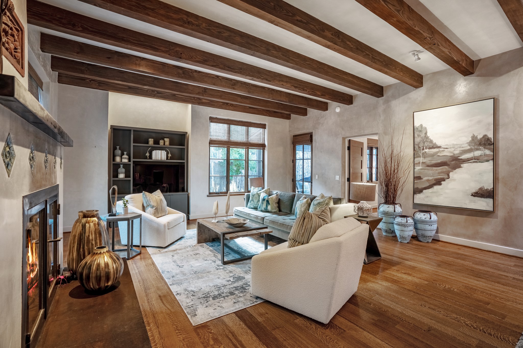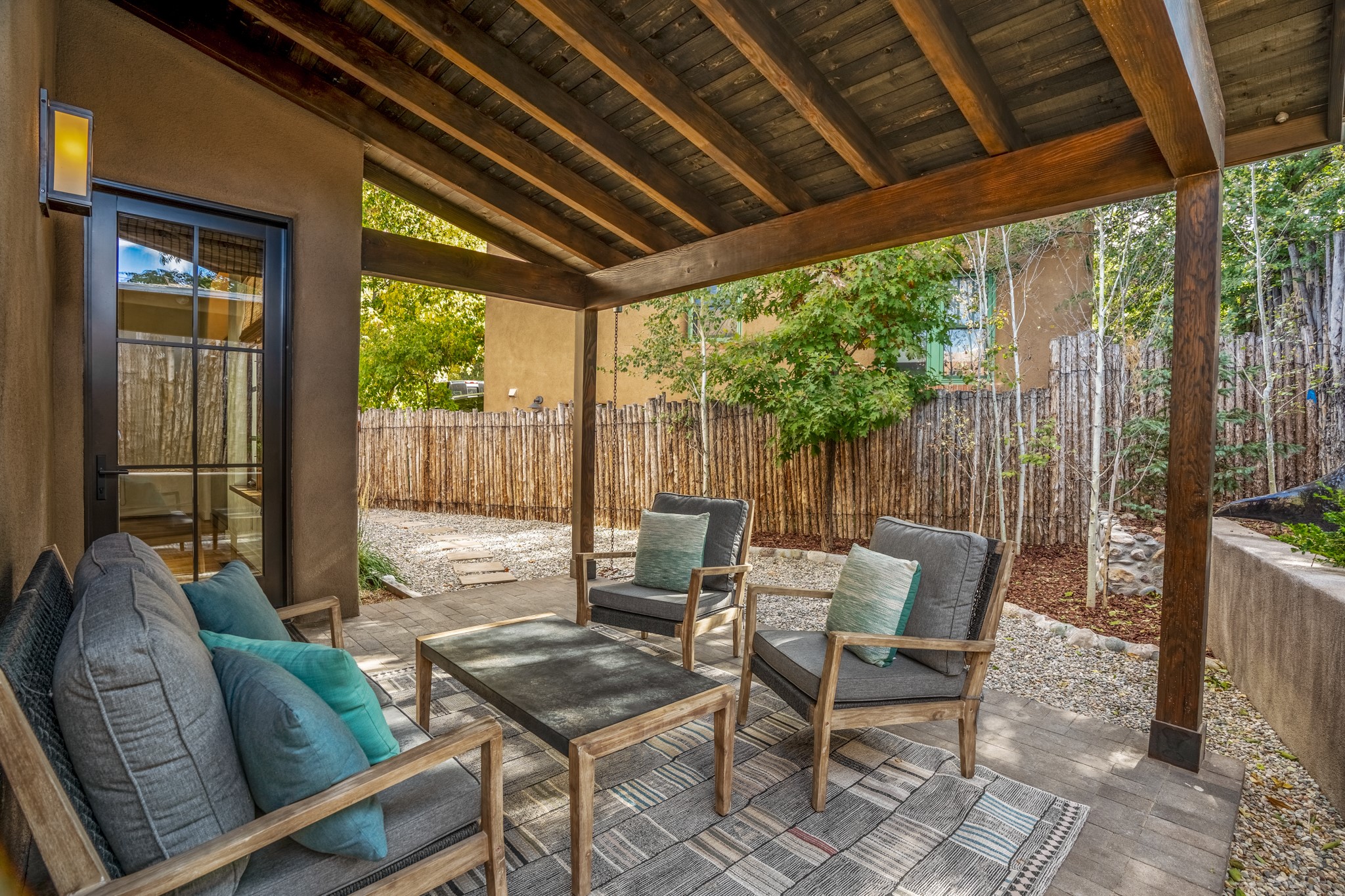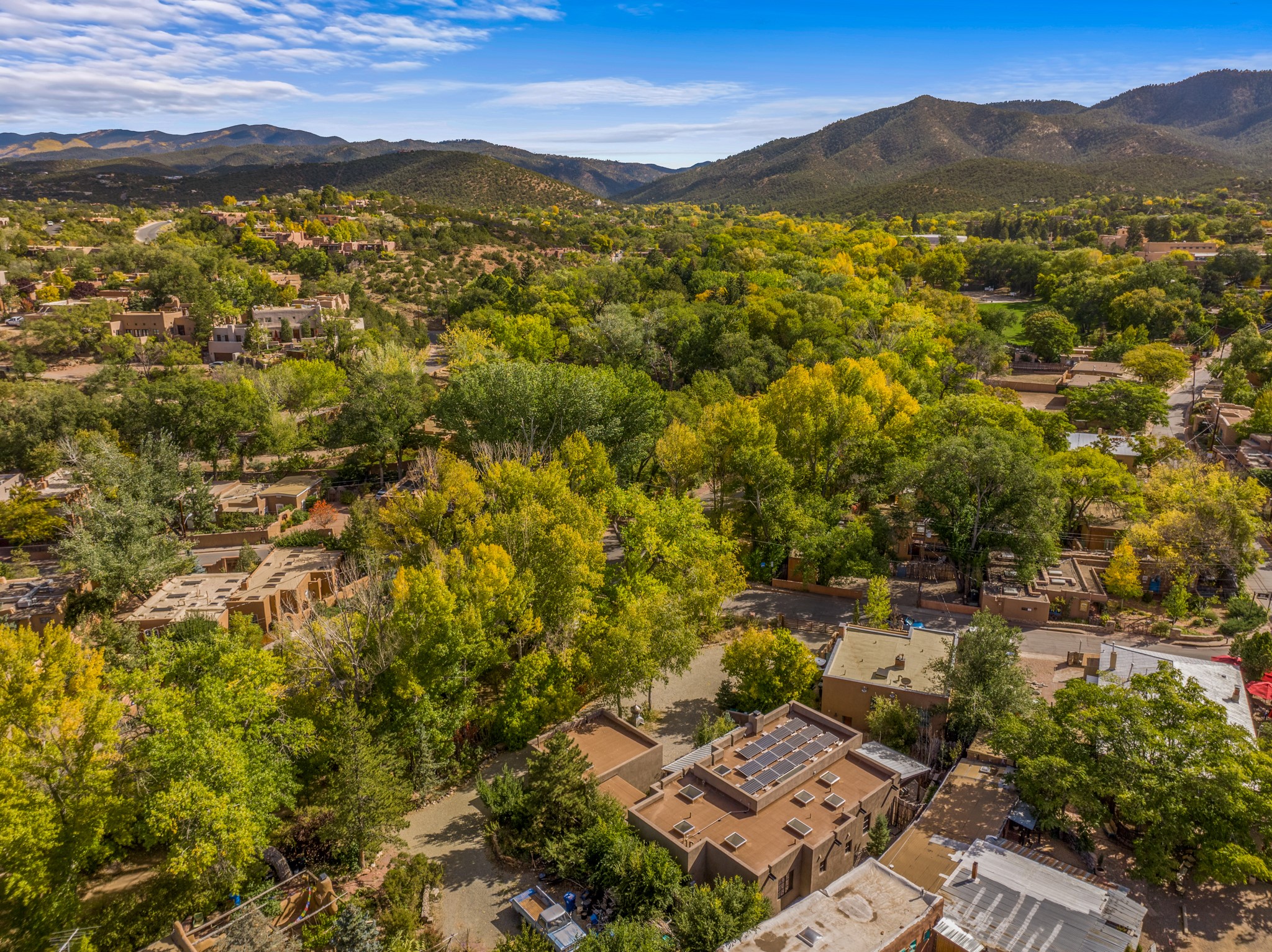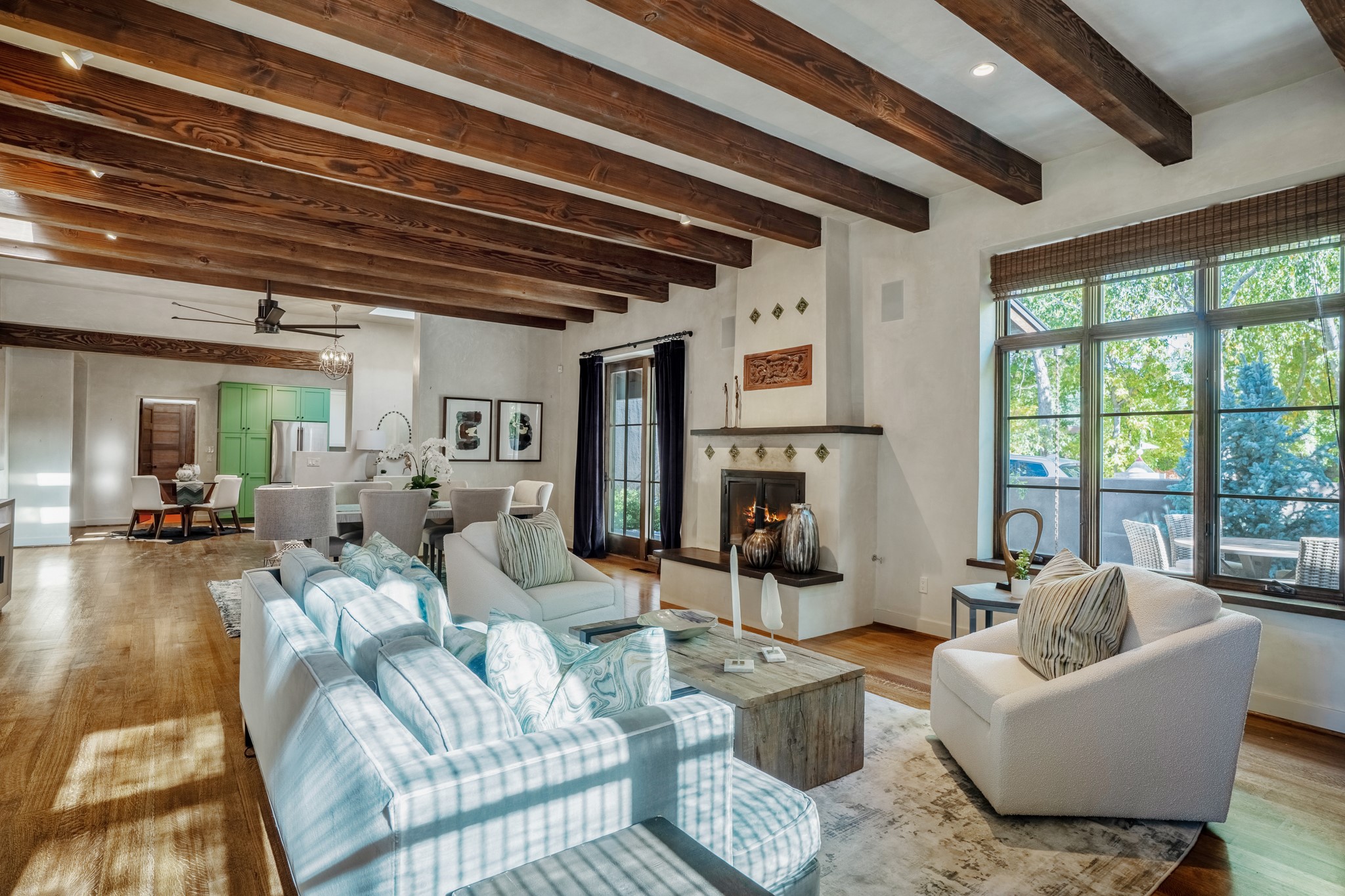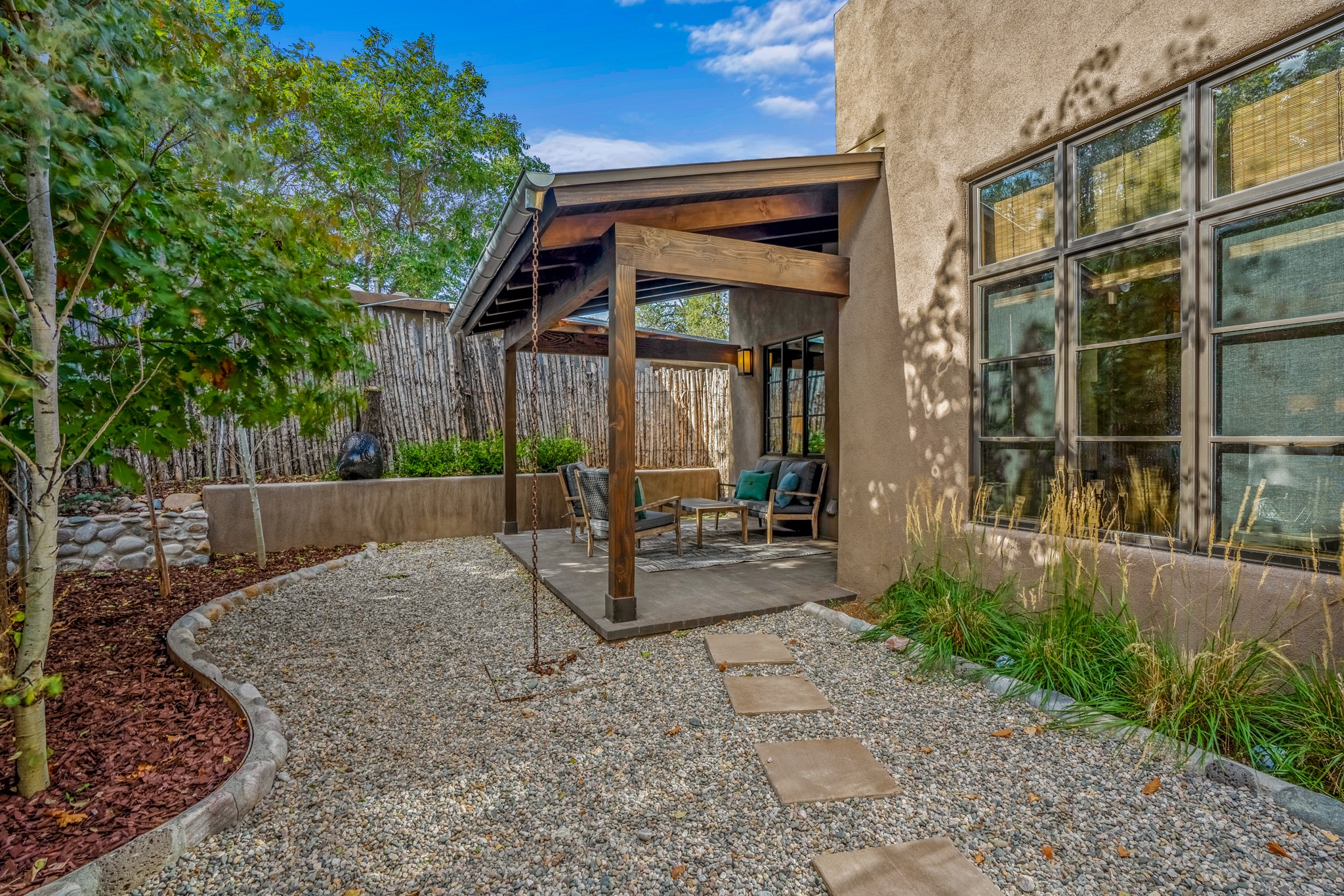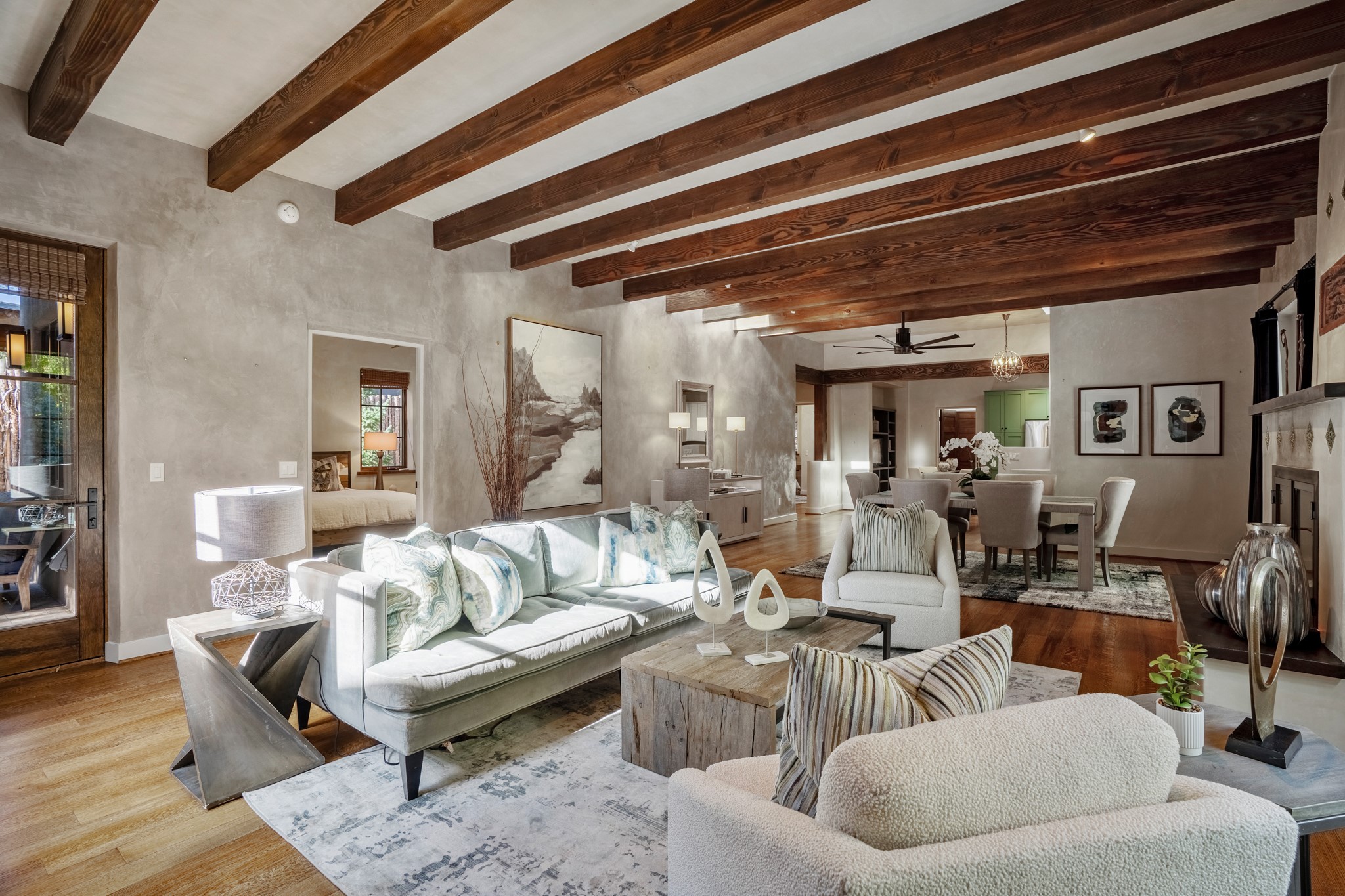 Newly constructed in 2020, this exceptional single-level dwelling harmoniously fuses the rich heritage of Historic Eastside with contemporary elegance. Ideally positioned between E. Alameda and Canyon Rd, this property exudes distinction, featuring a gated entrance and a heated 2-car garage. The heart of this home is a captivating open concept living and dining area. Accentuated by high-beamed ceilings and rich wood flooring, this space is anchored by a commanding wood-burning fireplace. Adjoining this area are French doors that lead to the front portal, offering an idyllic view of the Santa Fe River, enabling one to savor its ever-changing seasonal beauty. The kitchen, both functional and stylish, boasts a vibrant contemporary ambiance with stone countertops and state-of-the-art stainless steel appliances. The primary suite enjoys the view of the east-facing portal and features a double vanity, a steam shower, and a spacious walk-in closet. The guest bedroom, designed with flexibility in mind, can effortlessly serve as an office space or a comfortable guest room. A delightful covered breezeway connects the combined mudroom/laundry room to the garage, offering convenience and protection from Santa Fe's hourly-changing weather. The property is solar-powered and attached to the grid, has forced air heating, central A/C and city utilities. 942 E. Palace is a true testament to the art of blending history and modernity in one exceptional dwelling; a rare opportunity to experience the finest in custom, new construction within a stone's throw of the cherished Canyon Rd.