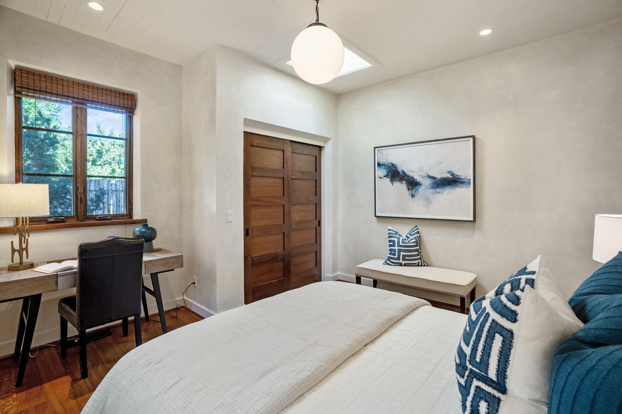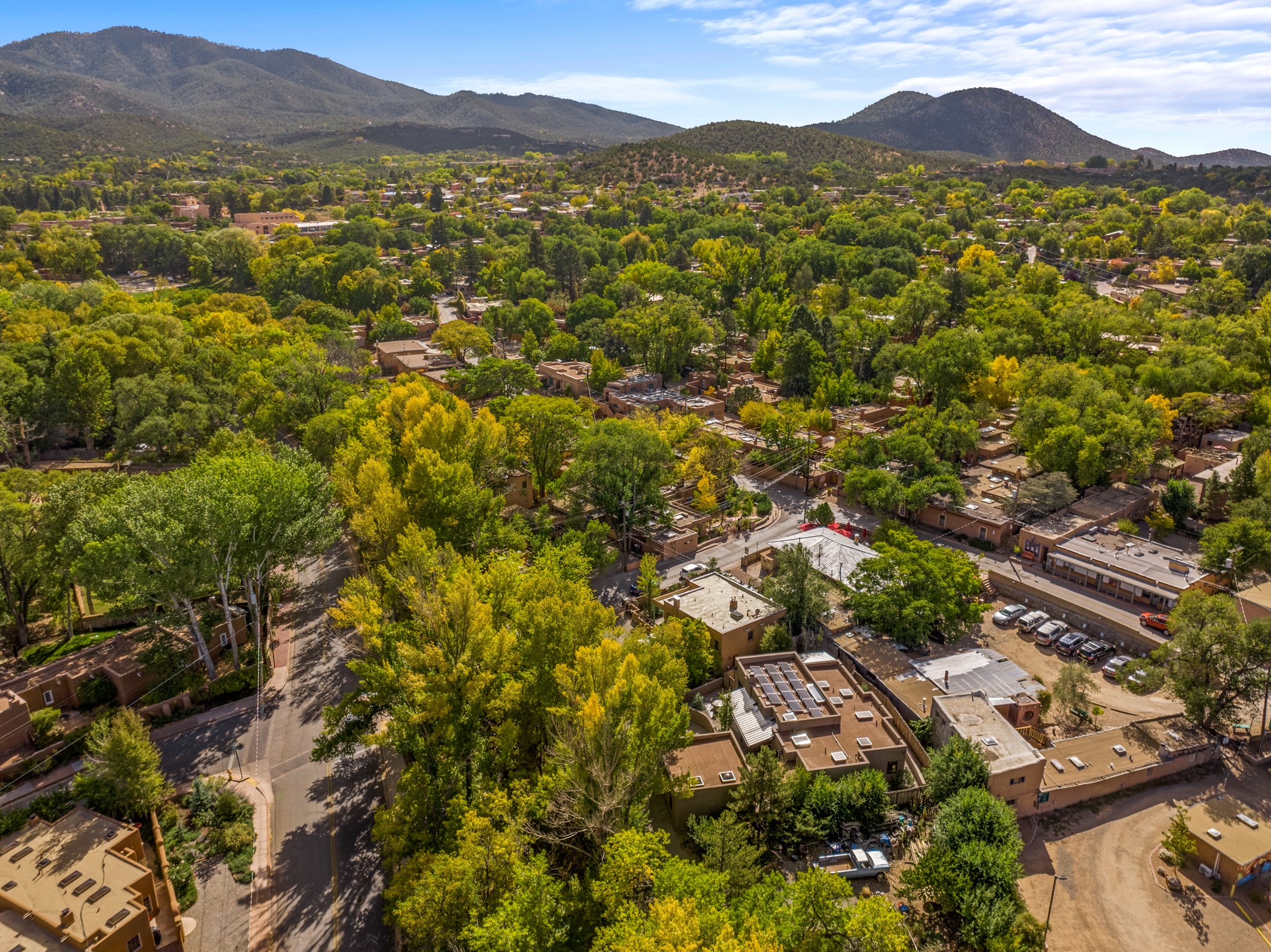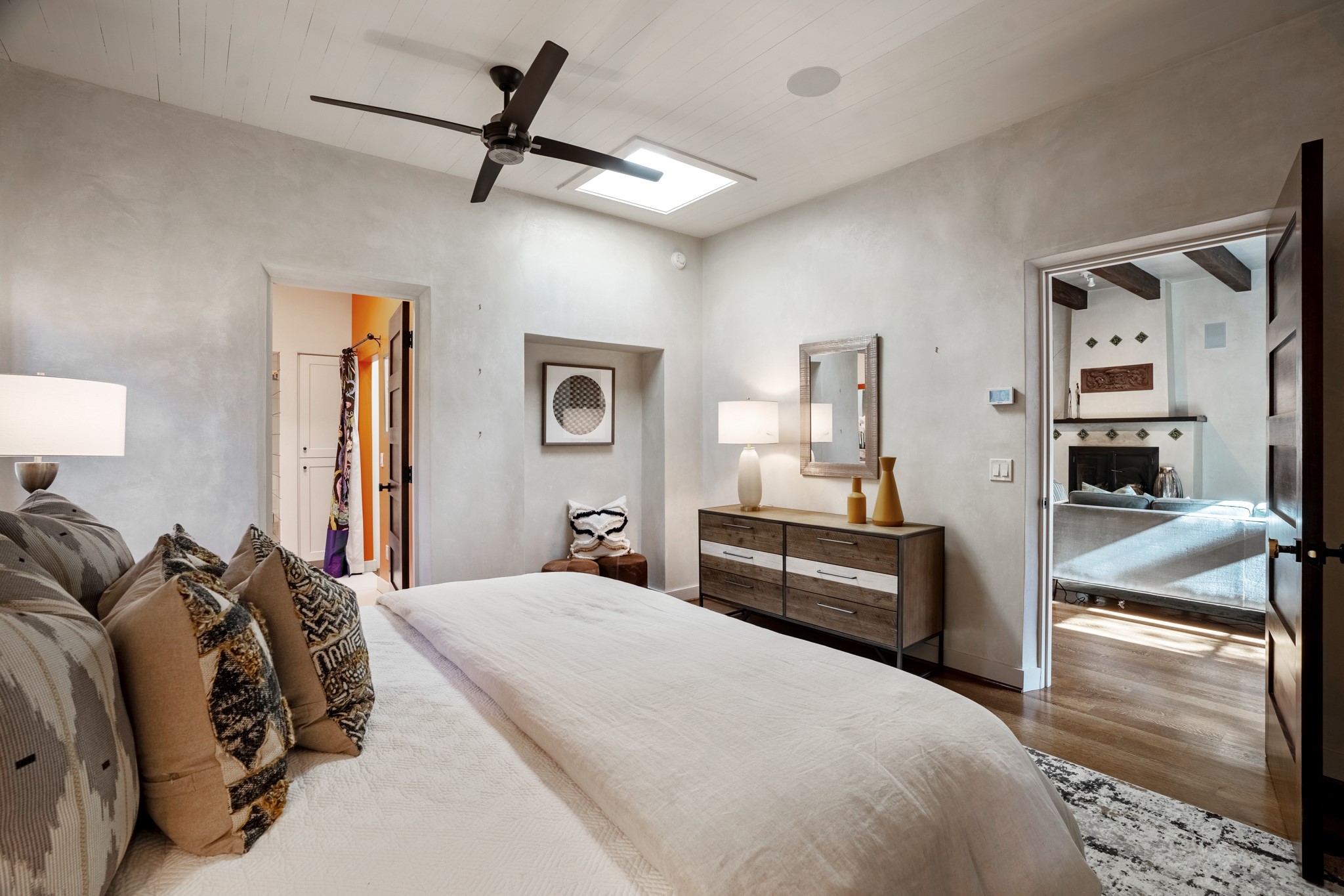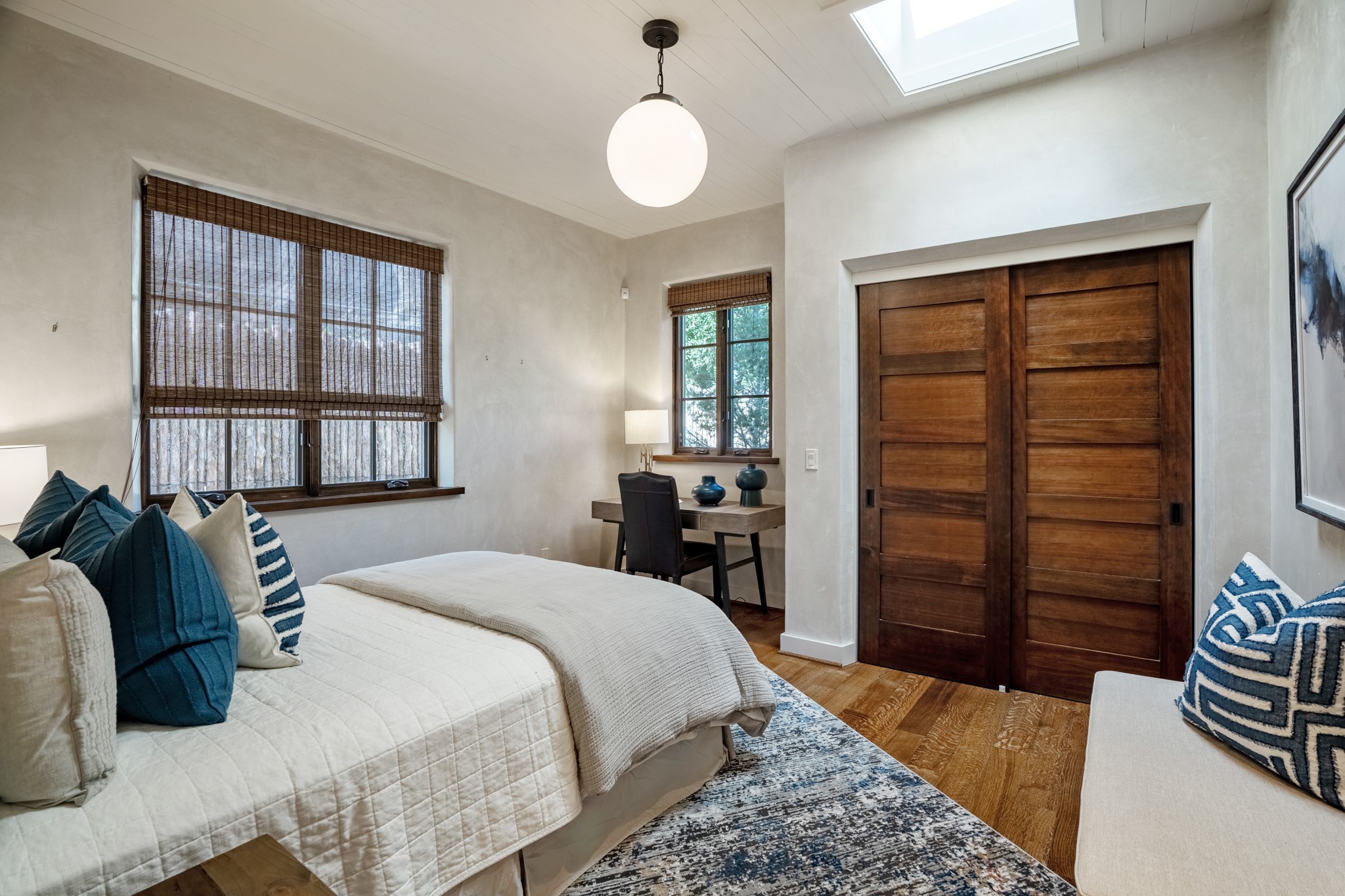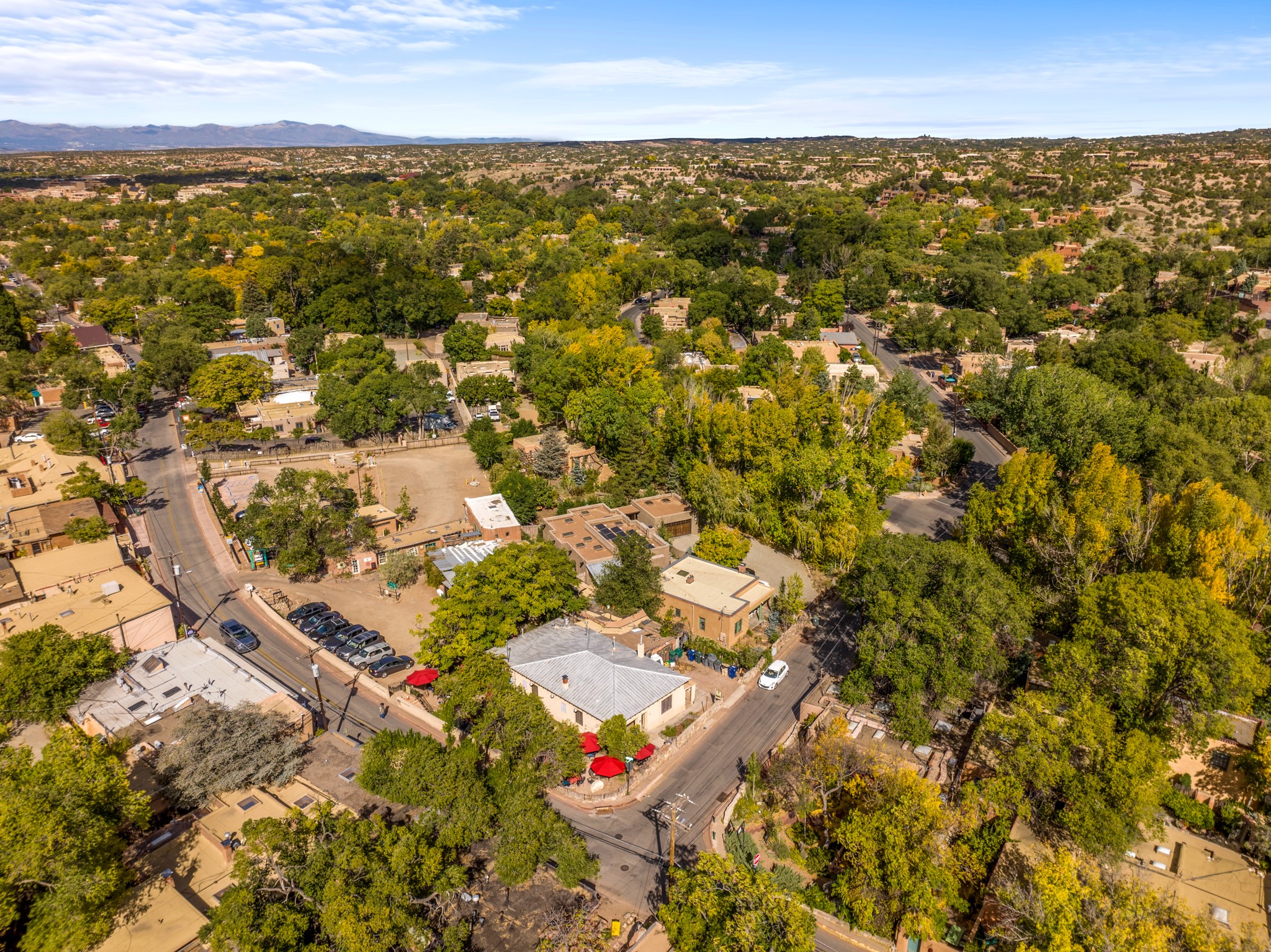 Newly constructed in 2020, this exceptional single-level dwelling harmoniously fuses the rich heritage of Historic Eastside with contemporary elegance. Ideally positioned between E. Alameda and Canyon Rd, this property exudes distinction, featuring a gated entrance and a heated 2-car garage. The heart of this home is a captivating open concept living and dining area. Accentuated by high-beamed ceilings and rich wood flooring, this space is anchored by a commanding wood-burning fireplace. Adjoining this area are French doors that lead to the front portal, offering an idyllic view of the Santa Fe River, enabling one to savor its ever-changing seasonal beauty. The kitchen, both functional and stylish, boasts a vibrant contemporary ambiance with stone countertops and state-of-the-art stainless steel appliances. The primary suite enjoys the view of the east-facing portal and features a double vanity, a steam shower, and a spacious walk-in closet. The guest bedroom, designed with flexibility in mind, can effortlessly serve as an office space or a comfortable guest room. A delightful covered breezeway connects the combined mudroom/laundry room to the garage, offering convenience and protection from Santa Fe's hourly-changing weather. The property is solar-powered and attached to the grid, has forced air heating, central A/C and city utilities. 942 E. Palace is a true testament to the art of blending history and modernity in one exceptional dwelling; a rare opportunity to experience the finest in custom, new construction within a stone's throw of the cherished Canyon Rd.