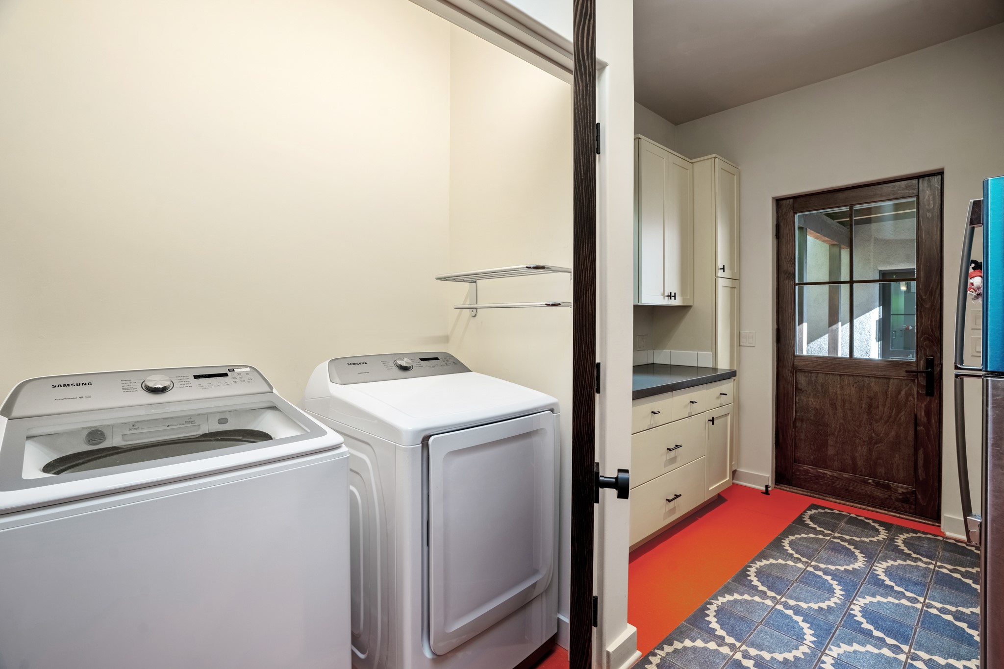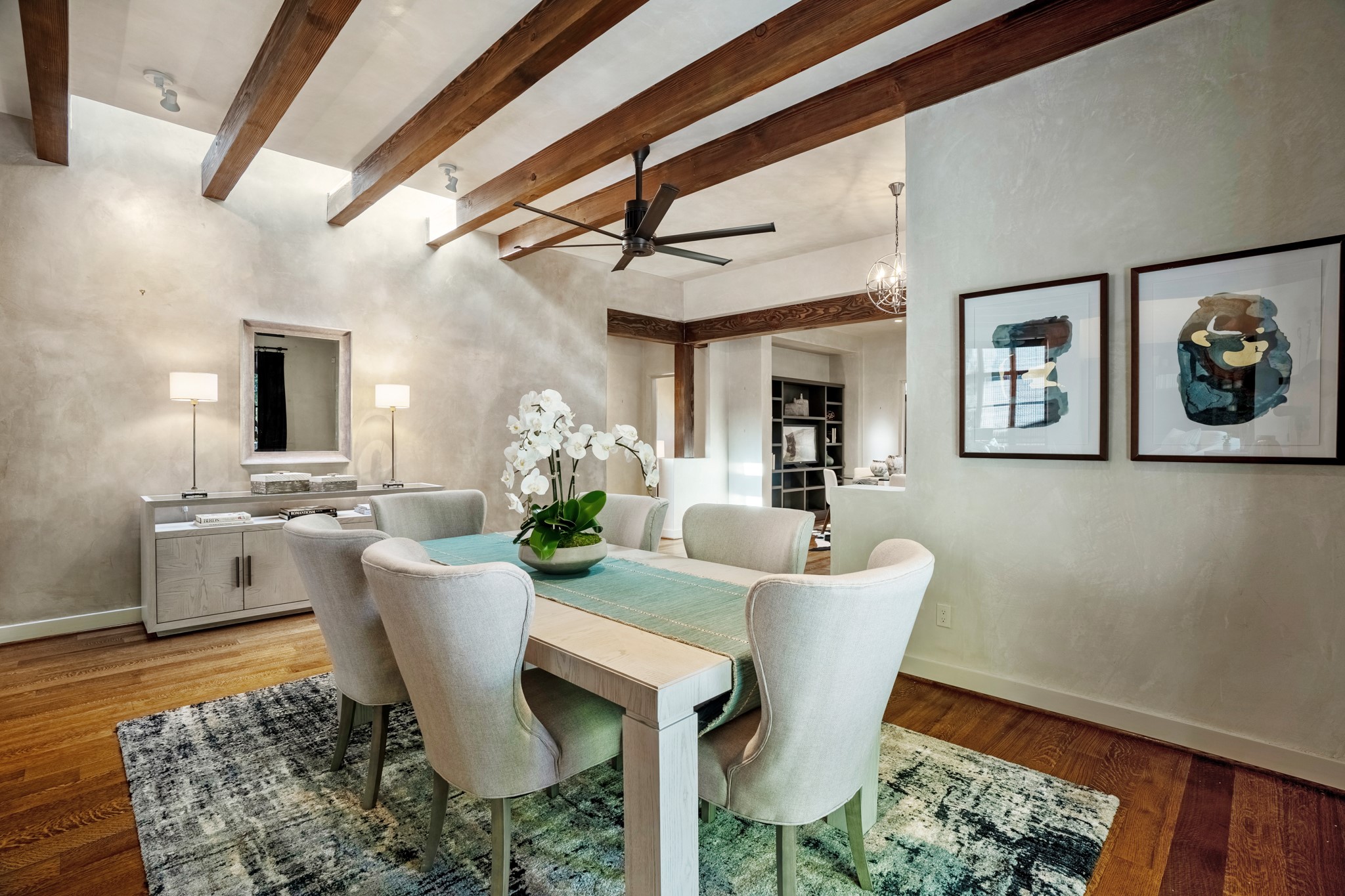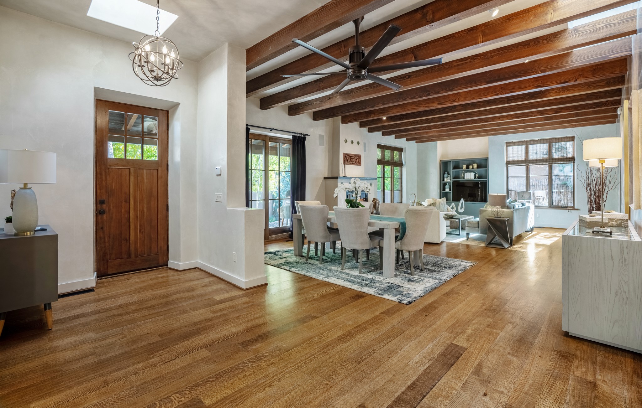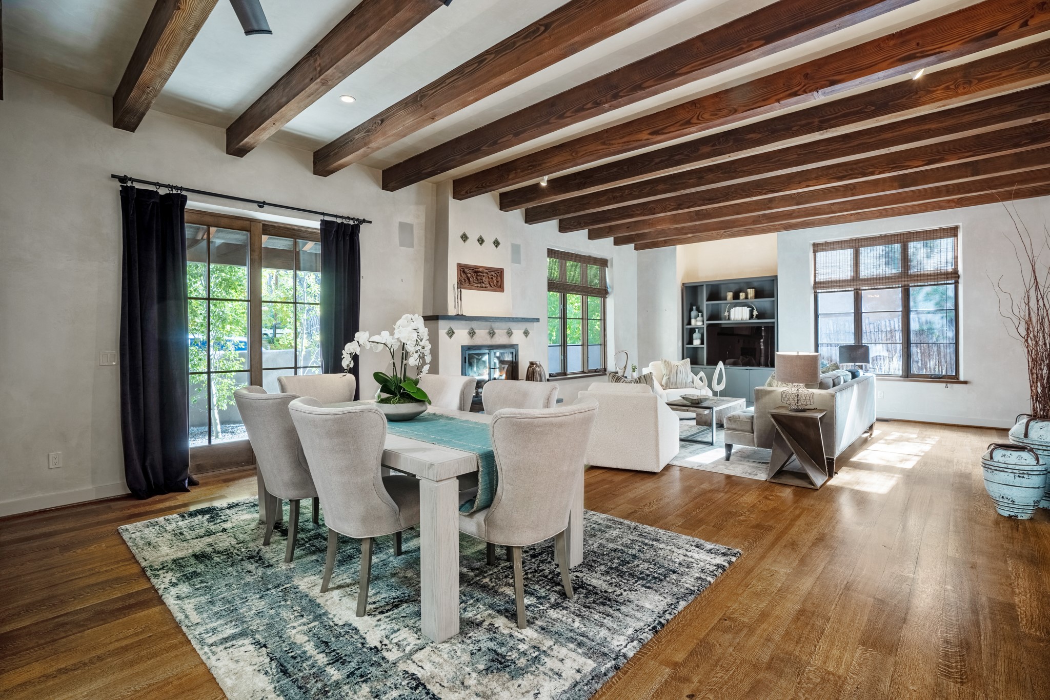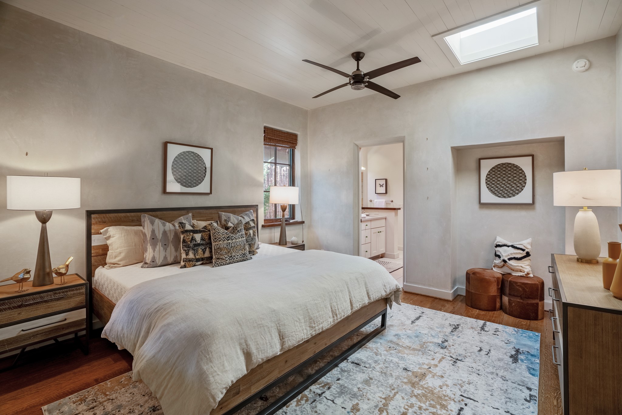 Newly constructed in 2020, this exceptional single-level dwelling harmoniously fuses the rich heritage of Historic Eastside with contemporary elegance. Ideally positioned between E. Alameda and Canyon Rd, this property exudes distinction, featuring a gated entrance and a heated 2-car garage. The heart of this home is a captivating open concept living and dining area. Accentuated by high-beamed ceilings and rich wood flooring, this space is anchored by a commanding wood-burning fireplace. Adjoining this area are French doors that lead to the front portal, offering an idyllic view of the Santa Fe River, enabling one to savor its ever-changing seasonal beauty. The kitchen, both functional and stylish, boasts a vibrant contemporary ambiance with stone countertops and state-of-the-art stainless steel appliances. The primary suite enjoys the view of the east-facing portal and features a double vanity, a steam shower, and a spacious walk-in closet. The guest bedroom, designed with flexibility in mind, can effortlessly serve as an office space or a comfortable guest room. A delightful covered breezeway connects the combined mudroom/laundry room to the garage, offering convenience and protection from Santa Fe's hourly-changing weather. The property is solar-powered and attached to the grid, has forced air heating, central A/C and city utilities. 942 E. Palace is a true testament to the art of blending history and modernity in one exceptional dwelling; a rare opportunity to experience the finest in custom, new construction within a stone's throw of the cherished Canyon Rd.